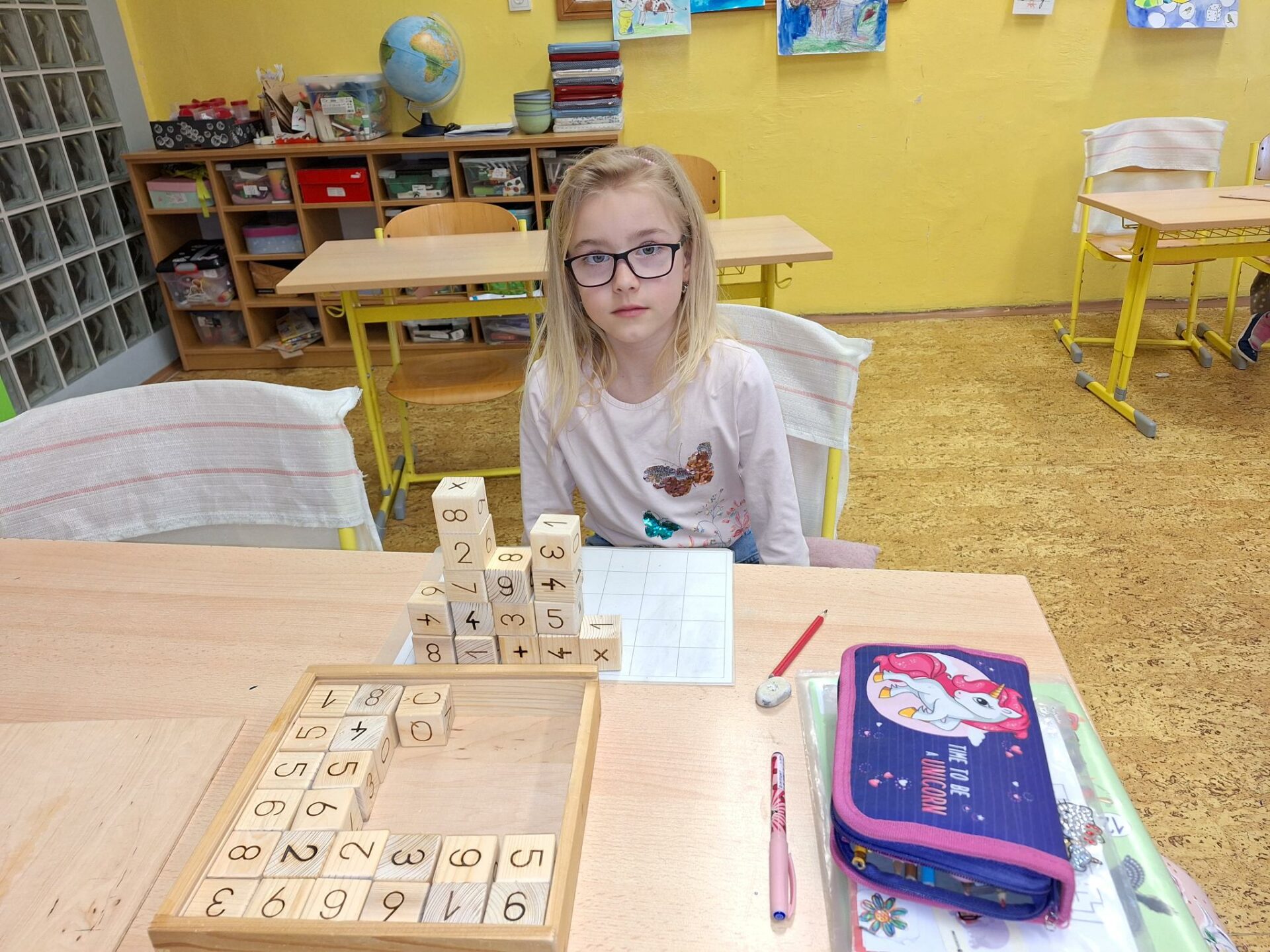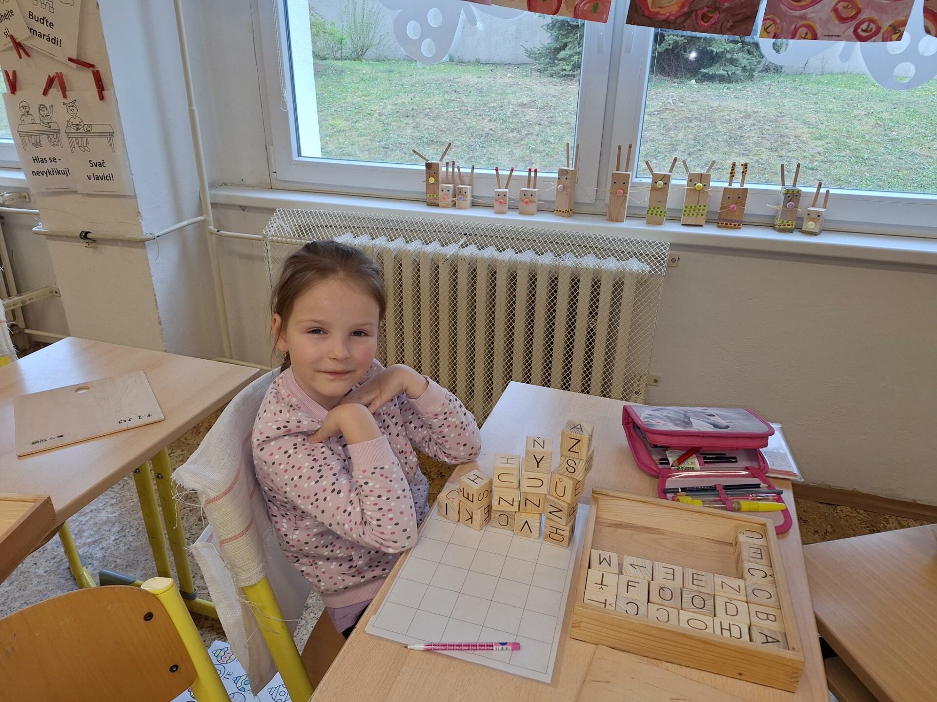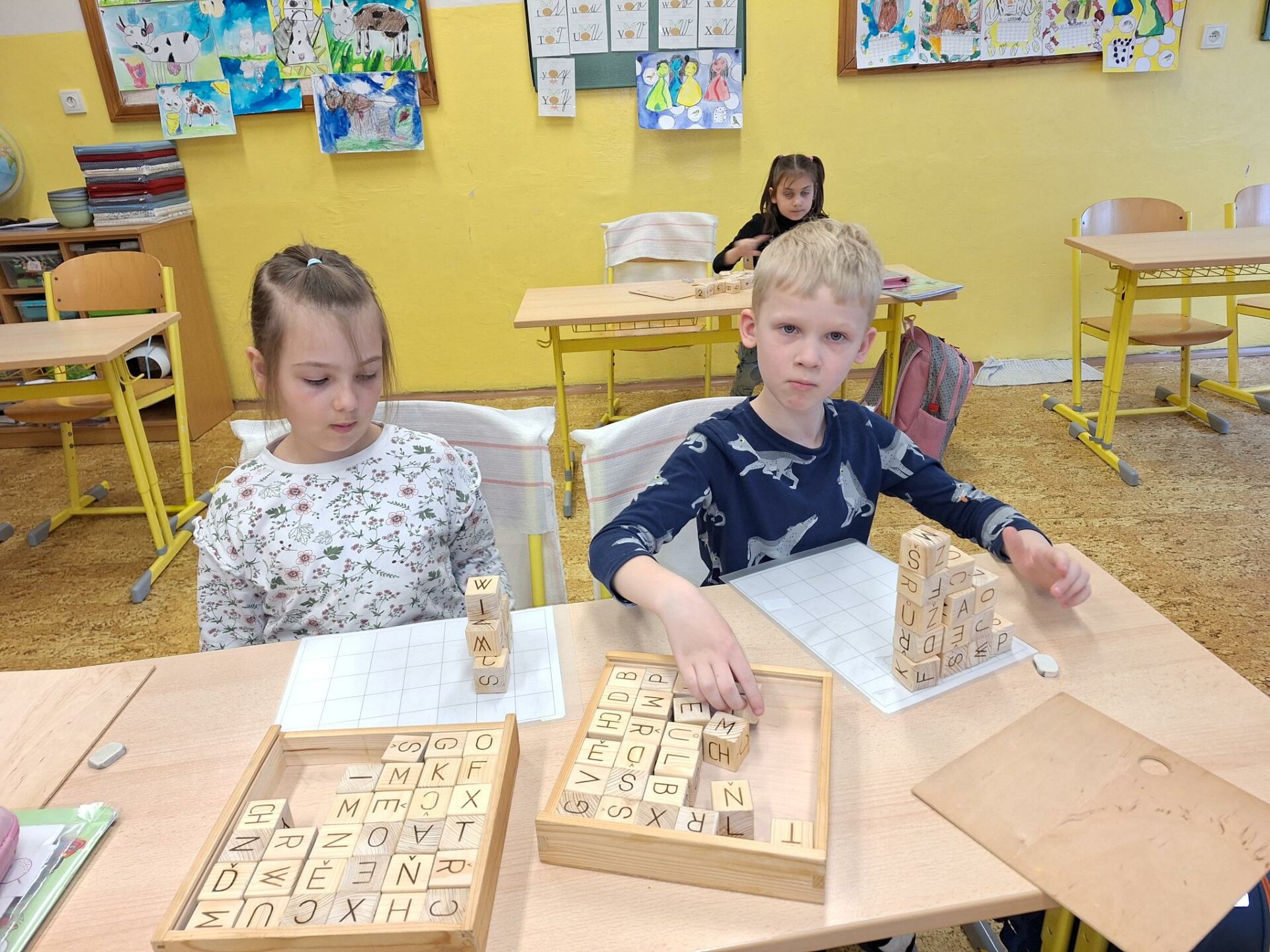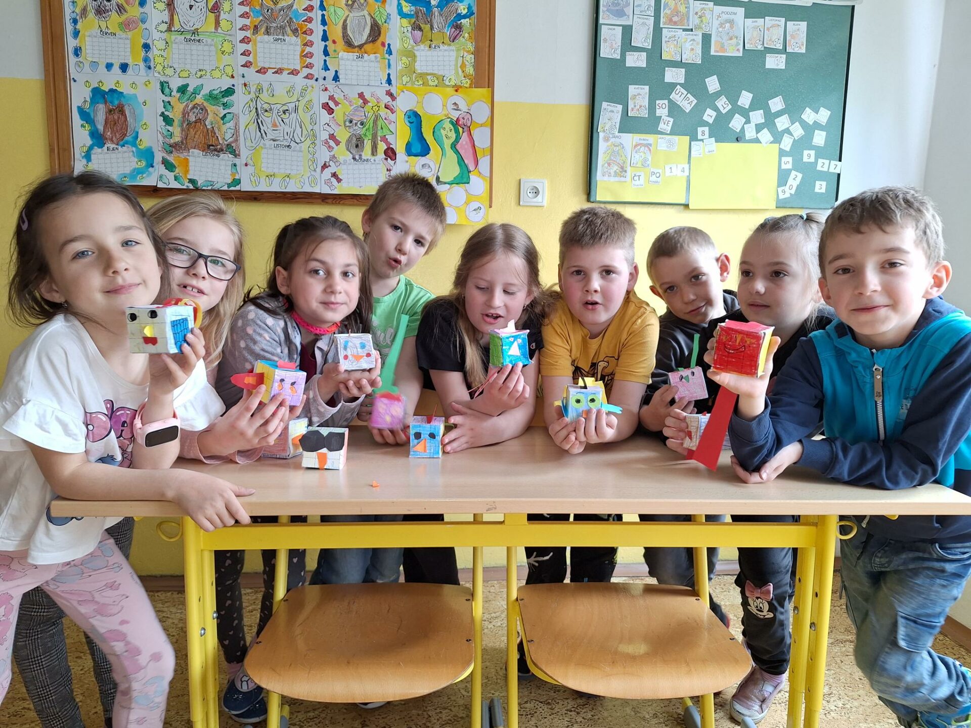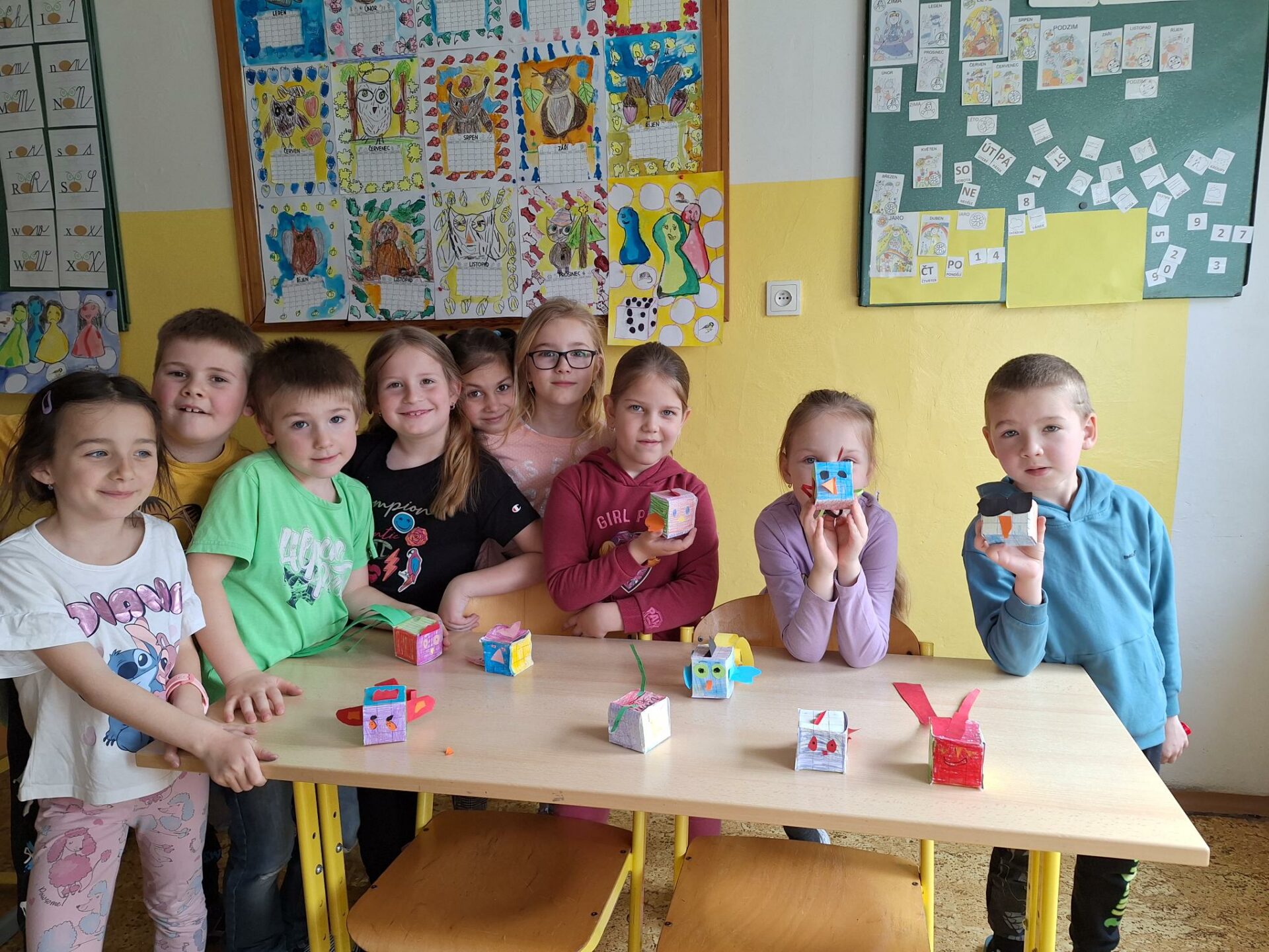 Házet kostkou umíme, ale vytvářet různé varianty staveb z krychlí a zapisovat jejich plány, tak to bylo něco nového. Také jsme se naučili zakreslit síť krychle do čtvercové sítě a slepit si vlastní kostičku. Jelikož se blíží Velikonoce, dotvořili jsme si krychličku do podoby slepičky.