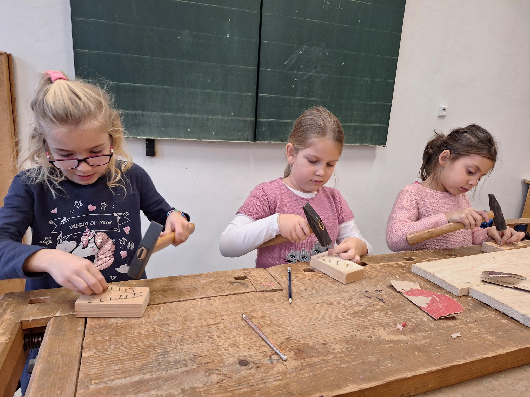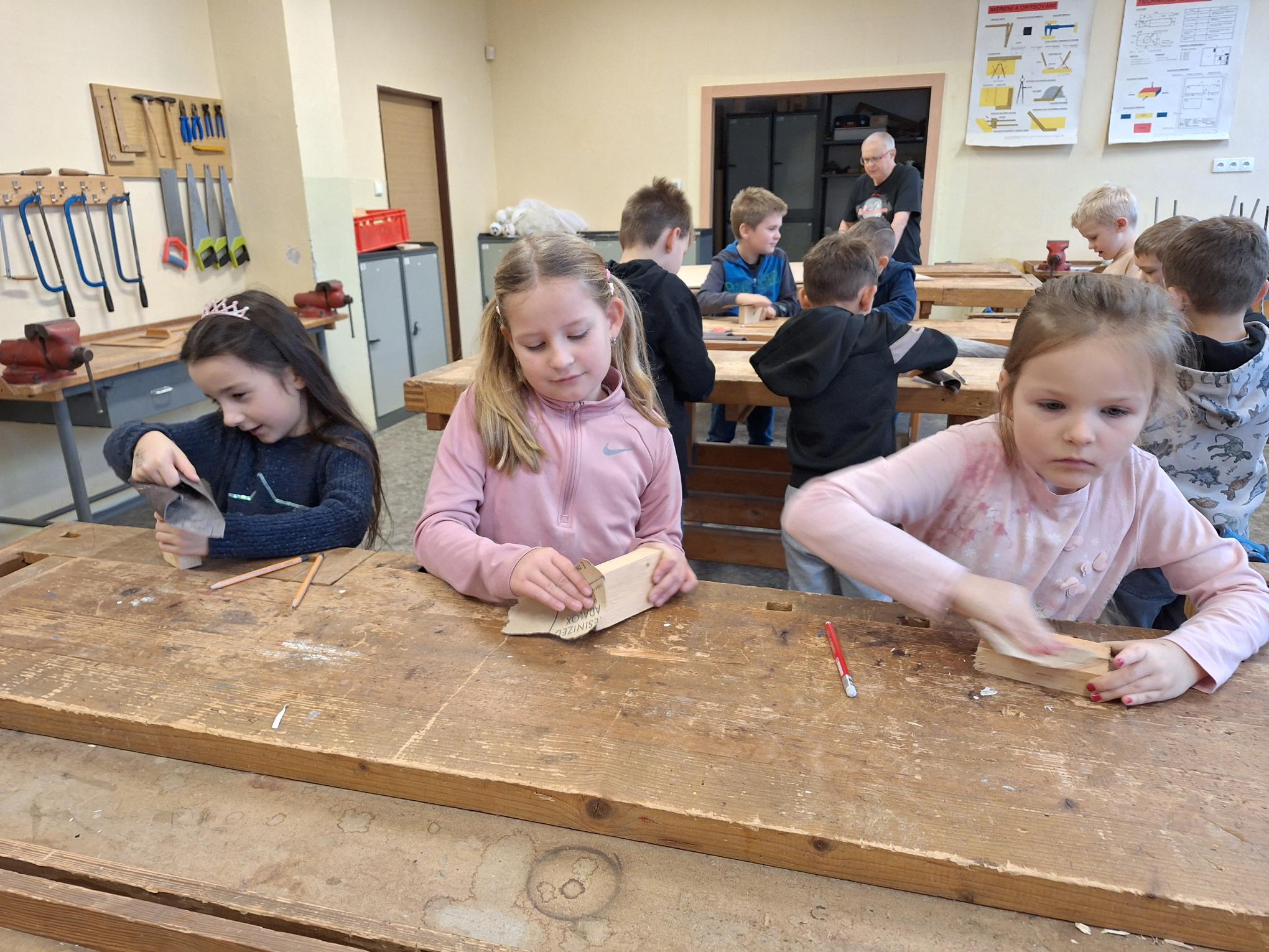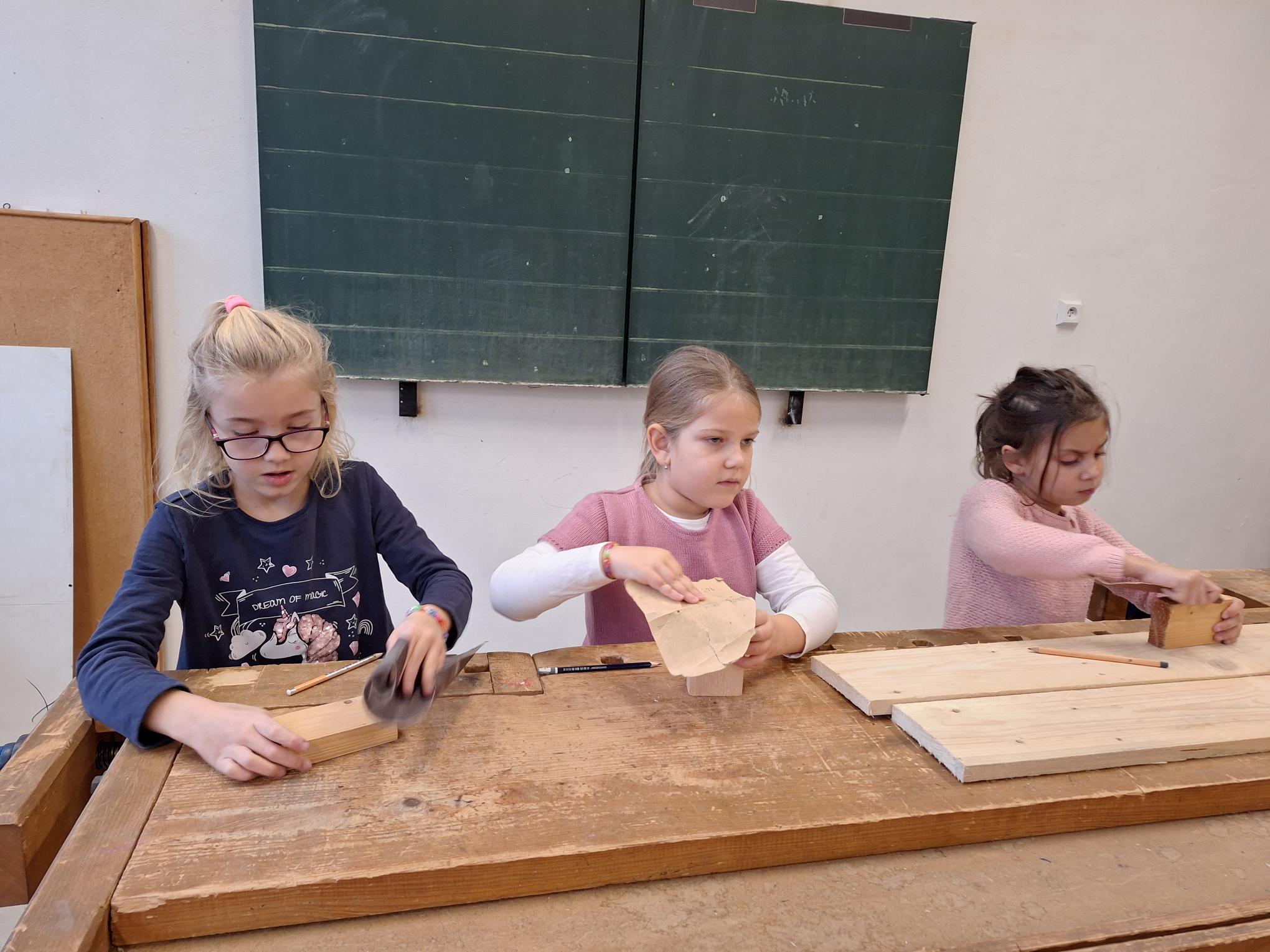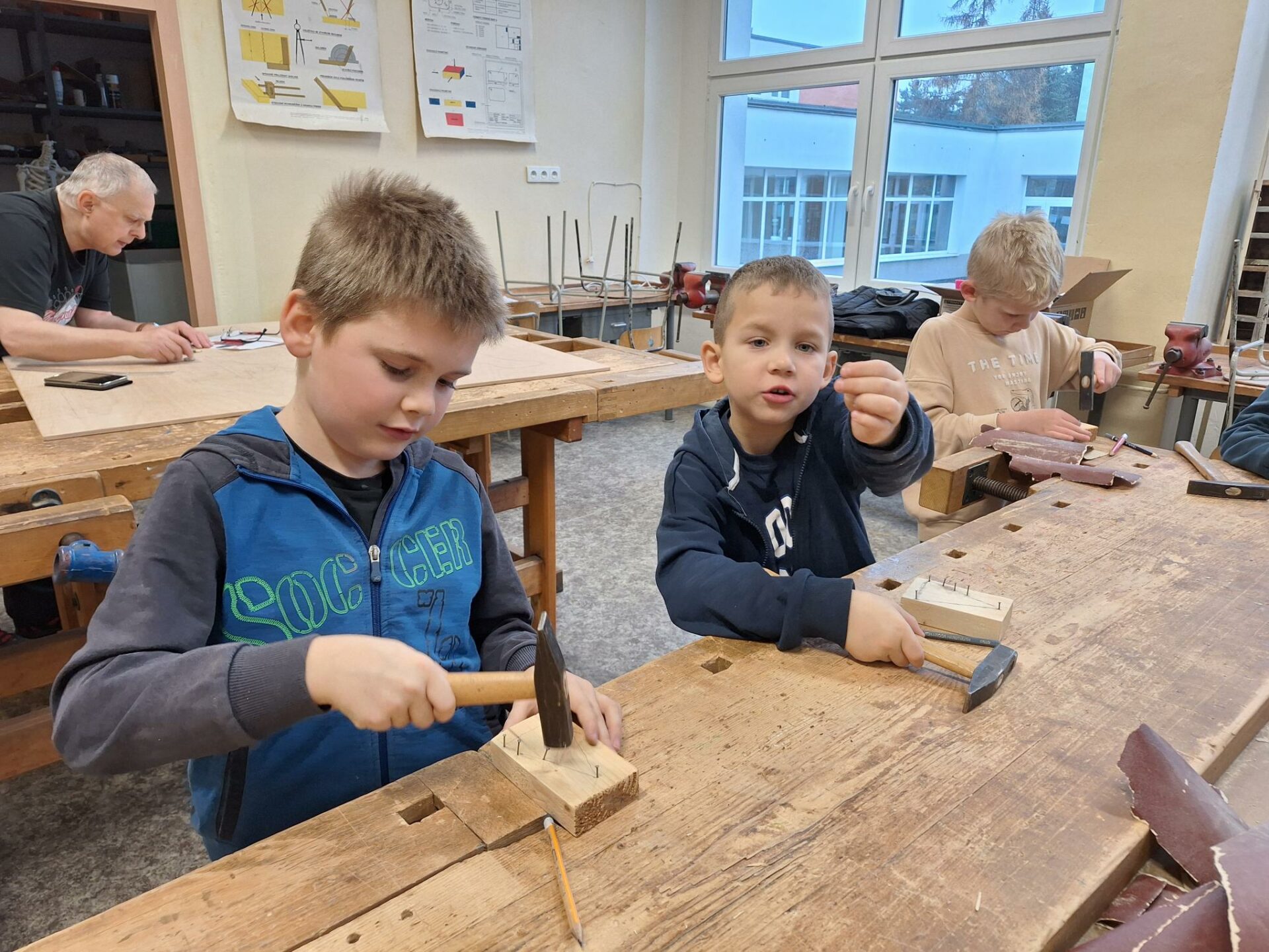 Poprvé jsme šli do naší školní dílny, kde jsme pracovali se dřevem. Nejprve jsme usilovně brousili, pak jsme obkreslovali a odměřovali. Nakonec jsme zatloukali hřebíčky. Naše výtvory jsme ve třídě natřeli zvolenou barvou. Výrobek jsme dokončili omotáváním vlnek kolem hřebíčků. Vánoční obrázek byl na světě.