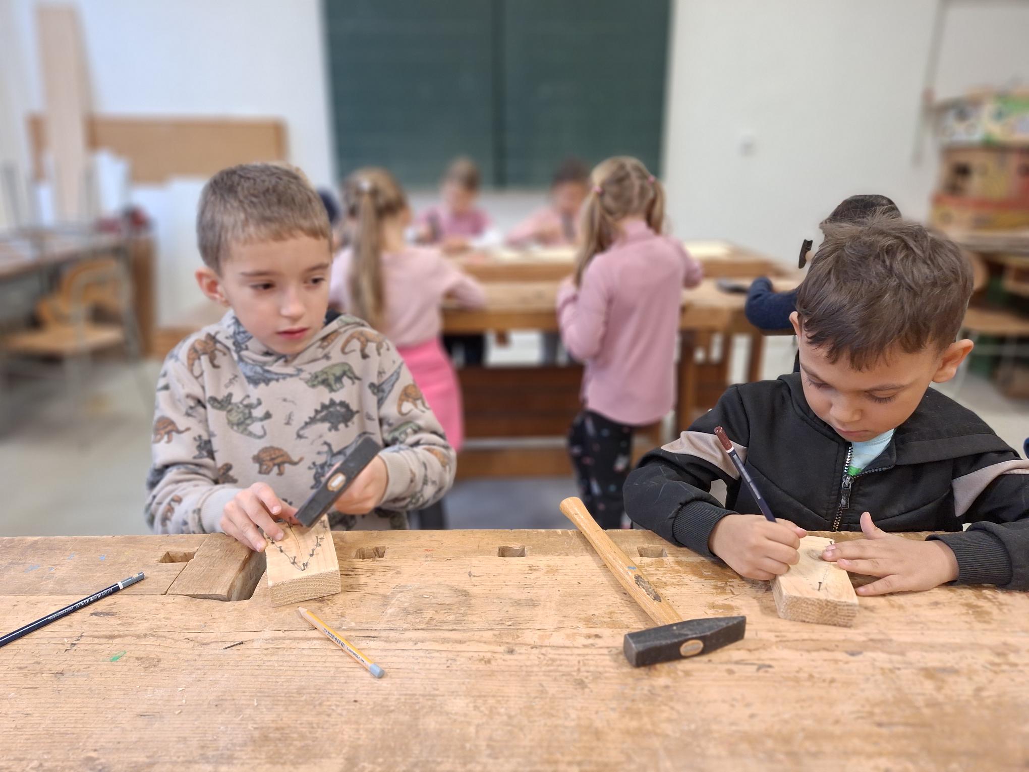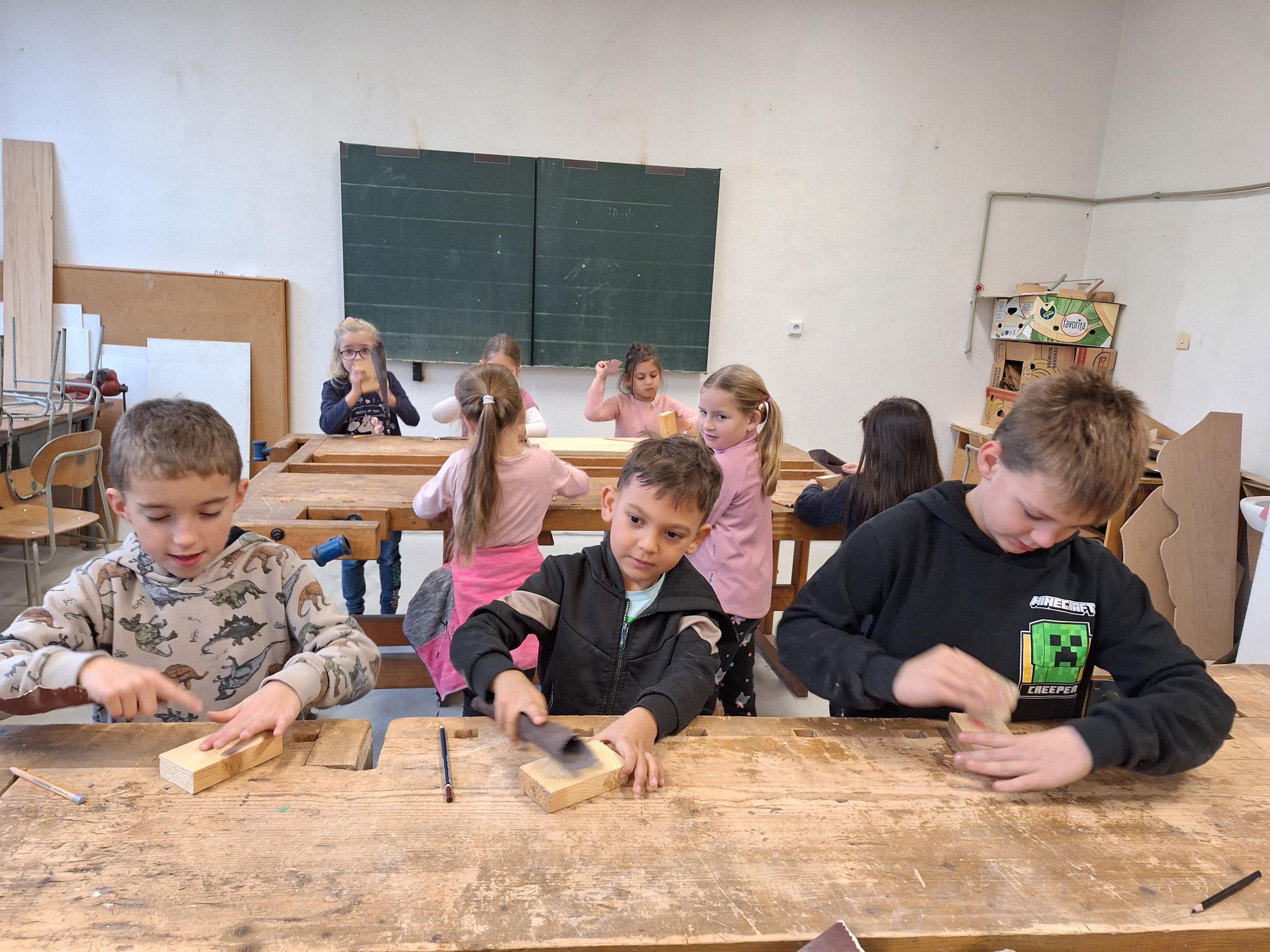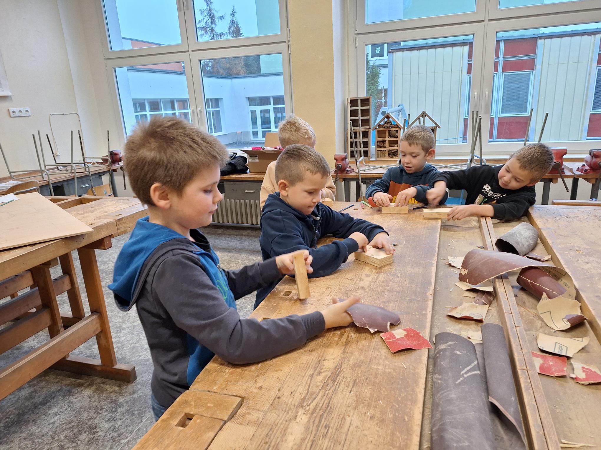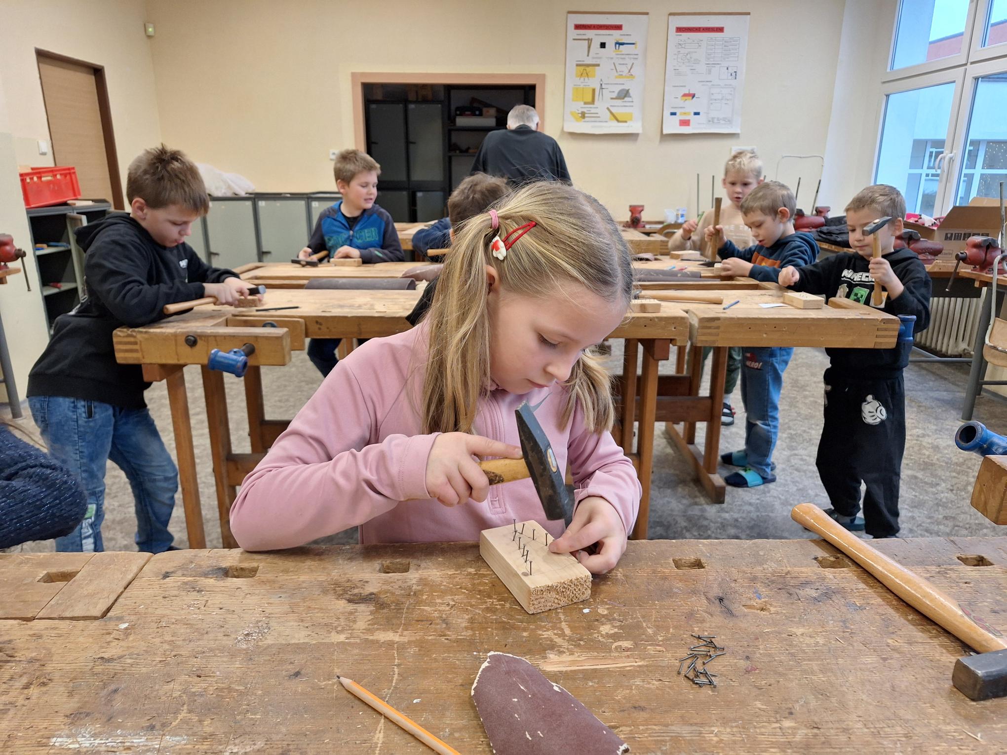 Poprvé jsme šli do naší školní dílny, kde jsme pracovali se dřevem. Nejprve jsme usilovně brousili, pak jsme obkreslovali a odměřovali. Nakonec jsme zatloukali hřebíčky. Naše výtvory jsme ve třídě natřeli zvolenou barvou. Výrobek jsme dokončili omotáváním vlnek kolem hřebíčků. Vánoční obrázek byl na světě.
