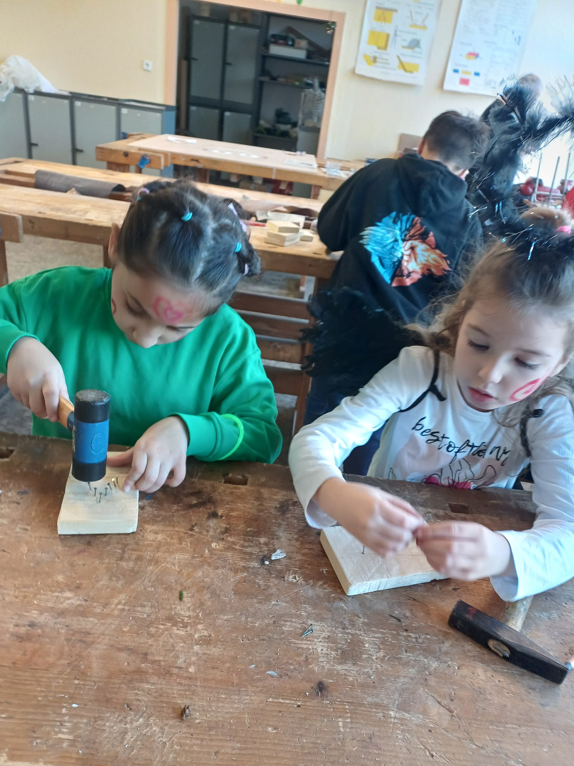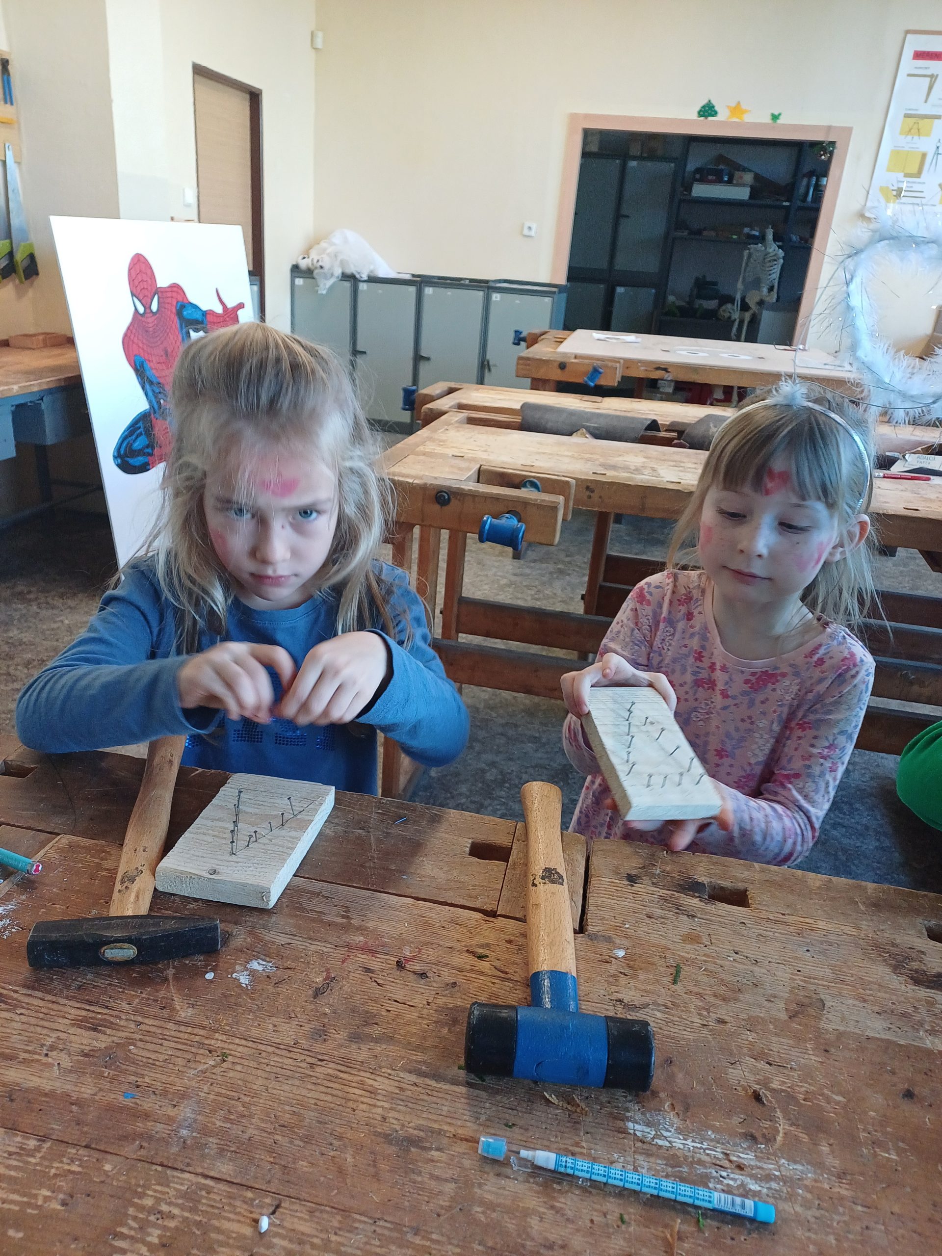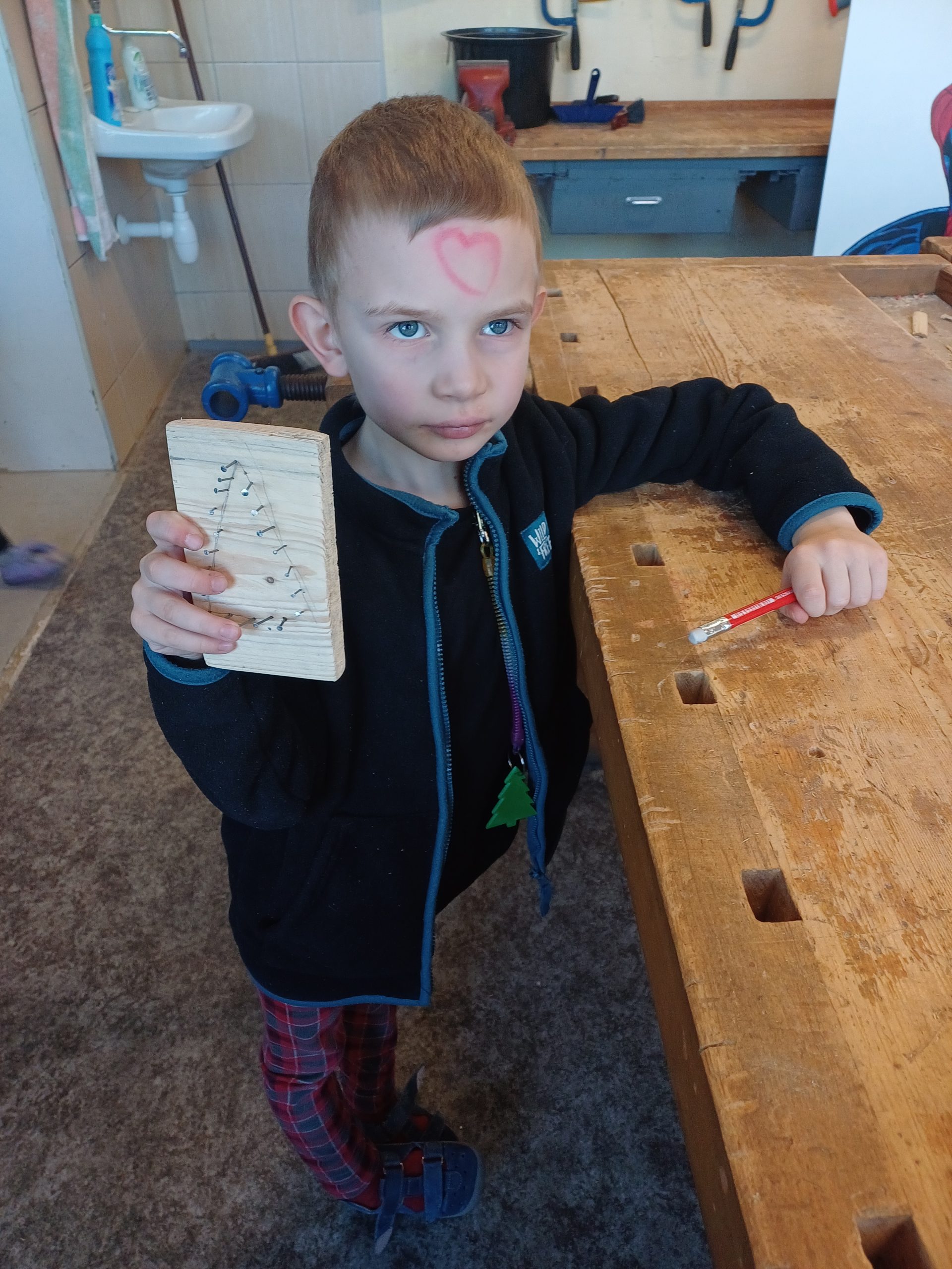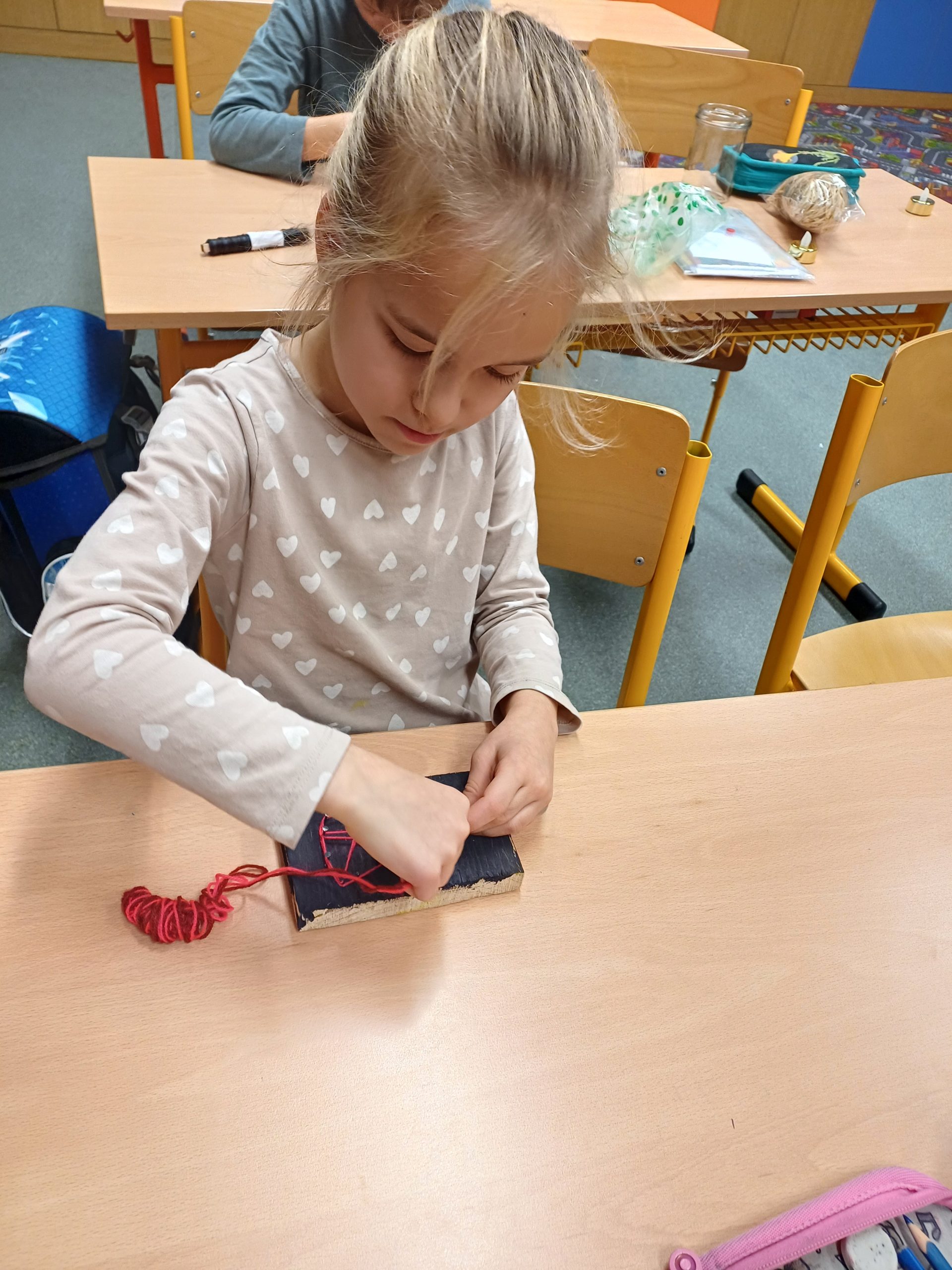 Vyrazili jsme do školní dílny. Hřebíky, kladívko, kleště a kus dřeva, to vše jsme k práci potřebovali. Prsty máme všechny a vytvořili jsme krásné stromečky, které jsme ve třídě ještě natřeli barvou a propletli bavlnkou.