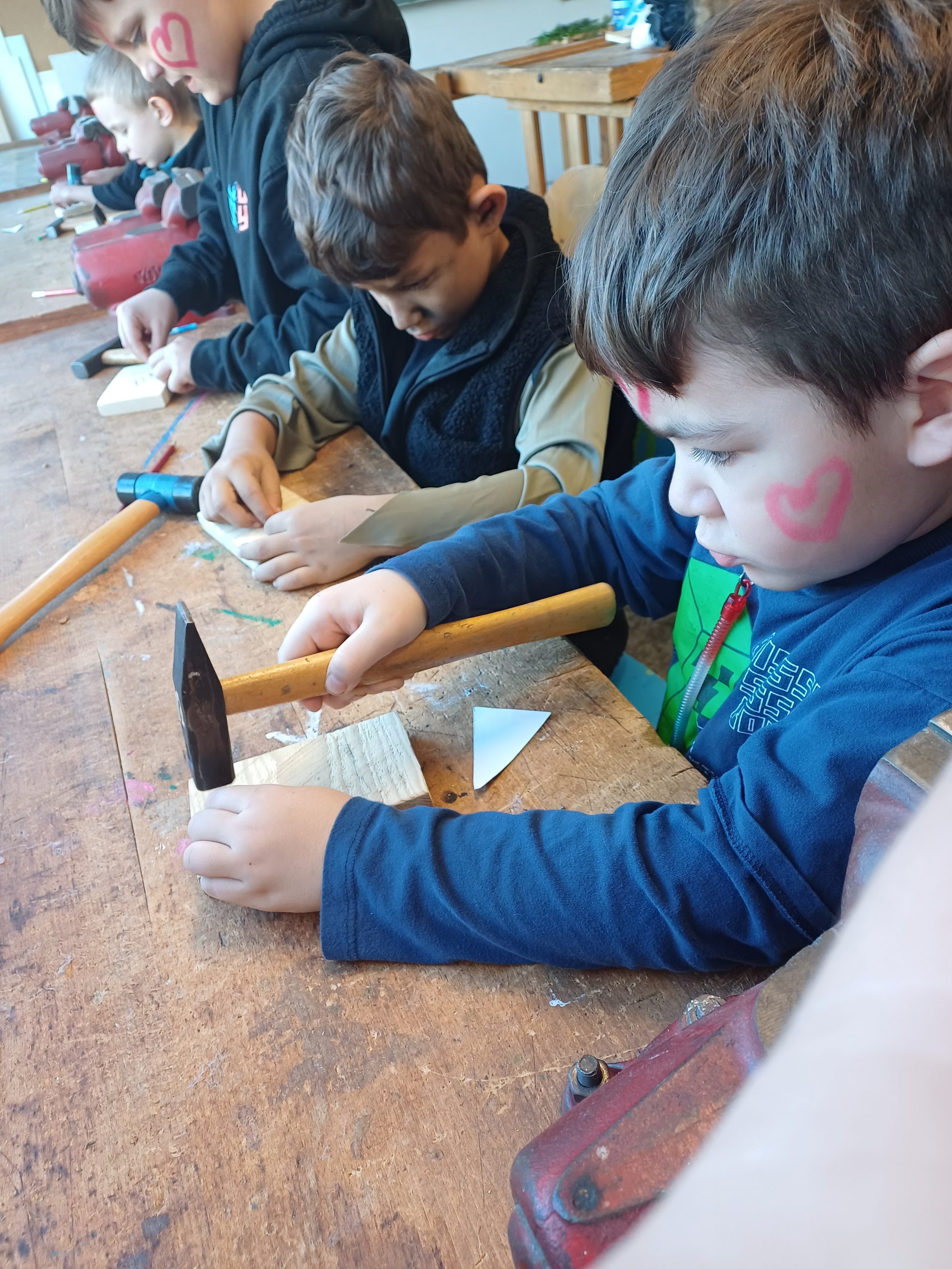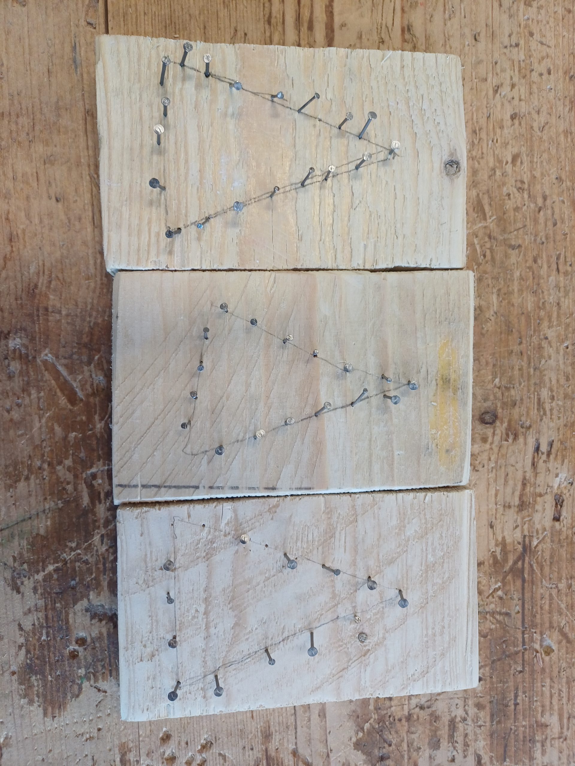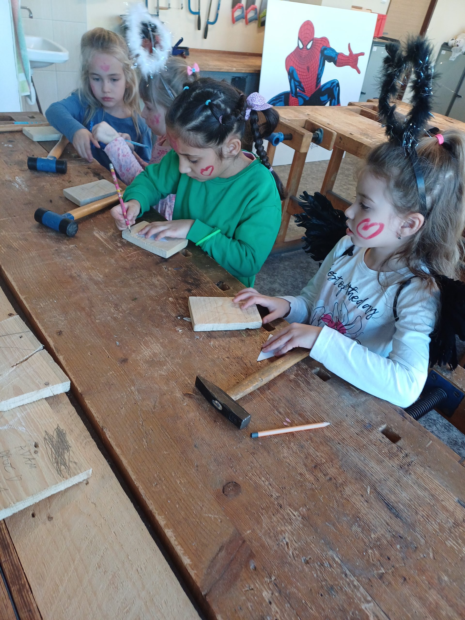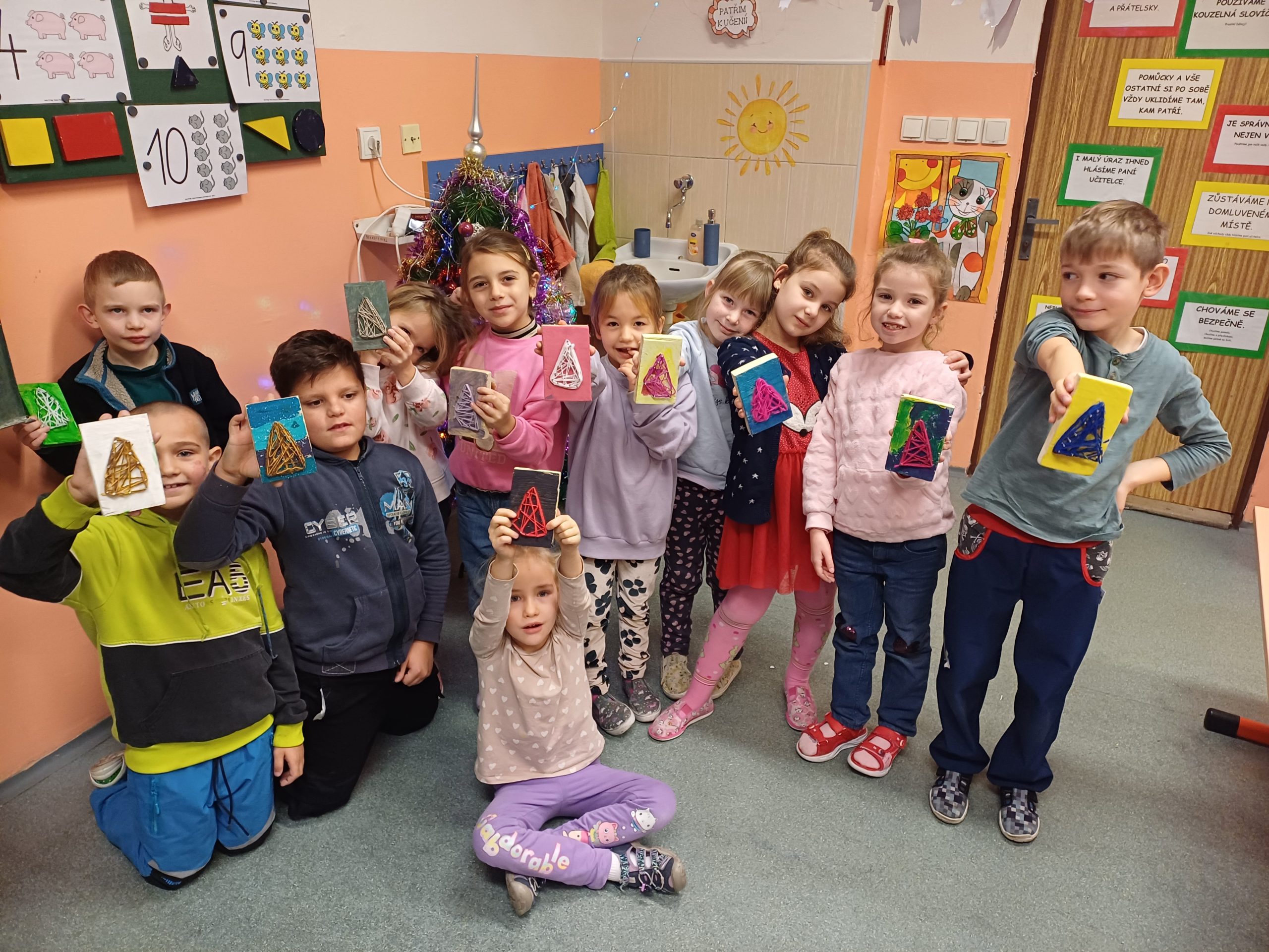 Vyrazili jsme do školní dílny. Hřebíky, kladívko, kleště a kus dřeva, to vše jsme k práci potřebovali. Prsty máme všechny a vytvořili jsme krásné stromečky, které jsme ve třídě ještě natřeli barvou a propletli bavlnkou.