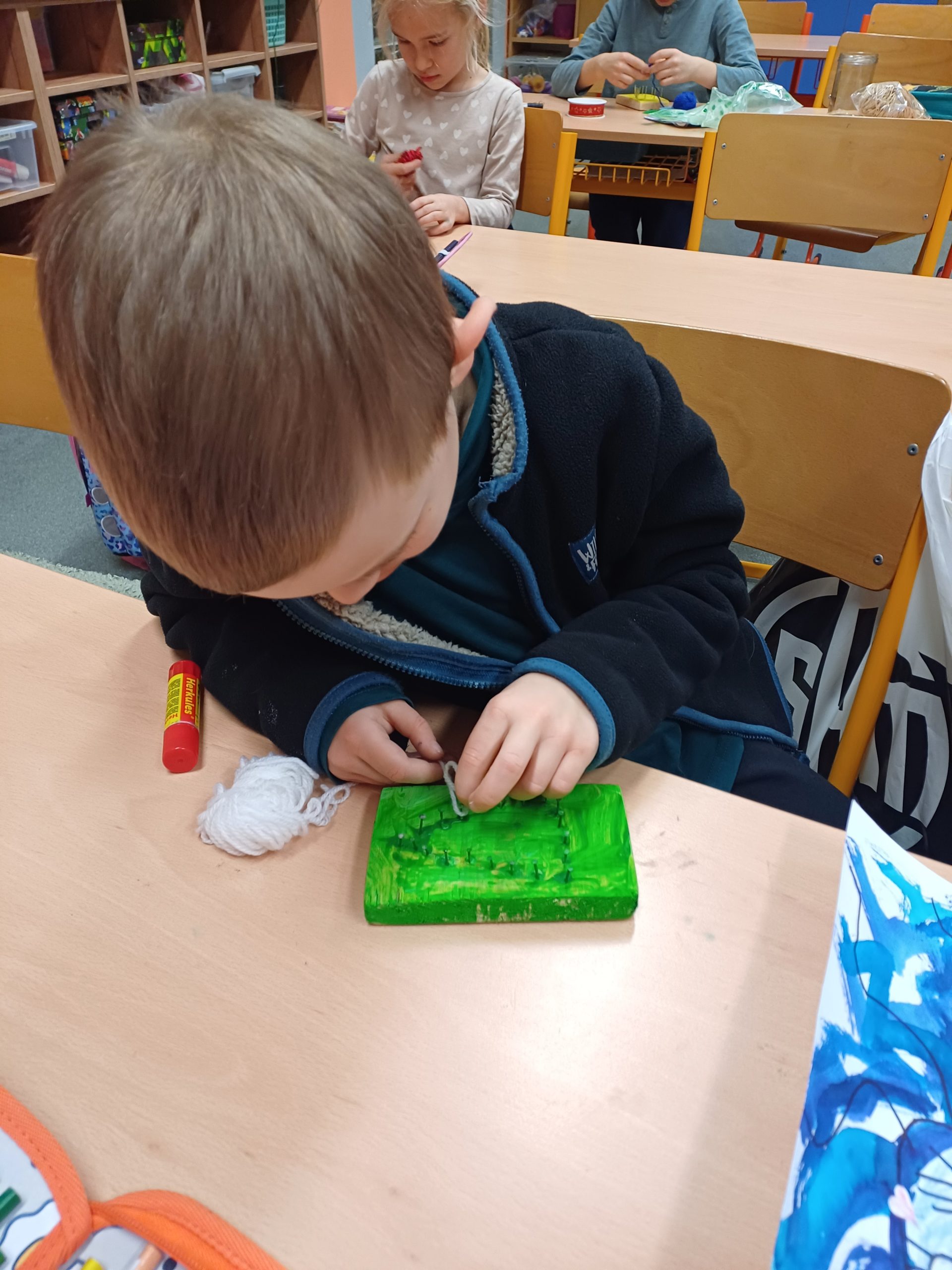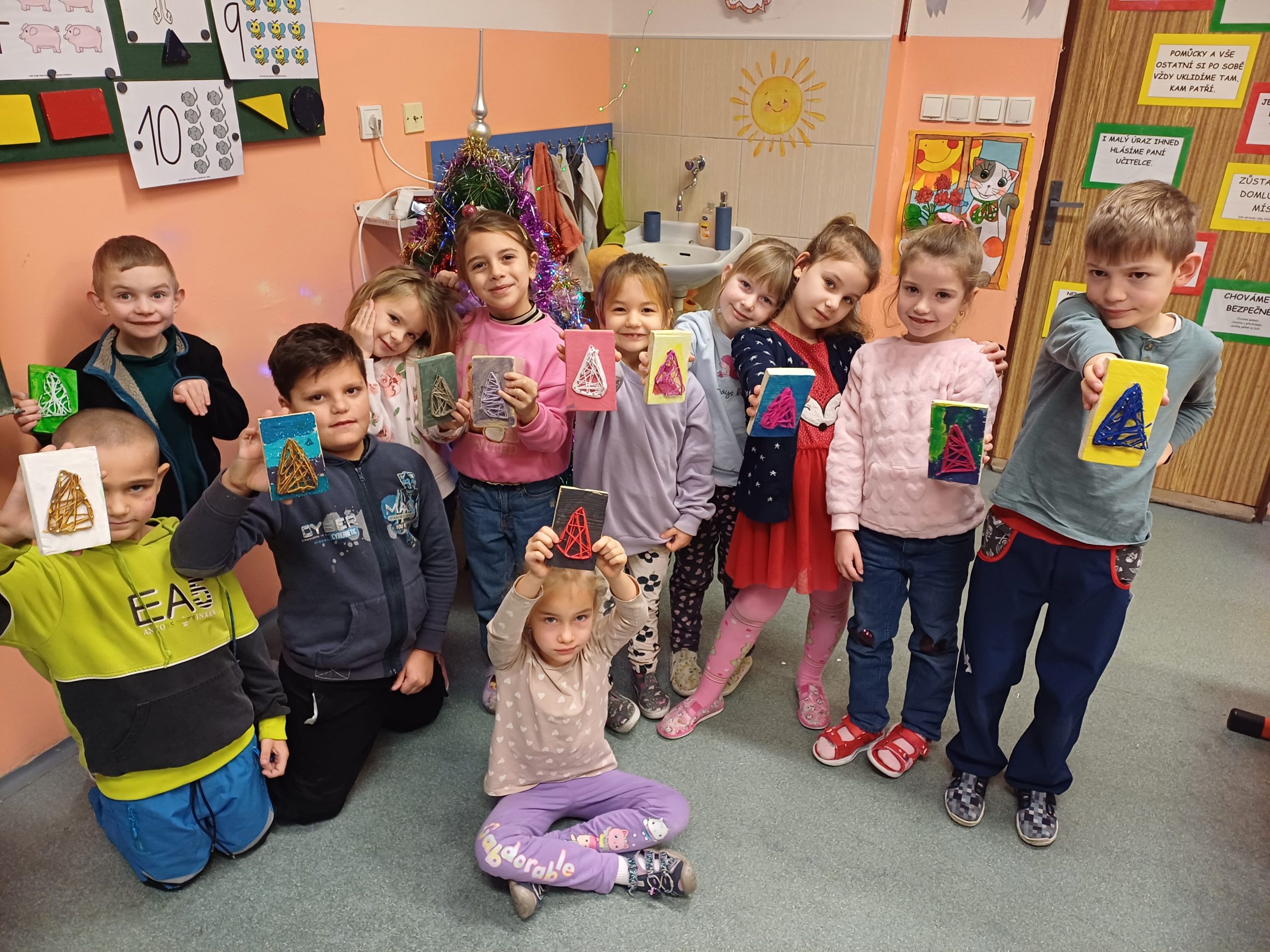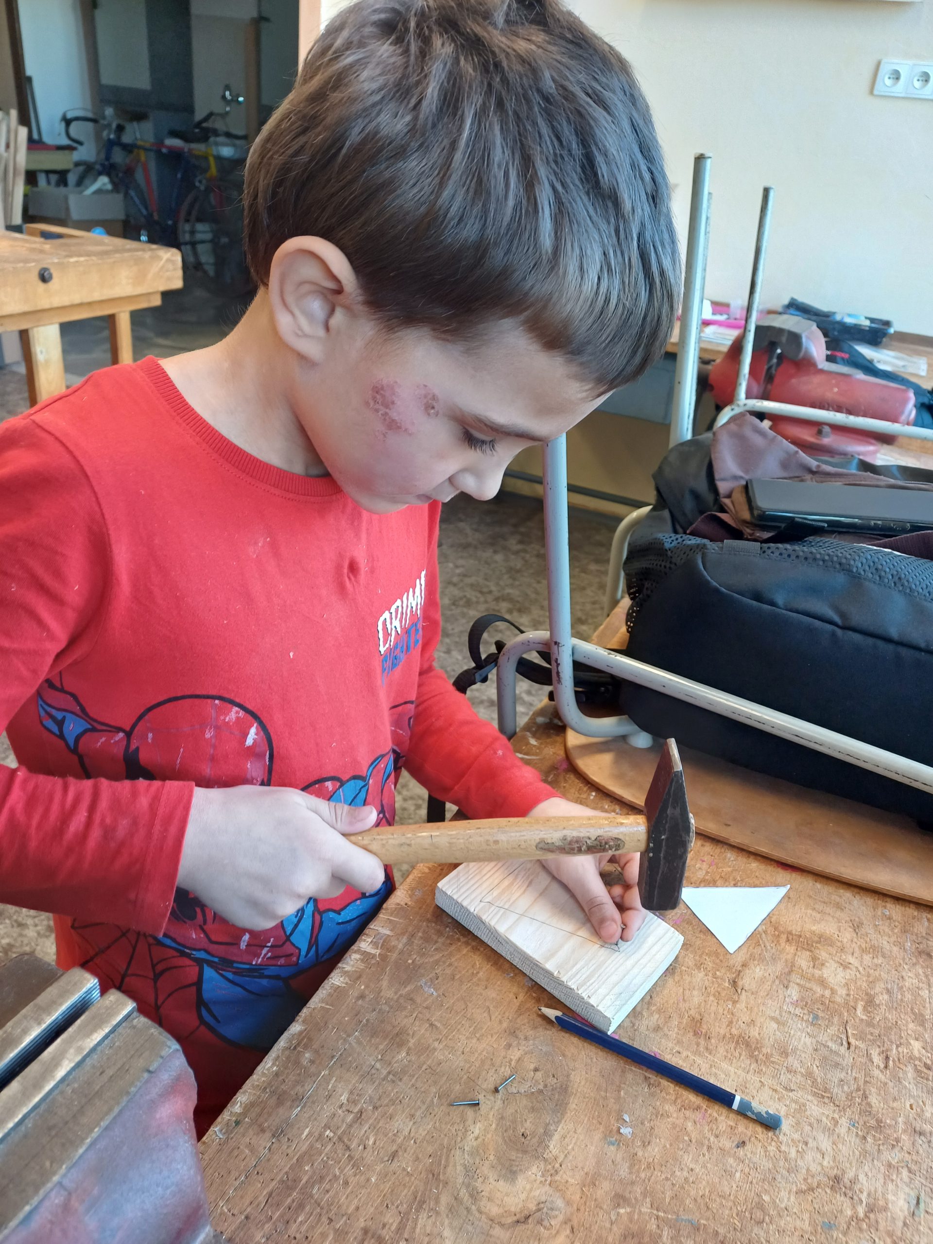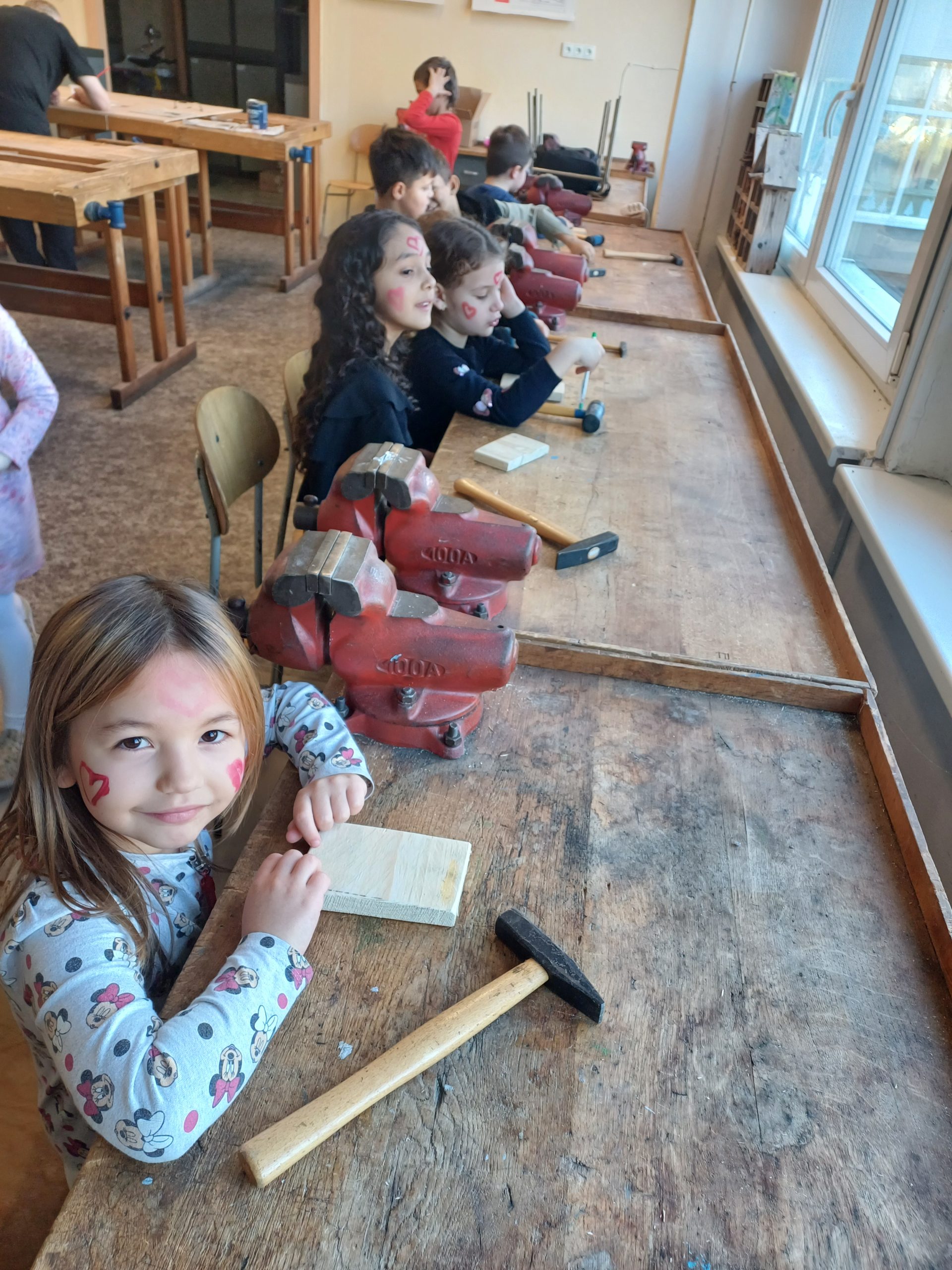 Vyrazili jsme do školní dílny. Hřebíky, kladívko, kleště a kus dřeva, to vše jsme k práci potřebovali. Prsty máme všechny a vytvořili jsme krásné stromečky, které jsme ve třídě ještě natřeli barvou a propletli bavlnkou.
