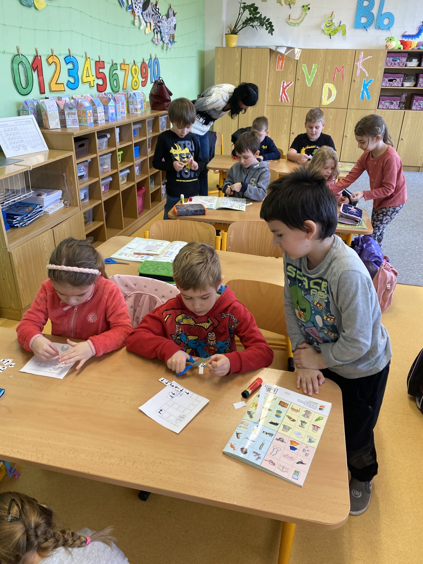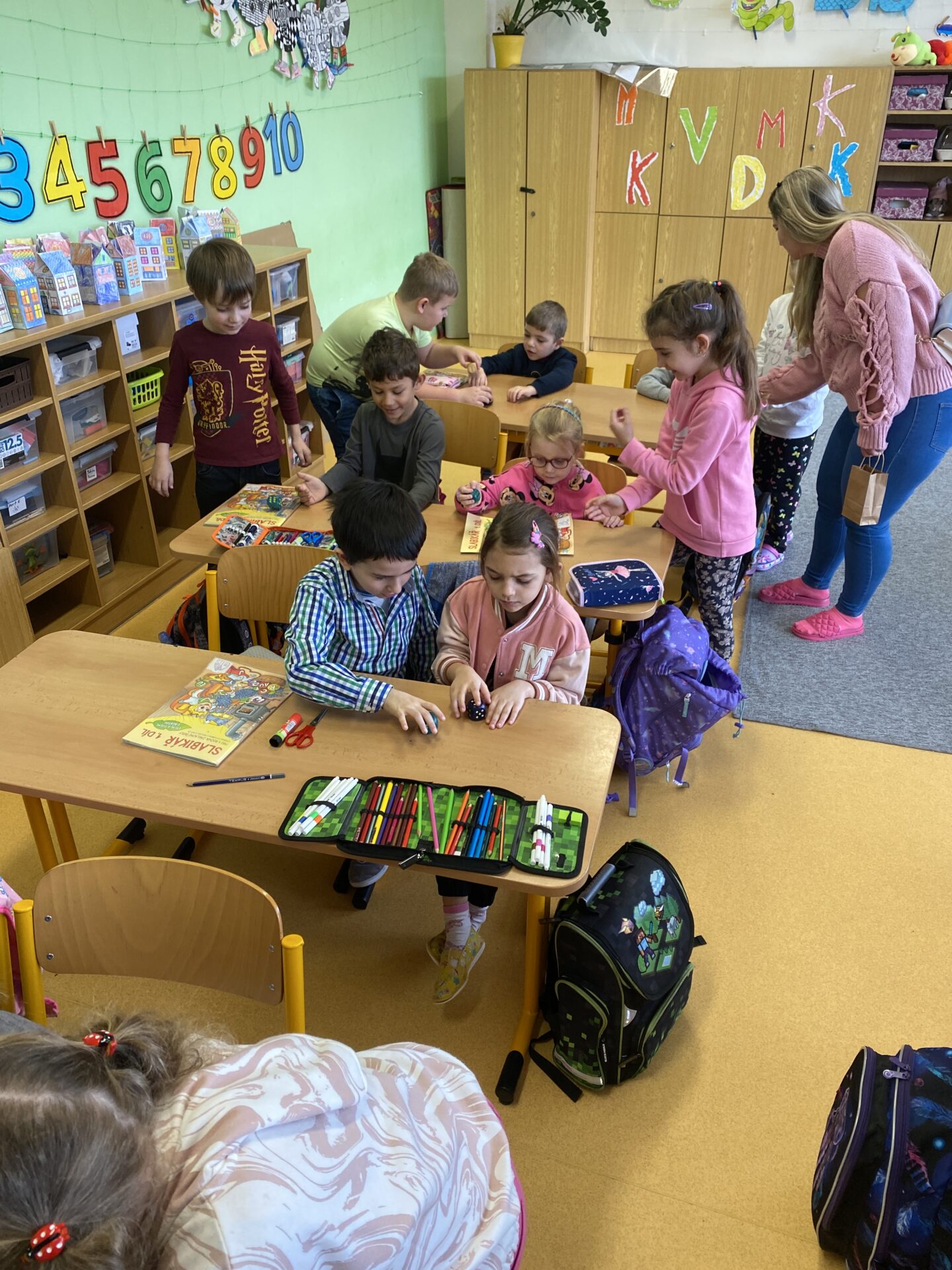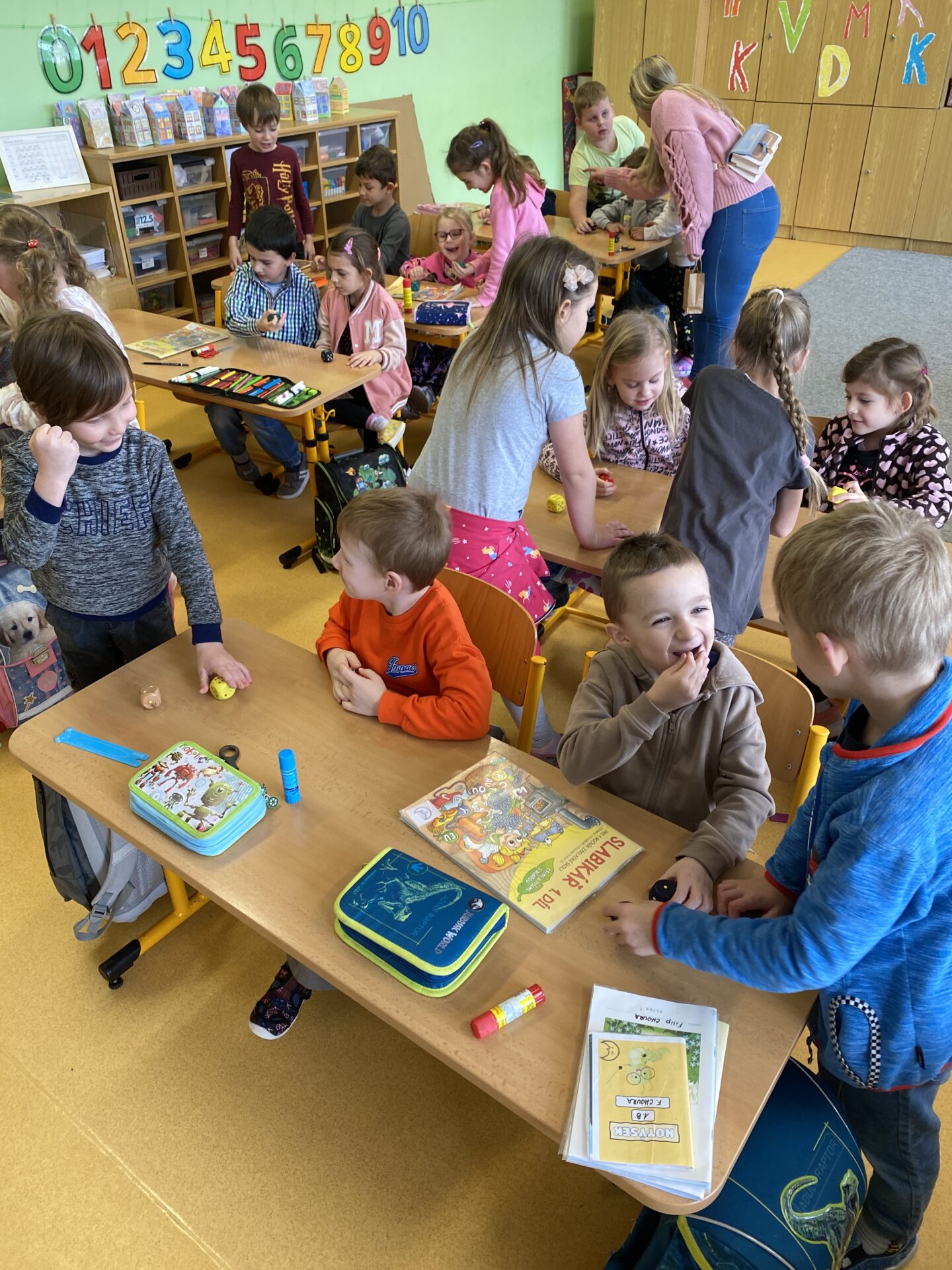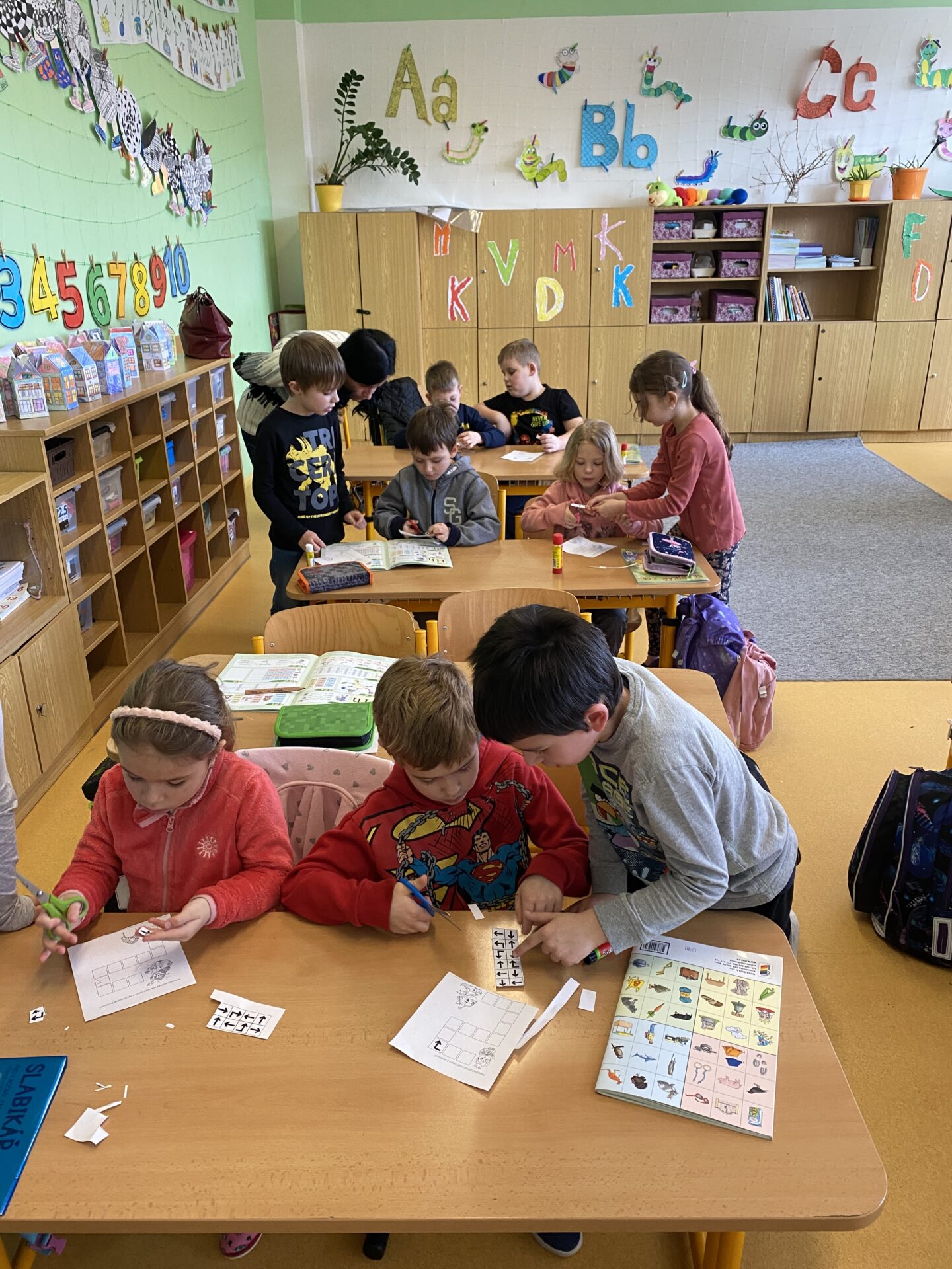 Navštívili nás kamarádi ze školky. Ukázali jsme jim, co všechno jsme se od září naučili. Společně jsme četli ze slabikáře, porovnávali čísla, stříhali a lepili cestu ze šipek. Těšíme se, že se s některými budeme od září potkávat.