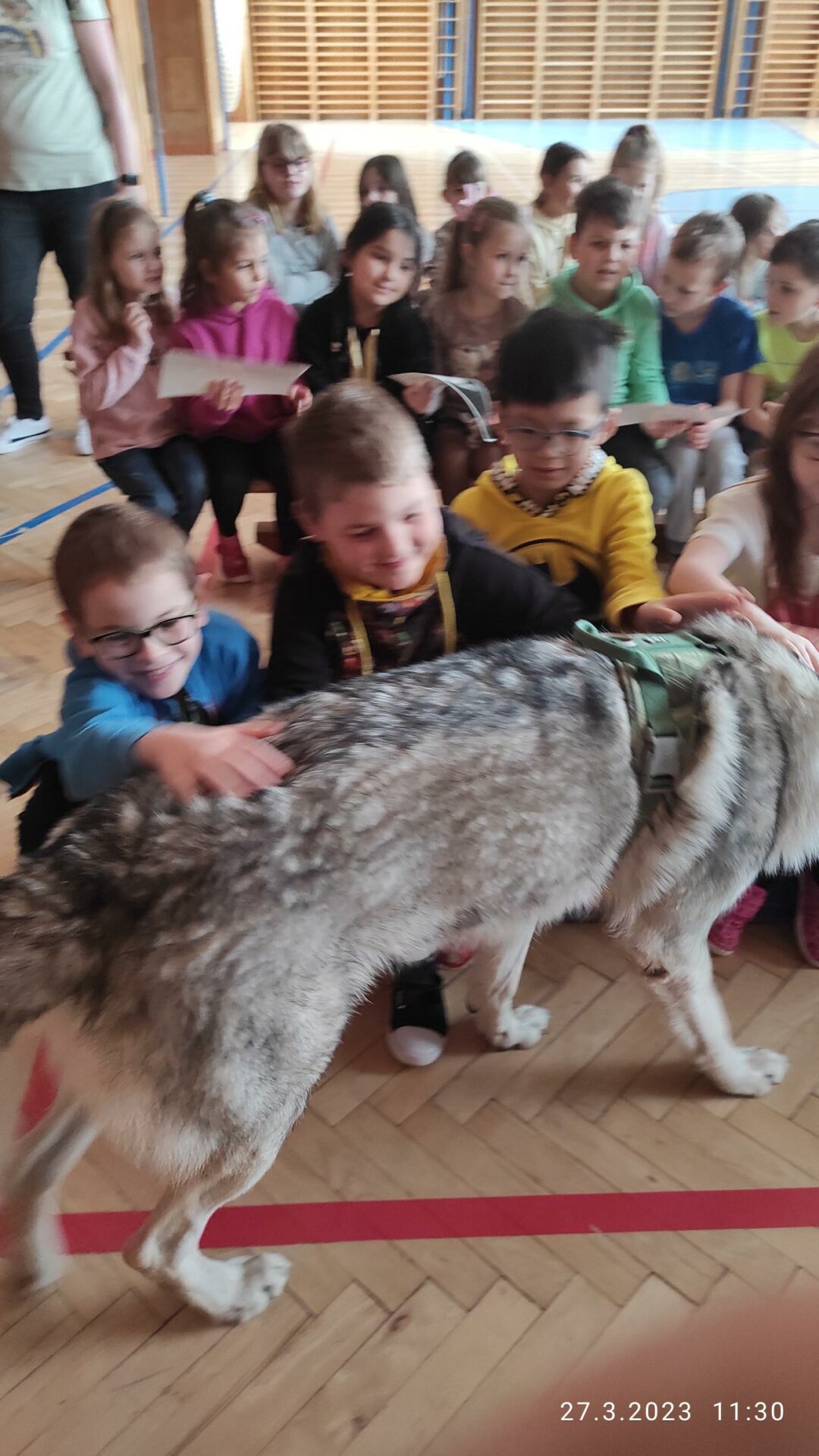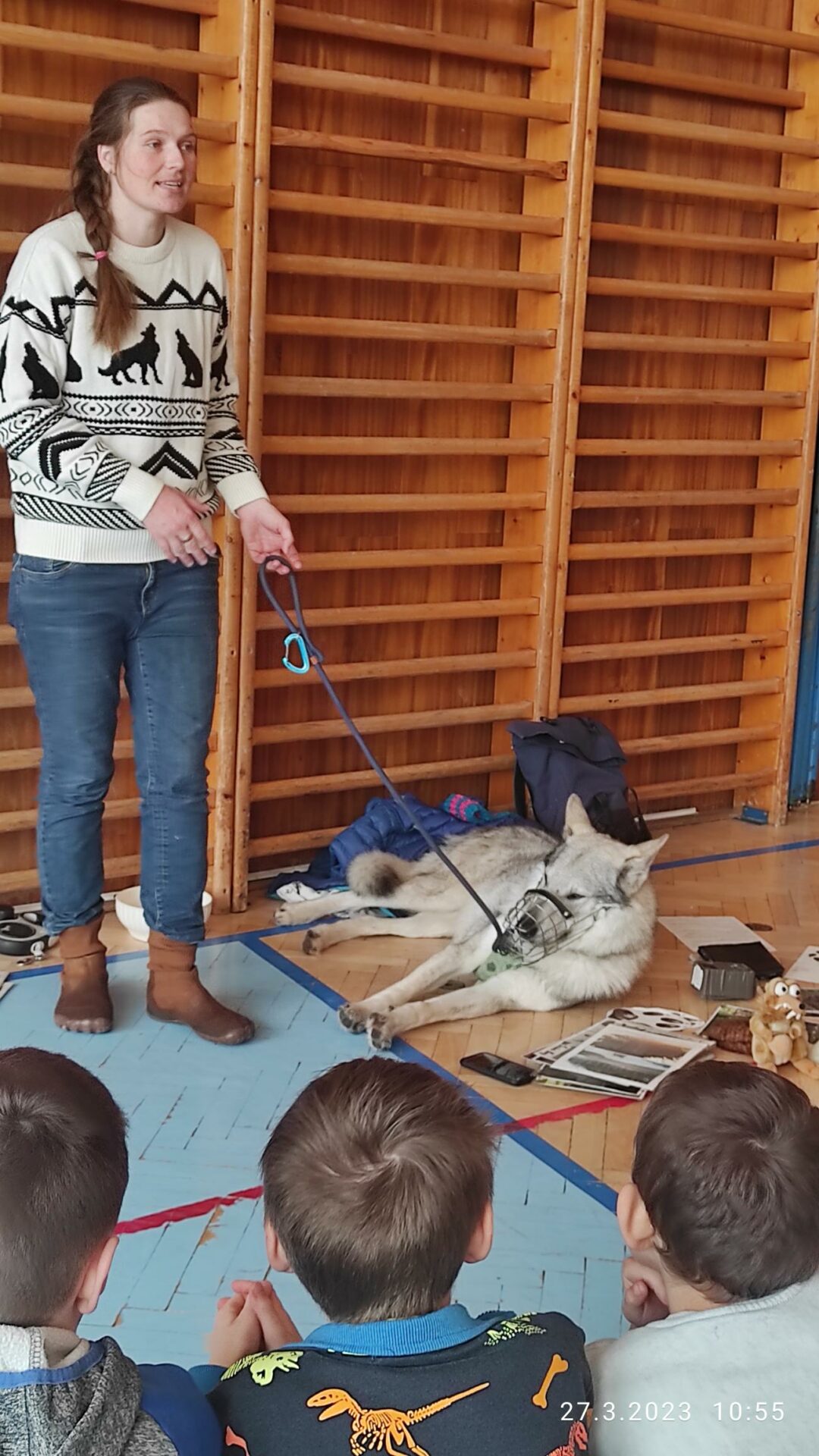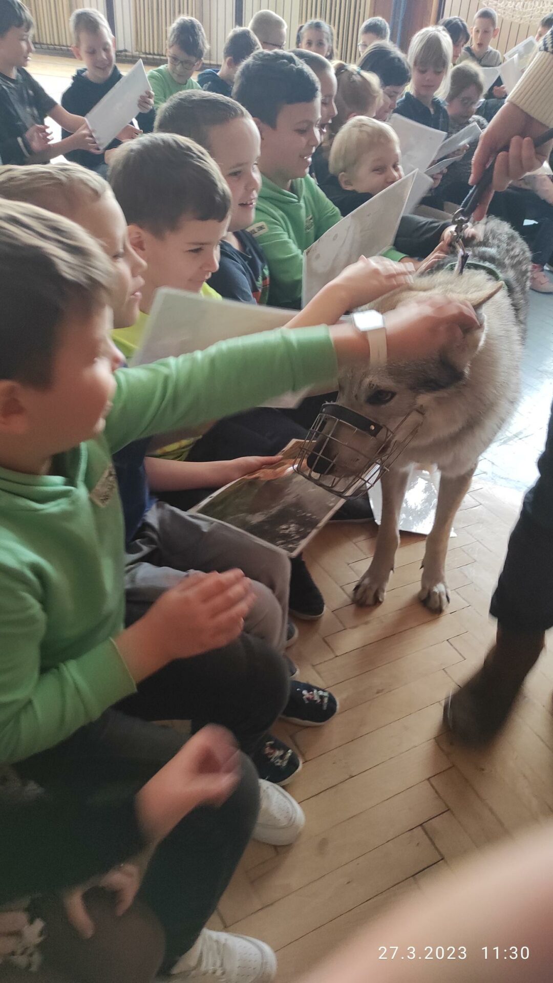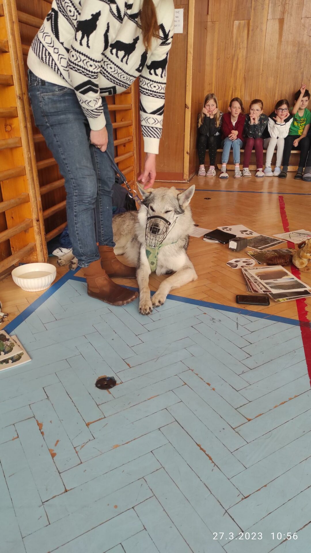 Dnes jsme se mohli setkat s jednou z našich ohrožených šelem – s vlkem. Navštívila nás Štěpánka Kadlecová, stopařka vlků z Krušných hor se svým vlčím kamarádem. Jedná se o československého vlčáka, plemeno psa vzniklé zkřížením německého ovčáka a karpatského vlka. Dozvěděli jsme se o historii vlků v naší krajině, jak se vlk chová ve volné přírodě, kde se vyskytuje a spoustu dalších informací. Na závěr jsme si ho mohli pohladit. Moc se nám to líbilo. Skřítci z 1. B