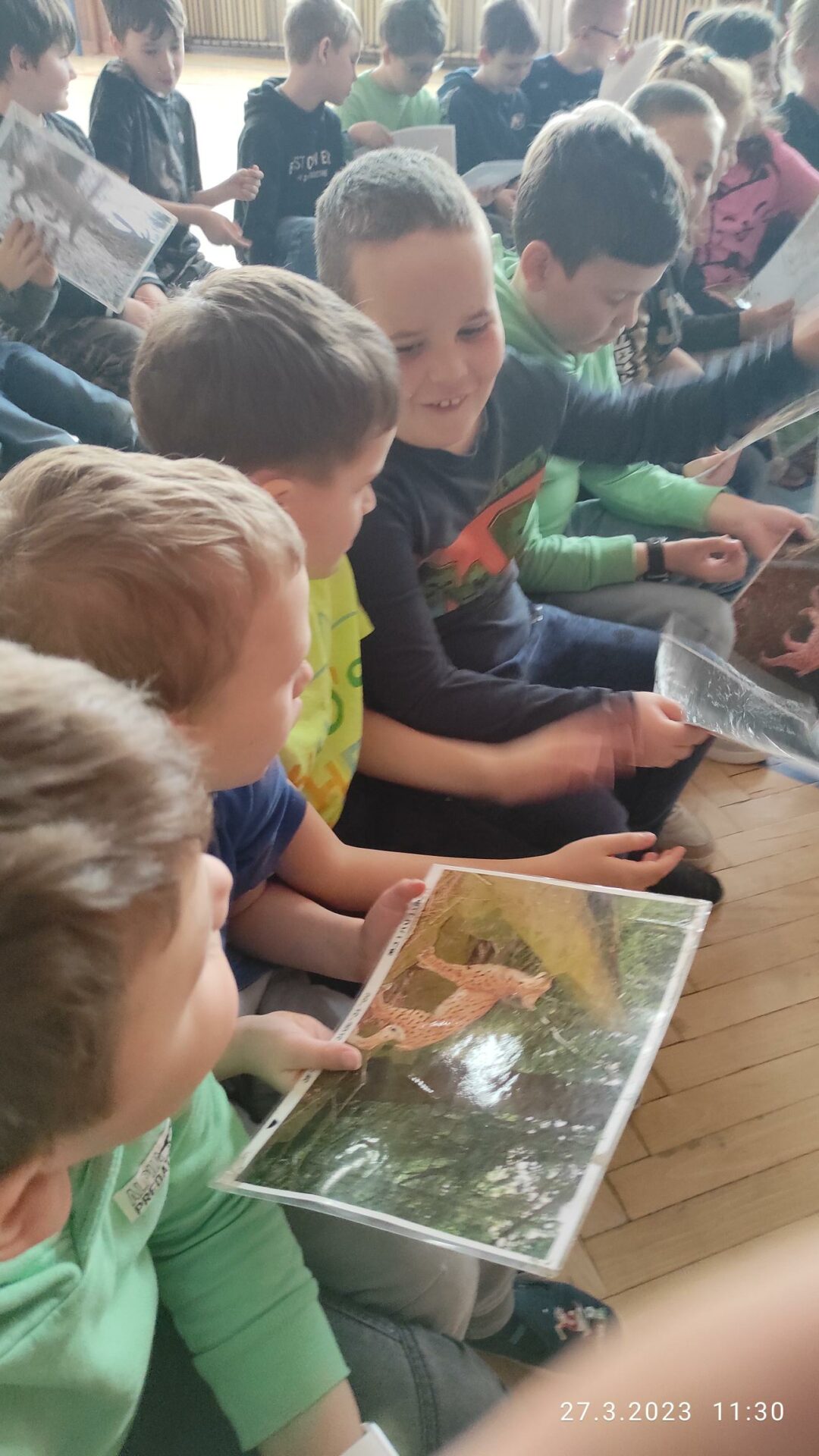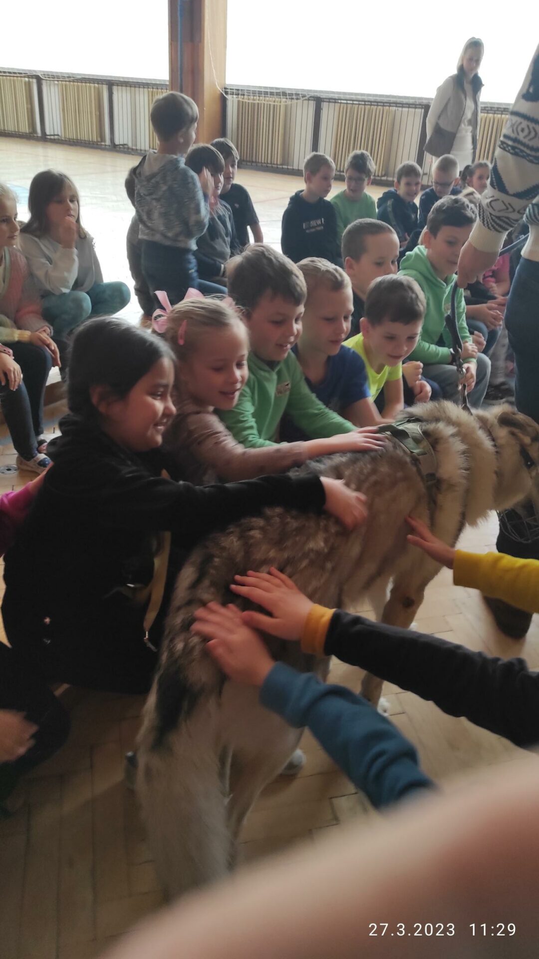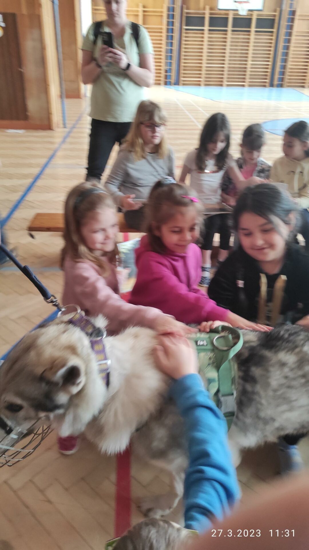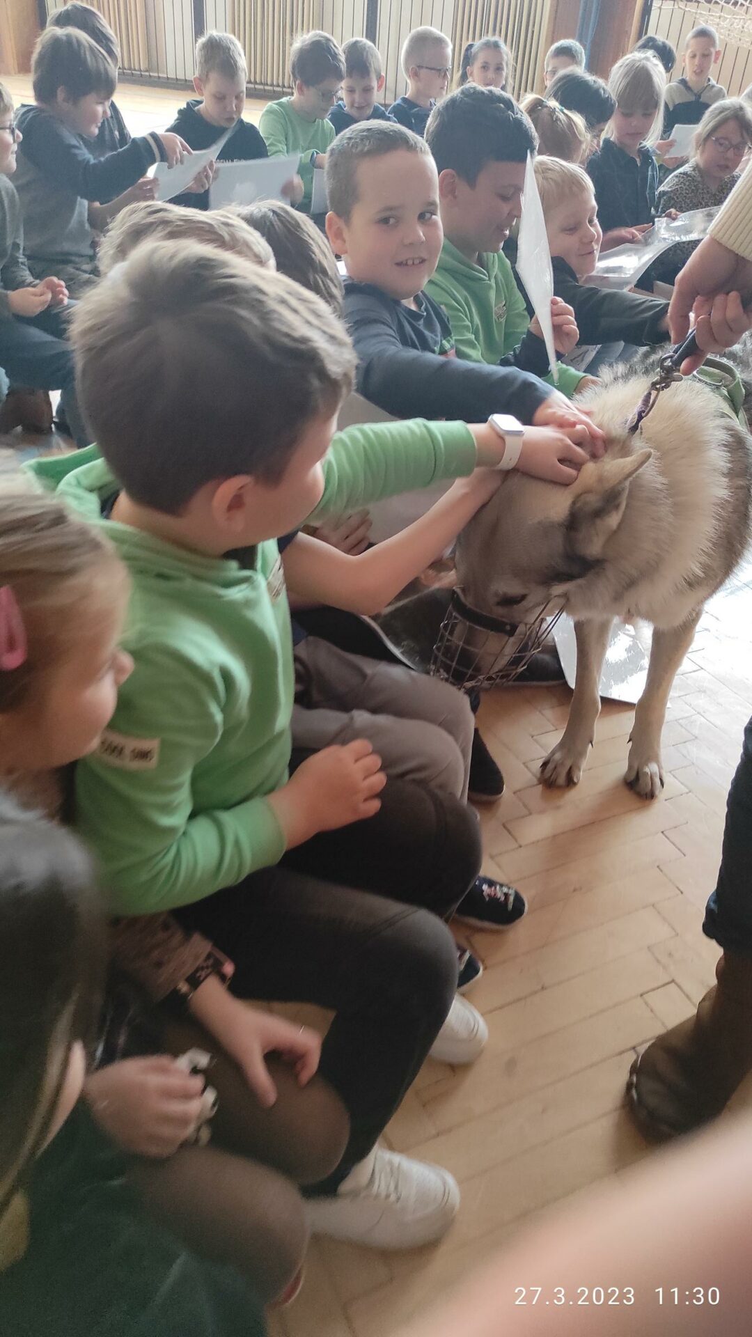Dnes jsme se mohli setkat s jednou z našich ohrožených šelem – s vlkem. Navštívila nás Štěpánka Kadlecová, stopařka vlků z Krušných hor se svým vlčím kamarádem. Jedná se o československého vlčáka, plemeno psa vzniklé zkřížením německého ovčáka a karpatského vlka. Dozvěděli jsme se o historii vlků v naší krajině, jak se vlk chová ve volné přírodě, kde se vyskytuje a spoustu dalších informací. Na závěr jsme si ho mohli pohladit. Moc se nám to líbilo. Skřítci z 1. B