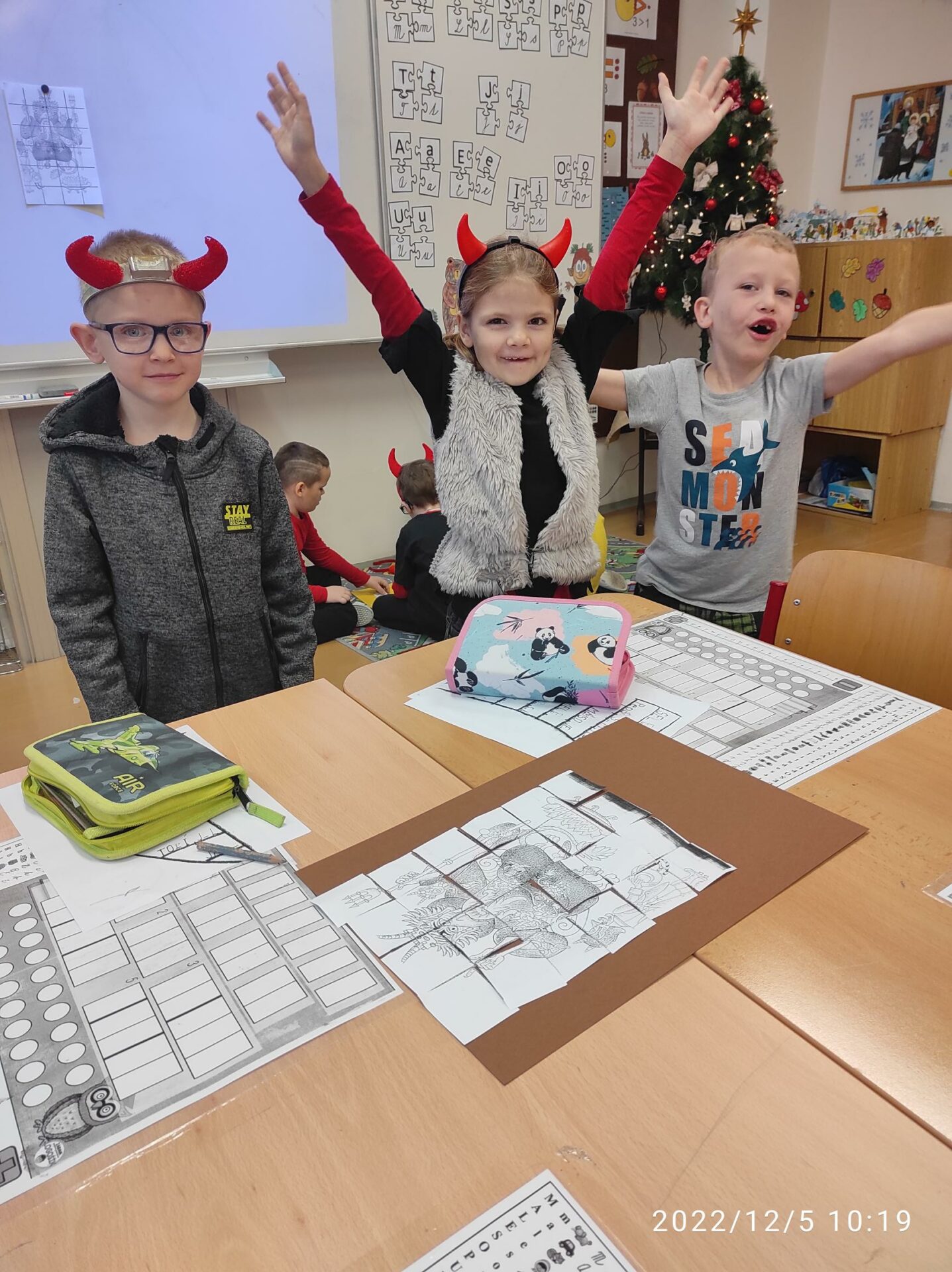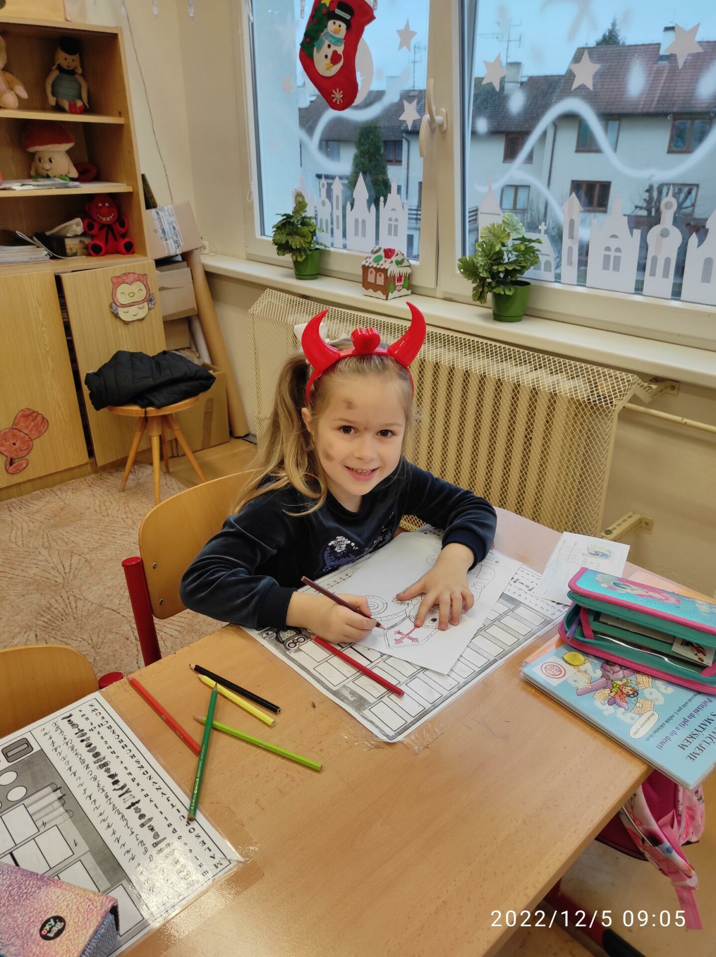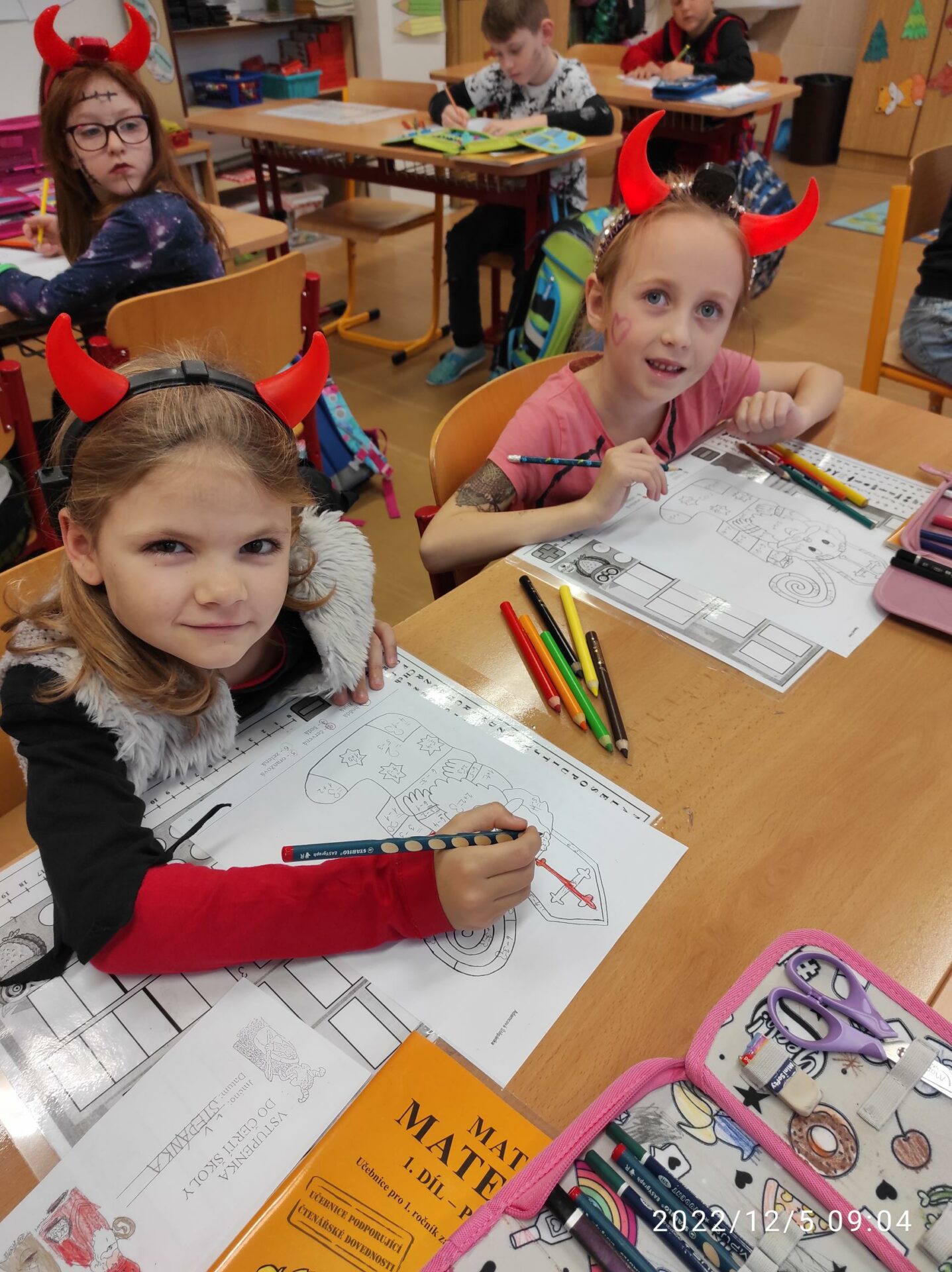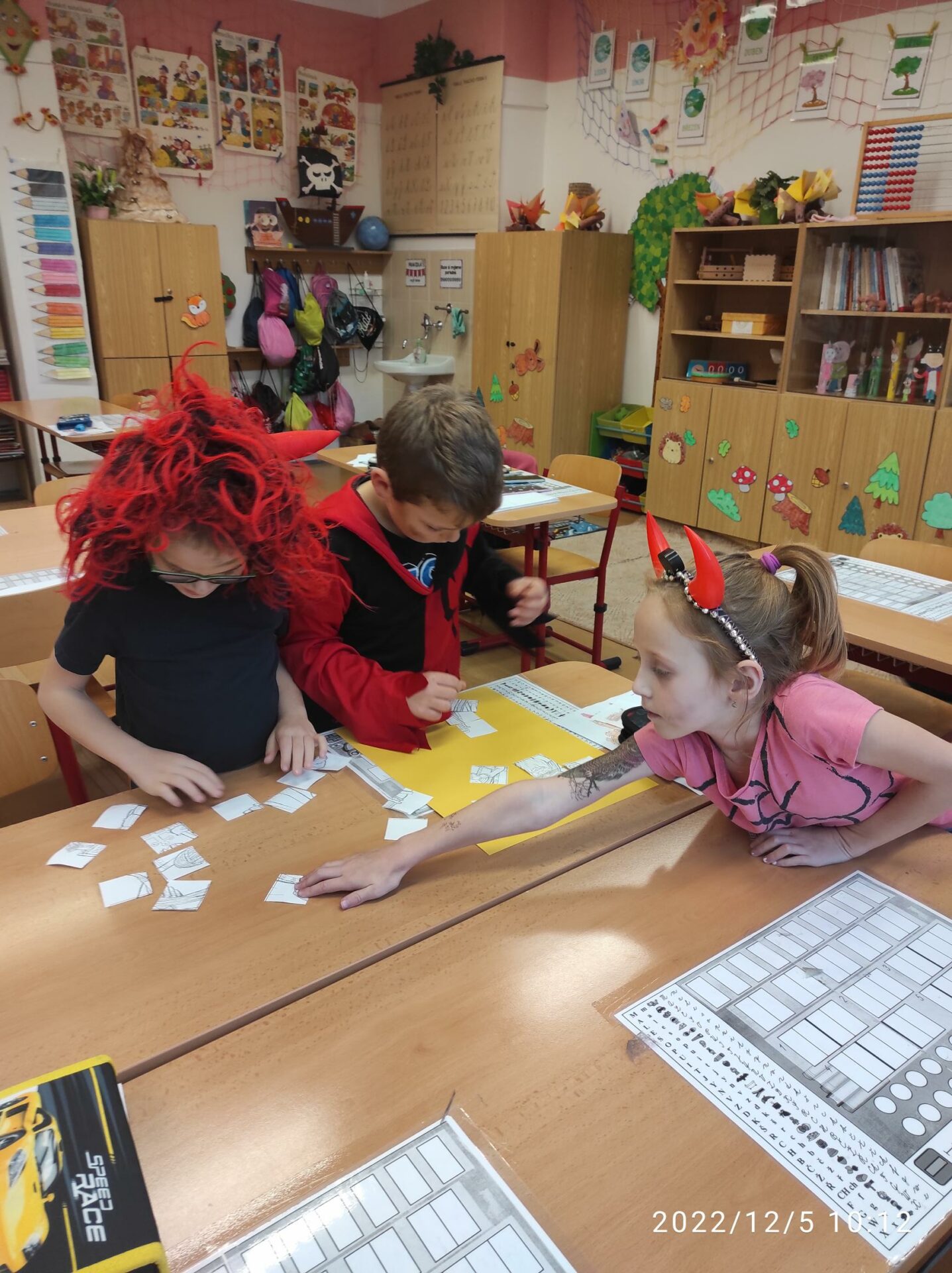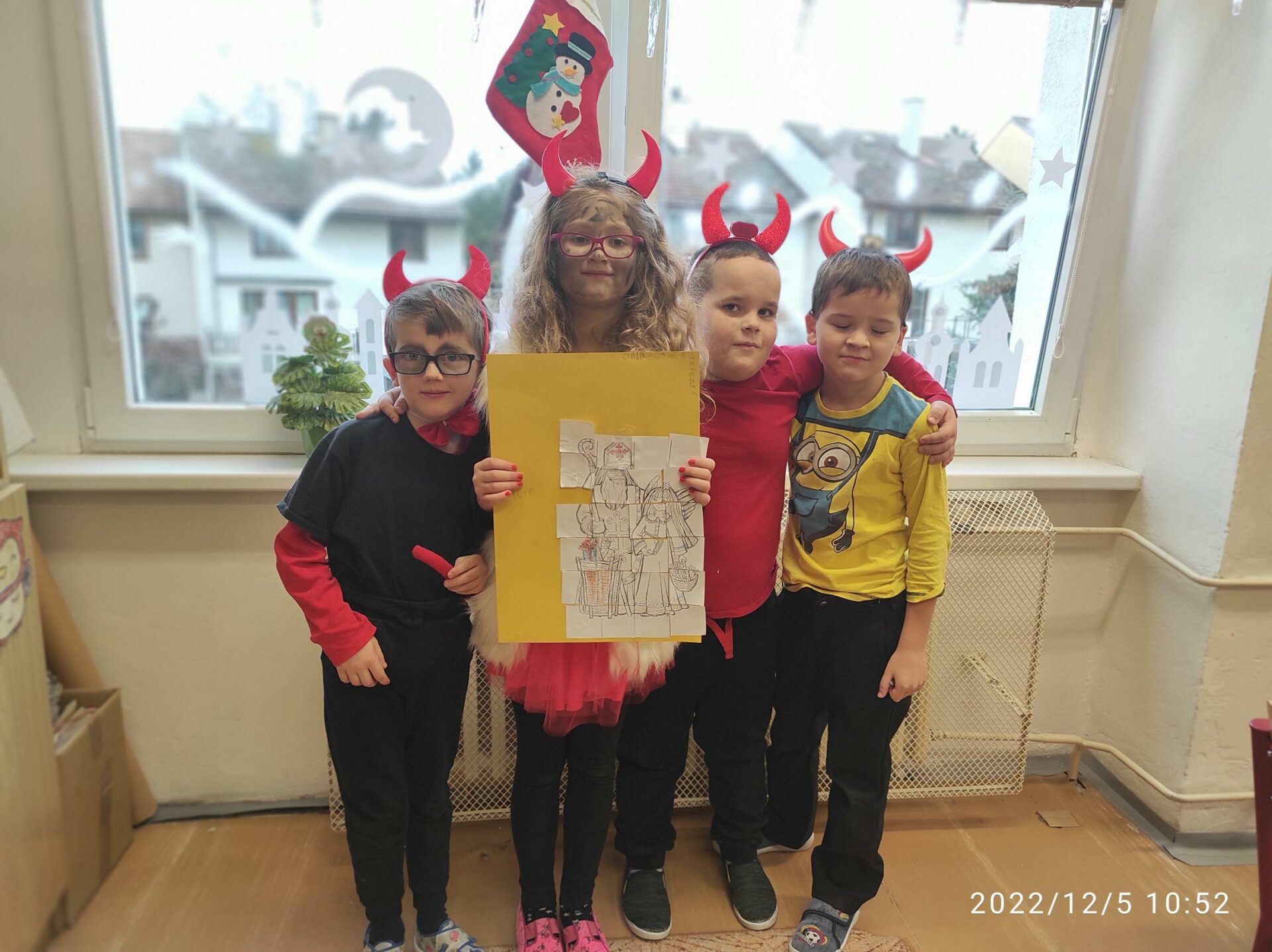Dnešní den byl pro nás trochu neobvyklý. Měli jsme totiž „čertí školu“. I čerti a čertice potřebují umět počítat, číst a psát , aby dokázali zapsat, přečíst a spočítat hříšné dušičky. A protože v tento den chodí Mikuláš, Čert a Andělé, navštívili i naší čertí třídu. Někteří neposední čertíci uronili i slzičky a slíbili, že se opravdu polepší. Tak jim to budeme věřit.