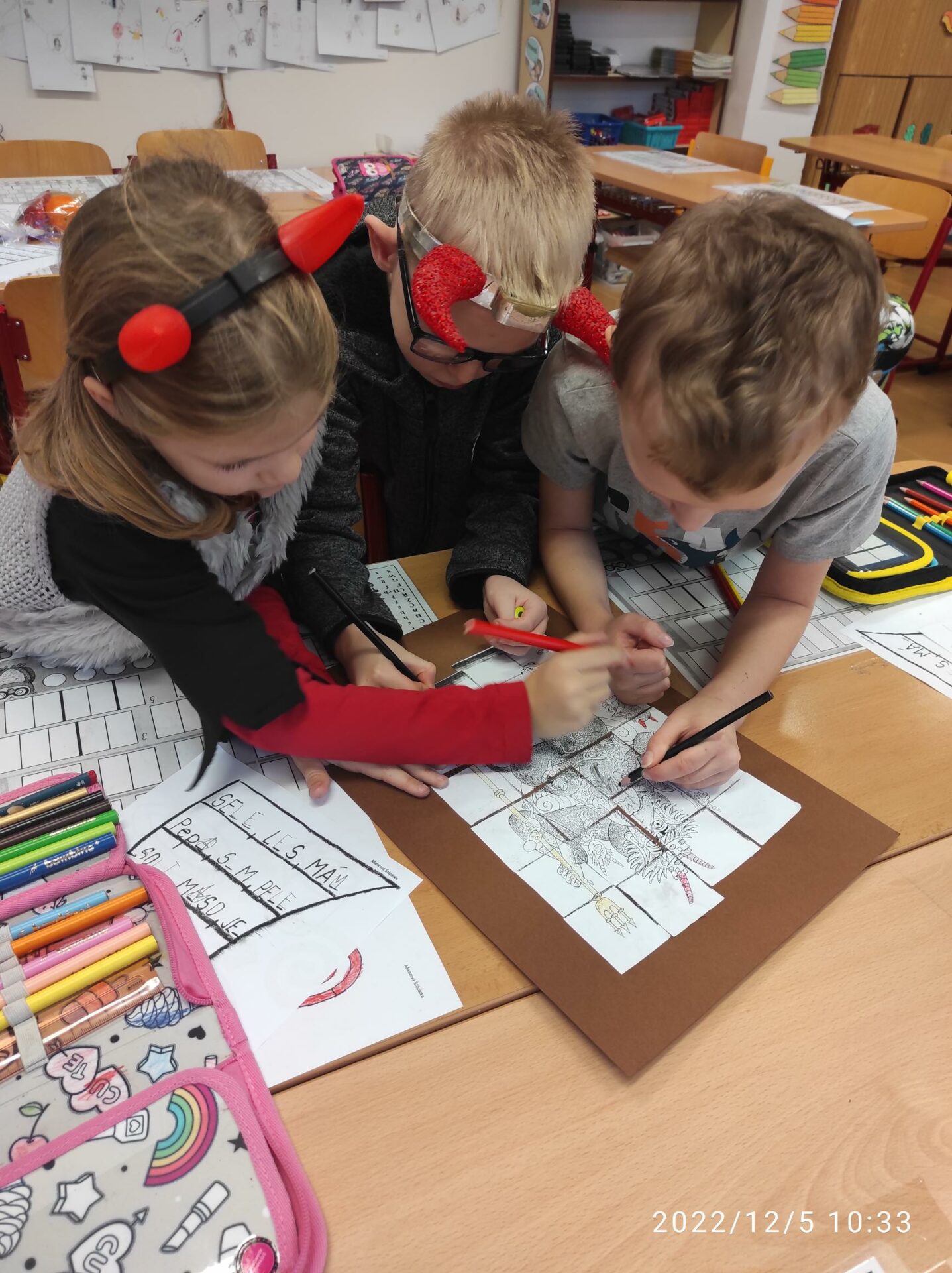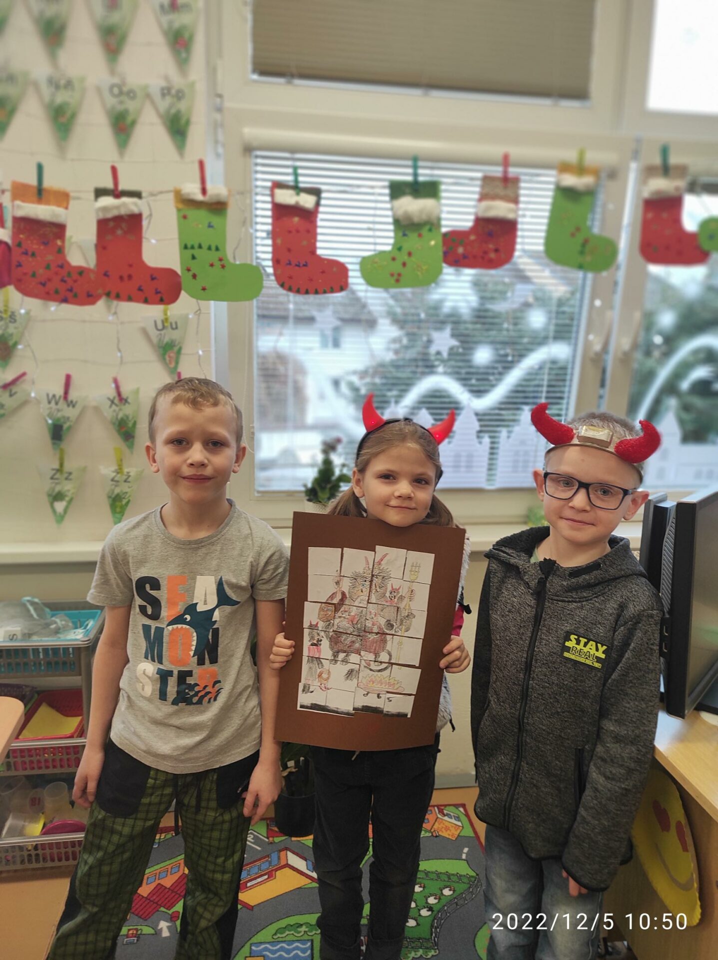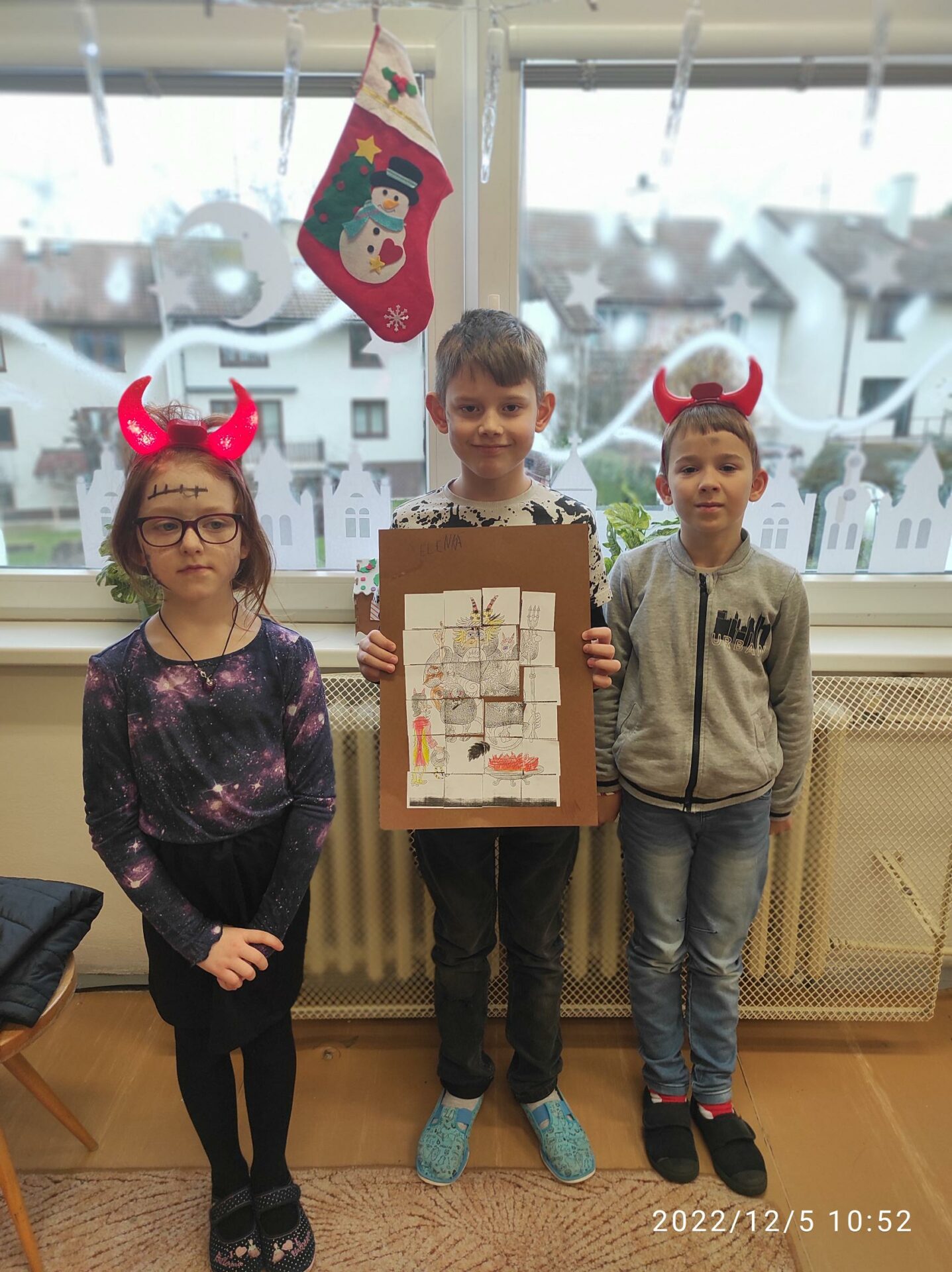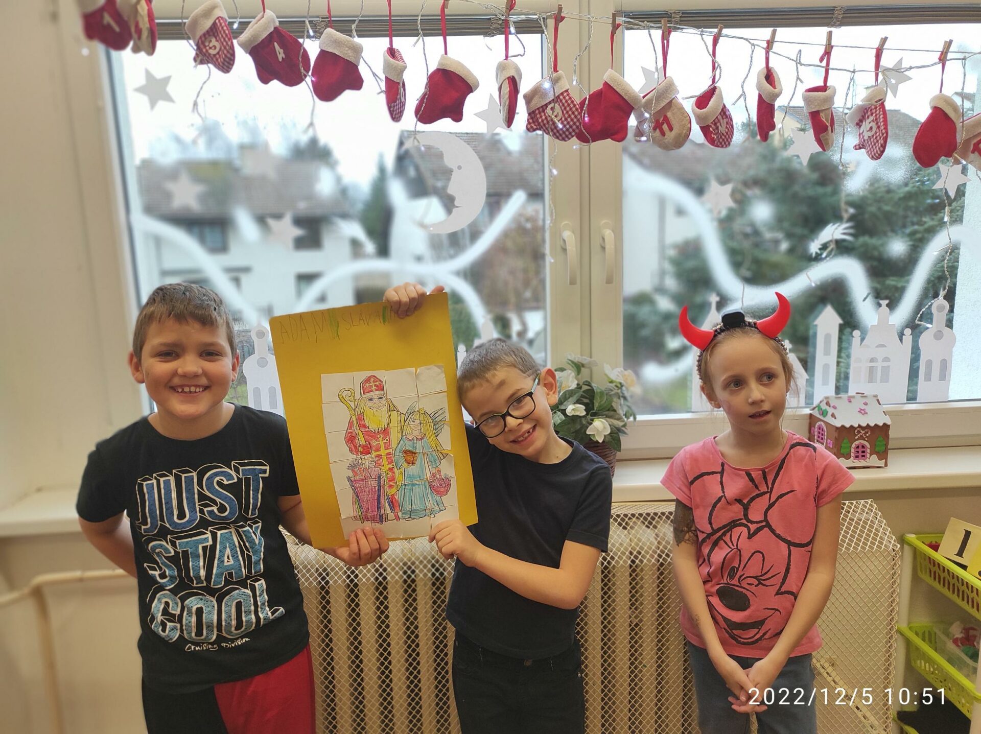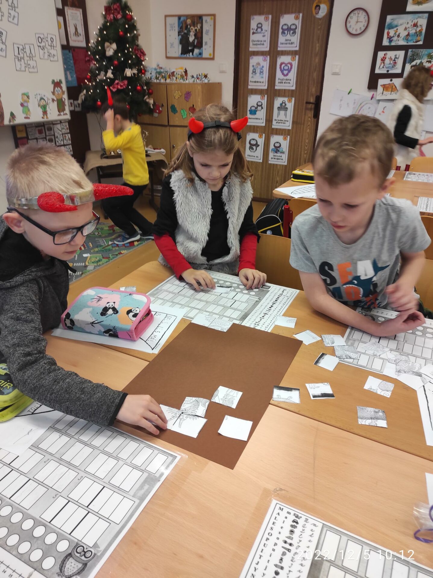 Dnešní den byl pro nás trochu neobvyklý. Měli jsme totiž „čertí školu“. I čerti a čertice potřebují umět počítat, číst a psát , aby dokázali zapsat, přečíst a spočítat hříšné dušičky. A protože v tento den chodí Mikuláš, Čert a Andělé, navštívili i naší čertí třídu. Někteří neposední čertíci uronili i slzičky a slíbili, že se opravdu polepší. Tak jim to budeme věřit.