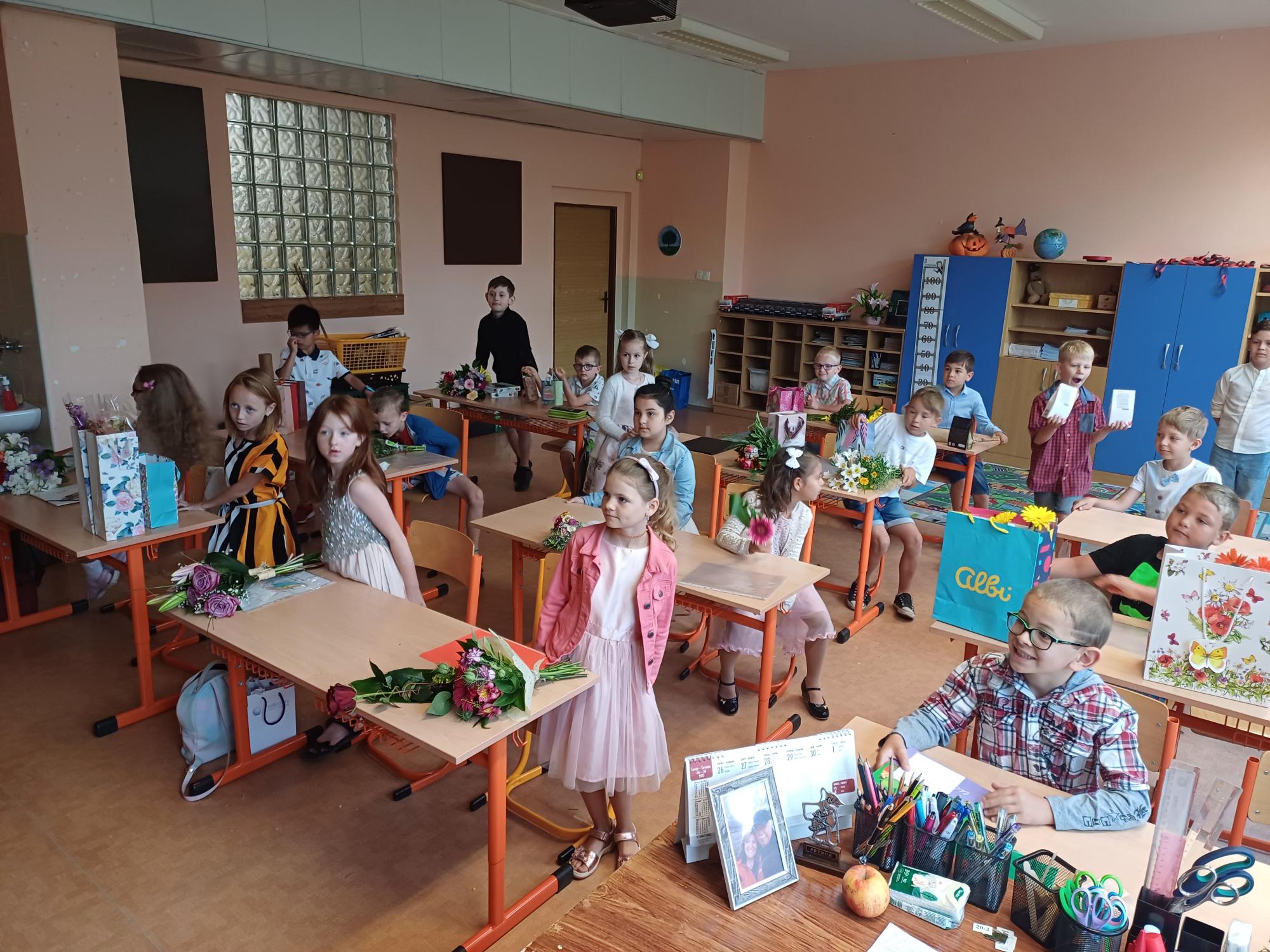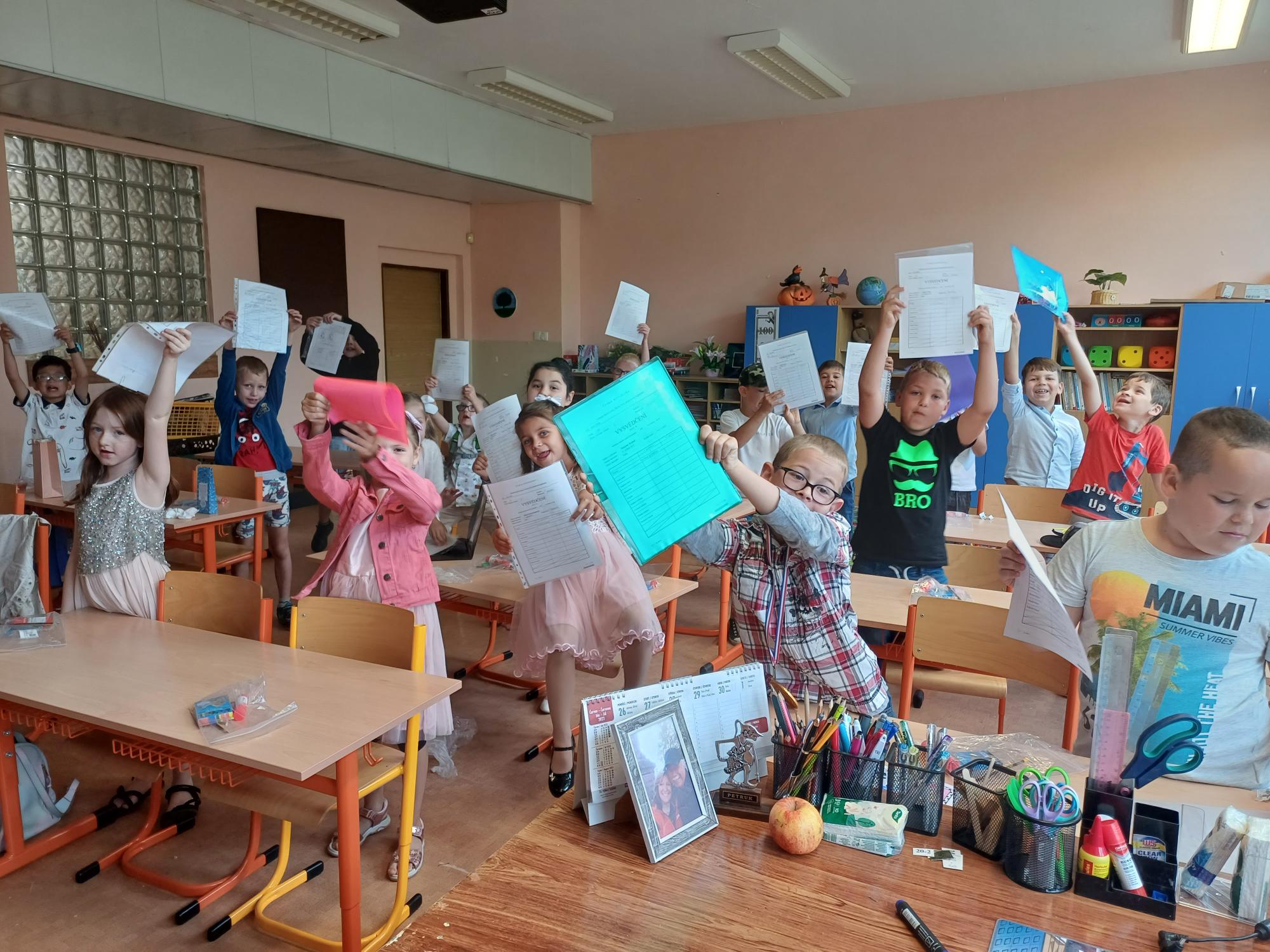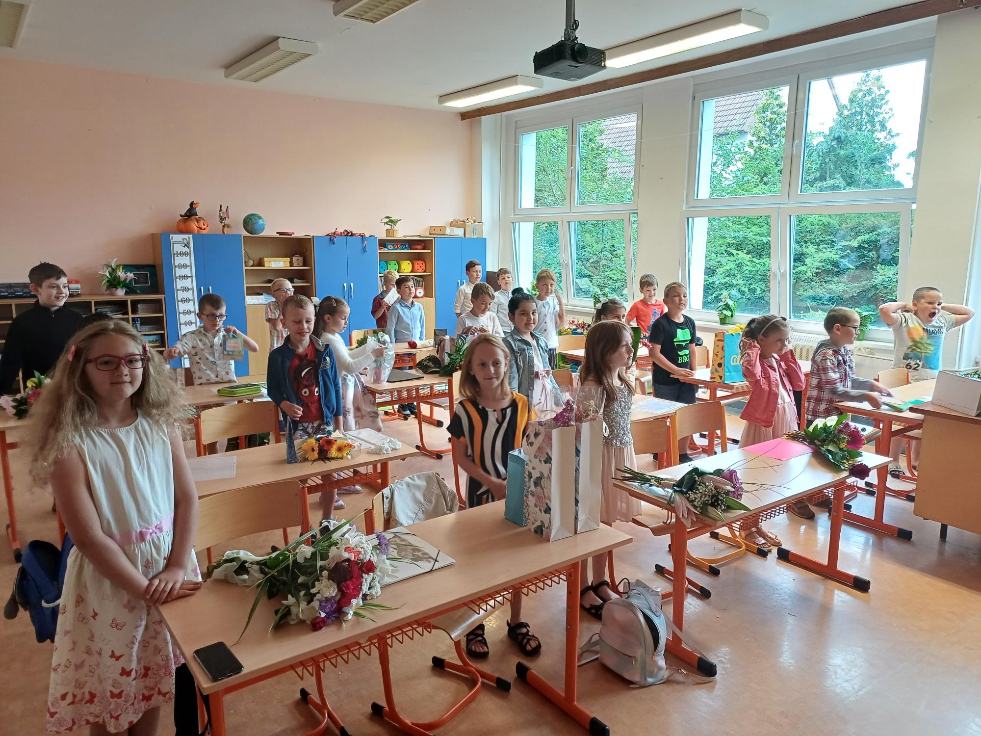 Školní rok utekl jako voda! Není to tak dávno, kdy jsme takto seděli v lavicích na začátku školního roku a nevěděli, co nás čeká. Teď už to víme! Za celý školní rok jsme udělali velký kus práce. Naučili jsme se číst, psát, počítat, ale nejen to! Poznali jsme nové kamarády, nové prostředí. Prostě jsme pochopili, že v bezva kolektivu se to lépe táhne a vše se lépe zvládne! Takže přejeme všem ostatním dětem, učitelům, učitelkám, vychovatelkám, ale i ženám v kuchyni , které se staraly o to, abychom neměli hlad(paní kuchařky), ve třídách bylo uklizeno (paní uklízečky), nikdo cizí se do školy nedostal (pan vrátný), aby jsme nespadli ze židle (pan školník), prostě všem zaměstnancům školy KRÁSNÉ PROŽITÍ PRÁZDNIN!!! Lesní skřítci z 1.B