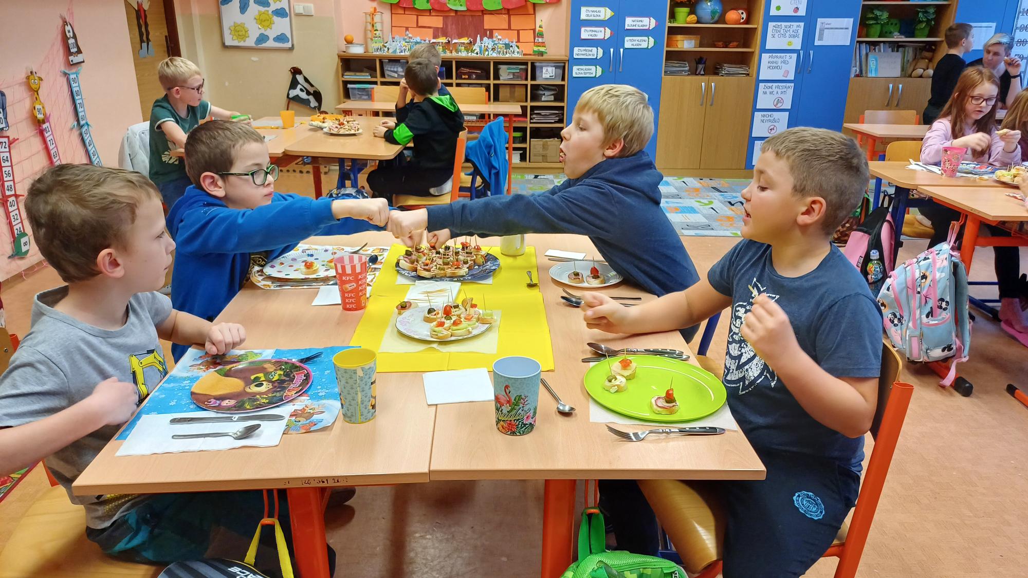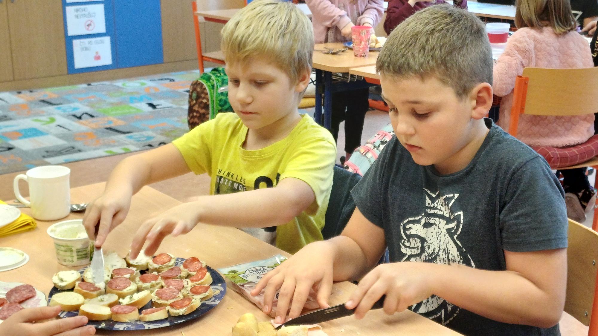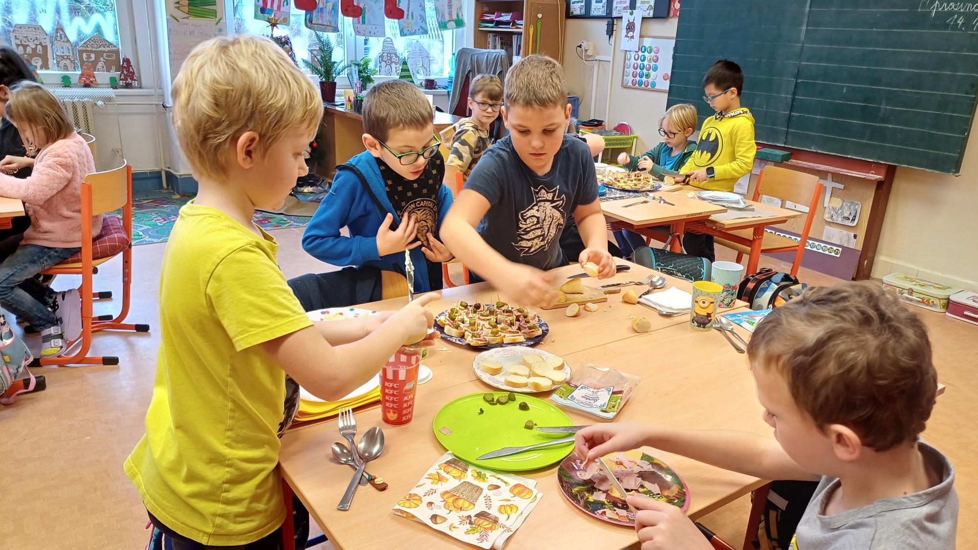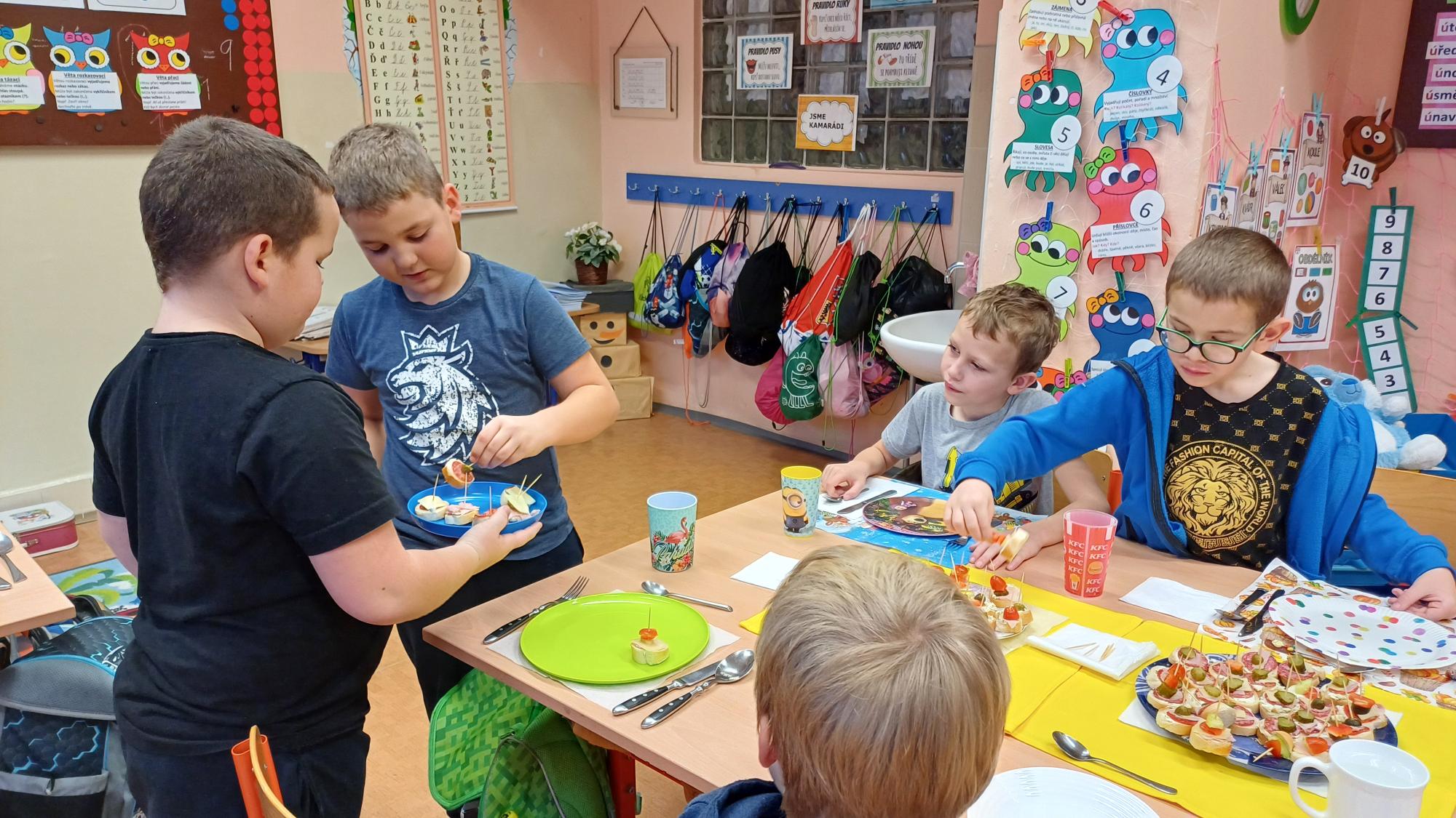Jak správně stolovat, jak hezky připravit stůl ke slavnostním příležitostem nebo co použít na jednoduché občerstvení jsme si dnes vyzkoušeli v rámci pracovních činností. Každá skupina dostala potraviny, z kterých jsme měli připravit pohoštění pro ostatní žáky. Zahráli jsme si na známou soutěž s názvem MasterChef. Na závěr jsme vyhodnotili nejlepší tým. Lesní skřítci z 2.B