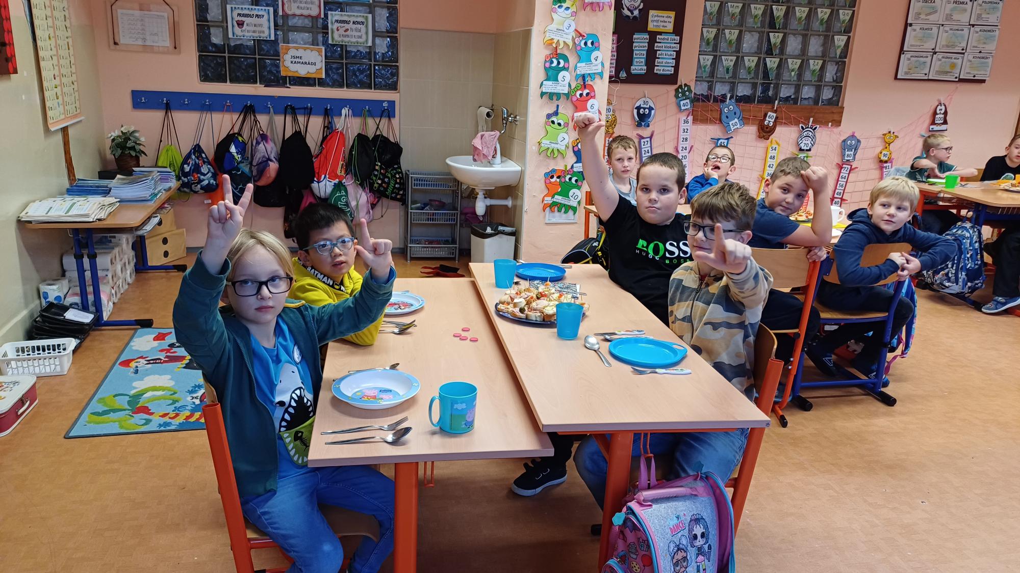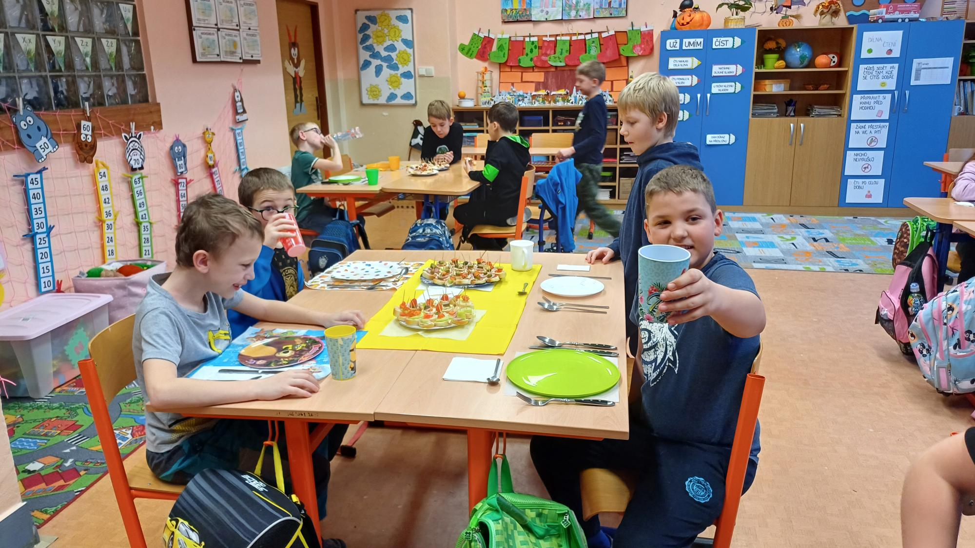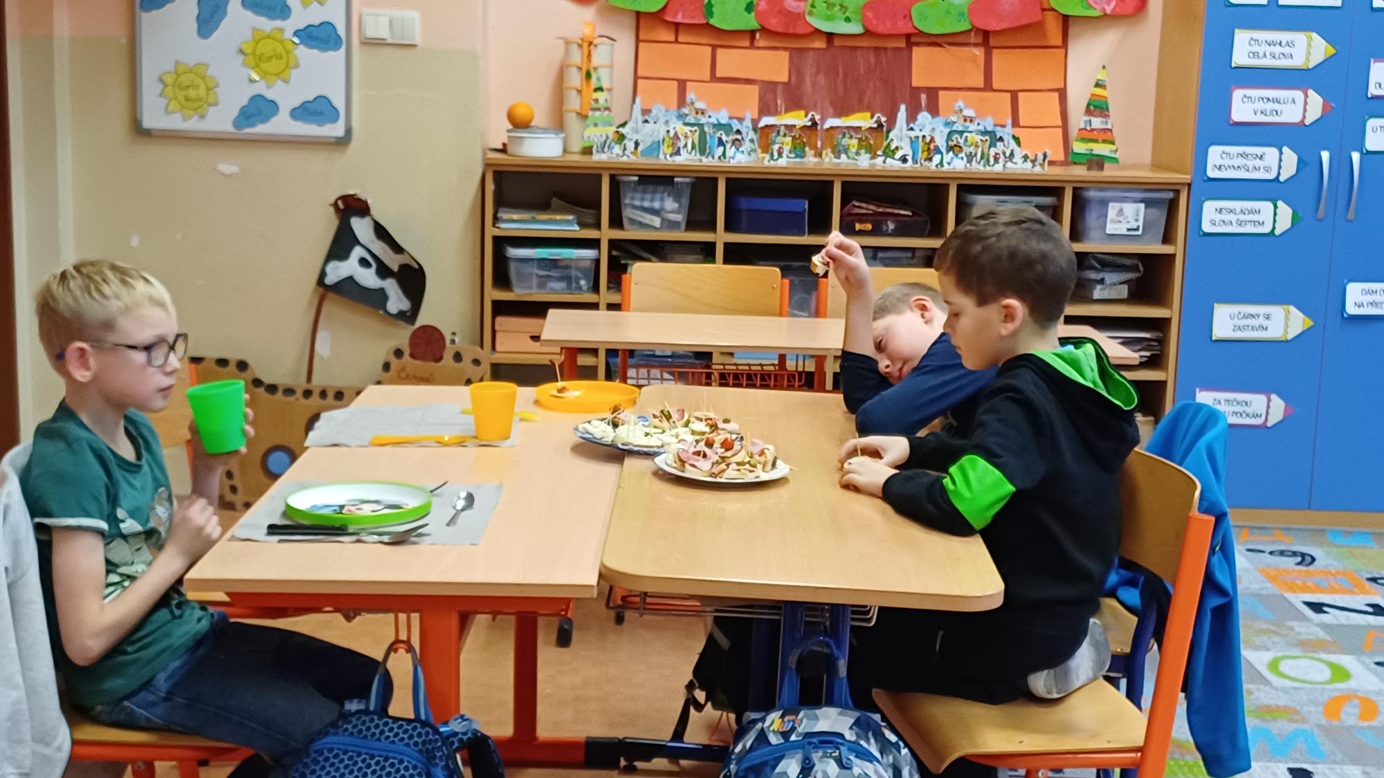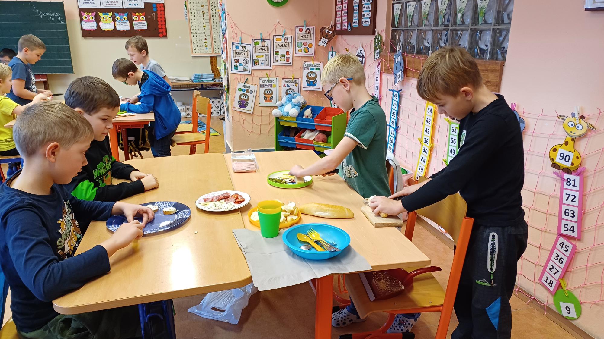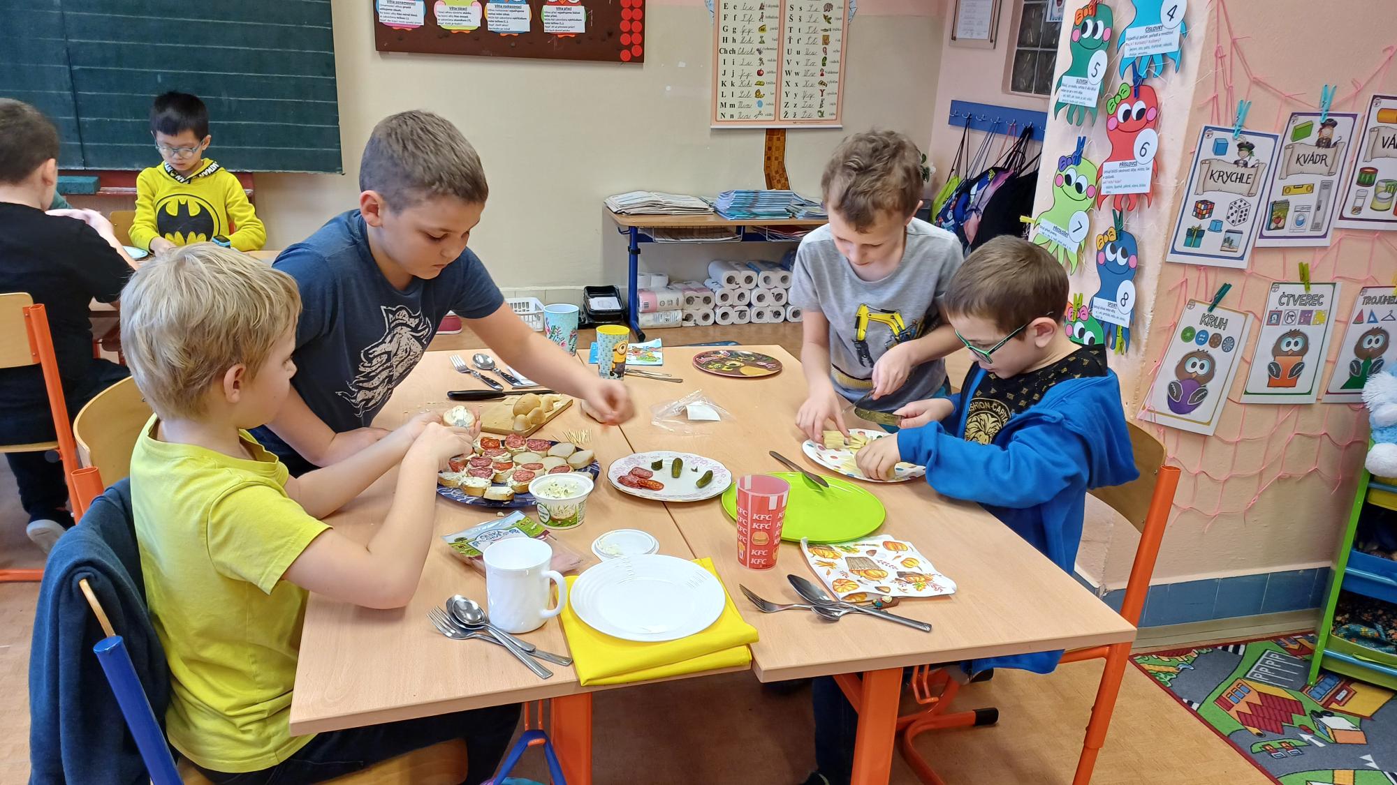 Jak správně stolovat, jak hezky připravit stůl ke slavnostním příležitostem nebo co použít na jednoduché občerstvení jsme si dnes vyzkoušeli v rámci pracovních činností. Každá skupina dostala potraviny, z kterých jsme měli připravit pohoštění pro ostatní žáky. Zahráli jsme si na známou soutěž s názvem MasterChef. Na závěr jsme vyhodnotili nejlepší tým. Lesní skřítci z 2.B