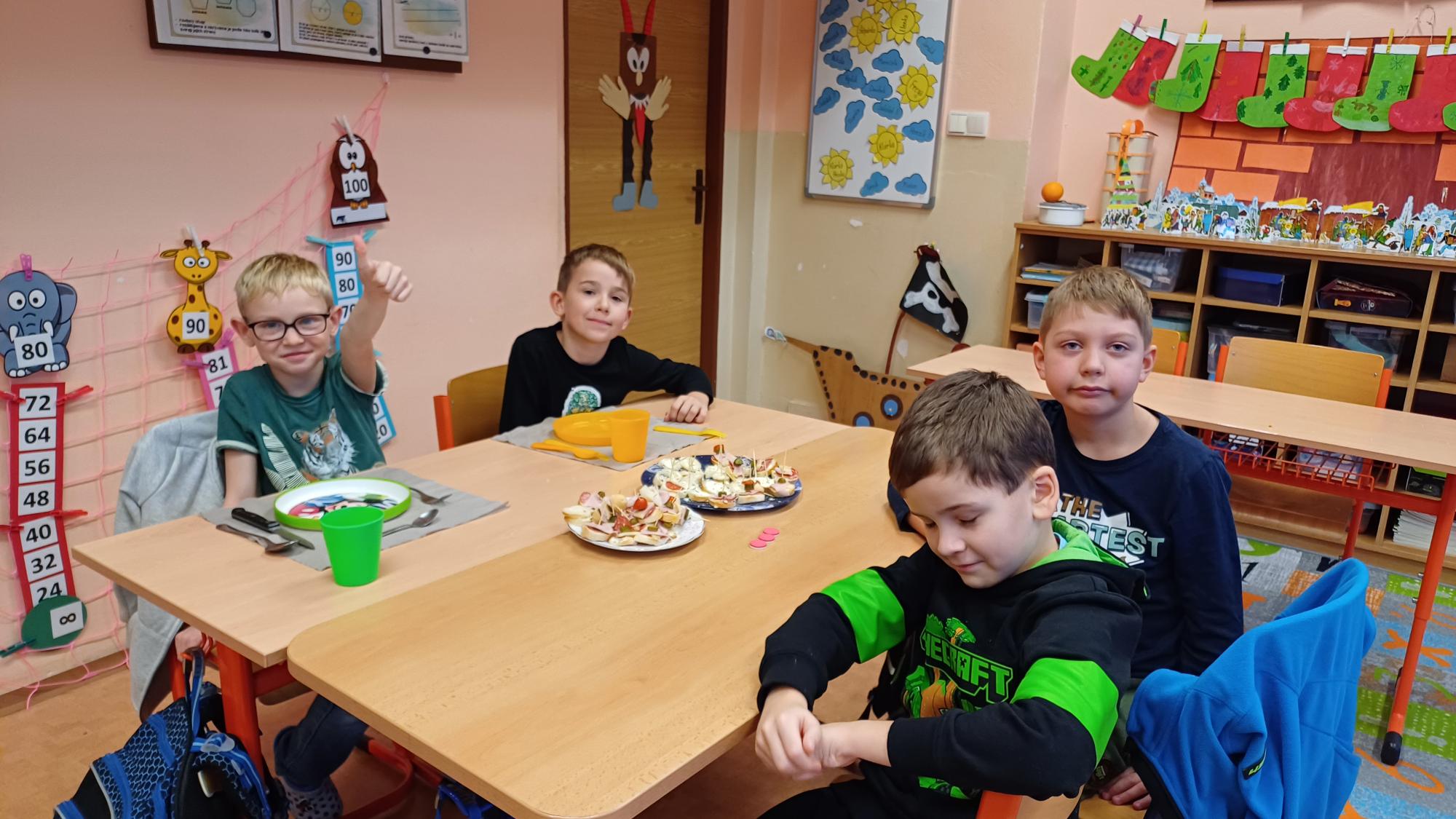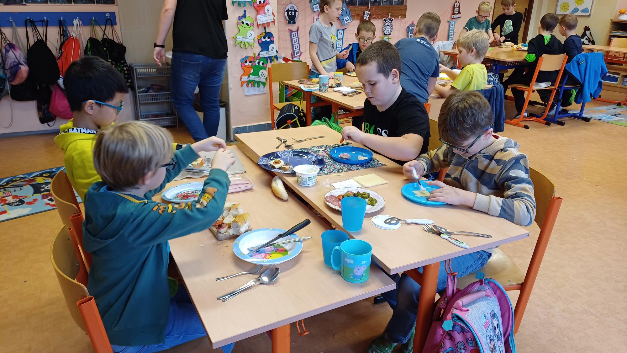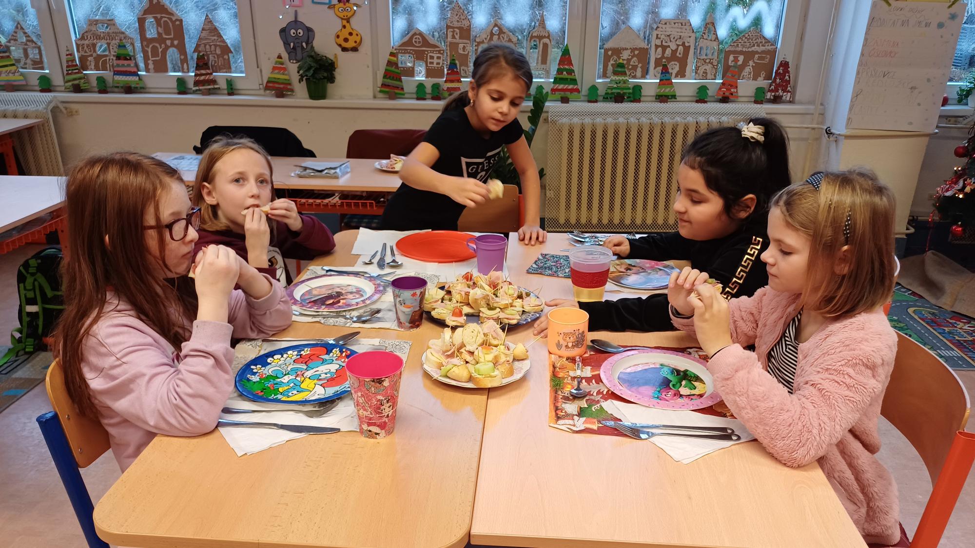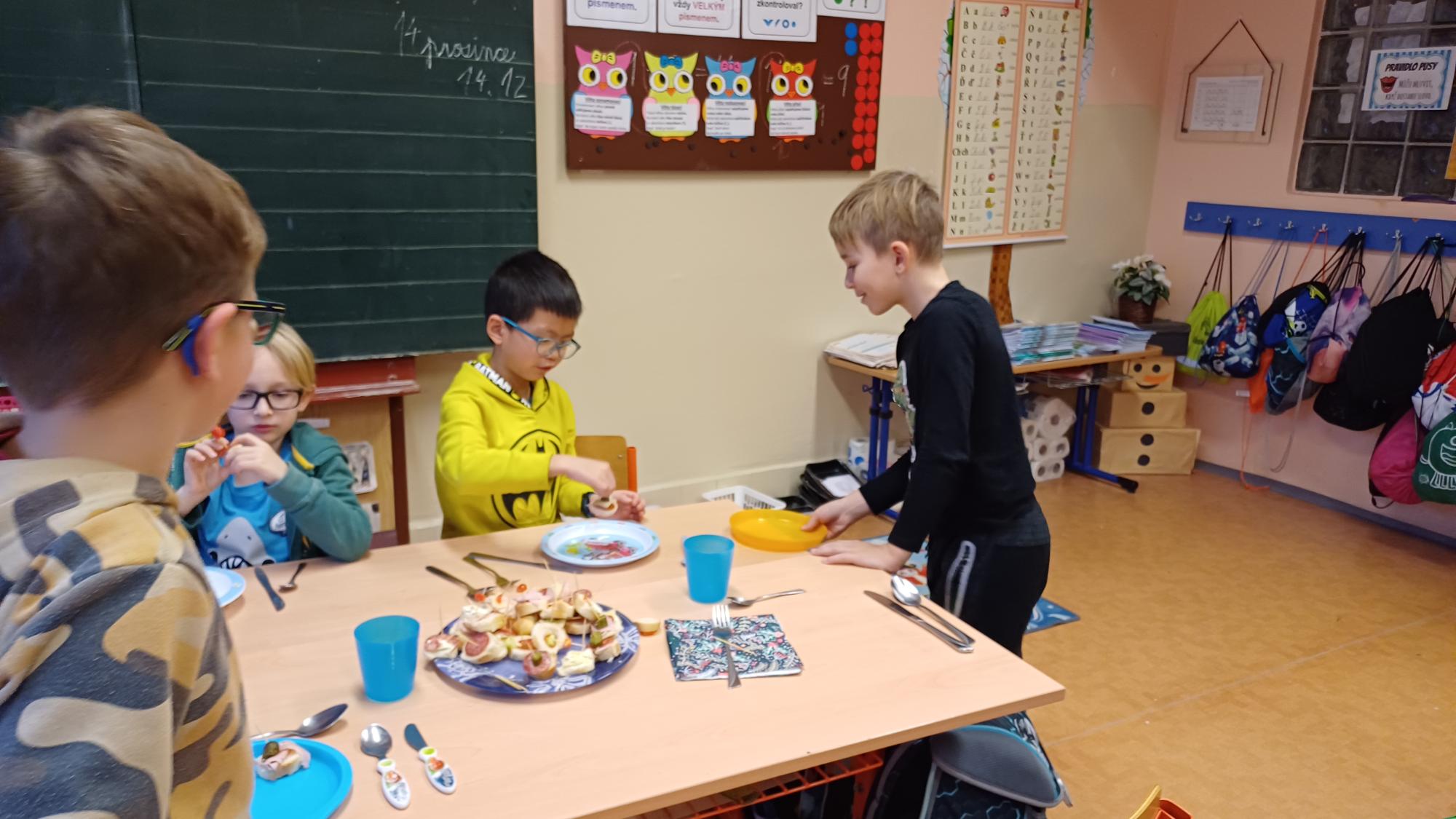 Jak správně stolovat, jak hezky připravit stůl ke slavnostním příležitostem nebo co použít na jednoduché občerstvení jsme si dnes vyzkoušeli v rámci pracovních činností. Každá skupina dostala potraviny, z kterých jsme měli připravit pohoštění pro ostatní žáky. Zahráli jsme si na známou soutěž s názvem MasterChef. Na závěr jsme vyhodnotili nejlepší tým. Lesní skřítci z 2.B