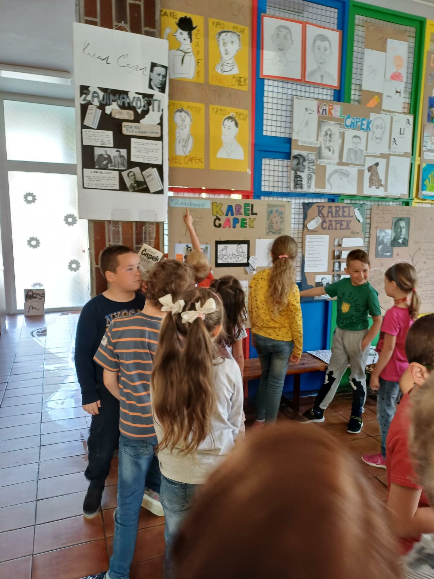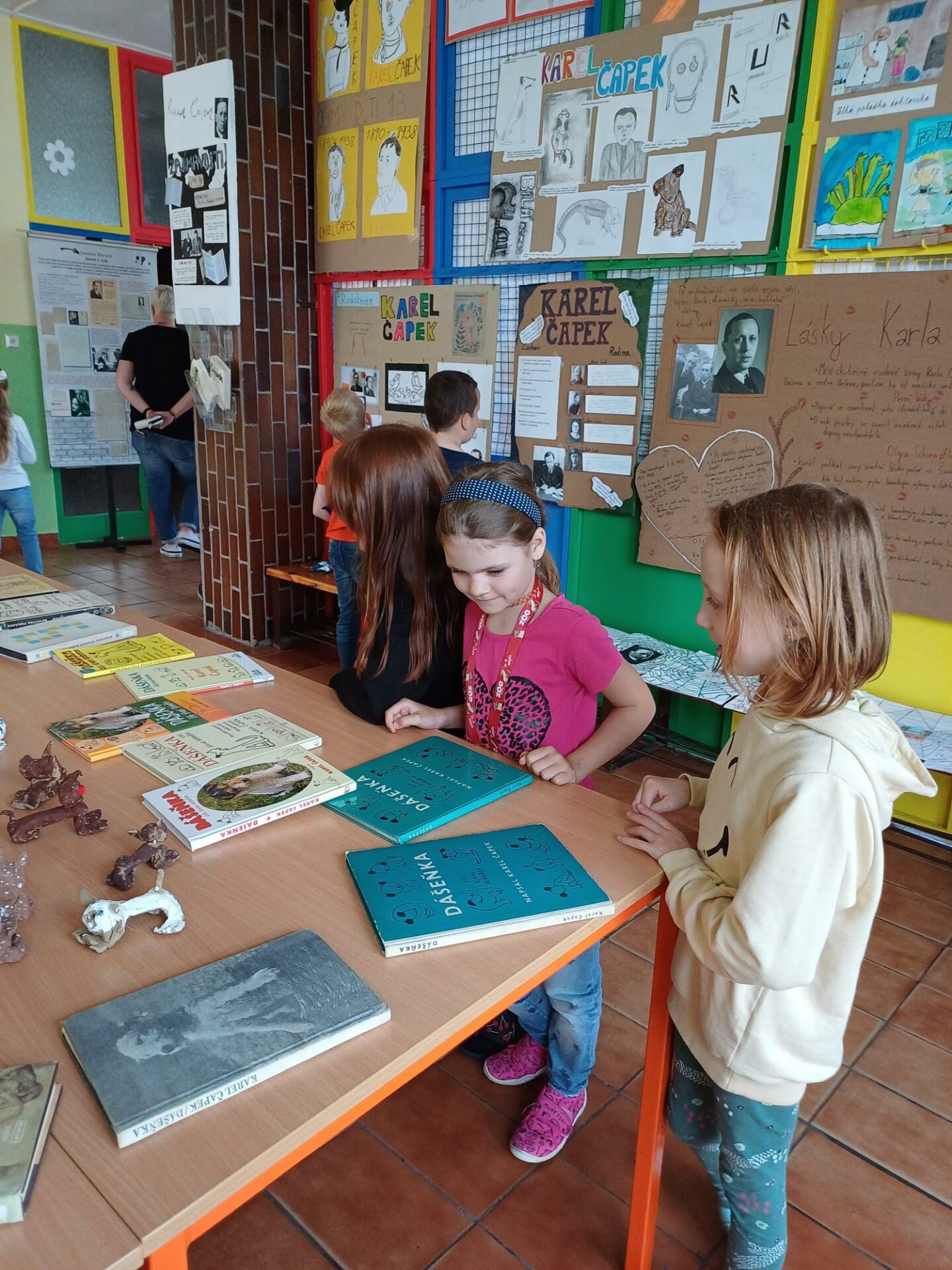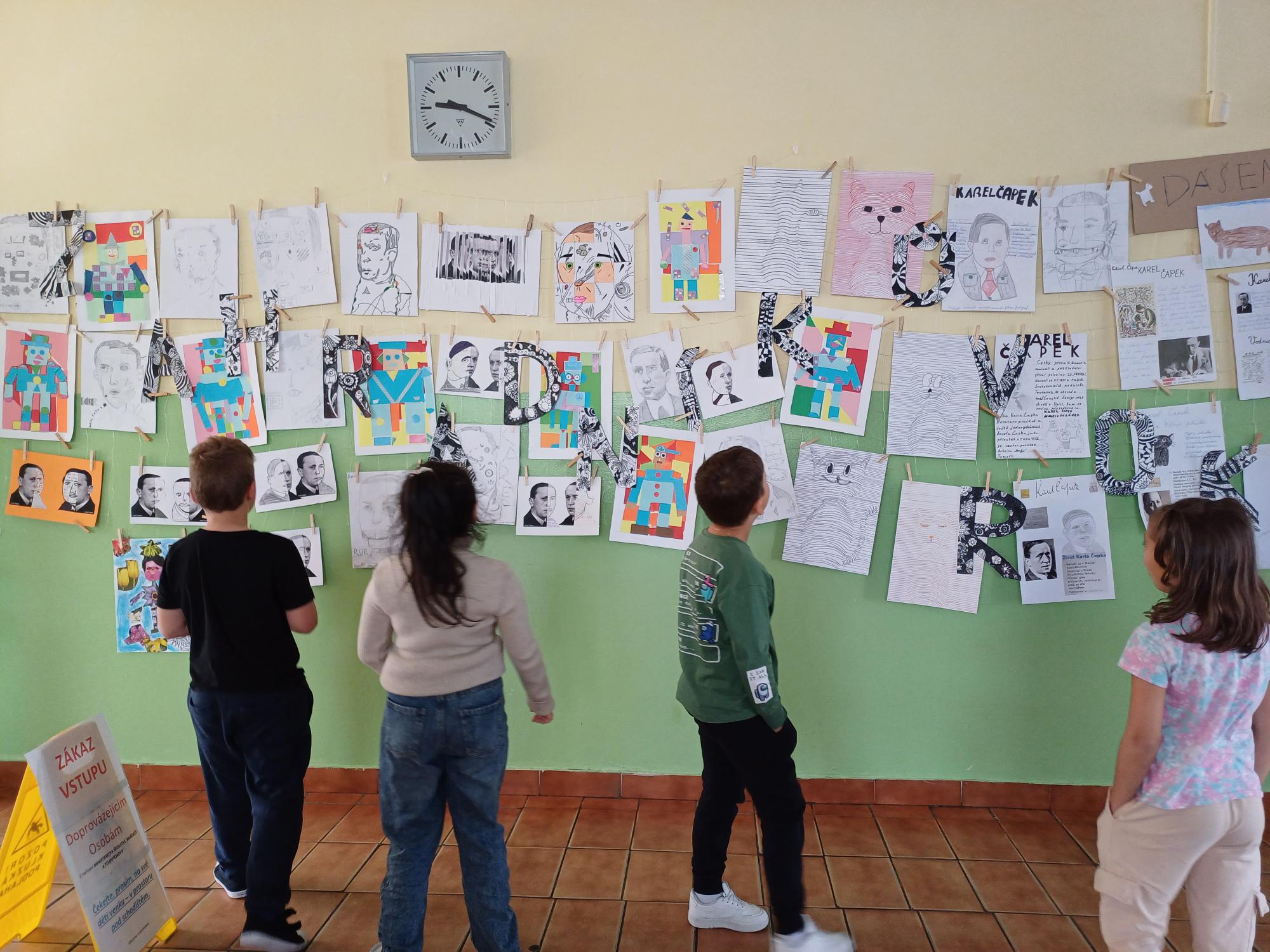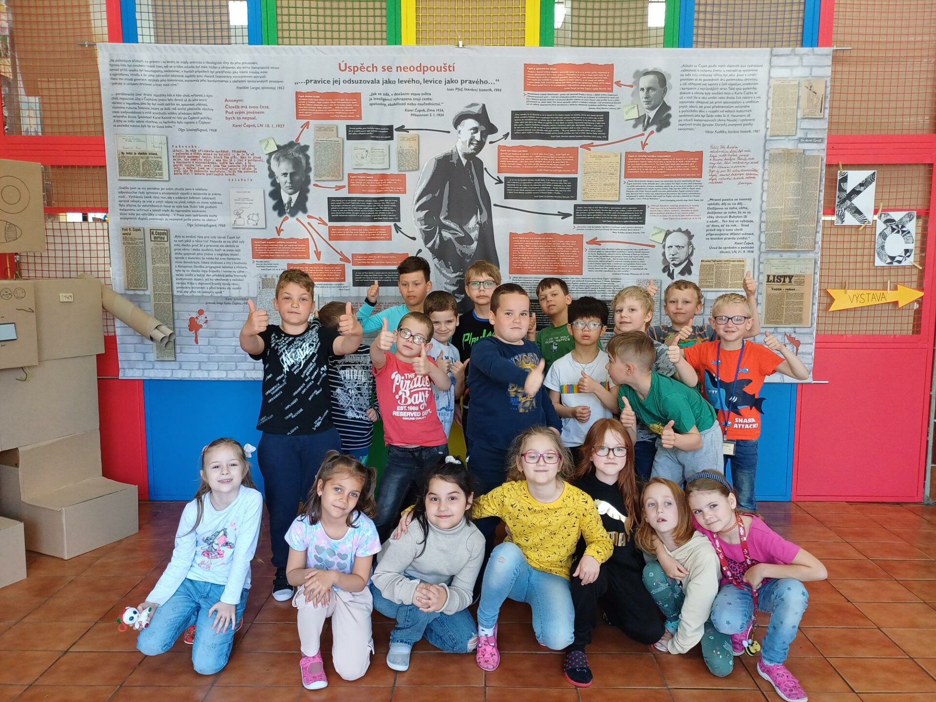 Dnes jsme si prohlédli výstavu, která probíhá v těchto dnech na naší škole a zapsali jsme se do Knihy návštěv. Moc se nám líbila a obdivovali jsme, co všechno dokázali naši spolužáci z ostatních tříd vytvořit. I my jsme přispěli svými výtvarnými pracemi. Hlavně nás potěšilo, že naše skupinová práce ( portréty Karla Čapka) byla vybrána jako upoutávka na pozvánce k této výstavě. Lesní skřítci z 1.B