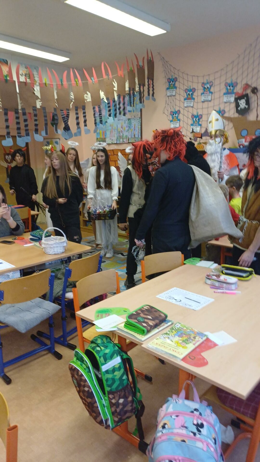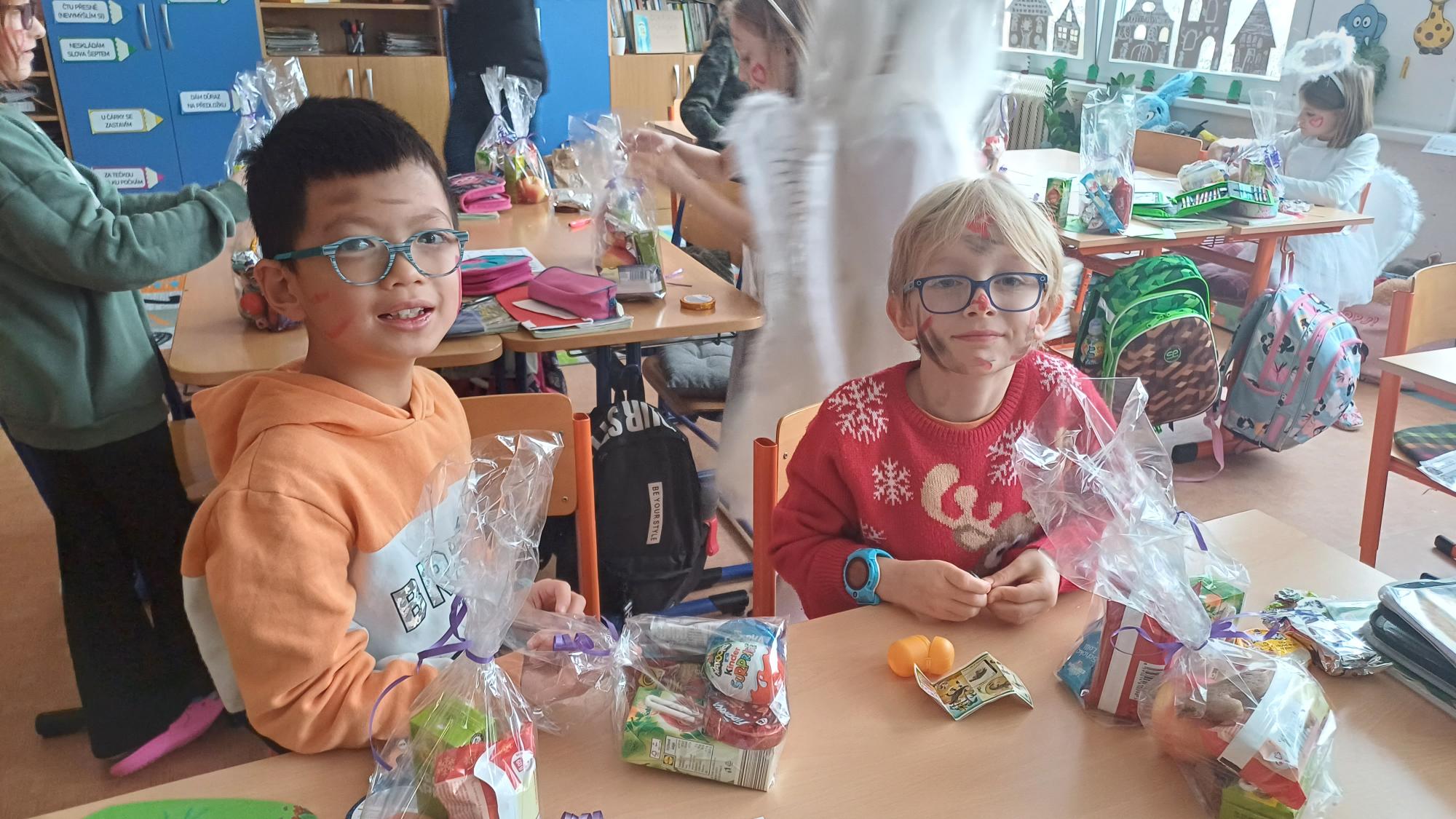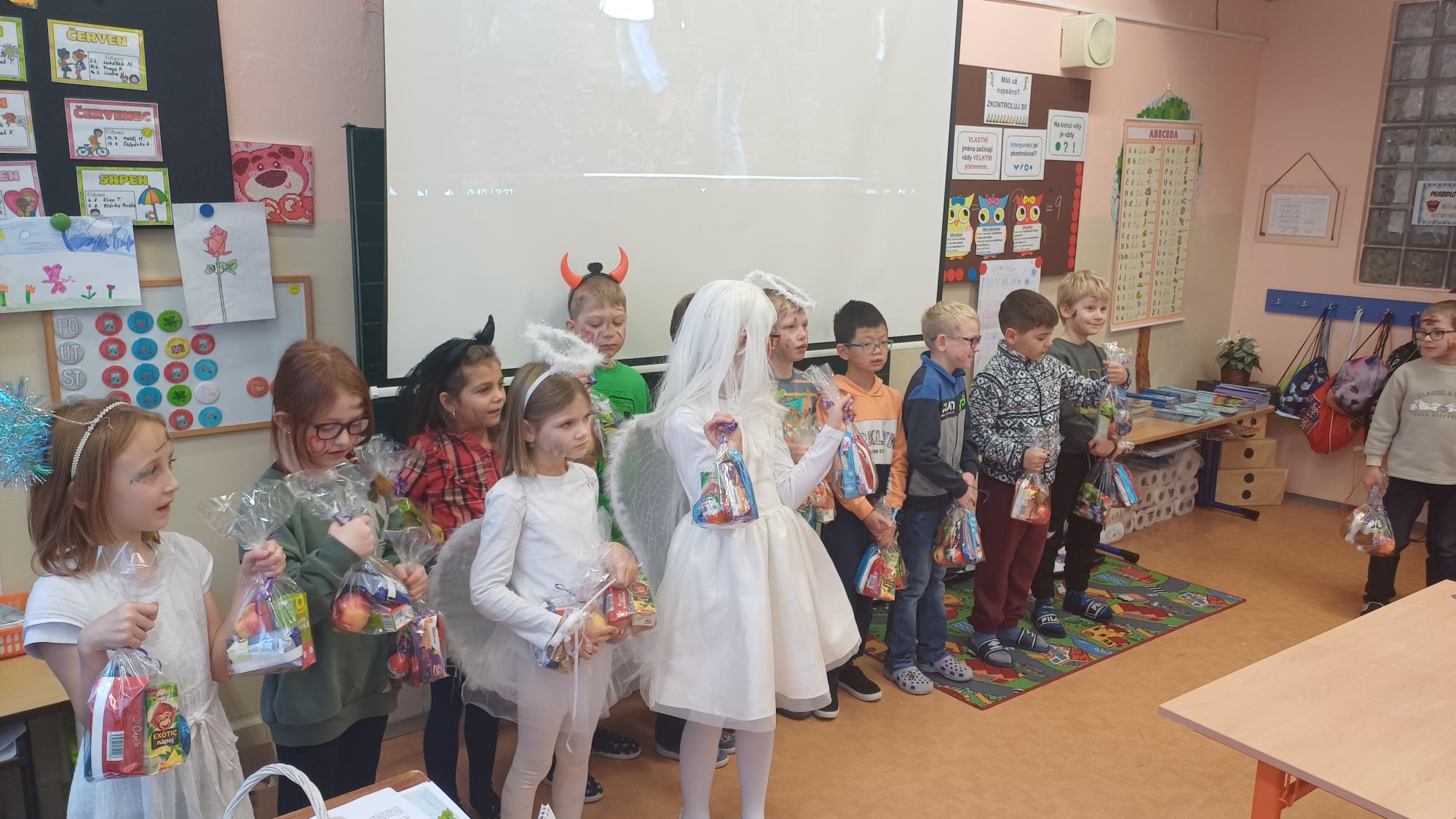 Dnešní dopoledne bylo plné očekávání, kdy už se konečně objeví Mikuláš se svou družinou. Nakonec jsme se dočkali! Společně jsme zazpívali píseň Nezbední čertíci a tím jsme zachránili před odnesením do pekla naše zlobivější kamarády. Pak už následovala nadílka. Lesní skřítci z 2.B