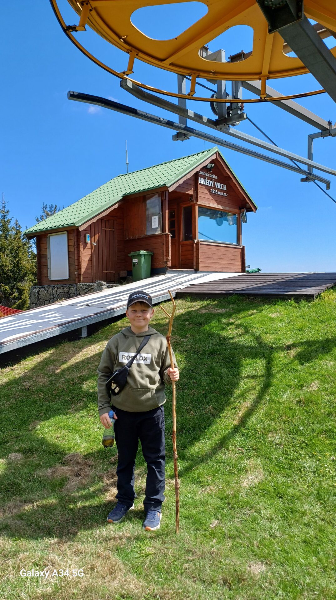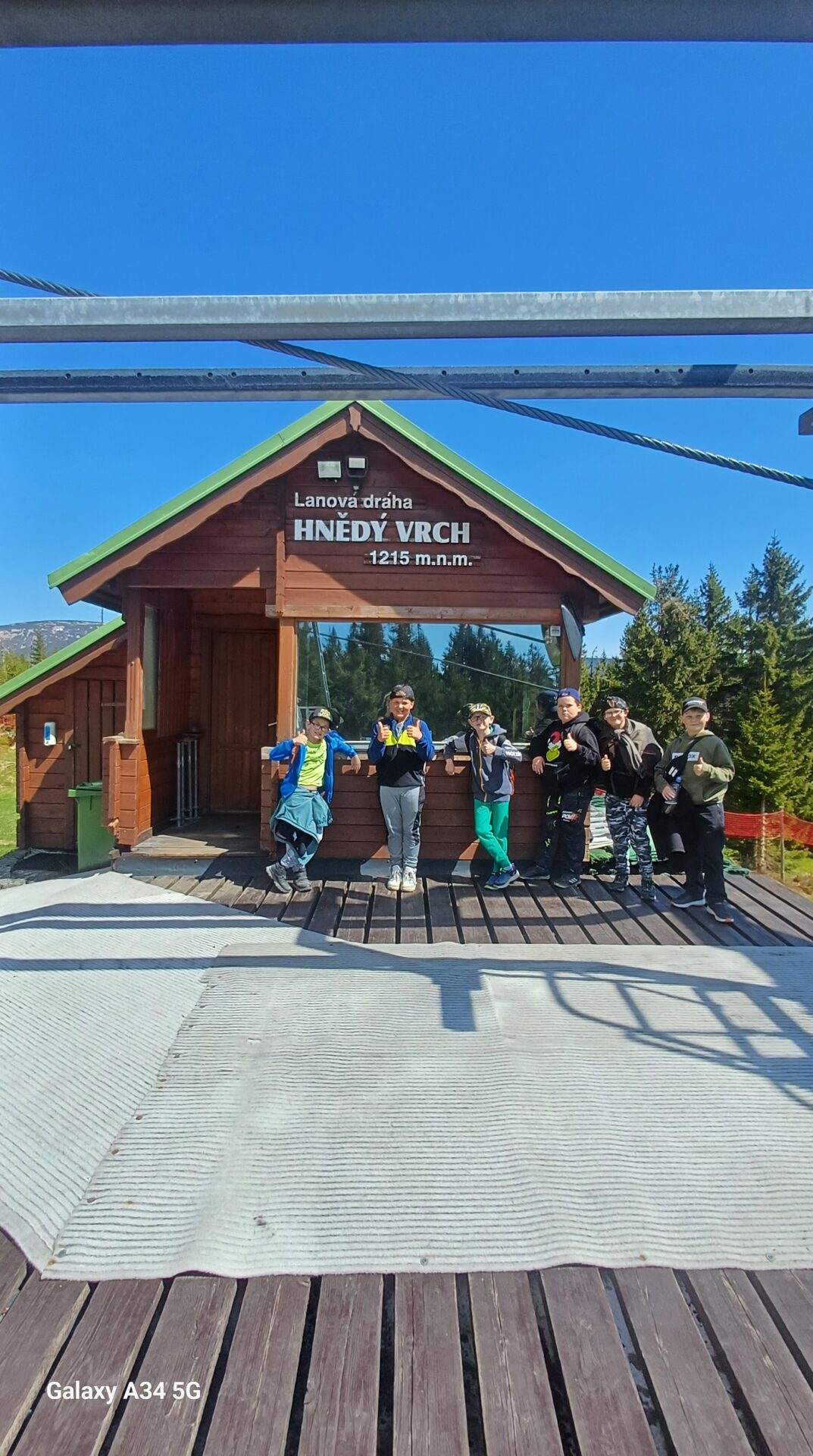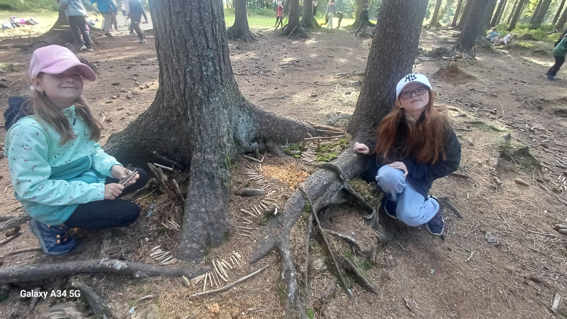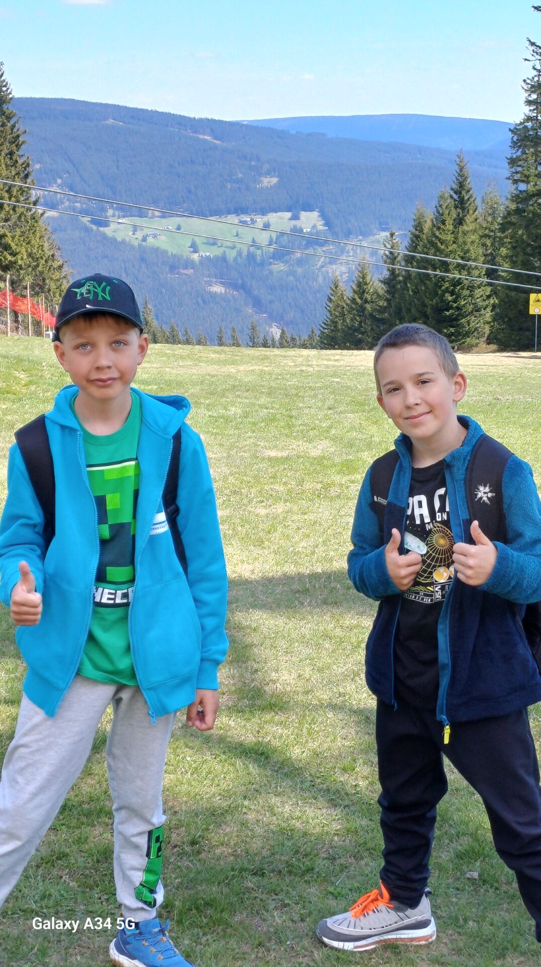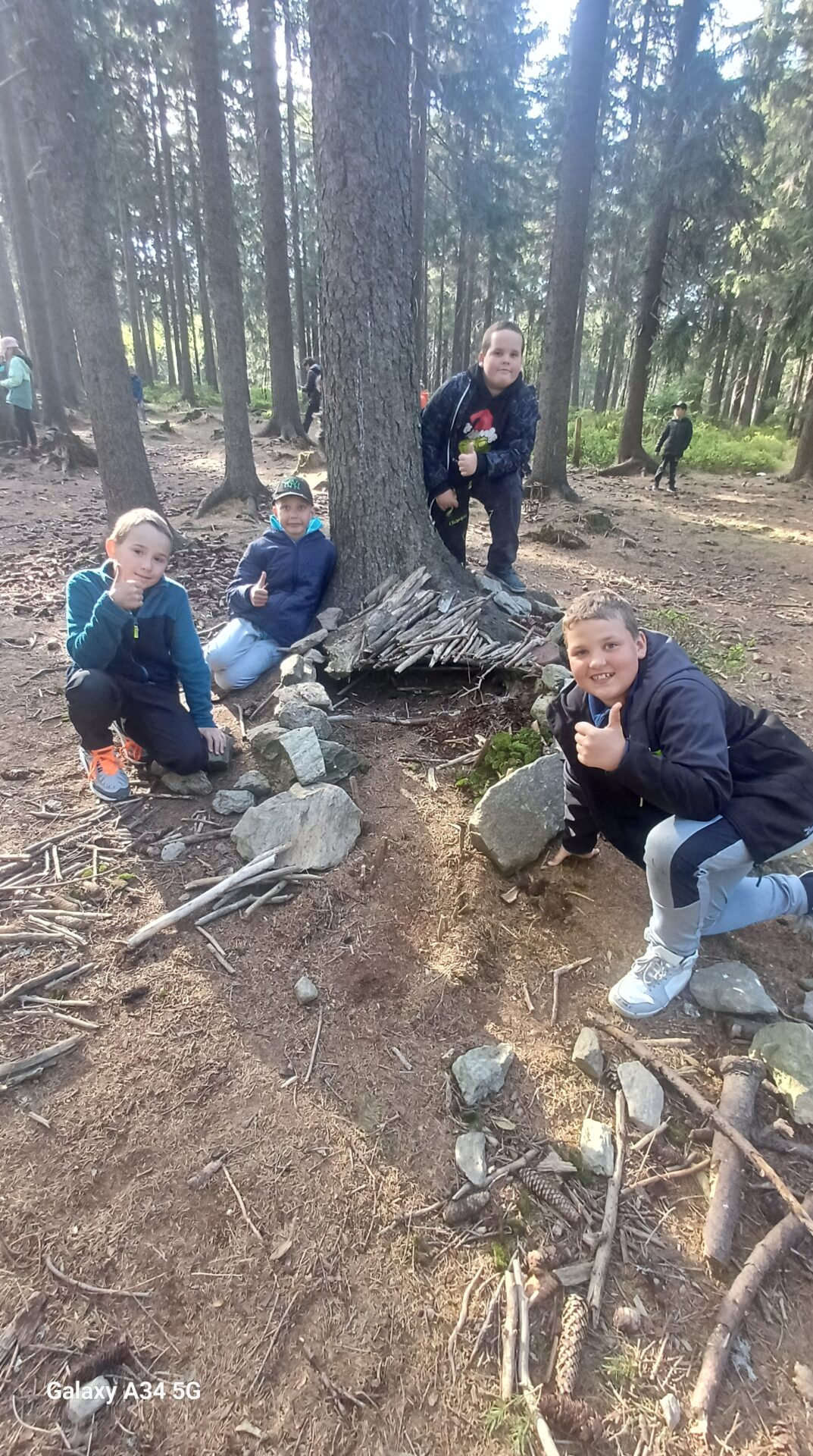 Ráno jsme se probudili do krásného, slunečného dne. Čekal nás úklid pokojů😜. Nic příjemného, ale zvládli jsme to. Všichni jsme si do svých kartiček nalepili ježky ze Sněžky. Po vydatné snídani jsme vyrazili na Hnědý vrch – rozhledna. Po takovém výšlapu přišel oběd vhod. Odpoledne nás čekala stavba chaloupek z přírodnin. Všechny naše cesty jsme si zaznamenali po večeři do svých map s příběhem. Zítra nás čeká výlet na naší nejvyšší horu, Sněžku. Tak nám držte kamarádi palce a my se vám zase ozveme. ✋️🙋♂️🙋🙋♀️