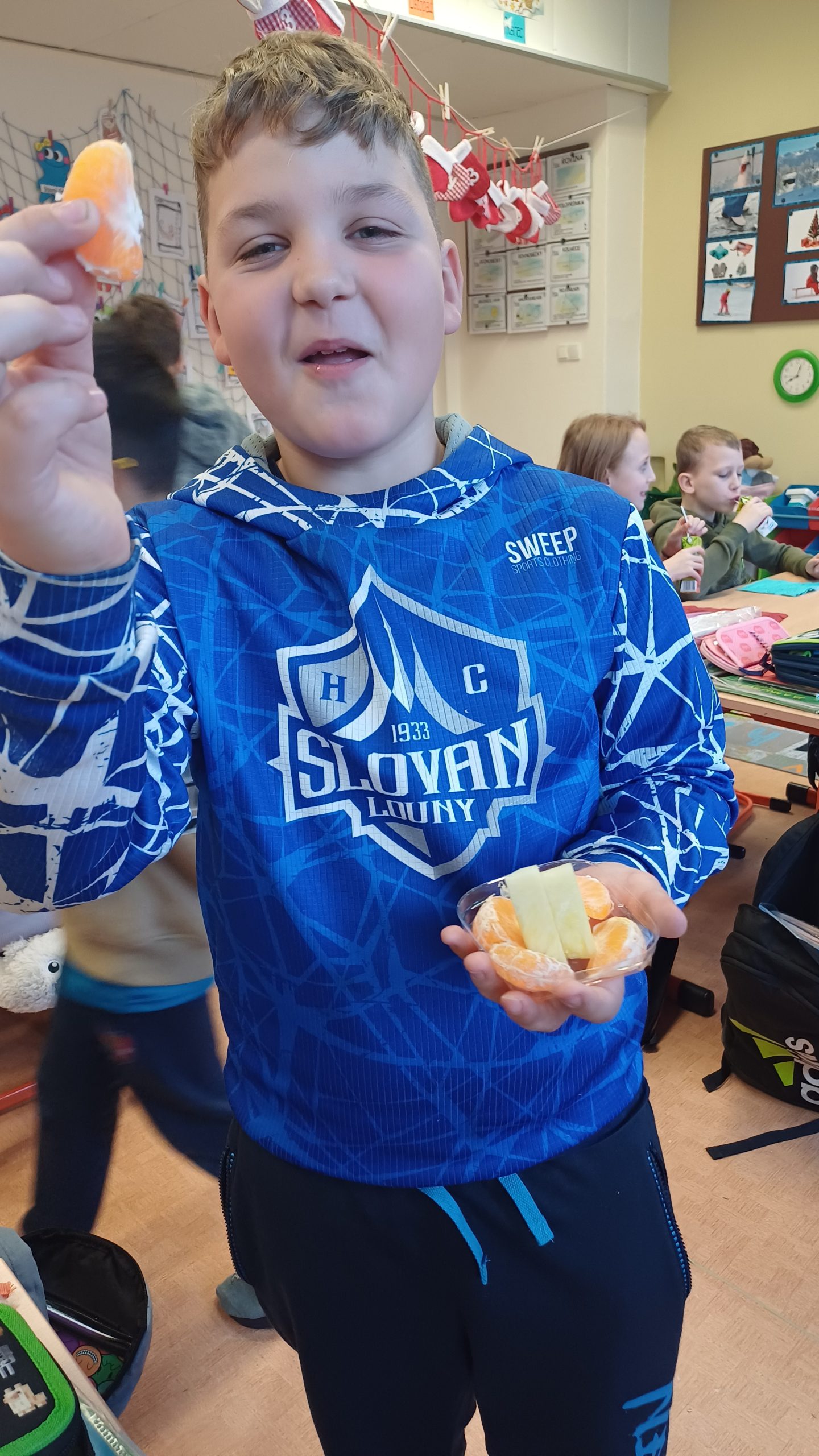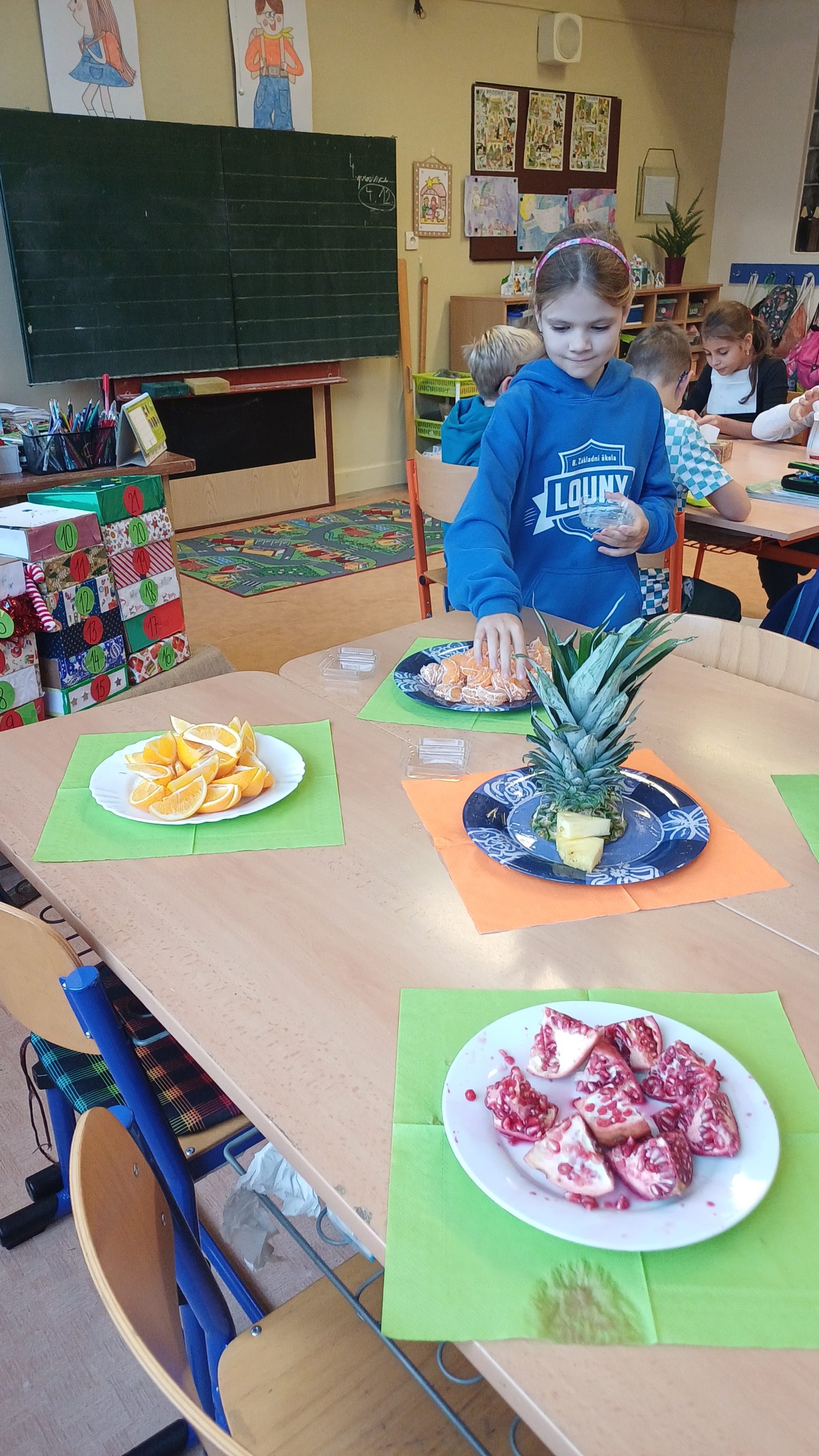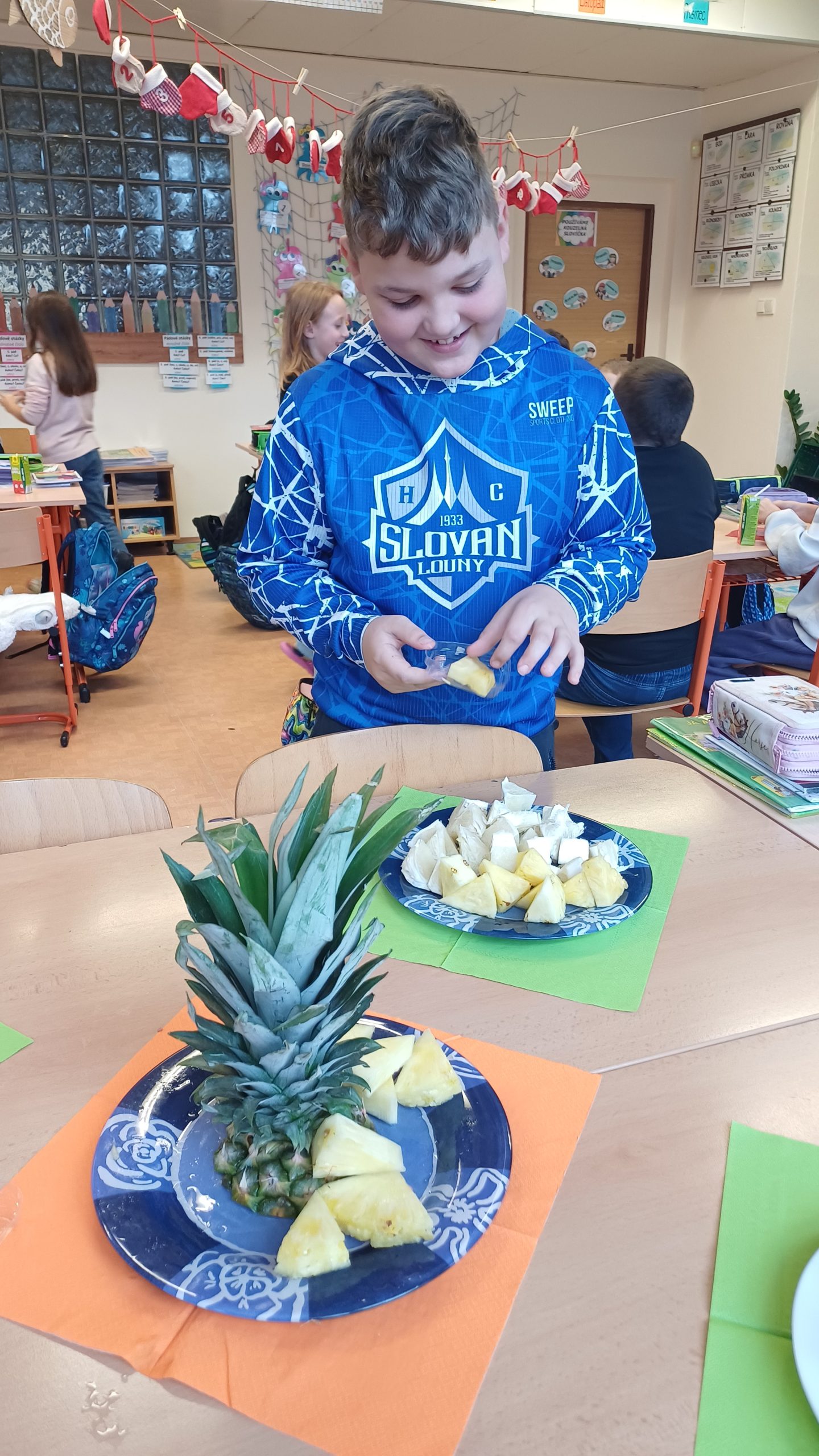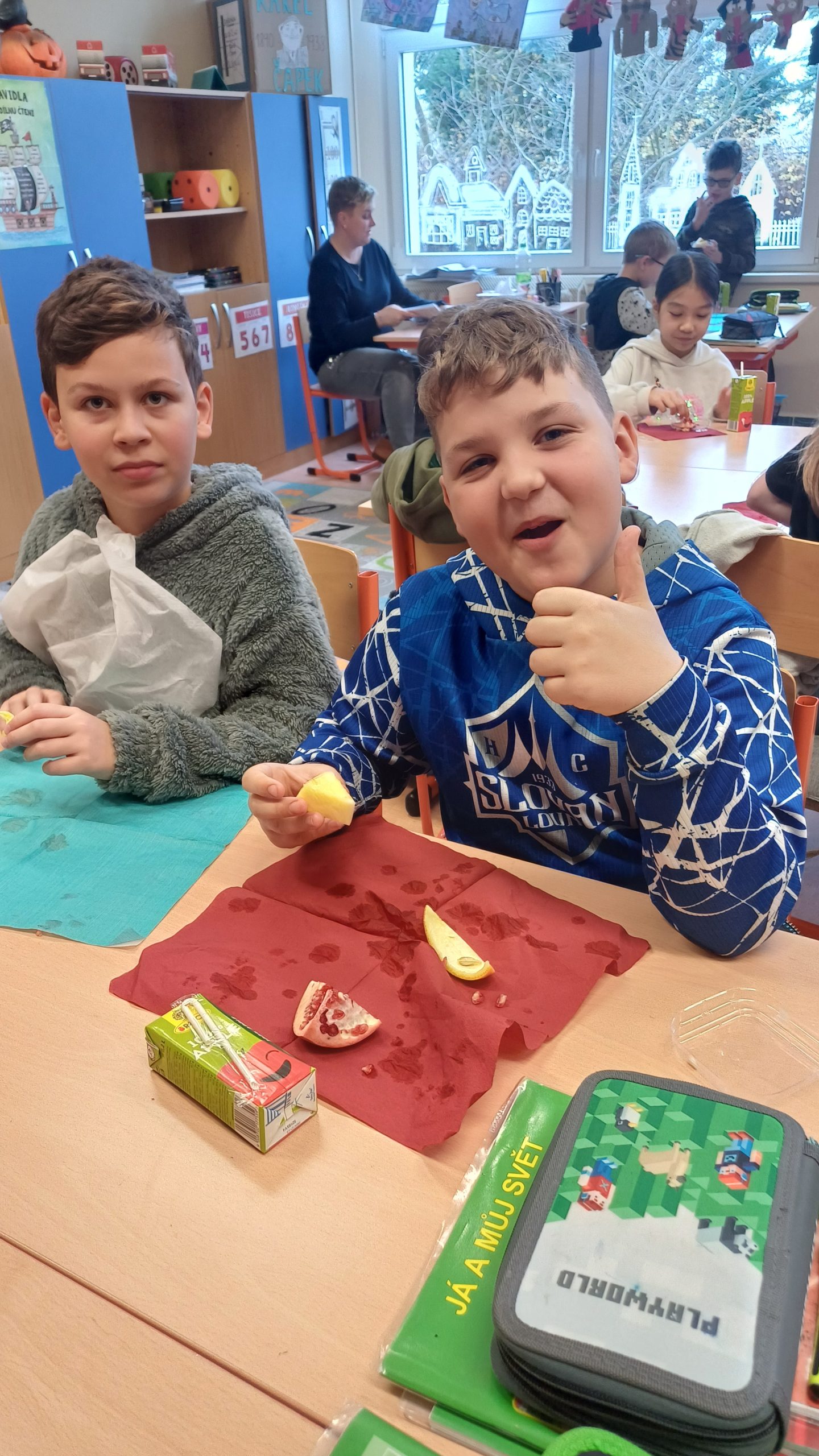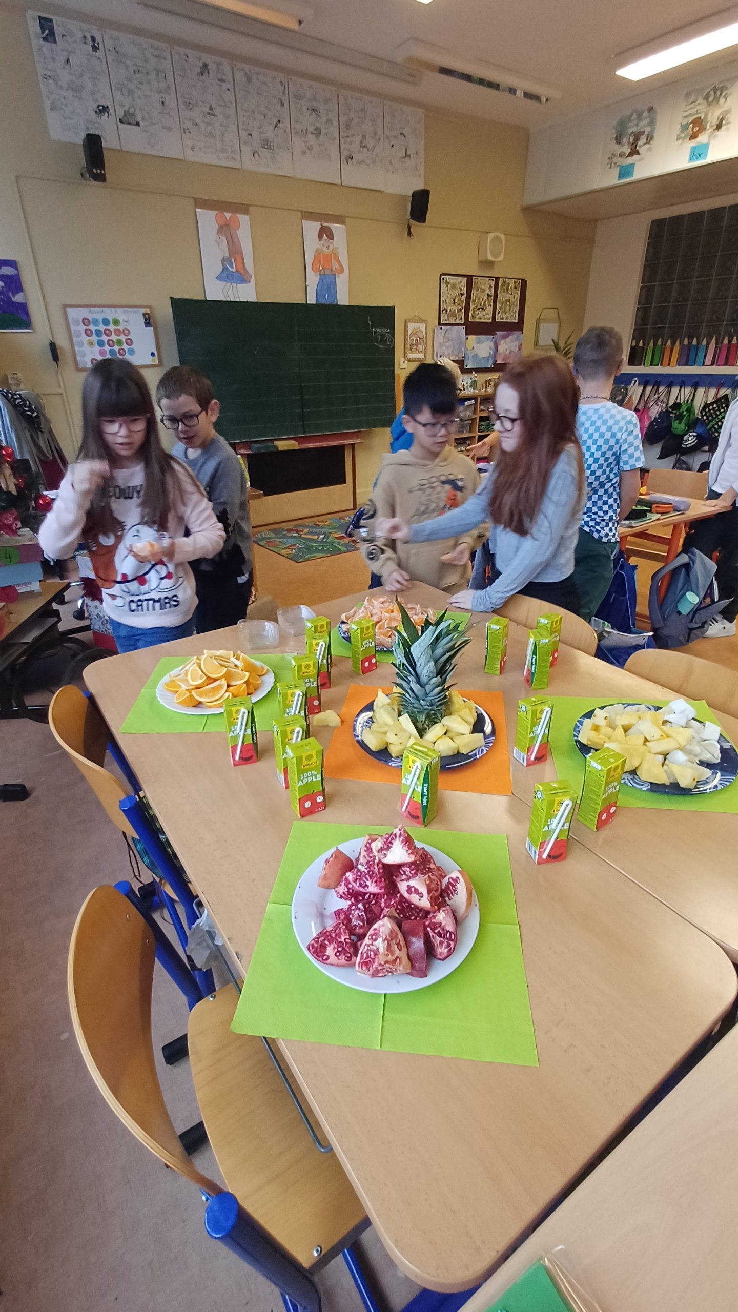 Projek Ovoce a zelenina do škol byl v naší republice zahájen již v roce 2009/2010 a jeho cílem je vytvořit u dětí správné stravovací návyky a bojovat proti dětské obezitě. Dnes jsme ochutnali mandarinky, pomeranč, pomelo, ananas, granátové jablko a 100% jablíčkový džus. Naší ochutnávku jsme zachytili na fotkách a můžeme se s Vámi o ni podělit. Žáci 3.B