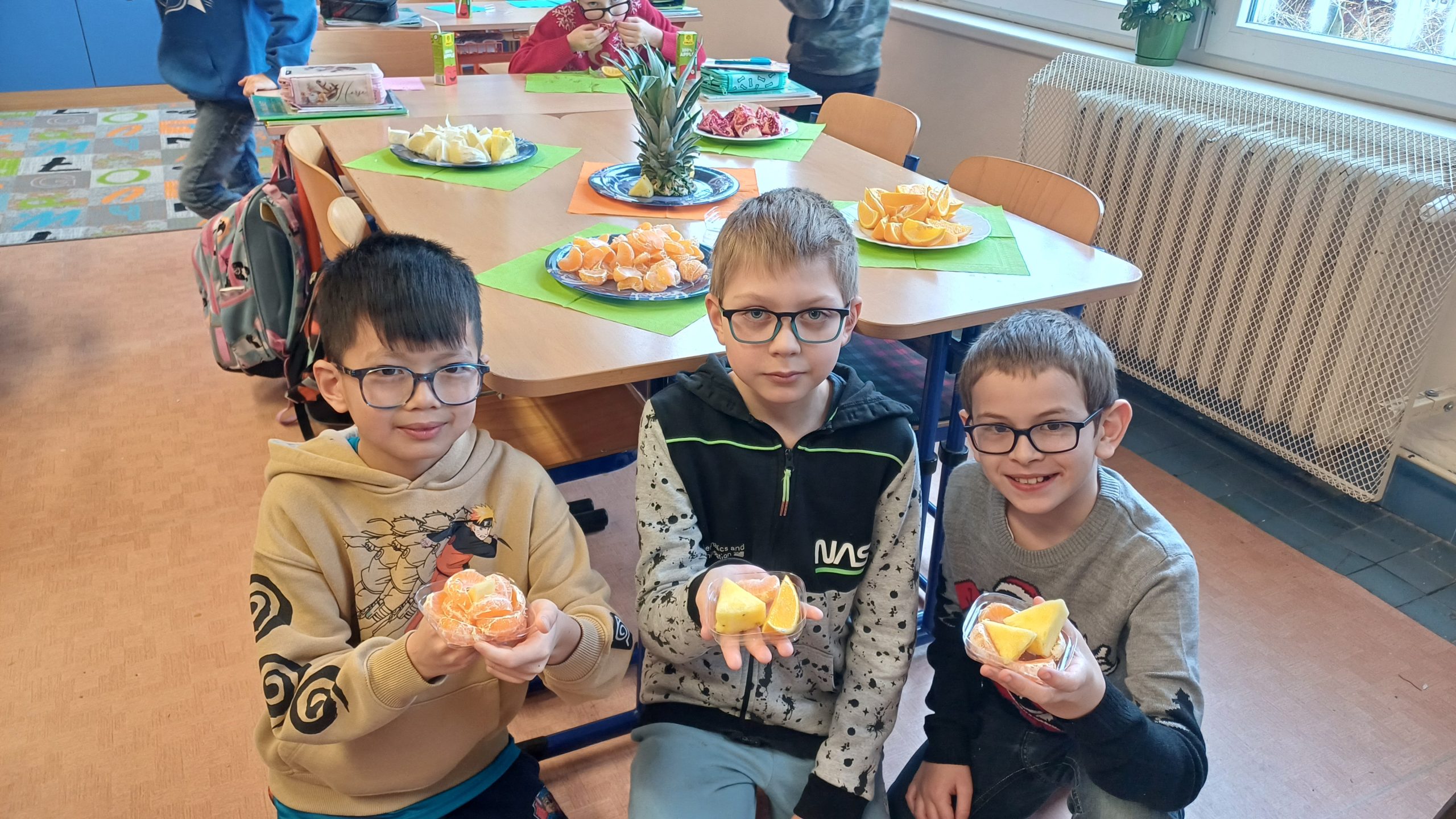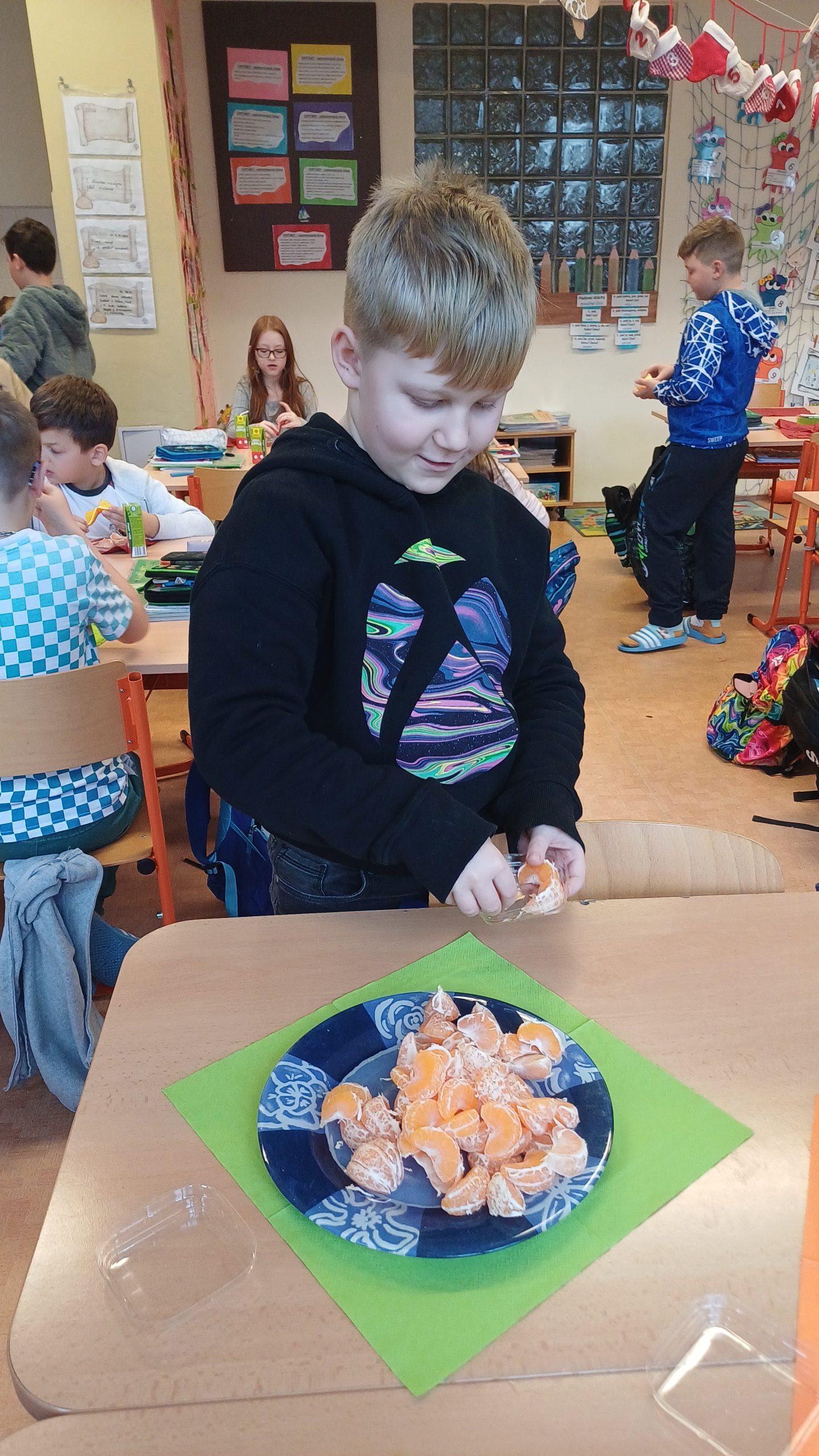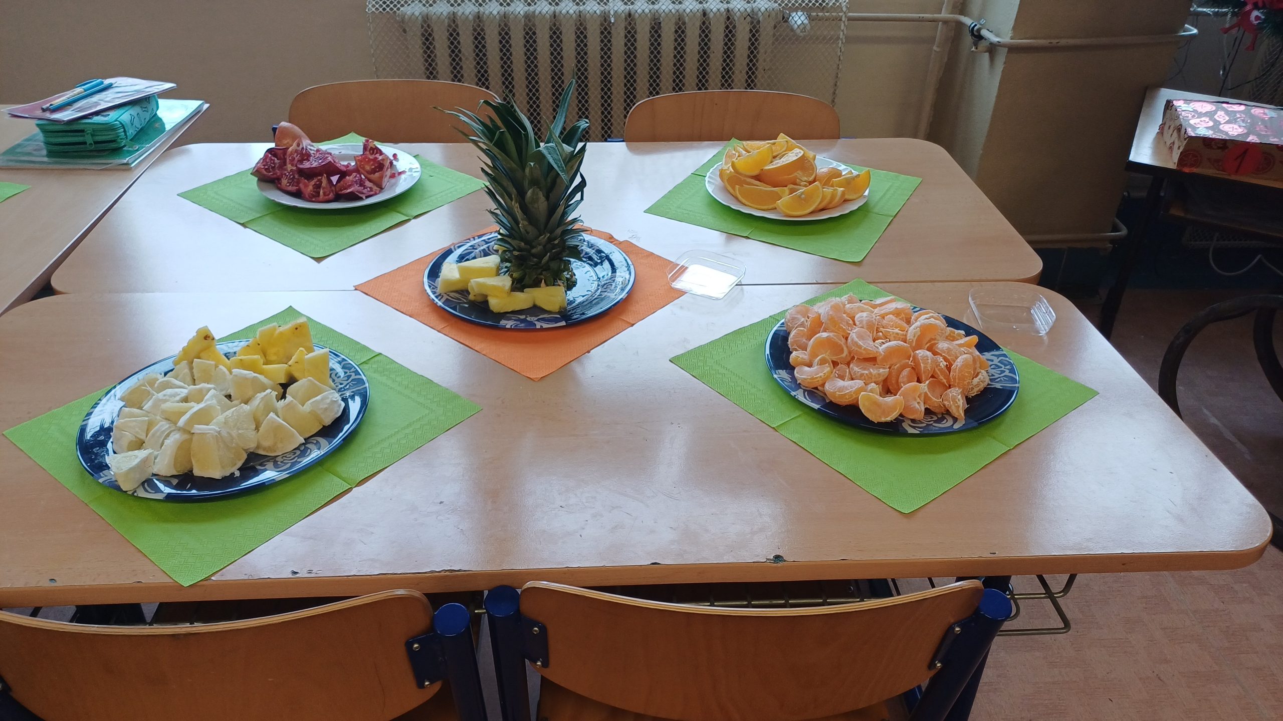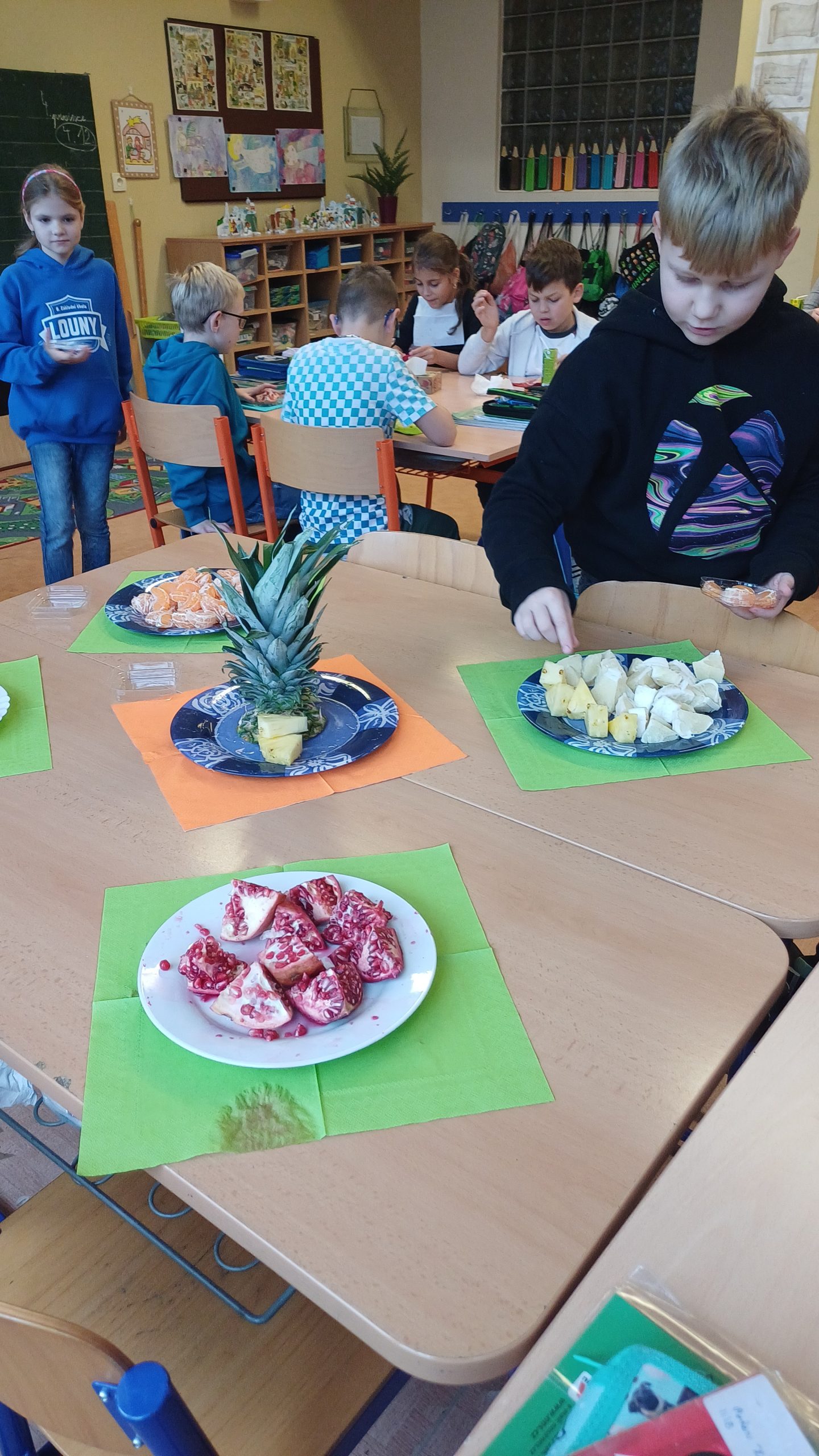Projek Ovoce a zelenina do škol byl v naší republice zahájen již v roce 2009/2010 a jeho cílem je vytvořit u dětí správné stravovací návyky a bojovat proti dětské obezitě. Dnes jsme ochutnali mandarinky, pomeranč, pomelo, ananas, granátové jablko a 100% jablíčkový džus. Naší ochutnávku jsme zachytili na fotkách a můžeme se s Vámi o ni podělit. Žáci 3.B