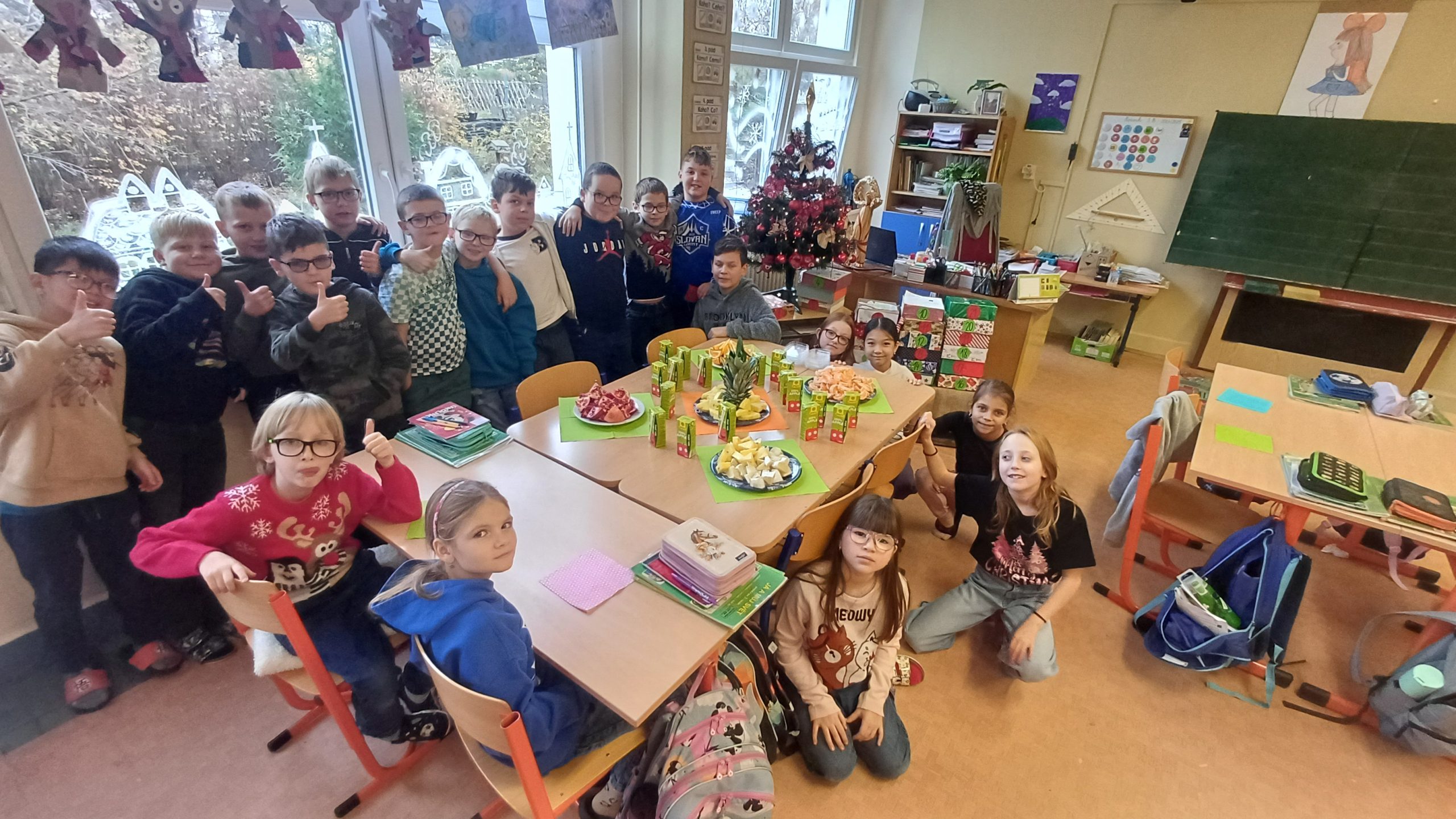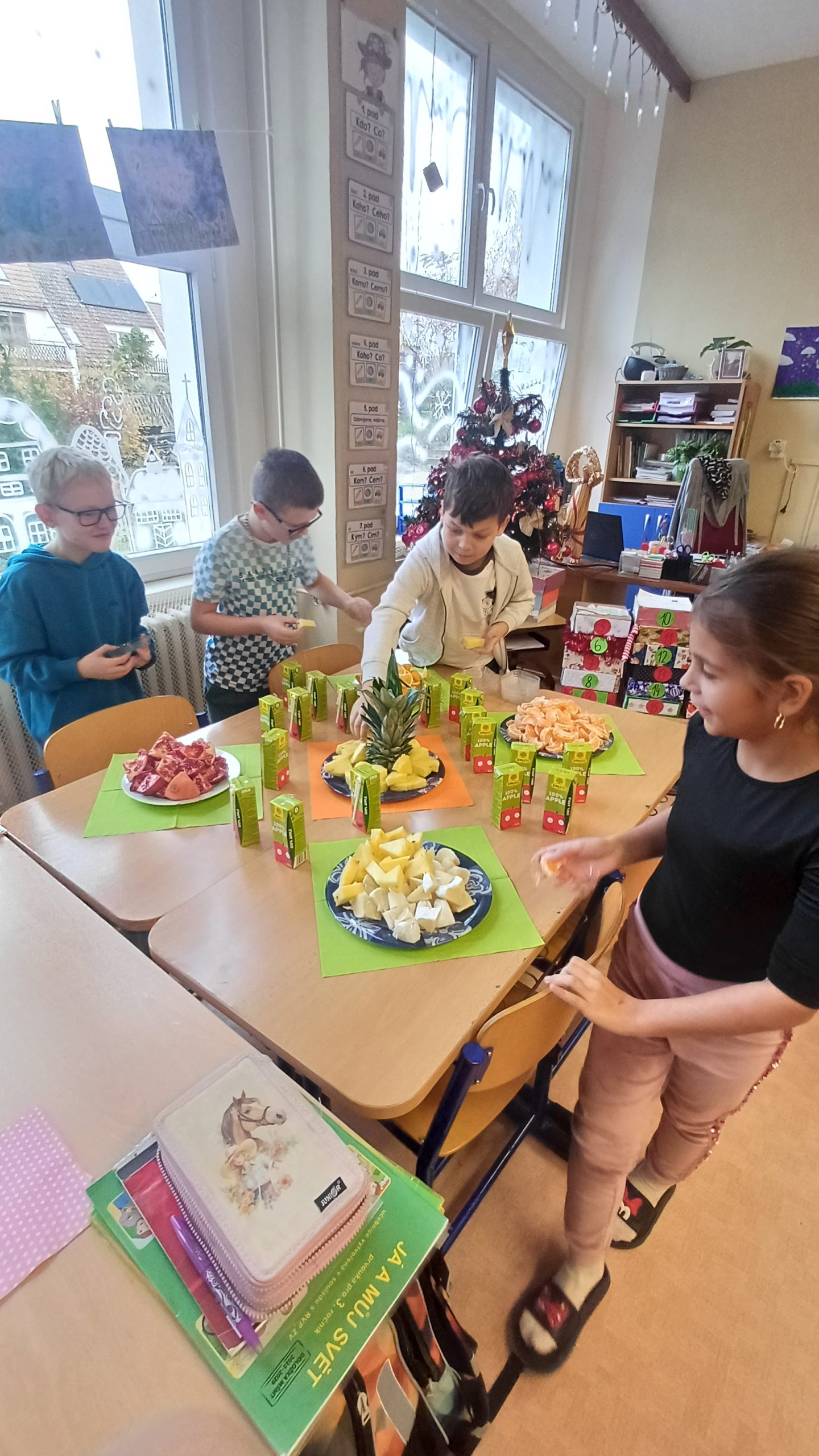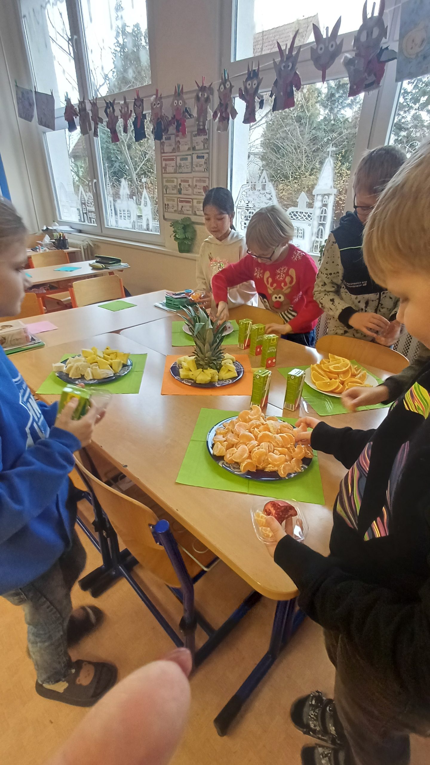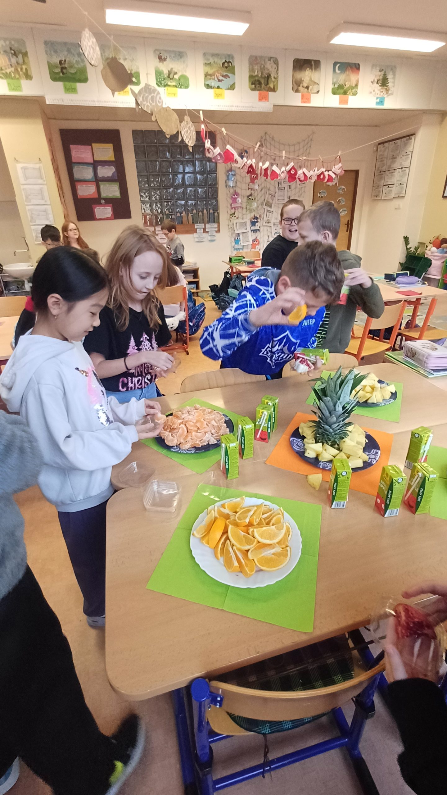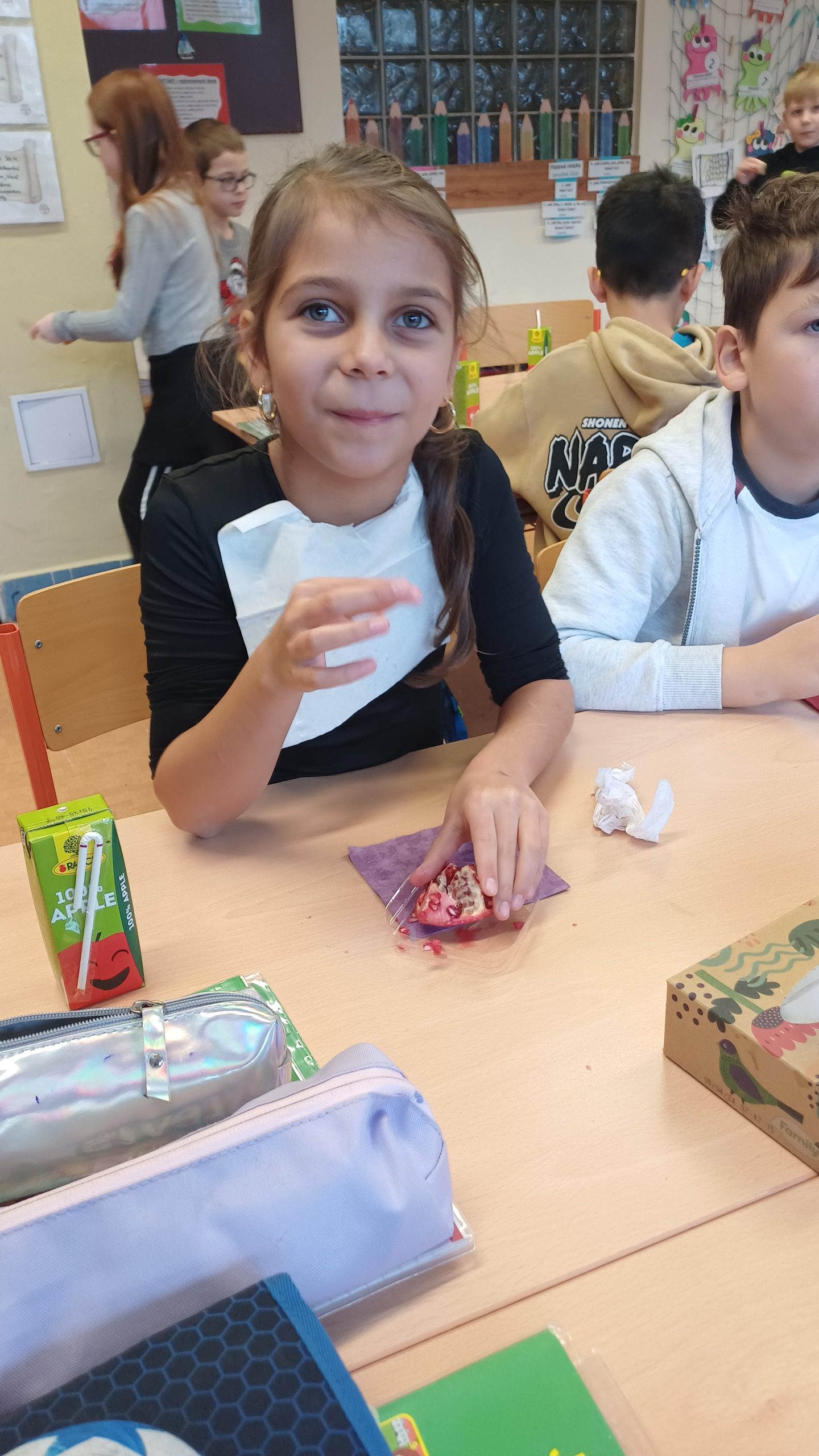 Projek Ovoce a zelenina do škol byl v naší republice zahájen již v roce 2009/2010 a jeho cílem je vytvořit u dětí správné stravovací návyky a bojovat proti dětské obezitě. Dnes jsme ochutnali mandarinky, pomeranč, pomelo, ananas, granátové jablko a 100% jablíčkový džus. Naší ochutnávku jsme zachytili na fotkách a můžeme se s Vámi o ni podělit. Žáci 3.B
