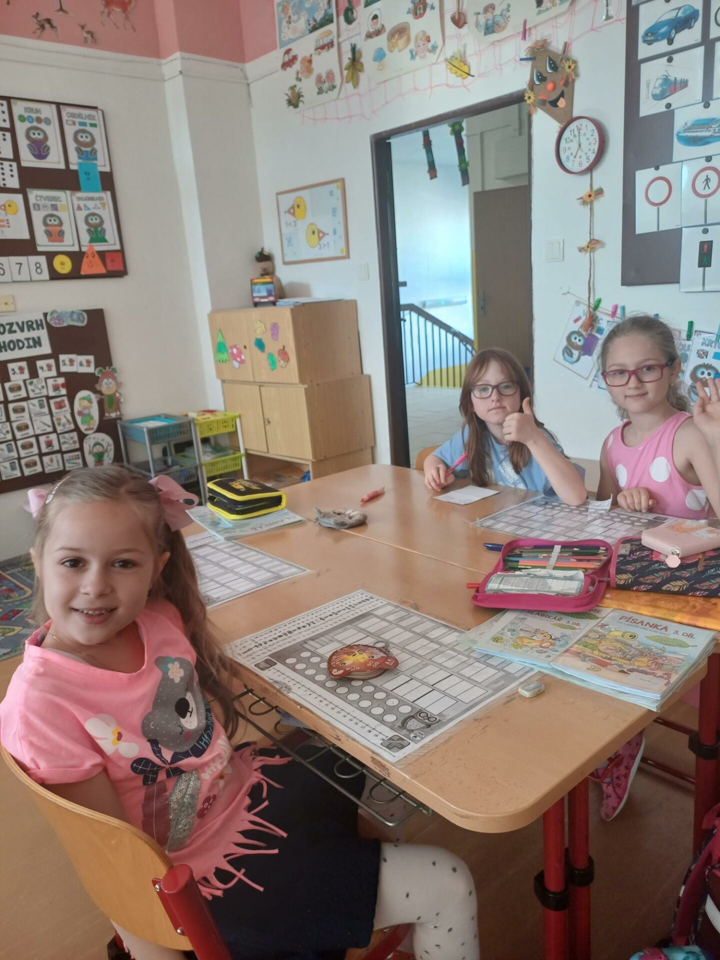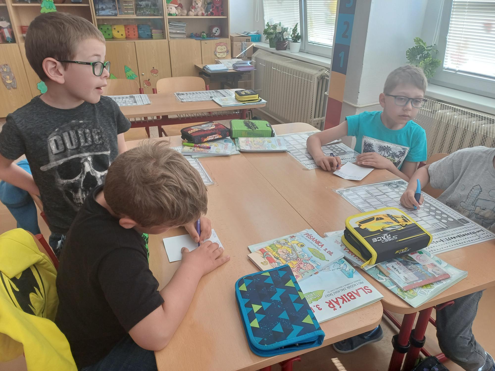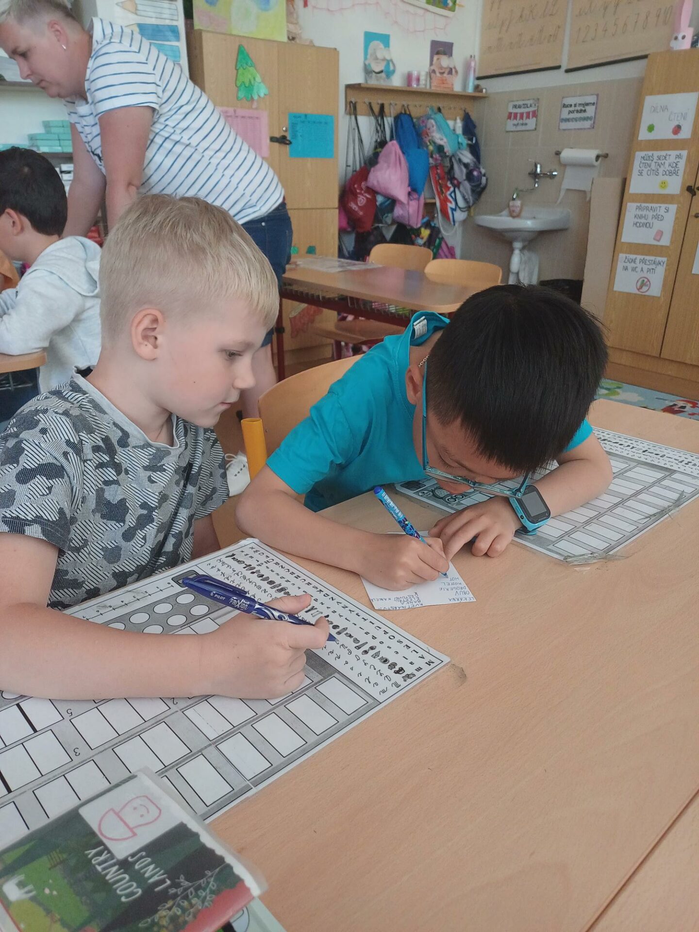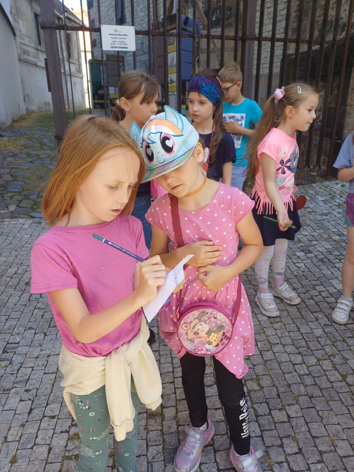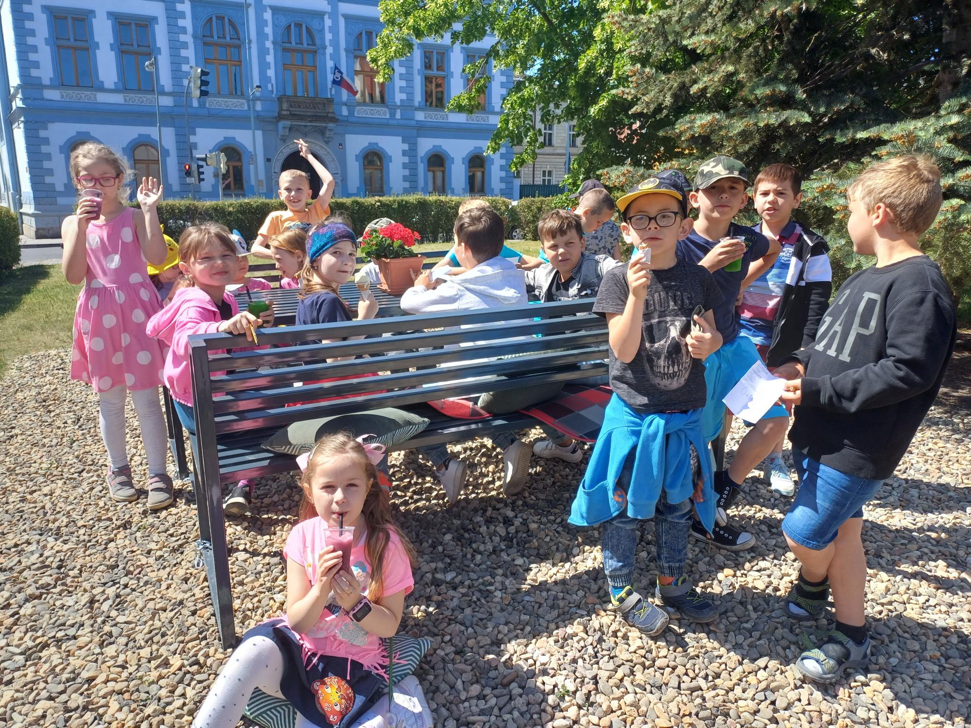 Téma Domov jsme spojili s poznávací vycházkou po městě. Každá dvojice měla svou kartičku s názvem obchodů nebo významných budov našeho města, které jsme měli za úkol vyhledat. Jelikož bylo opravdu teplo, odměnili jsme se ledovou tříští a zmrzlinou. Lesní skřítci z 1.B