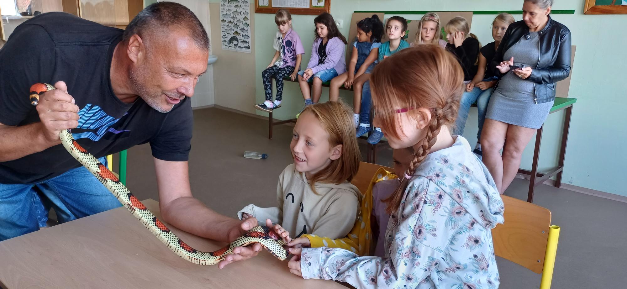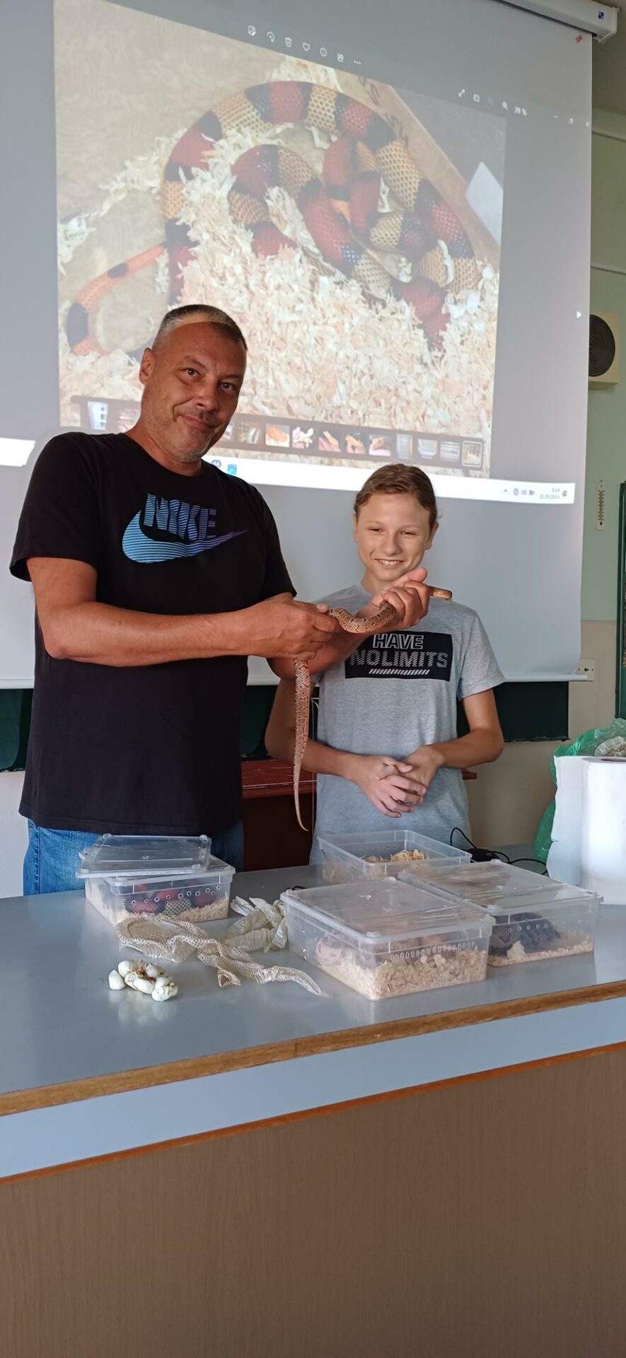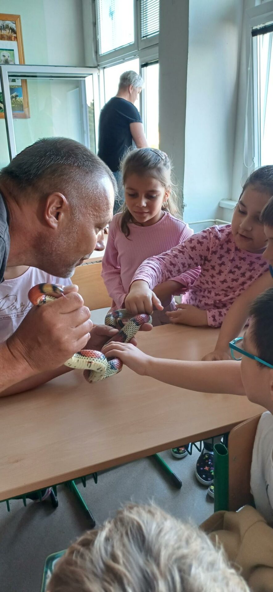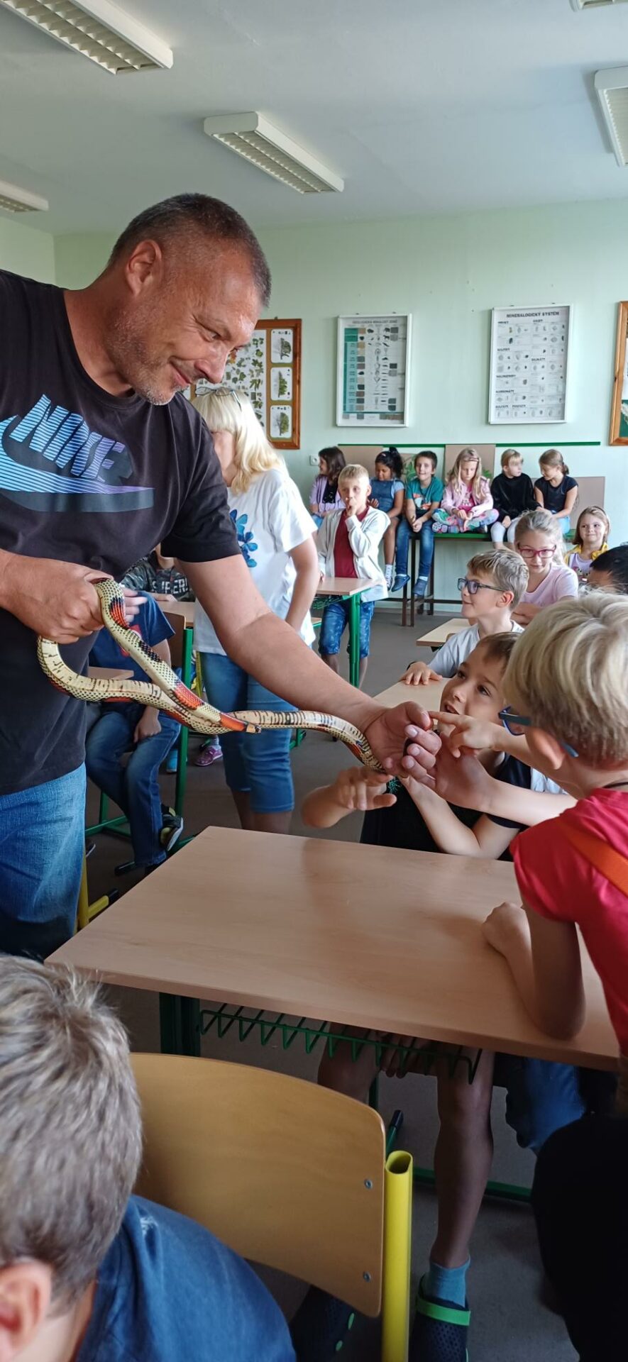 Dnes proběhla na naší škole beseda na téma Plazi. Cílem besedy bylo nejen poznání, že plazi nejsou pouze nebezpeční a jedovatí, natož slizcí, ale i seznámení se smysly plazů, způsobem života a lovu a dalšími zajímavými fakty. Povídání bylo spojeno s ukázkou živých exemplářů plazů. Některé děti dokonce odložily strach a nechaly si hady doslova připustit k tělu. Během besedy byl prostor i pro všetečné otázky. Skřítci z II.B