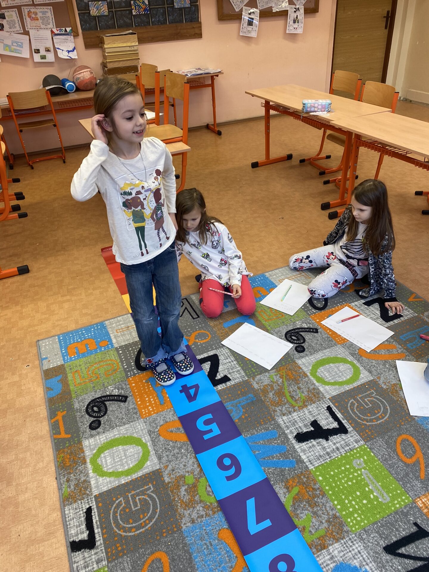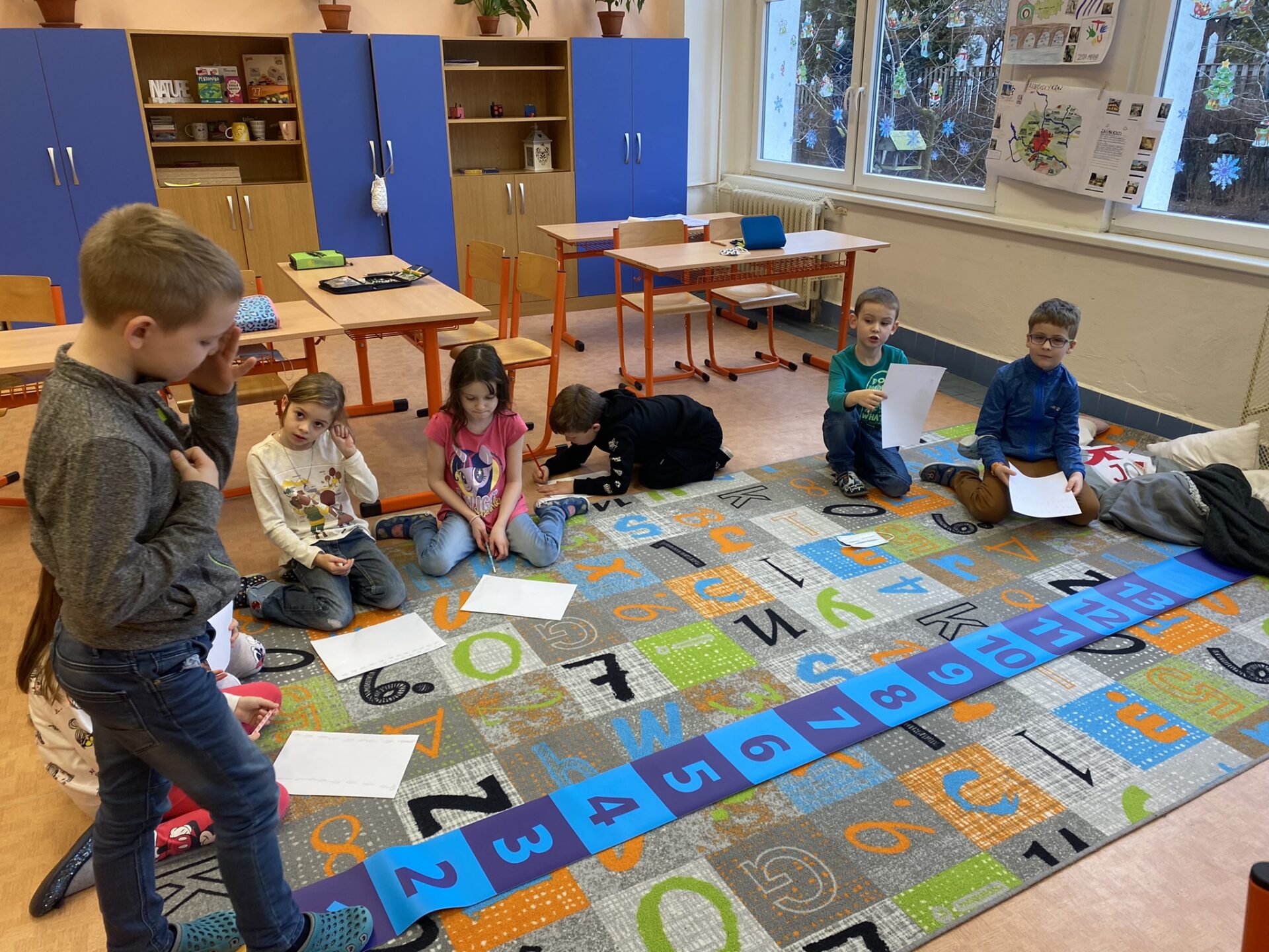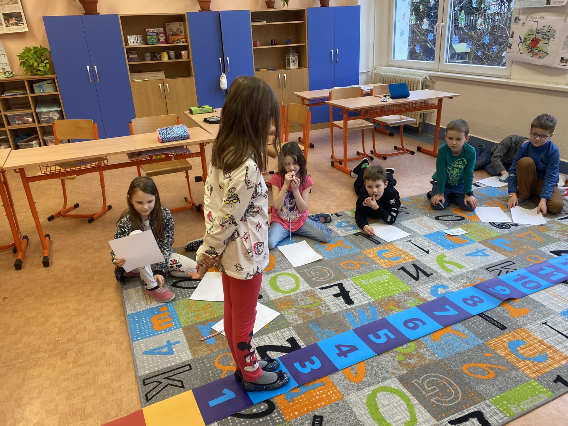 V matematickém kroužku poznáváme jednotlivá prostředí z Hejného metody. V současné době jsme se seznamovali s Autobusem. Autobus je hra, která využívá dětem známé prostředí, která je baví a u které získávají své vlastní zkušenosti. Nejdříve jsme rozdělili role výpravčích a řidiče autobusu. Dítě si při hře musí pamatovat řadu údajů a průběžně počítat. Má k dispozici papír, na který si dělá poznámky do předem připravené tabulky. Postupně jsme si rozestavěli zastávky po celé škole a začali cestovat. V dalších hodinách jsme si osvojili metodu Krokování. Krokování je aktivita (hra), při které se rozvíjí nejen schopnost počítání, neboť toto prostředí je založeno na rytmu. Dále se zde dítě učí sčítat, odčítat, později také rovnice a absolutní hodnotu. Otevírá se zde svět záporných čísel. Naši šikovní žáci se snaží spolužákům vymýšlet záludné úlohy, tudíž jsme se do světa záporných čísel dostali hned první hodinu a museli jsme si pořádně lámat hlavičky:-).