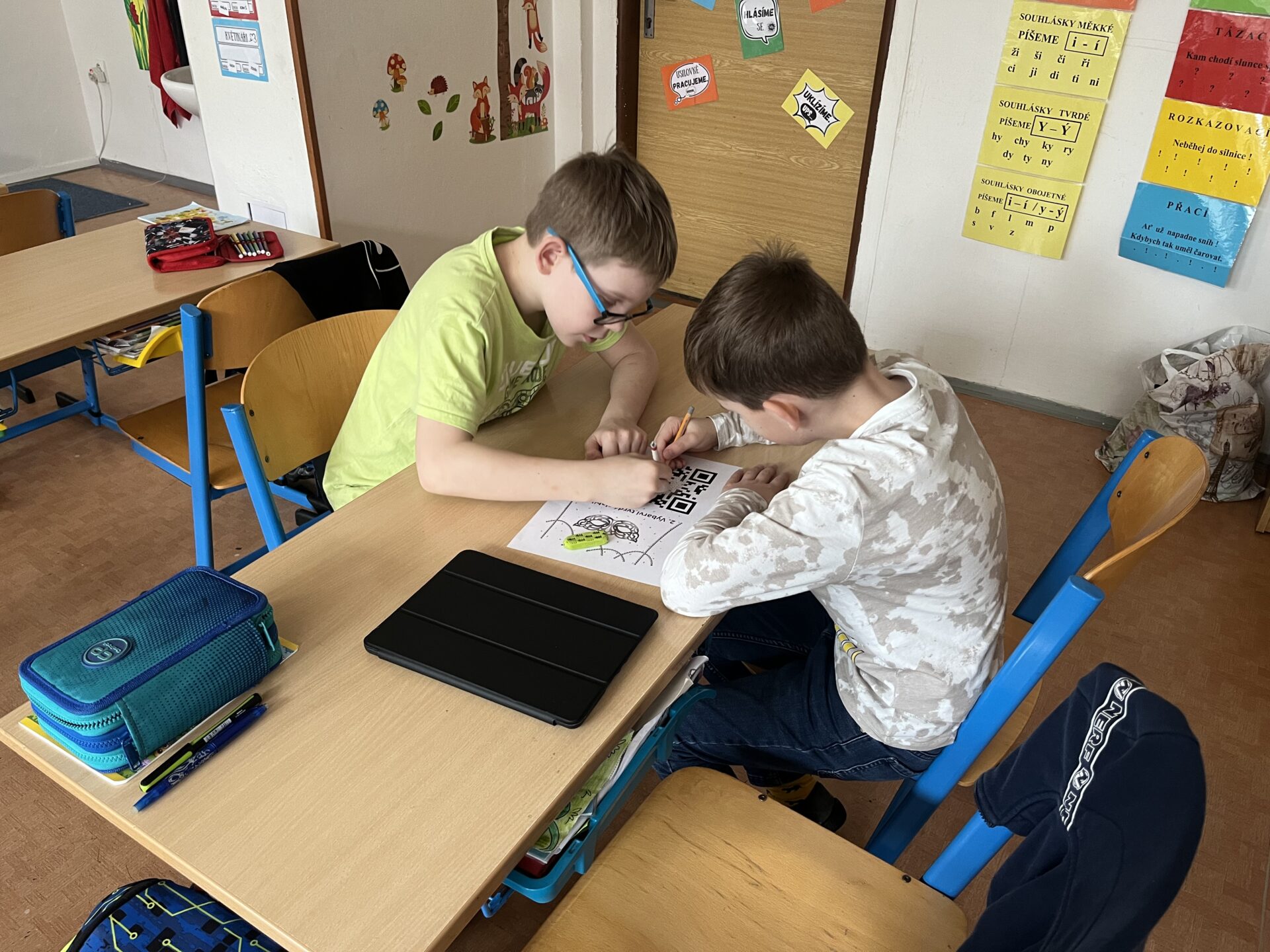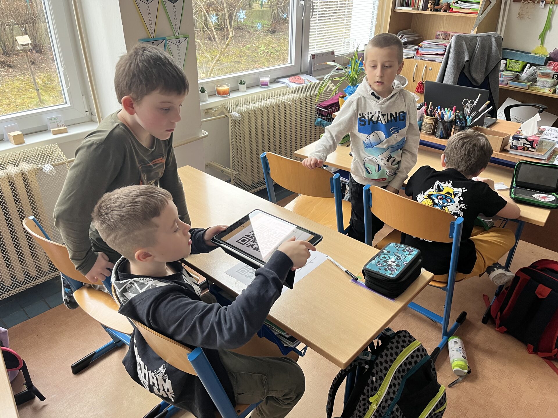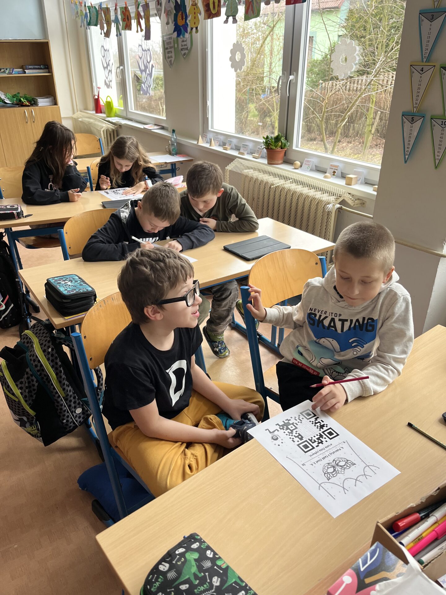 Třeťáci si s paní zástupkyní v zábavné češtině vyzkoušeli práci na iPadech. Nejprve si podle zadání QR kódy dokreslili a pak po jejich naskenování dokázali přečíst slova. Slova potřebovali k tomu, aby mohli složit přísloví. Zábava na celou hodinu a najednou je těch 45 minut málo.