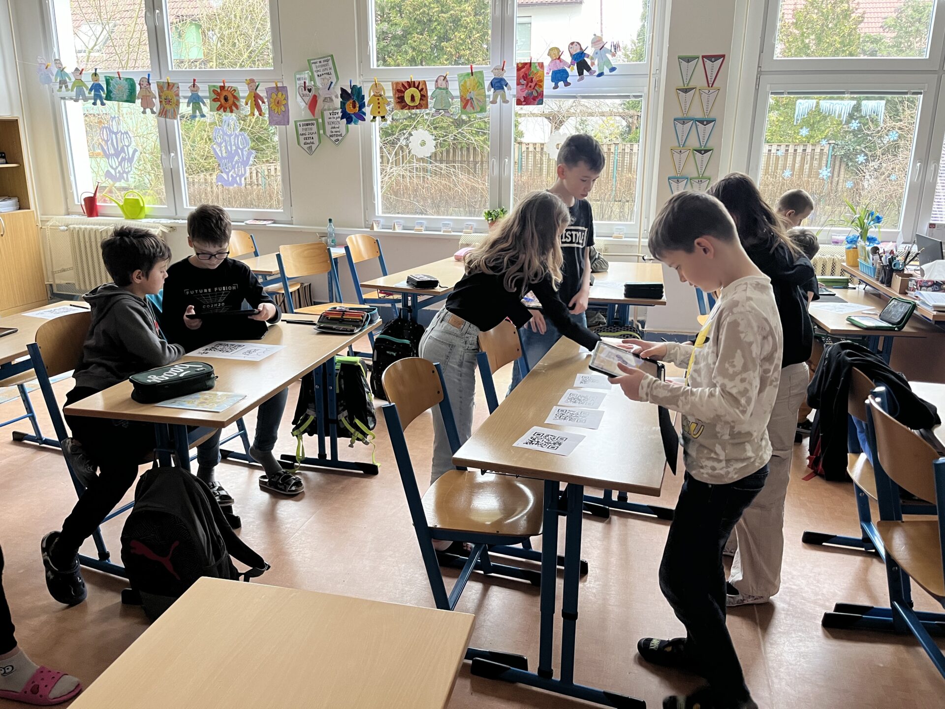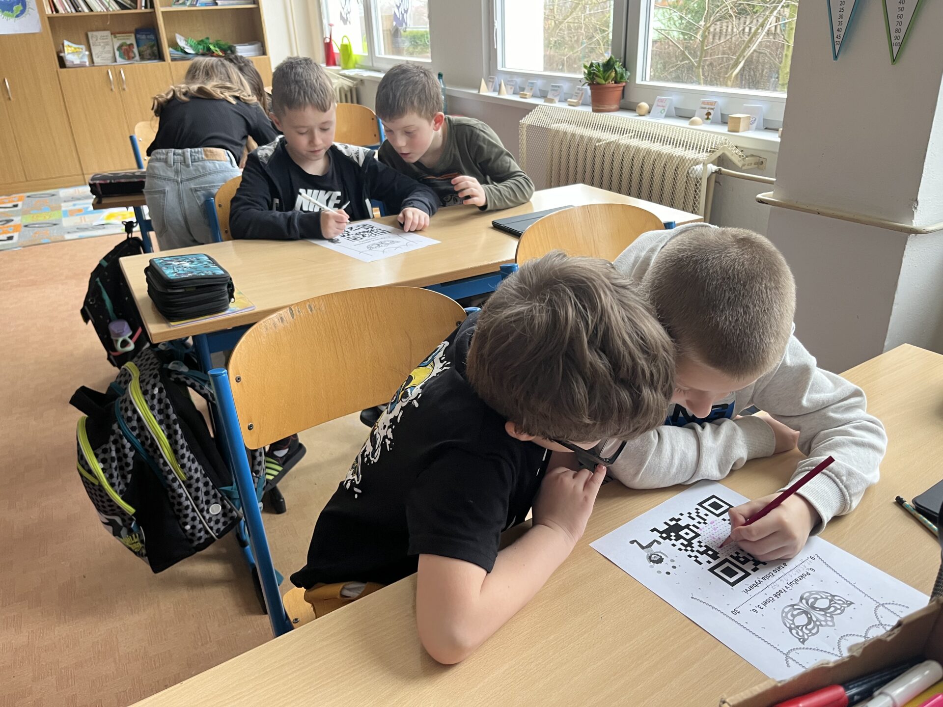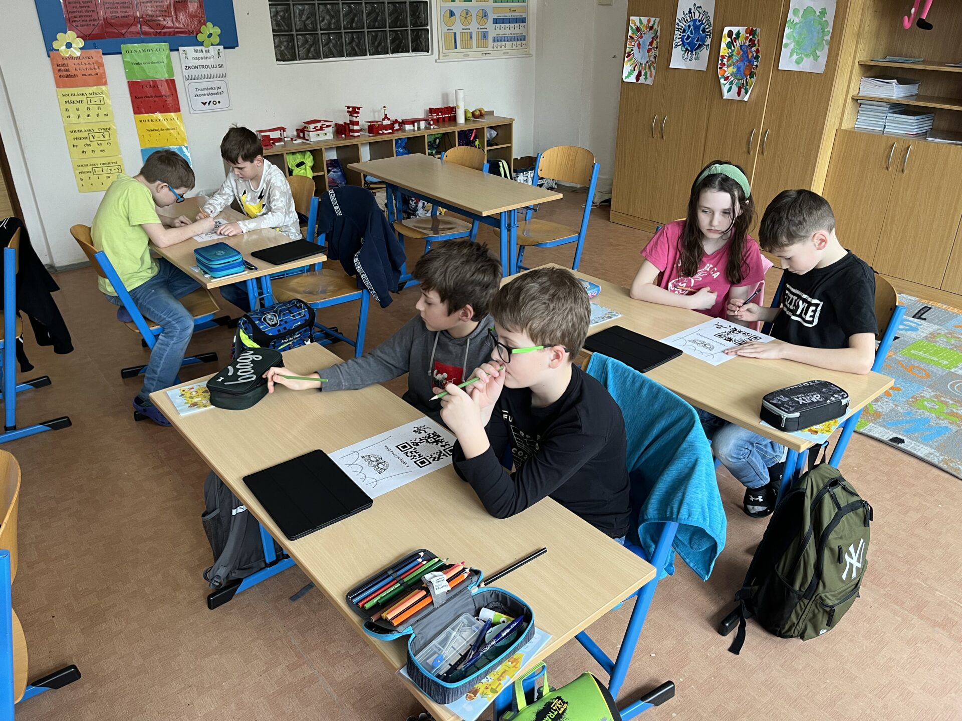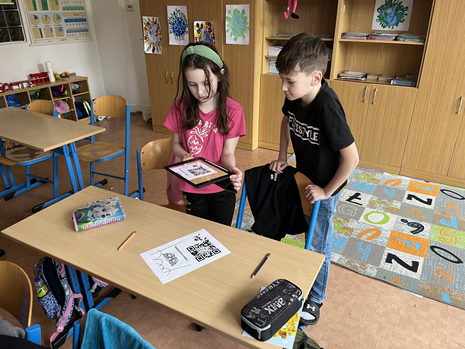 Třeťáci si s paní zástupkyní v zábavné češtině vyzkoušeli práci na iPadech. Nejprve si podle zadání QR kódy dokreslili a pak po jejich naskenování dokázali přečíst slova. Slova potřebovali k tomu, aby mohli složit přísloví. Zábava na celou hodinu a najednou je těch 45 minut málo.