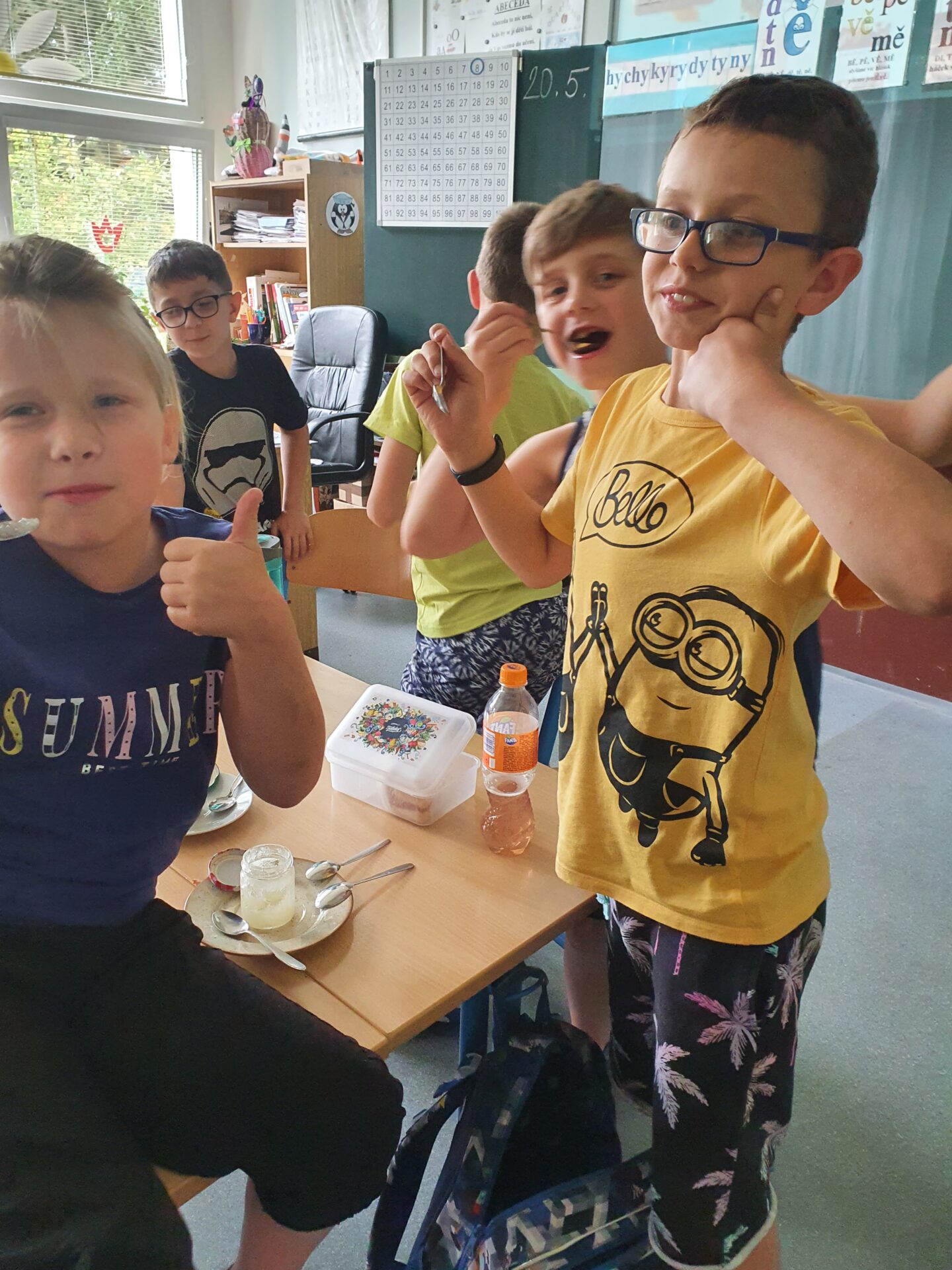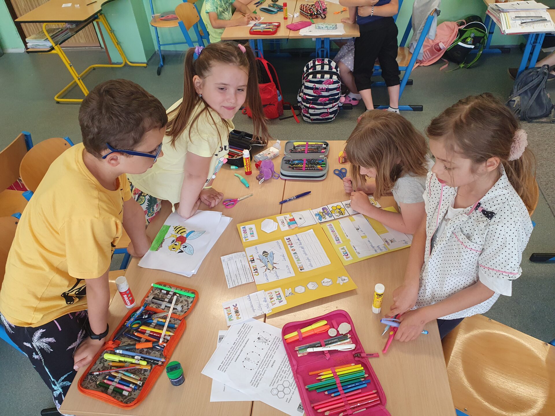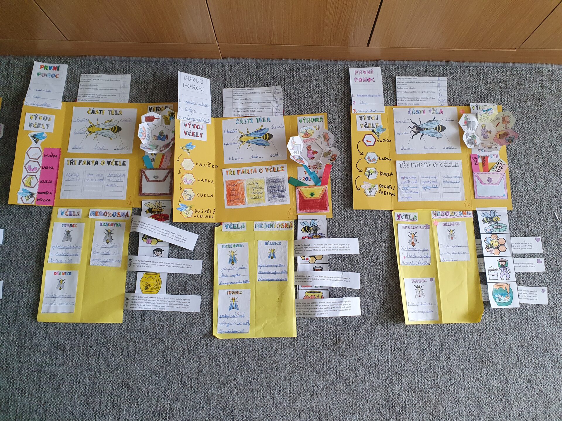Během včelího českého jazyka, matematiky a prvouky sledovali, poslouchali a pátrali po zajímavostech ze života včel. Nabité informace potom ve skupinách pomocí pracovních listů vlepovali do leporela a na závěr si při vědomostní soutěži vyzkoušeli, kolik zajímavostí si pamatují. Zeptejte se a uvidíte. Zaslouží si pochvalu.
