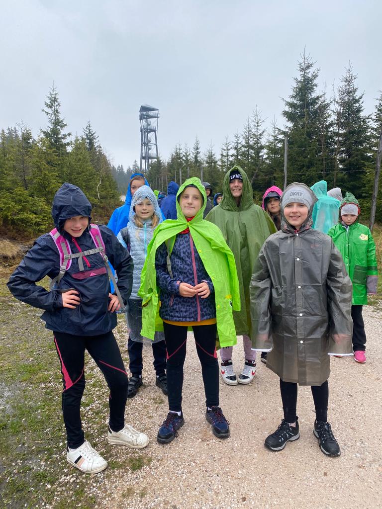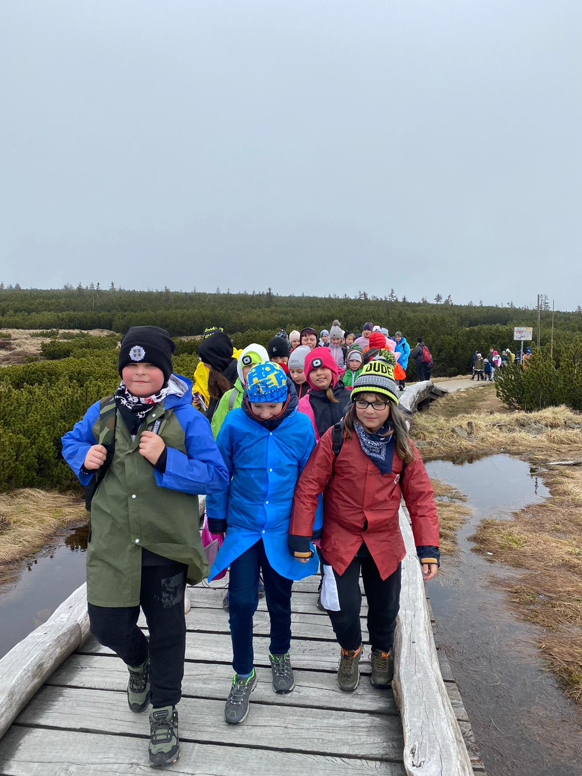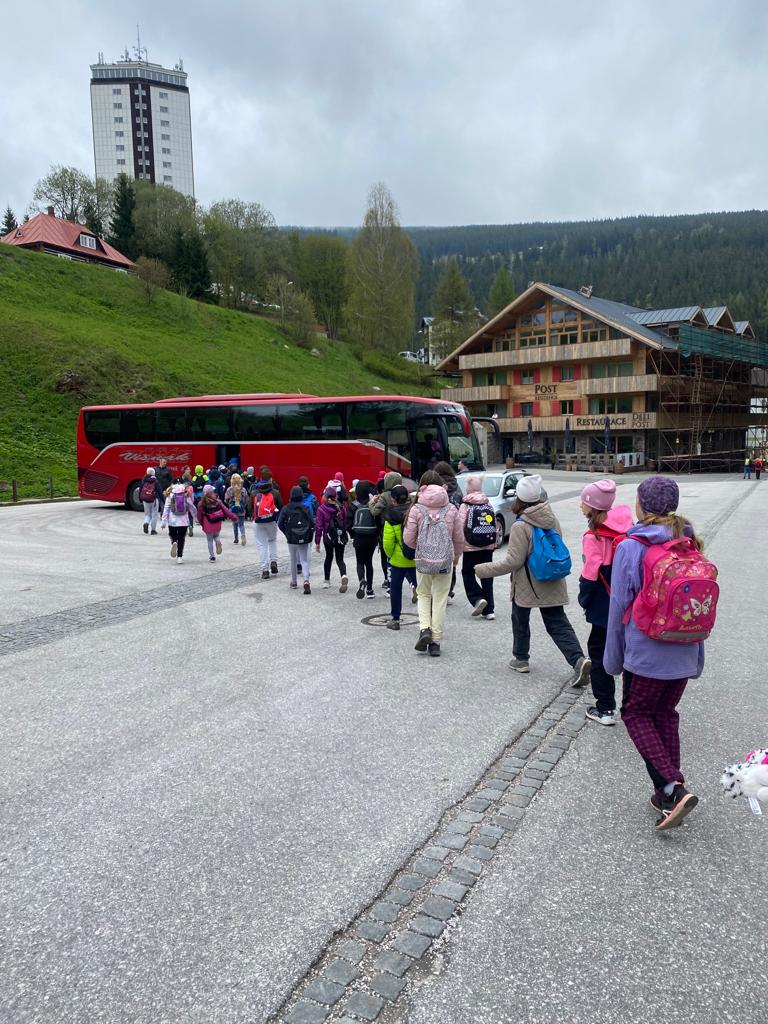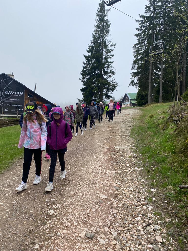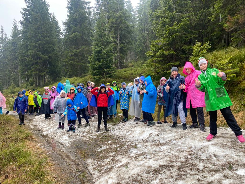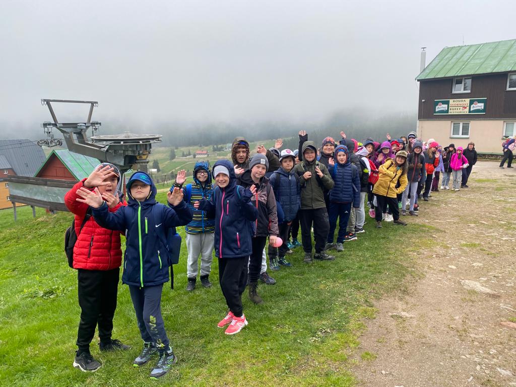 Když se třídy 4.AB a 5AB rozhodly podniknout ozdravný pobyt, nikdo nevěděl, jaké to bude dobrodružství. Vydali jsme se do Krkonoš, konkrétně Pec pod Sněžkou a ještě konkrétněji Bouda Svornost. Počasí si s námi dělalo, co chtělo, přesto nám to nezkazilo radost a nadšení. Začali jsme příjezdem do Jánských lázní. Stezka korunami stromů byla sice deštivá, ale to nám nevadilo, odměnou nám byl dobrý oběd od rodičů v batohu. Lanovkou jsme pokračovali na Černou horu a pak hezky pěšky až k naší boudě. Program byl pestrý každý den, od stavění lesních domečků, úkrytů, soutěží, luštění, hledání pokladu až po vrchol celého pobytu – Sněžka. Zážitek, na který nezapomeneme. Mašinka, lanovka, schody, kroky, vítr, zima, sníh, slunce – to vše nás doprovázelo. A víte co, nám to vůbec nevadilo. Nezáleží na tom, kde jsme, ale s kým tam jsme. Skvělá parta, která se podporovala, navzájem si pomáhala. Zapomněli jsme na běžné strasti, užívali si maličkostí a okolní krásy. Celou dobu nás provázeli malí ježci (sami jsme si je vytvořili), kteří nám sloužili jako odměna za veškeré činnosti. Děkujeme všem, kteří se podíleli na možnosti zúčastnit se tohoto ozdravného pobytu a „JEŽKŮM ZDAR!“