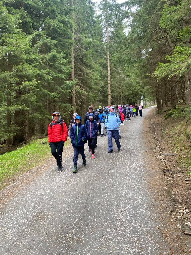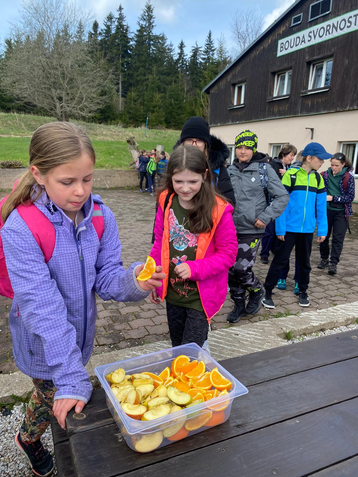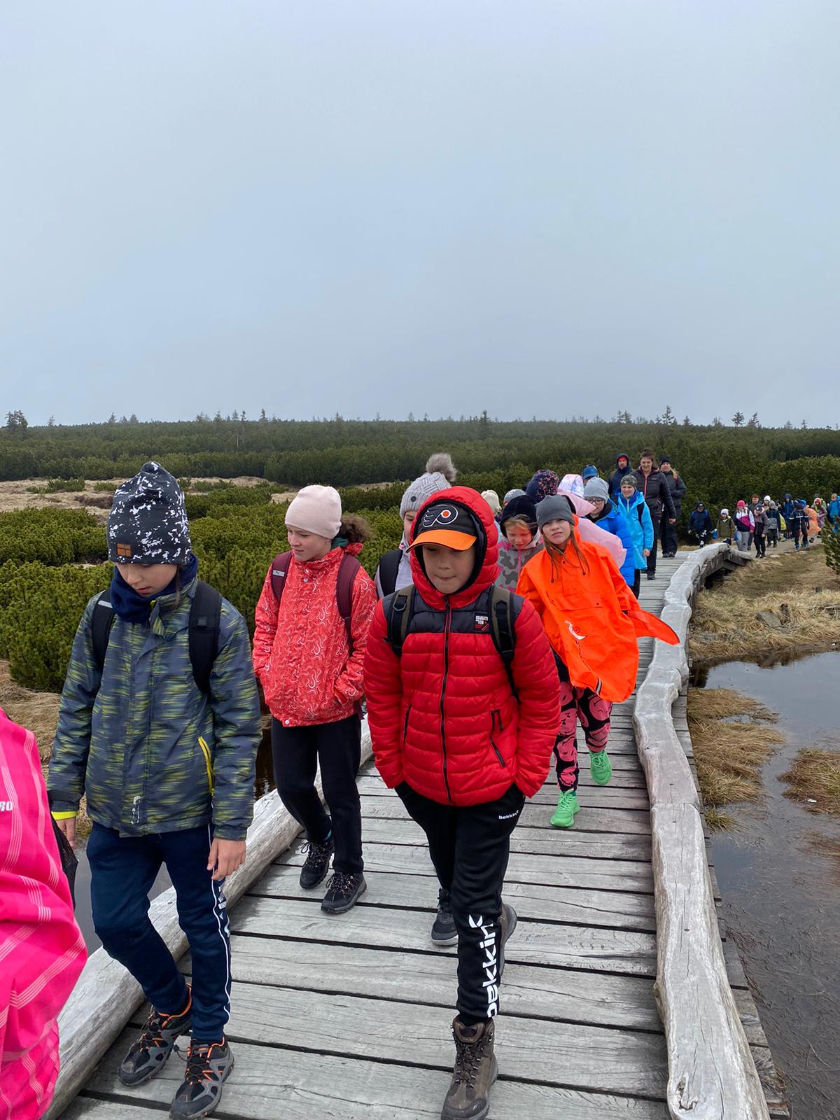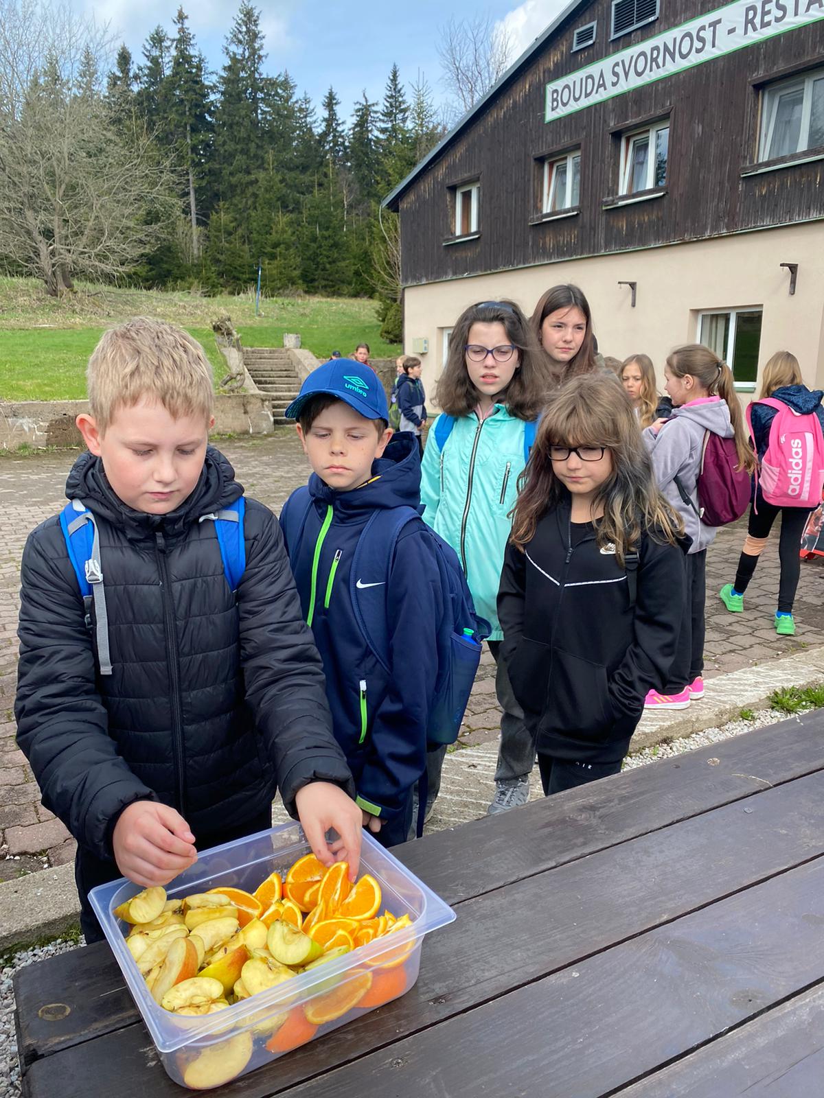Když se třídy 4.AB a 5AB rozhodly podniknout ozdravný pobyt, nikdo nevěděl, jaké to bude dobrodružství. Vydali jsme se do Krkonoš, konkrétně Pec pod Sněžkou a ještě konkrétněji Bouda Svornost. Počasí si s námi dělalo, co chtělo, přesto nám to nezkazilo radost a nadšení. Začali jsme příjezdem do Jánských lázní. Stezka korunami stromů byla sice deštivá, ale to nám nevadilo, odměnou nám byl dobrý oběd od rodičů v batohu. Lanovkou jsme pokračovali na Černou horu a pak hezky pěšky až k naší boudě. Program byl pestrý každý den, od stavění lesních domečků, úkrytů, soutěží, luštění, hledání pokladu až po vrchol celého pobytu – Sněžka. Zážitek, na který nezapomeneme. Mašinka, lanovka, schody, kroky, vítr, zima, sníh, slunce – to vše nás doprovázelo. A víte co, nám to vůbec nevadilo. Nezáleží na tom, kde jsme, ale s kým tam jsme. Skvělá parta, která se podporovala, navzájem si pomáhala. Zapomněli jsme na běžné strasti, užívali si maličkostí a okolní krásy. Celou dobu nás provázeli malí ježci (sami jsme si je vytvořili), kteří nám sloužili jako odměna za veškeré činnosti. Děkujeme všem, kteří se podíleli na možnosti zúčastnit se tohoto ozdravného pobytu a „JEŽKŮM ZDAR!“