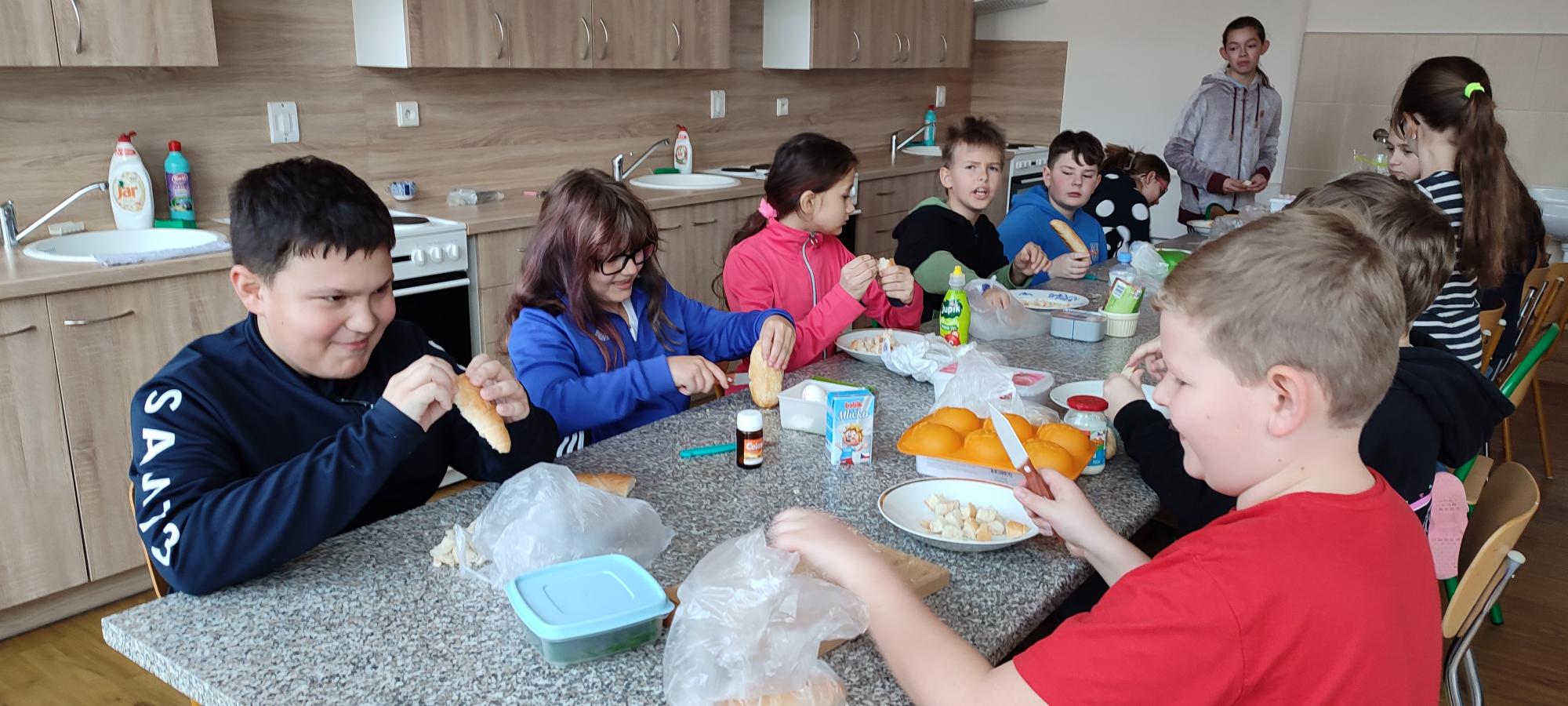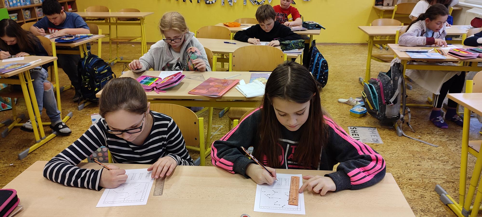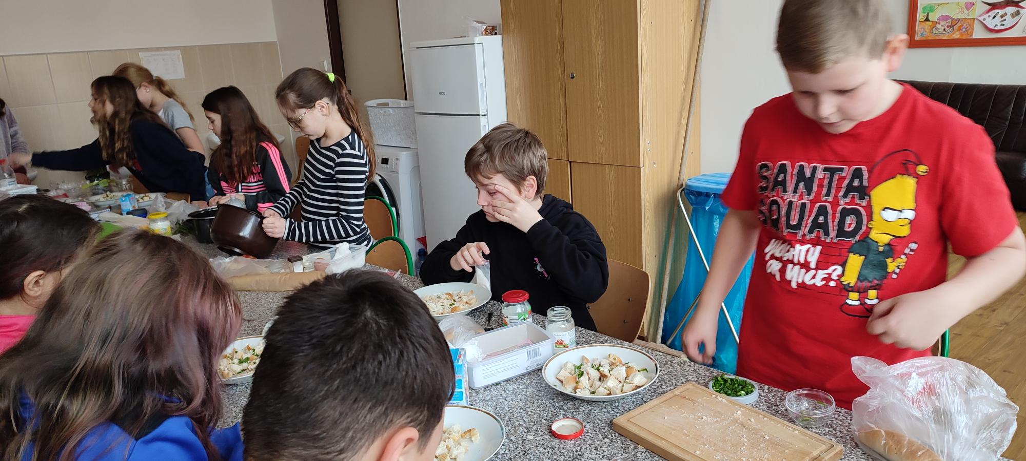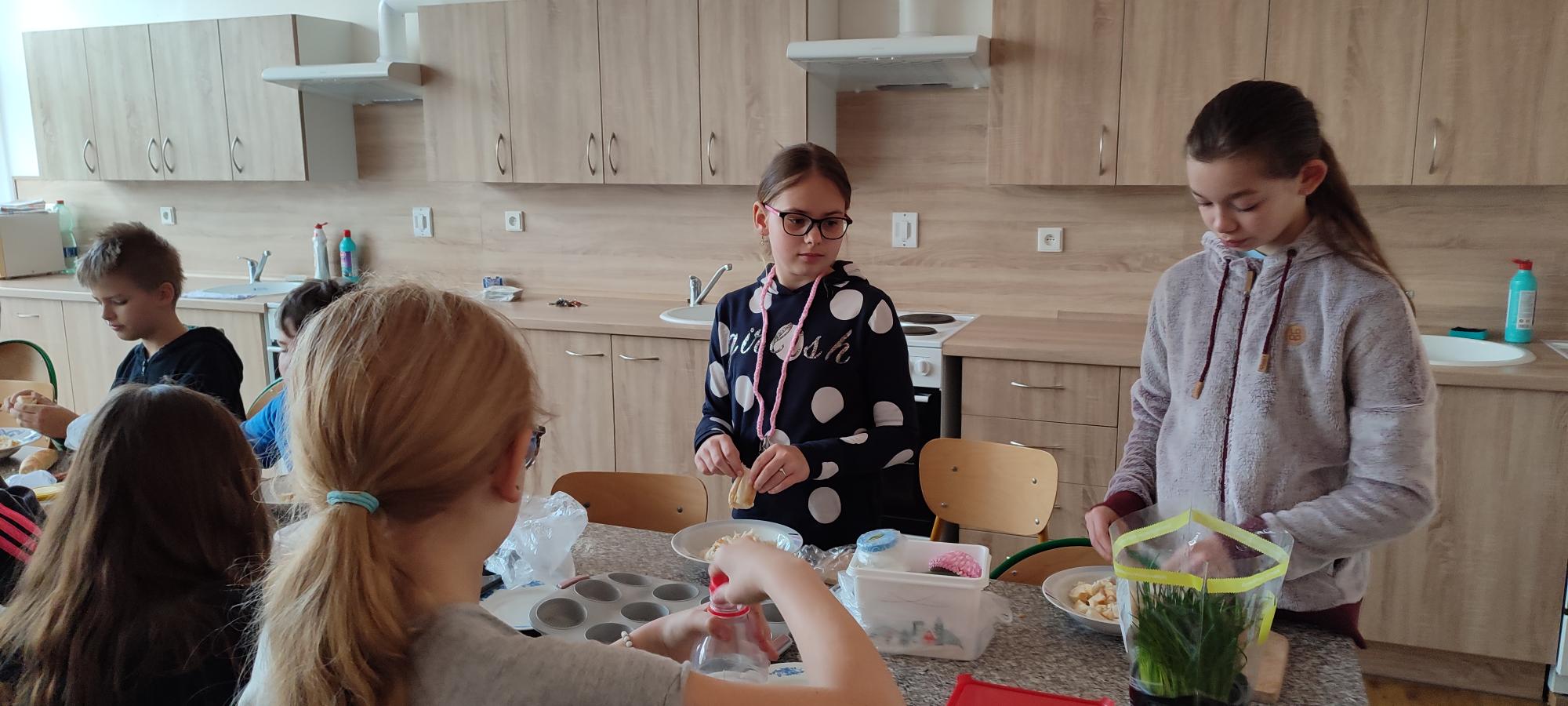 Napsali jsme si recept na jarní nádivku, kterou jsme následně upekli a ochutnali. V matematice jsme se zaměřili na informatiku a rýsování. V informatice jsme se orientovali ve čtvercové síti pomocí kódů. V geometrii jsme narýsovali tangram v podobě vajíčka, který jsme následně rozstříhali a vytvořili z něj obrázky. Stihli jsme i vyrobit velikonoční přáníčko a zasít osení.