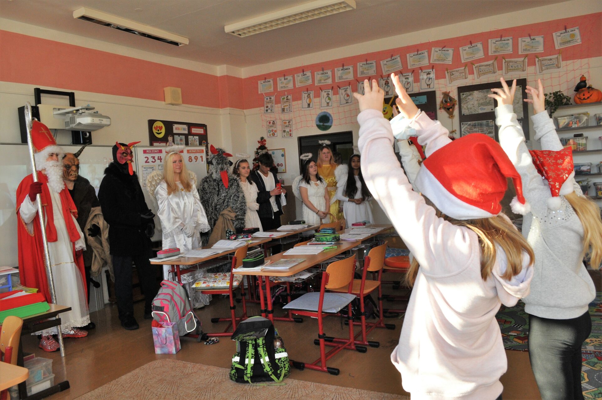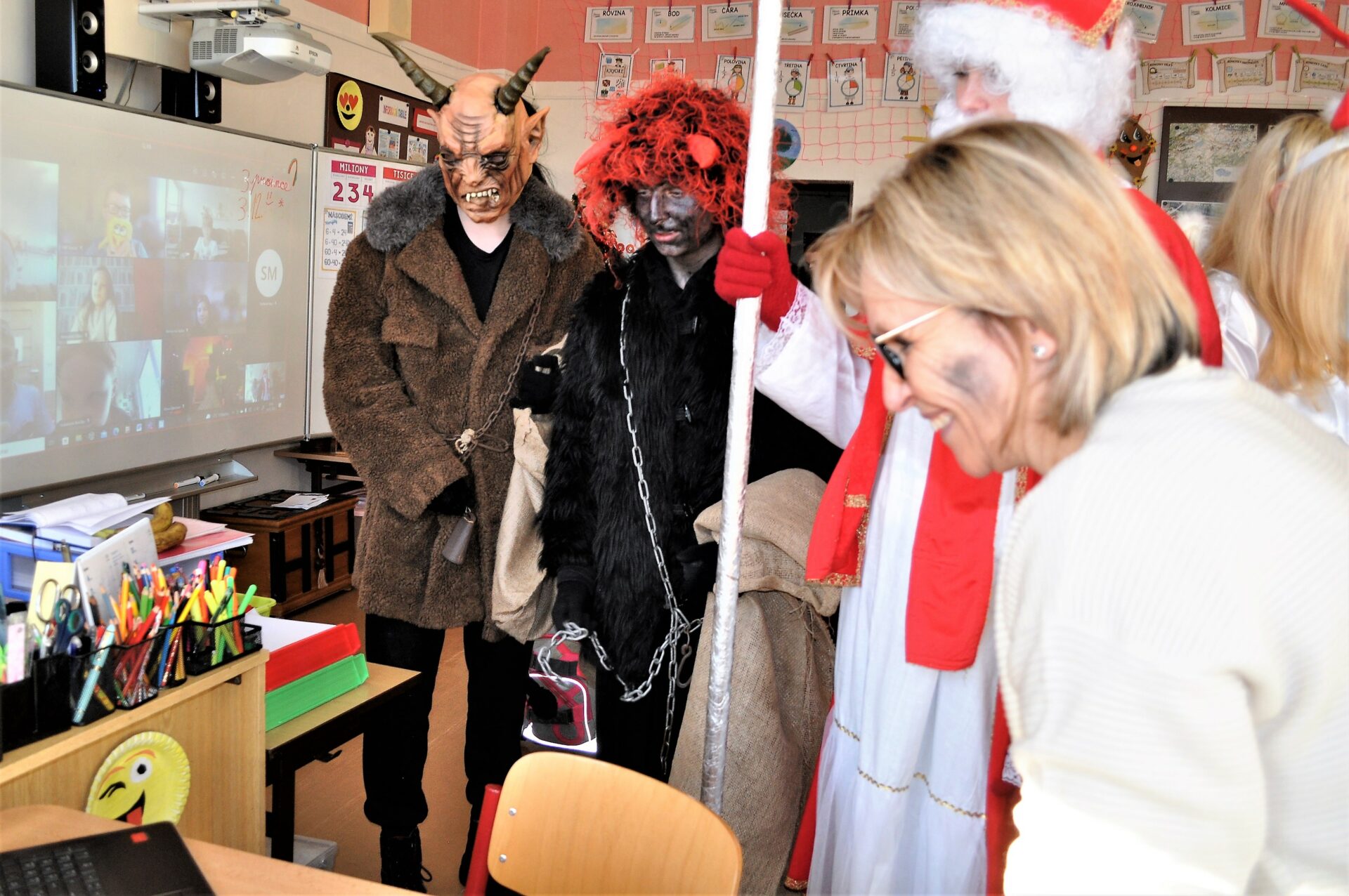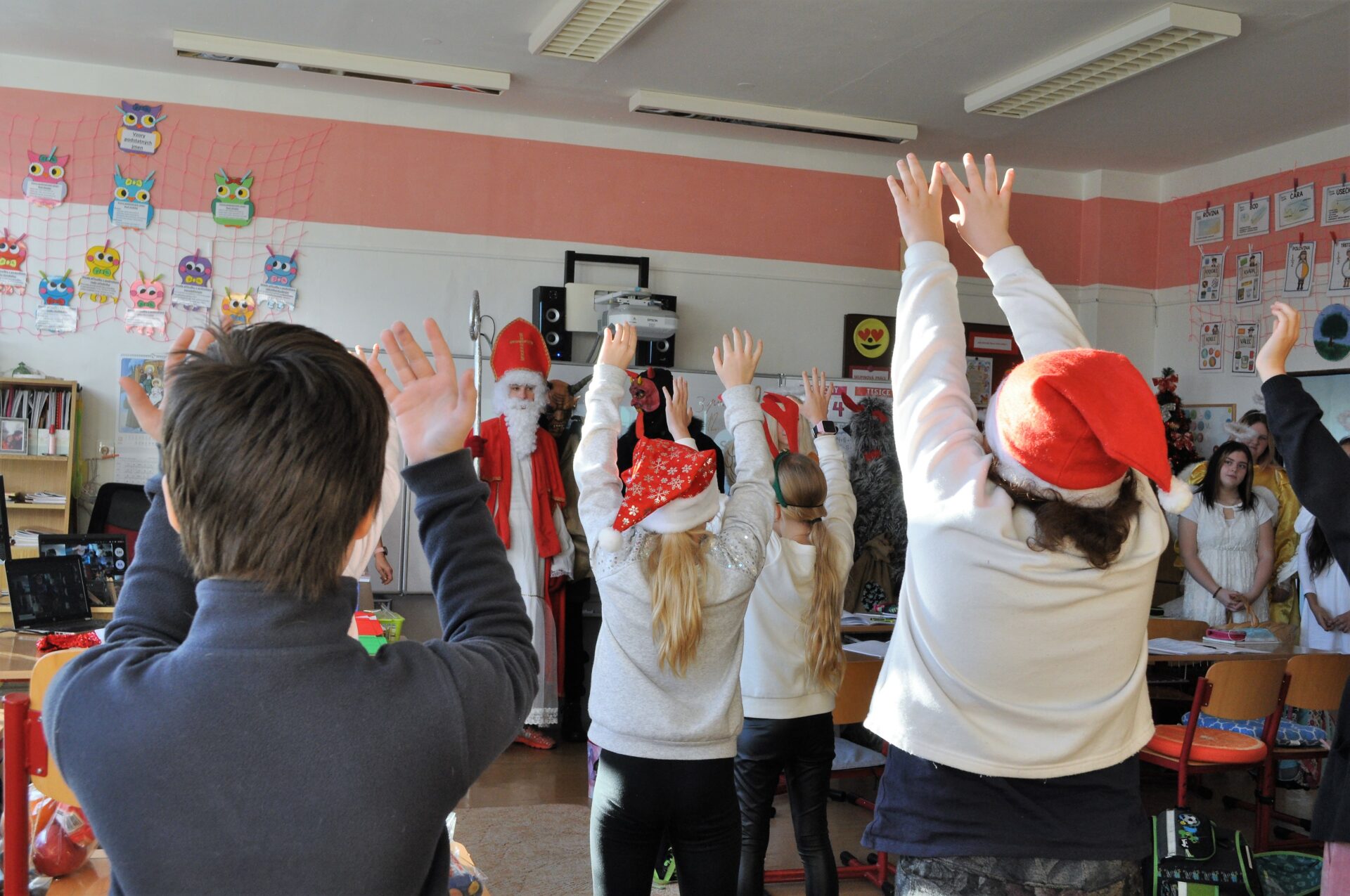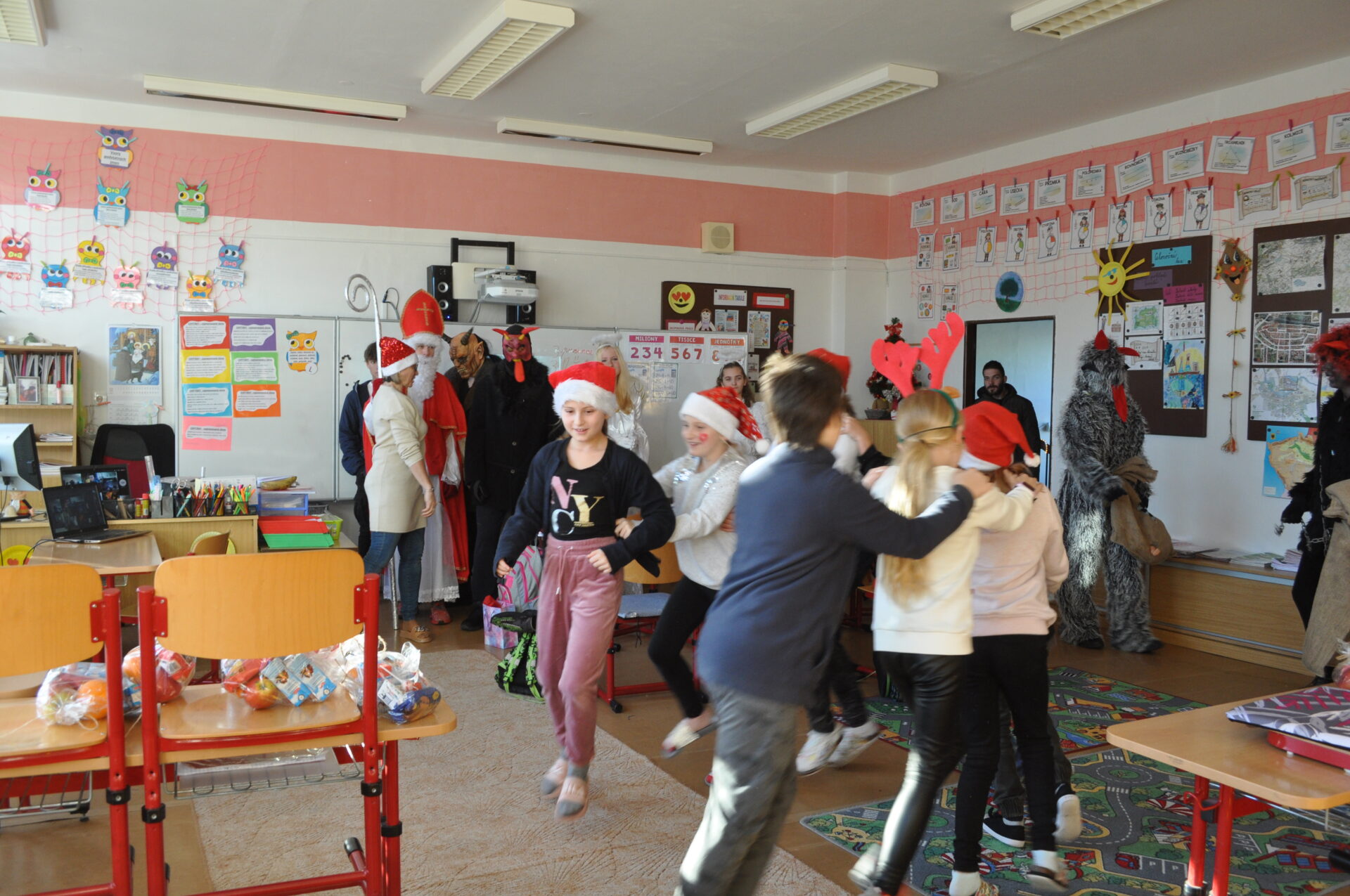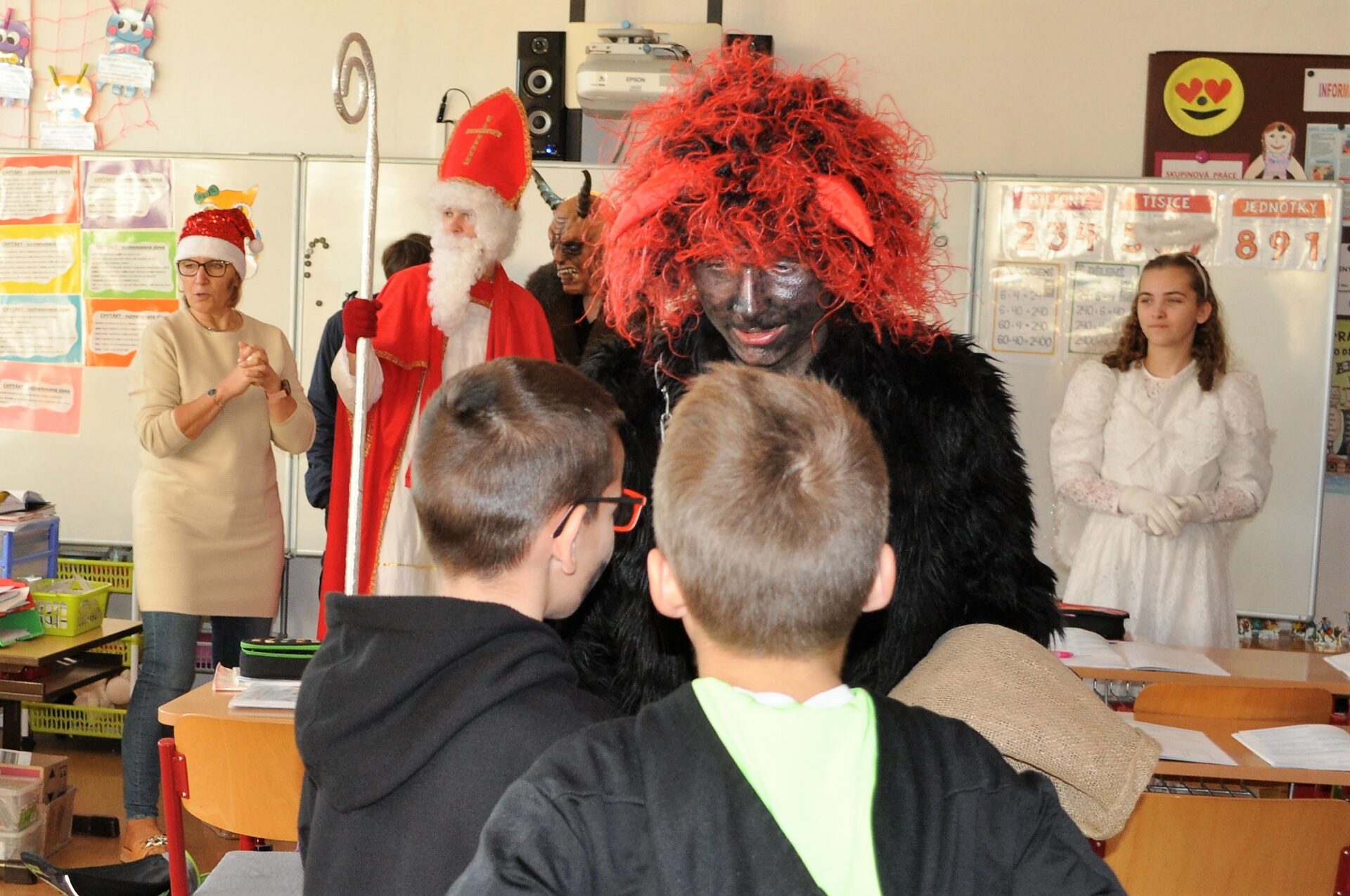 Letošní návštěva z nebe a z pekla zastihla naší třídu neúplnou. I když jsme si už jednou v tomto školním roce karanténou prošli, znovu jsou někteří naši spolužáci opět doma na online výuce. Návštěvu čertů, andělů a Mikuláše si však nenechali ujít. Mohli ji sledovat přes interaktivní tabuli. V něčem měli přeci jen výhodu. Pekelní čerti na ně nemohli, tak jako na nás. My jsme si však poradili. Předvedli jsme jim taneční ukázku na vánoční písničku a rázem byly všechny naše hříchy odpuštěny. Za odměnu jsme dostali od Mikuláše a andělů balíček dobrot. Žáci 4.B