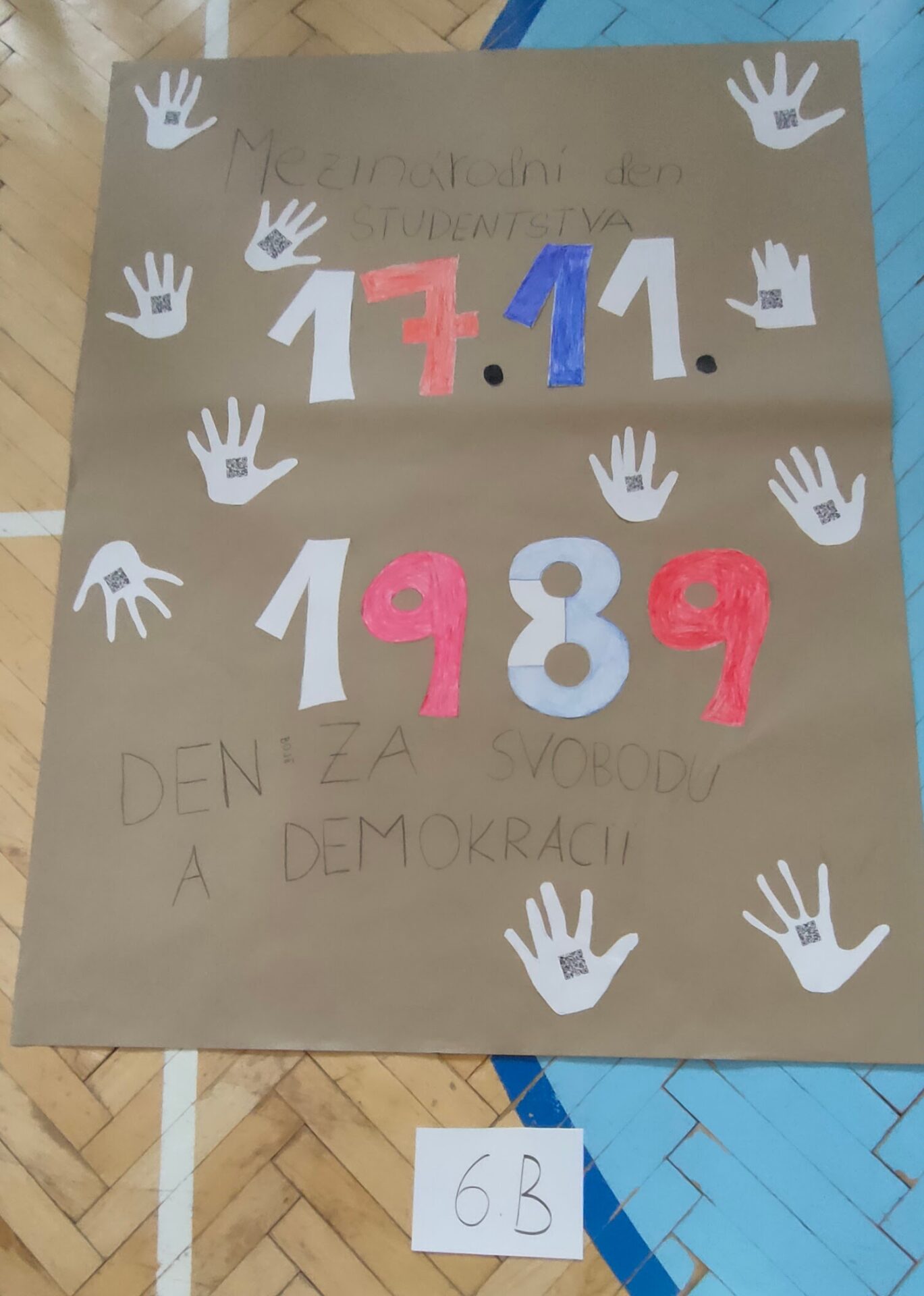 Datum 17. listopadu jsme si připomněli v rámci celoškolního projektového dne tvorbou a prezentací tematického plakátu, ve kterém jsme graficky zkombinovali rok 1939 a 1989. Pokusili jsme se náš výtvor originálně odlišit a zároveň rozvinout naše digitální kompetence tím, že jsme do plakátu zakomponovali element QR kódů, které odkazují na webové stránky popisující osudy jednotlivých obětí 17. listopadu.