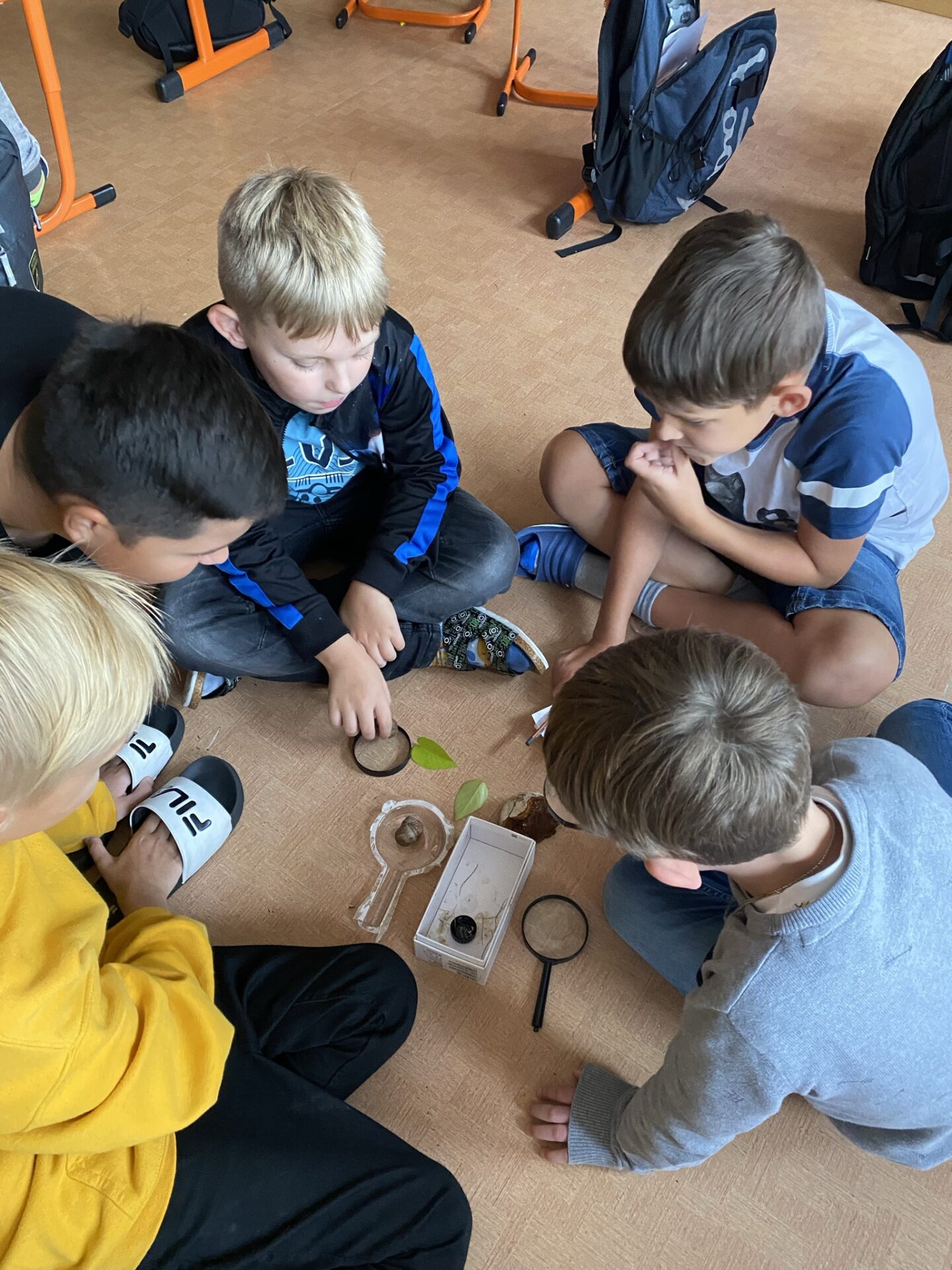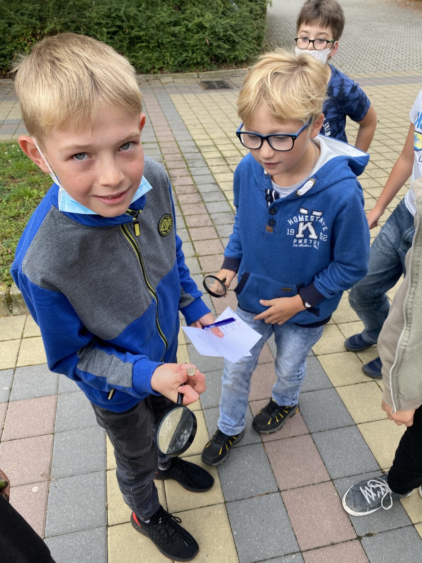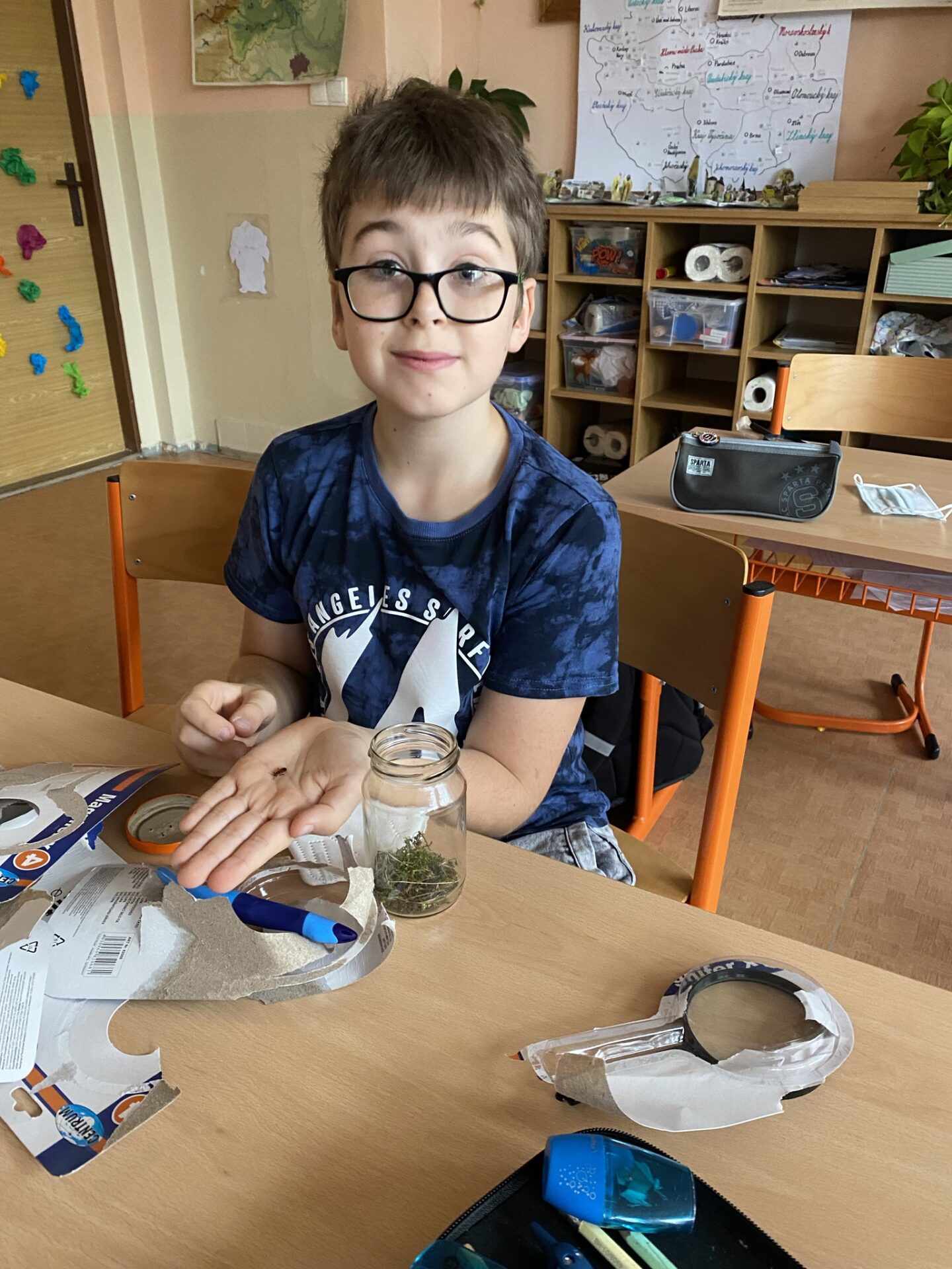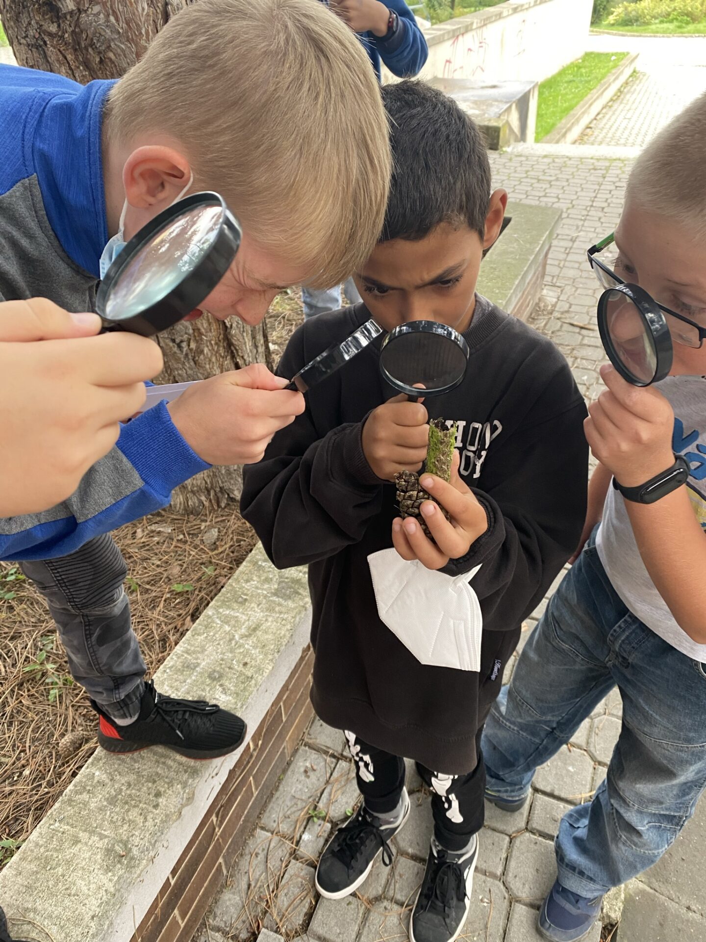 Škola zapůjčila každému žákovi lupu, tudíž jsme měli možnost prohlédnout si to naše okolí školy ještě víc z blízka. Žáky to velice bavilo a předháněli se, kdo najde větší zajímavost. Některé zástupce živé a neživé přírody jsme si vzali s sebou do třídy a budeme je podrobněji zkoumat v příštích hodinách.