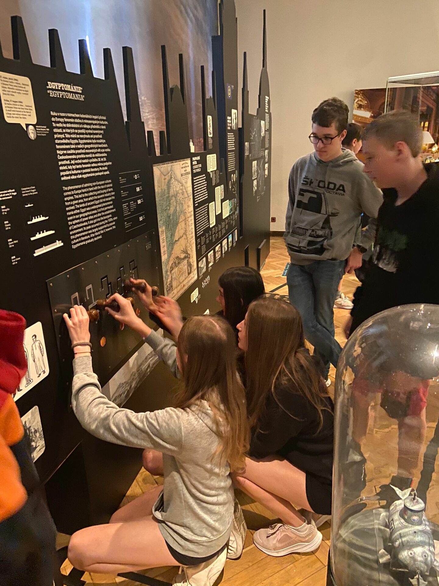 Ve čtvrtek 25. května jsme si přivstali, abychom ranním vlakem vyrazili ku Praze, kde nás čekala dlouho slibovaná návštěva Náprstkova muzea. Protože jsme den předem udělali důkladnou přípravu, věděli jsme, kam míříme i co nás tam čeká. Začali jsme u protinožců v Austrálii a Oceánii, pokračovali výpravami s Emilem Holubem (na kterého jsme mimochodem vzpomínali už při průjezdu vlaku Pátkem) do Afriky a nakonec nás okolo světa za 80 dní provedl nejenom Phileas Fogg. Cestu zpět k vlaku jsme si okořenili krátkým šmodrcháním se ve Starém městě, prošli několika průchody až jsme se objevili ve Františkánské zahradě, kterou řada z nás poznala, protože si ji pamatujeme z loňského školního výletu. Následující cesta zpět vlakem byla náročná, ale ve společnosti spolužáků zábavná a utíkající.