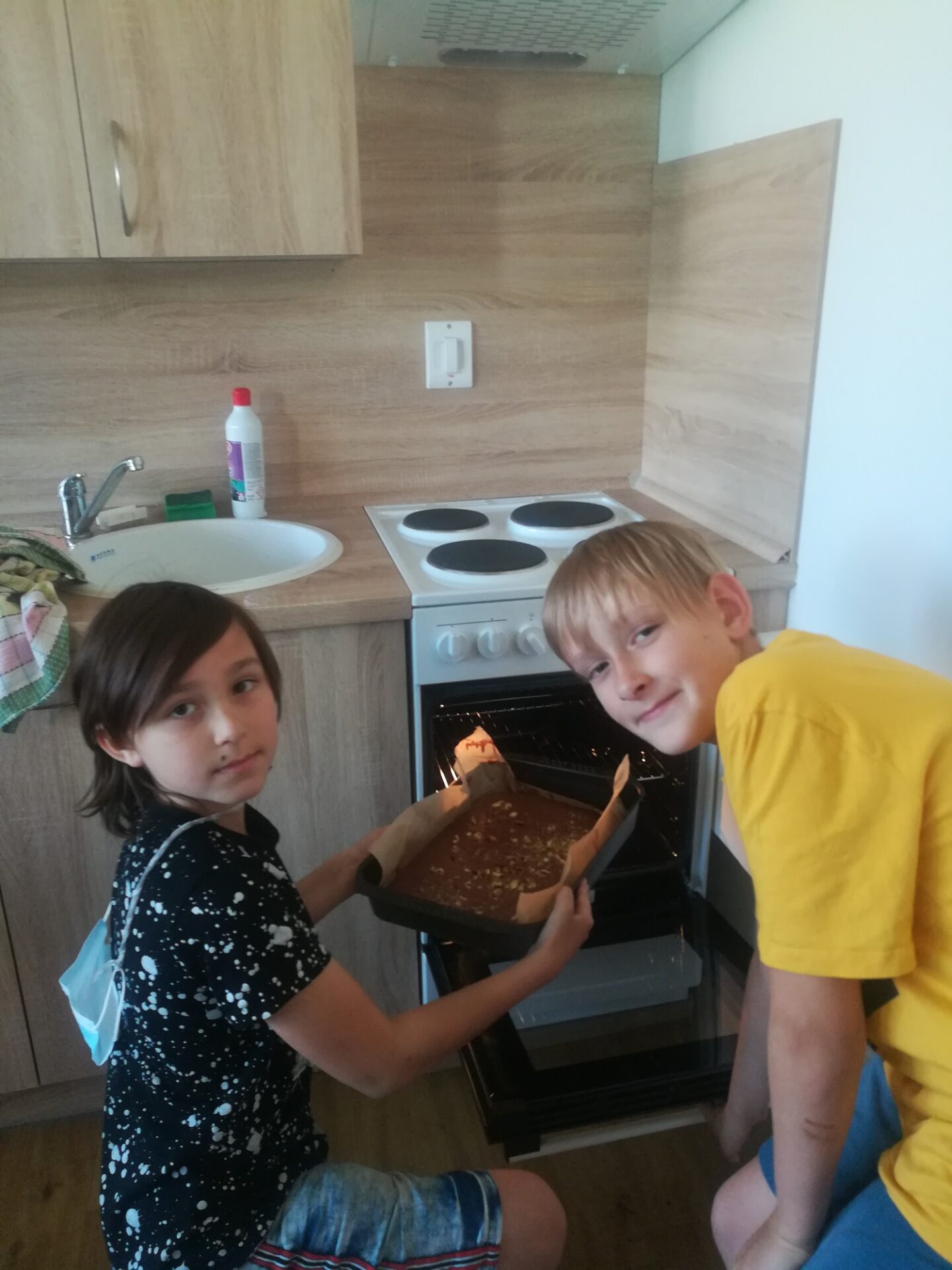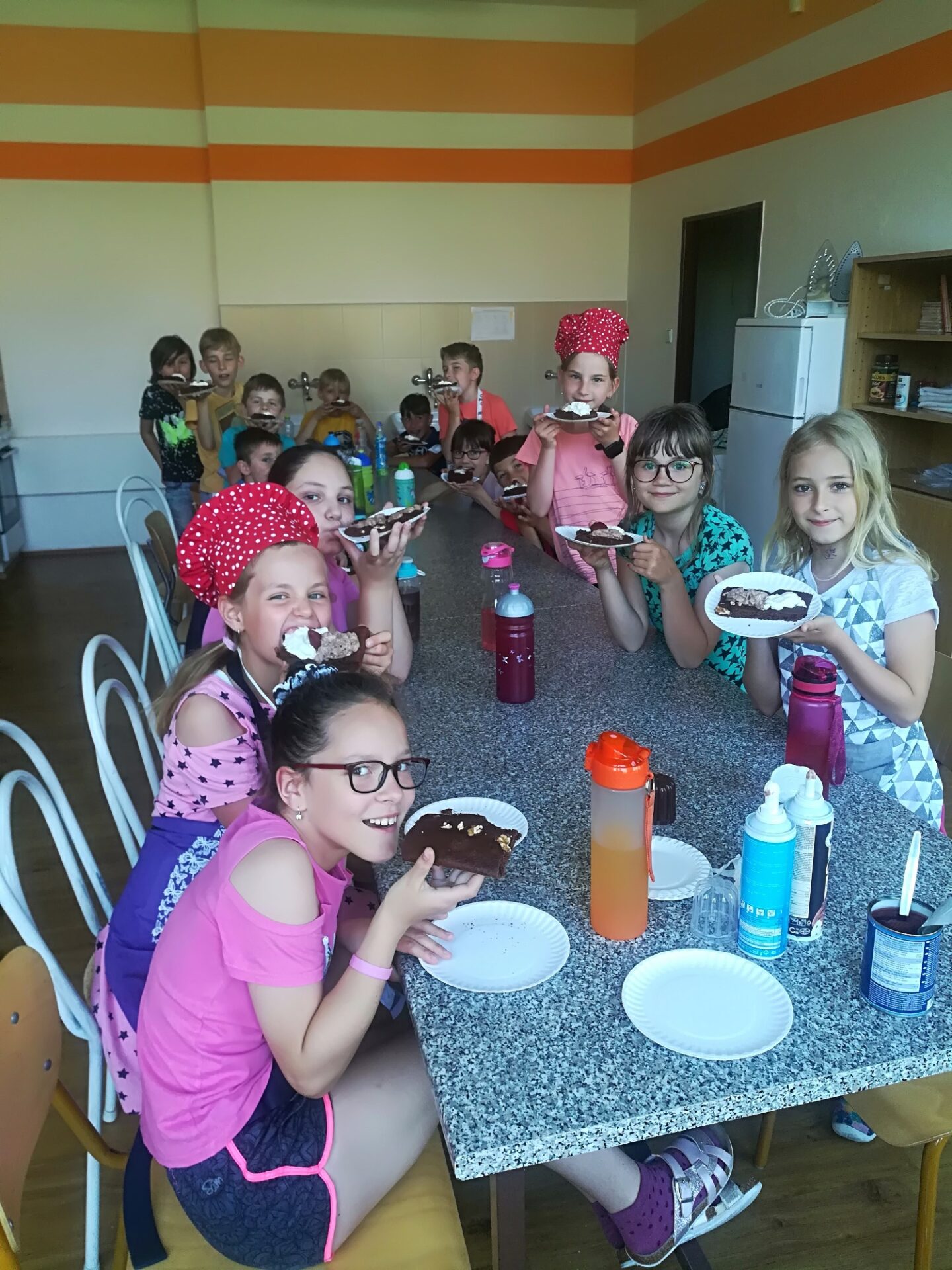 Na závěr školního roku si upekli sladkou tečku se šlehačkou a jahodami. Všem moc chutnalo. Práce v nové školní kuchyňce jde od ruky.