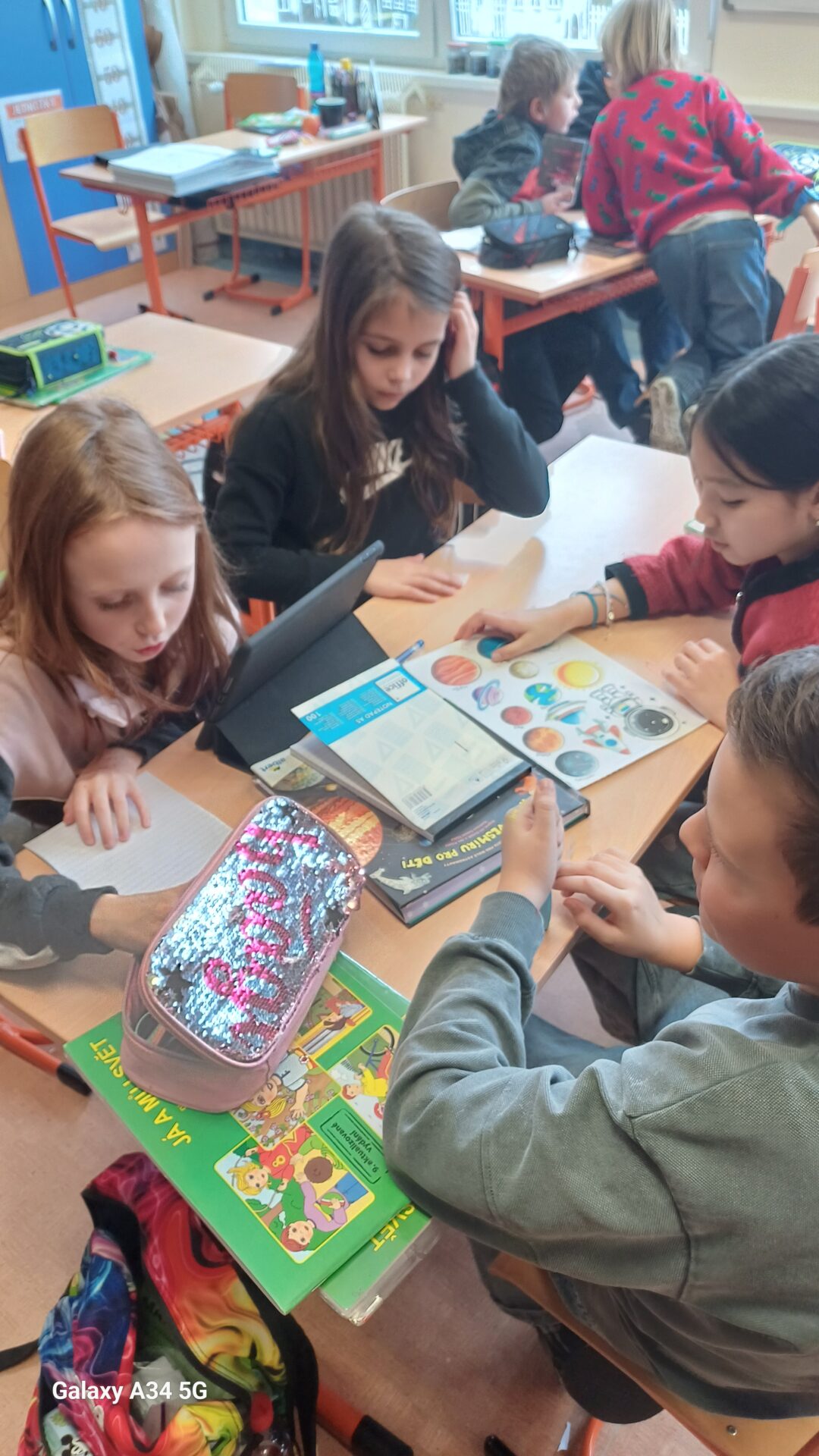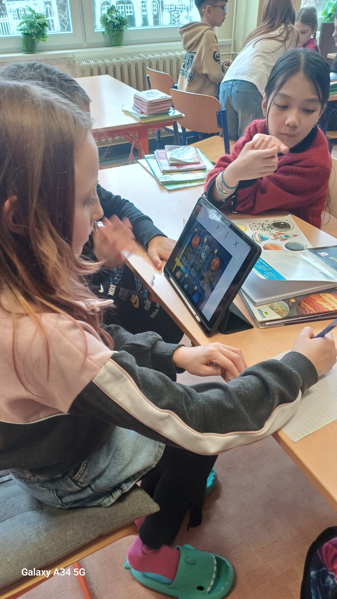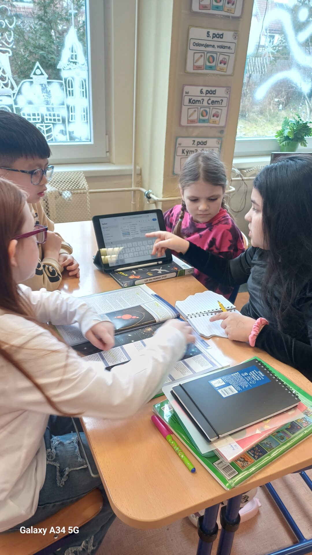 Celý měsíc únor jsme v hodinách prvouky získávali poznatky o vesmíru a planetách, které tvoří Sluneční soustavu. Informace jsme vyhledávali nejen na internetu, ale také v různých naučných knihách a časopisech, které jsme si přinesli. Každá skupina měla vyhledat podle zadaných otázek informace o jedné planetě a vytvořit tak zajímavy referát. Téma Vesmír a Sluneční soustava jsme propojili v rámci mezipředmětových vztahů i do dalších hodin. Například ve výtvarné výchově a pracovních činnostech jsme vytvořili zajímavé koláže. Žáci 3.B