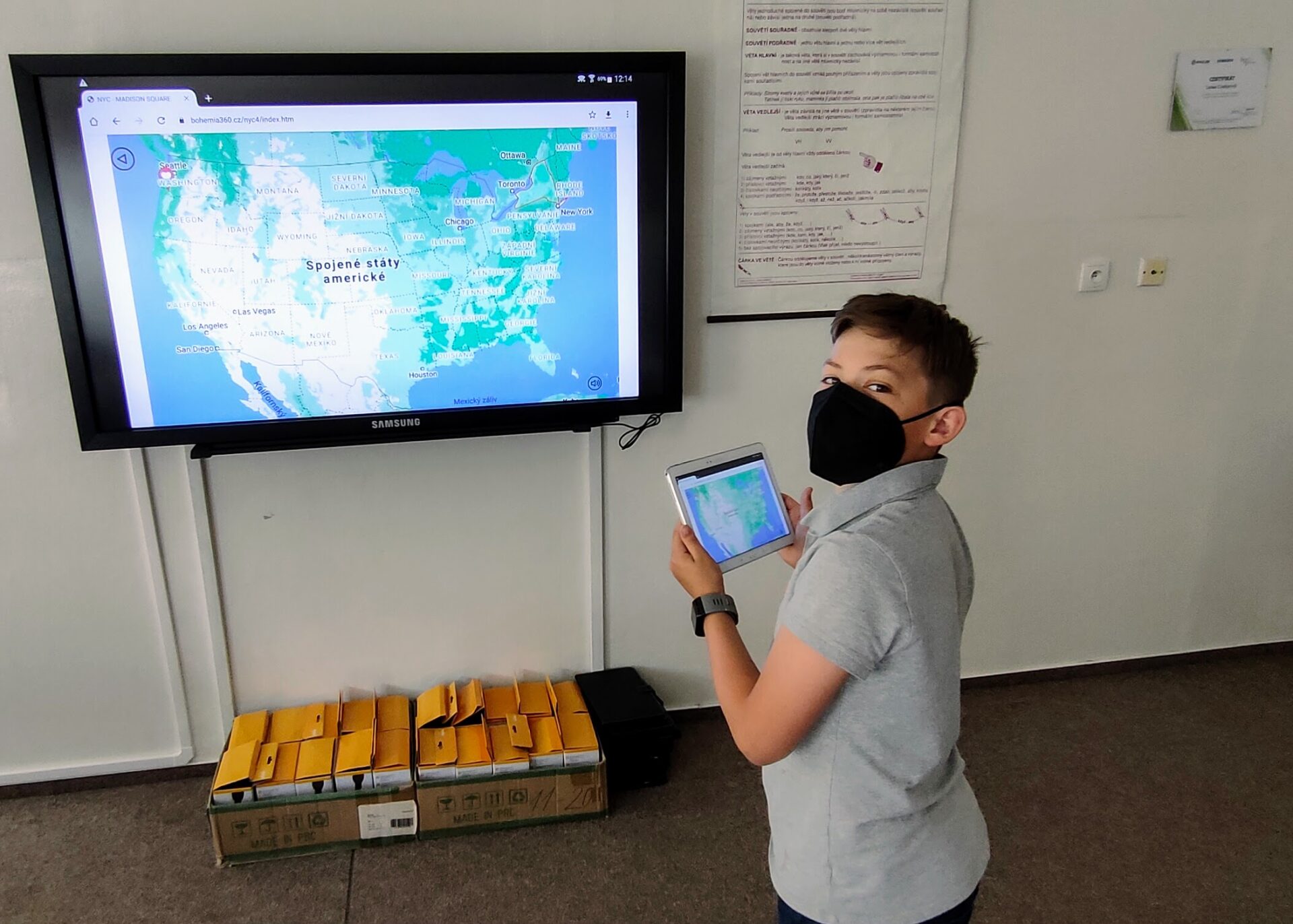 Hodiny AJ na 8.ZŠ jsou často zpestřovány multimediálními aktivitami jako je tato skupinová 360° virtuální prohlídka Manhattanu ve městě New York. Žáci, vybaveni školními tablety, společně prozkoumávají významné pamětihodnosti velkoměsta, zatímco pan učitel dává úkoly, instrukce nebo popisuje Spojené státy, ve kterých strávil nemalou část svého života.