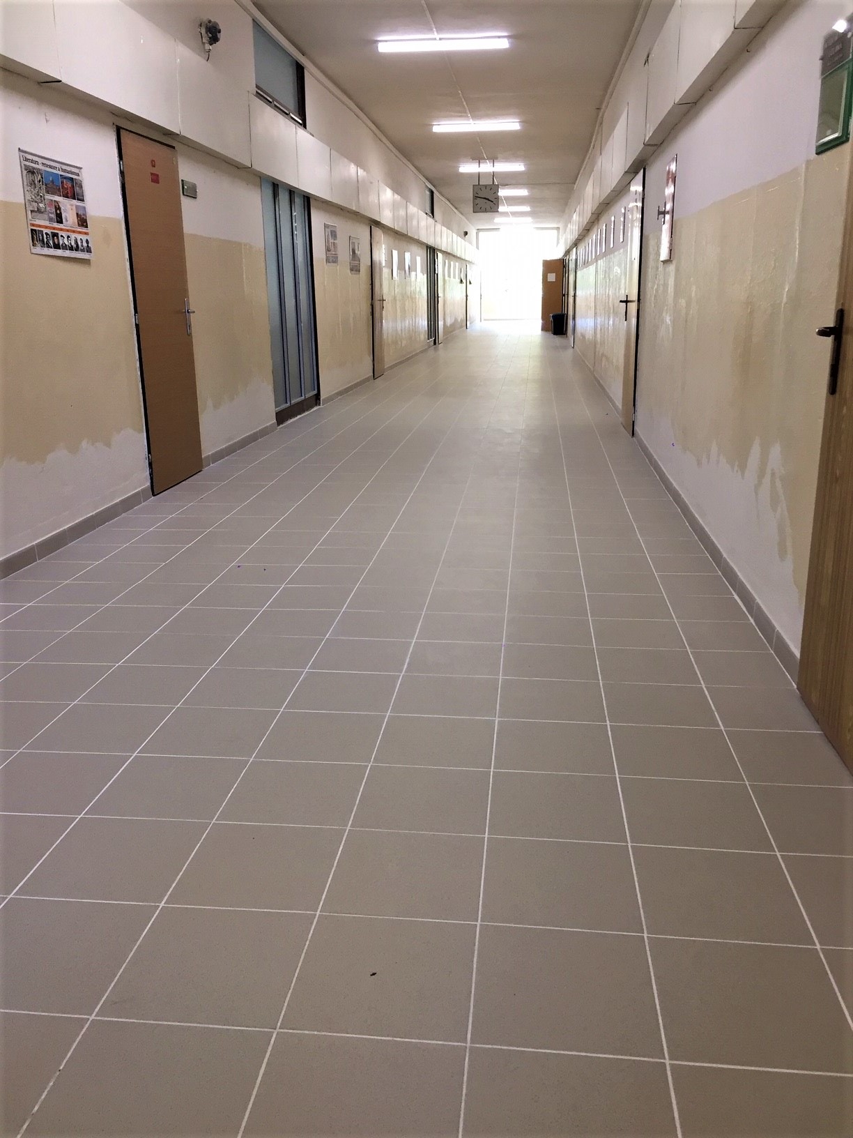 Během prázdnin proběhla v naší škole rekonstrukce podlah chodeb učebního pavilonu a spojovací chodby. Staré lino se všemi záplatami bylo strženo a místo něj nyní září nová dlažba. Ještě nám zbývá vymalovat chodby, ale škola je už nyní o velký kus hezčí. Poděkování patří městu Louny.