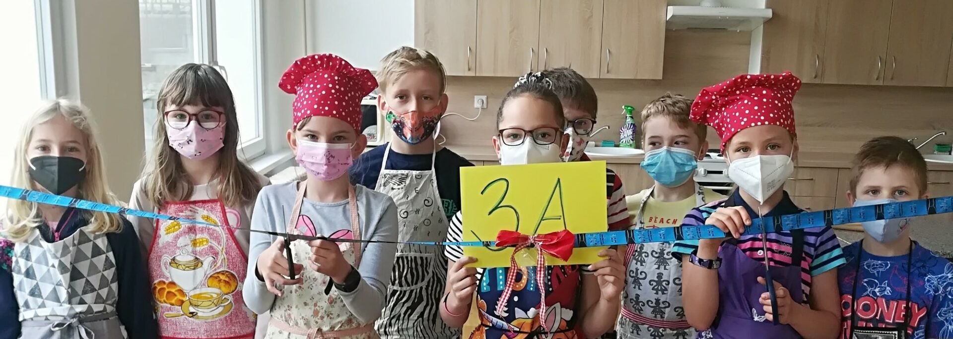 Žáci 3. A byli první, kdo vařil v naší nové cvičné kuchyňce. A tak se stříhala slavnostně páska. Vaření jsme zahájili pizzou, nejoblíbenějším jídlem našich třeťáčků.