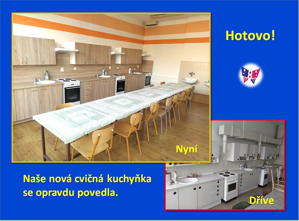 Dokončili jsme rekonstrukci cvičné žákovské kuchyňky. Vaření patří mezi oblíbené činnosti dětí, proto jsme rádi, že jim můžeme nabídnout krásné a čisté prostředí včetně nového vybavení. To staré už opravdu potřebovalo vyměnit. Děkujeme našemu sponzorovi firmě LN-AUDIT, která stála na začátku celé akce, když nám poskytla finanční prostředky na nákup nového vybavení. Řekli jsme si, že když nové vybavení, tak jedině do nového. A pustili jsme se do toho. Jak se Vám nová kuchyňka líbí?
