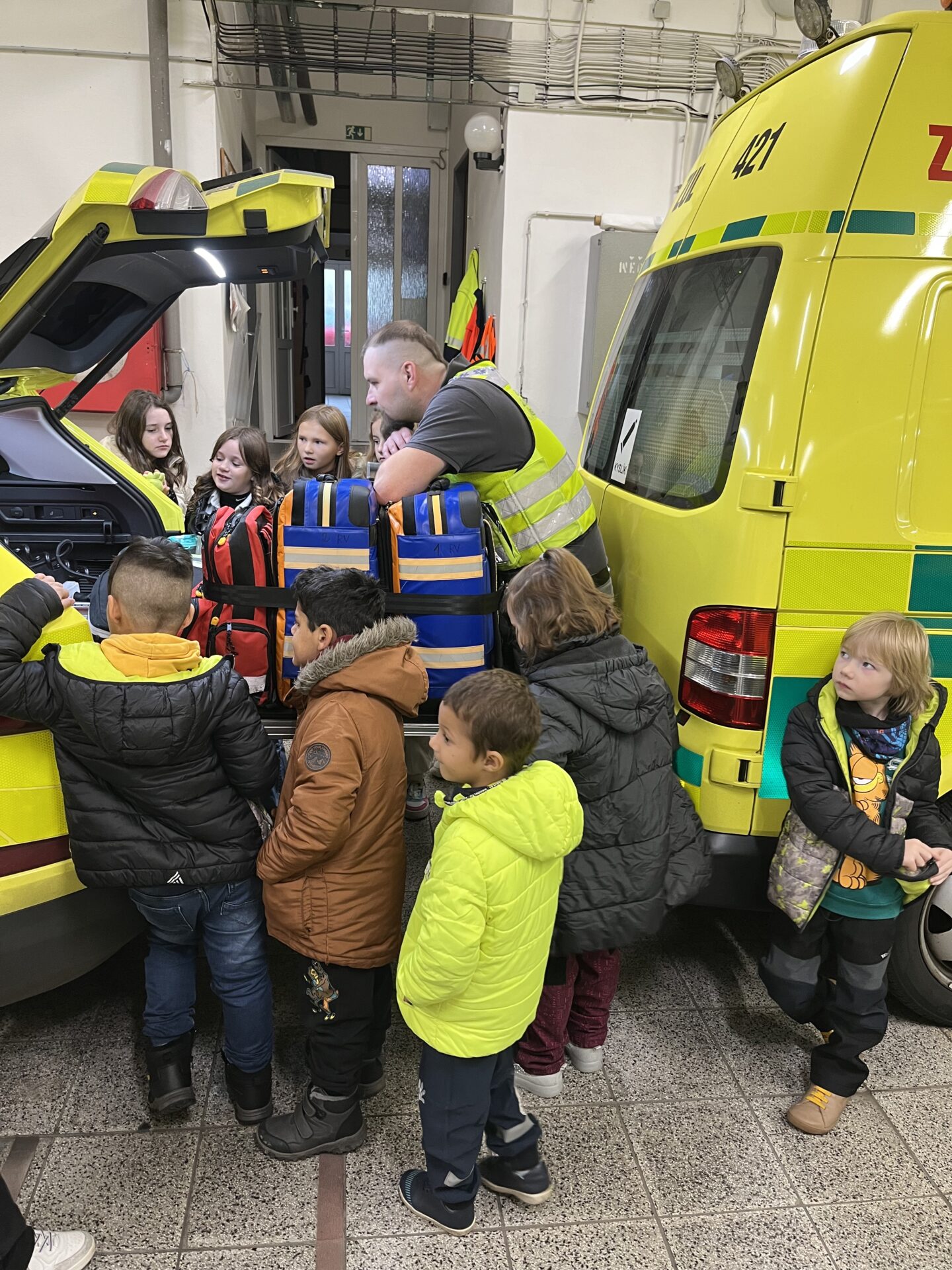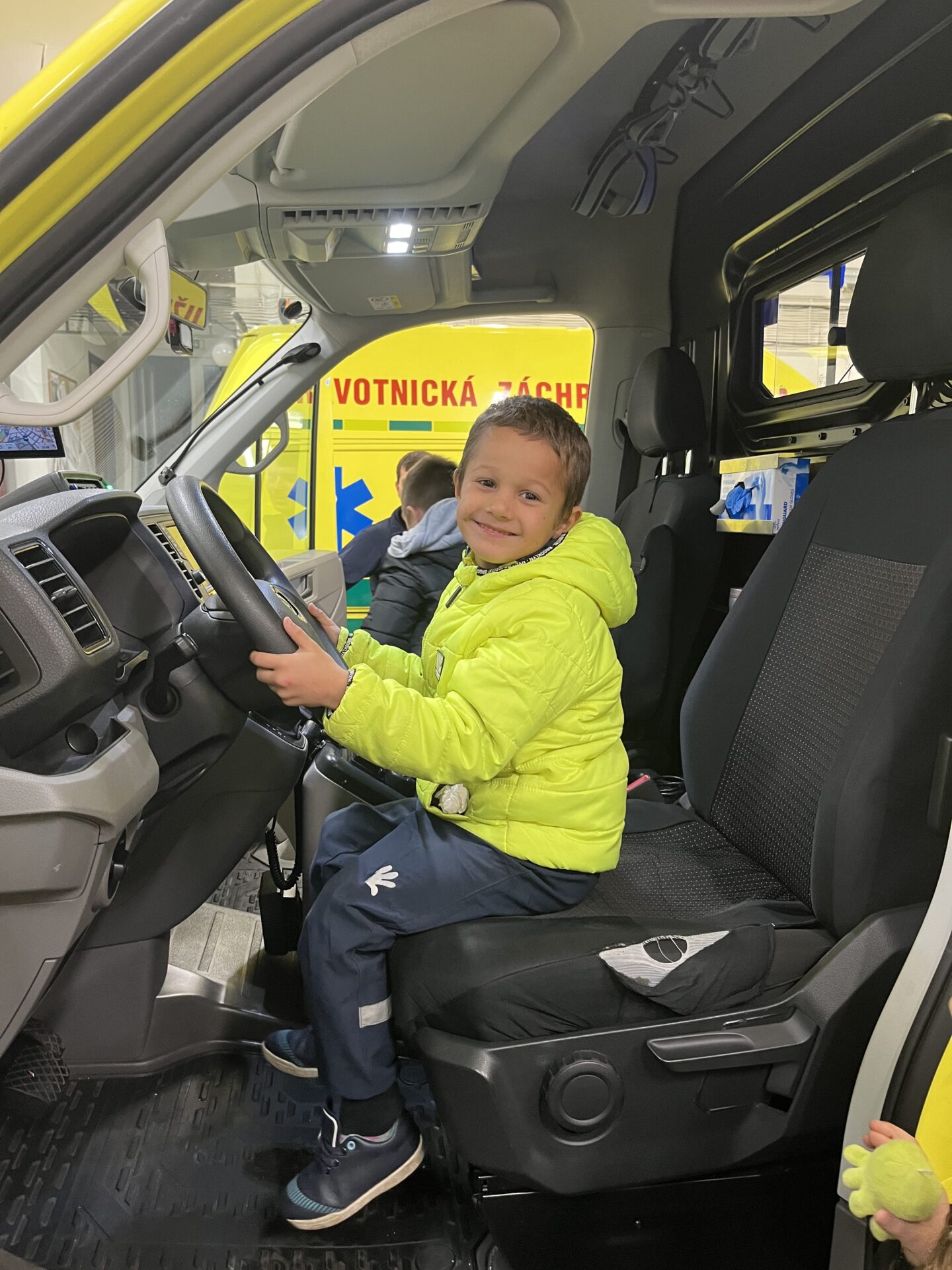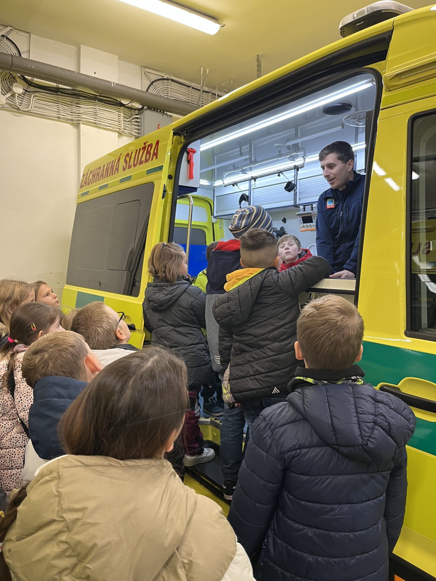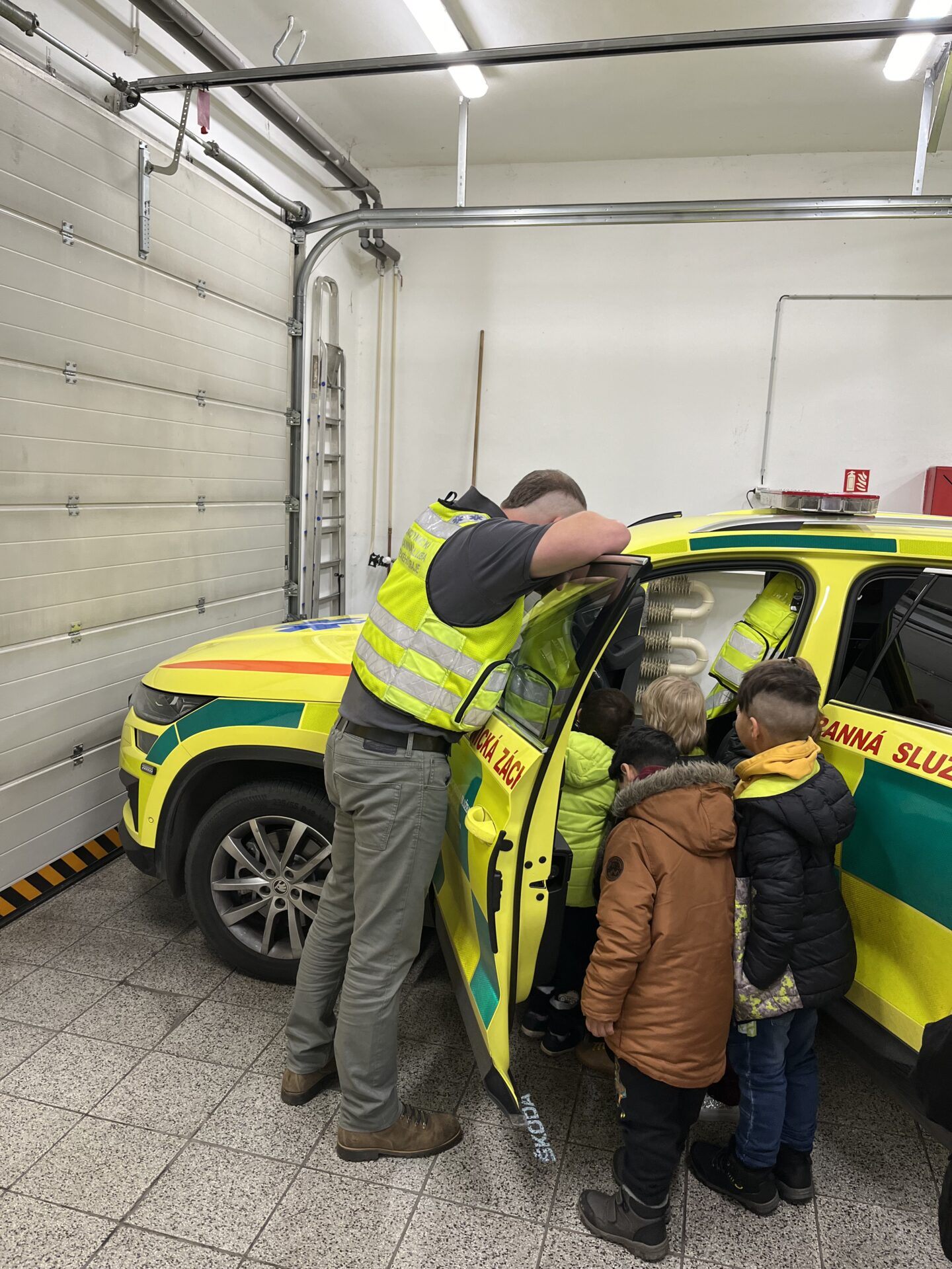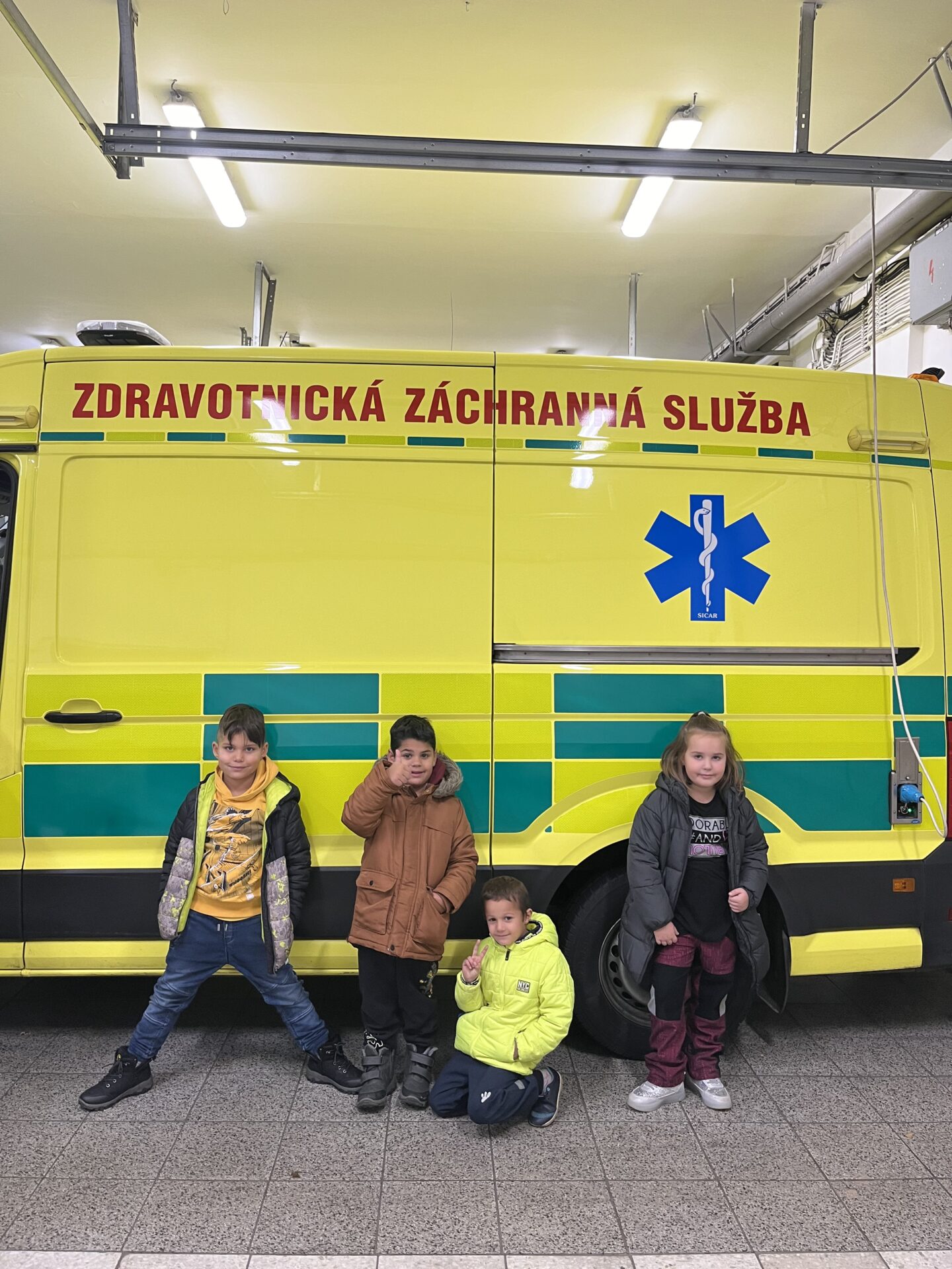 Druhý den jsme zavítali na stanici záchranné služby.🚑 Děti si prohlédly záchranářská auta, posadily se na místo řidiče a s nadšením se svezly na záchranářském vozíku. Nechybělo ani napínavé sledování skutečného výjezdu sanitky. Pan záchranář navíc dětem poutavě vyprávěl o své práci a odpovídal na jejich otázky.