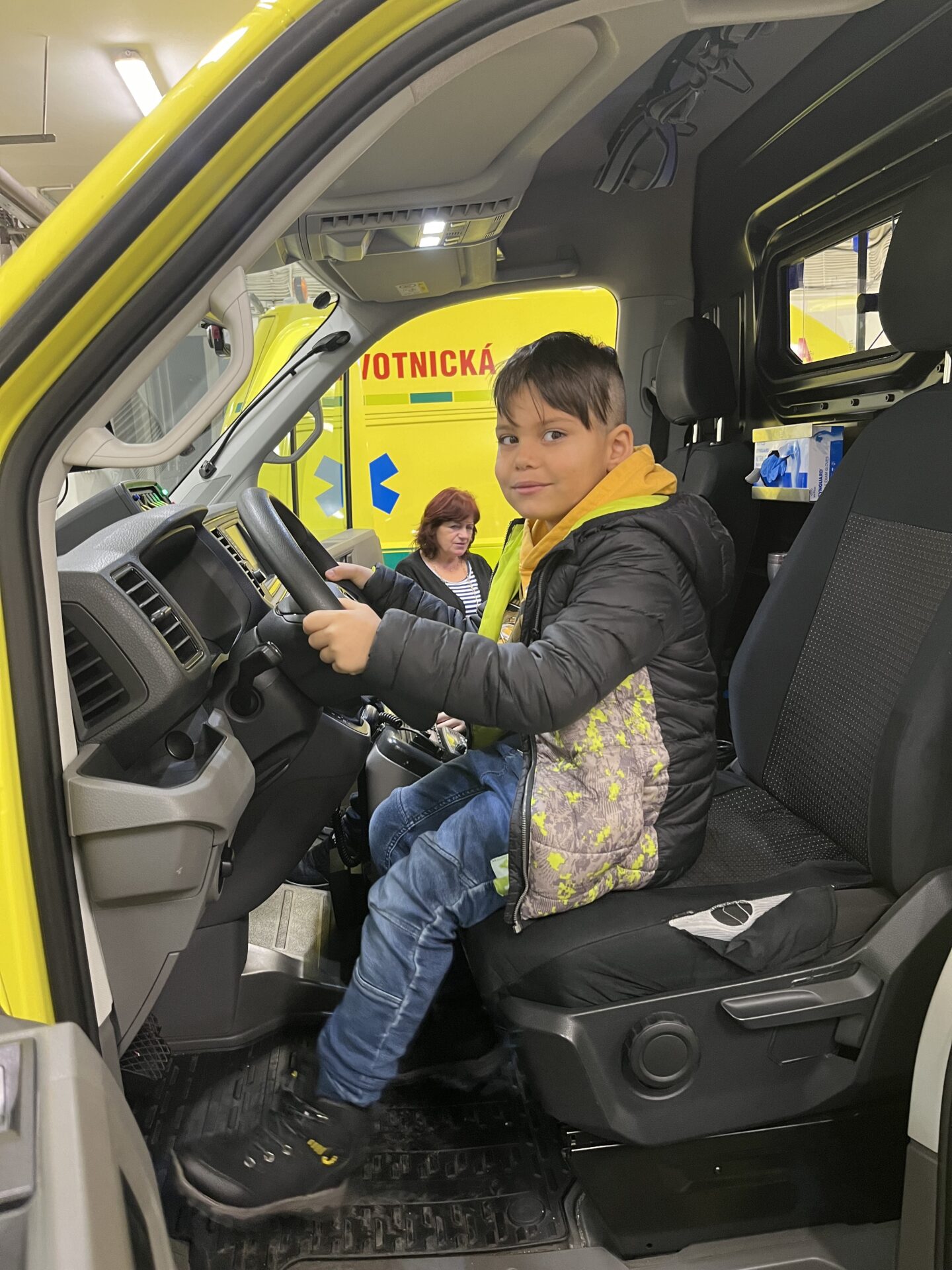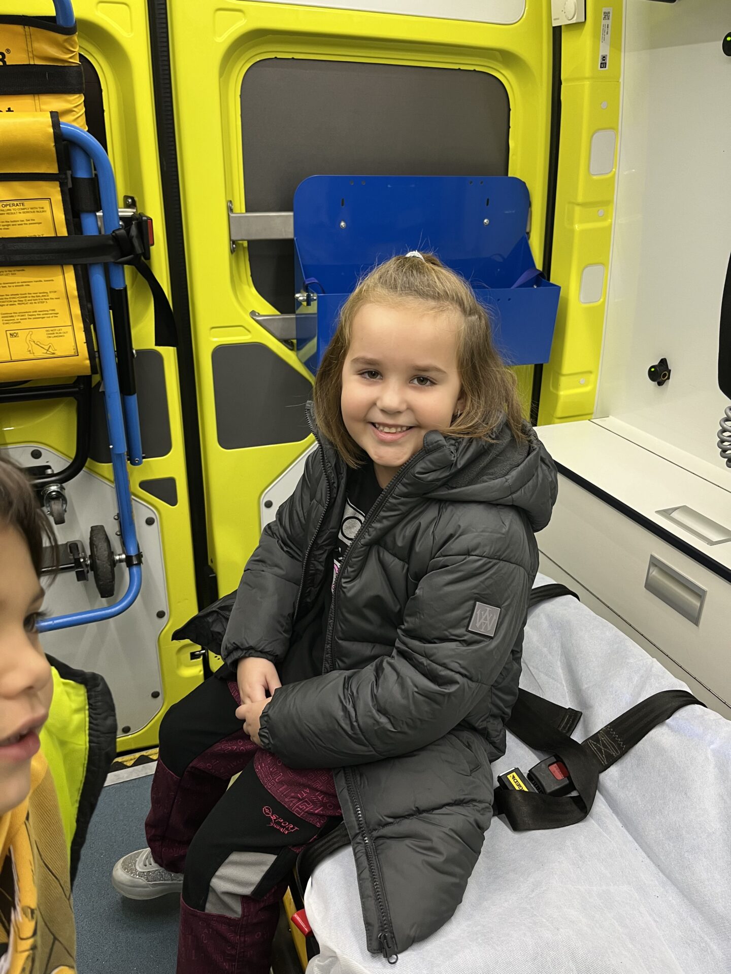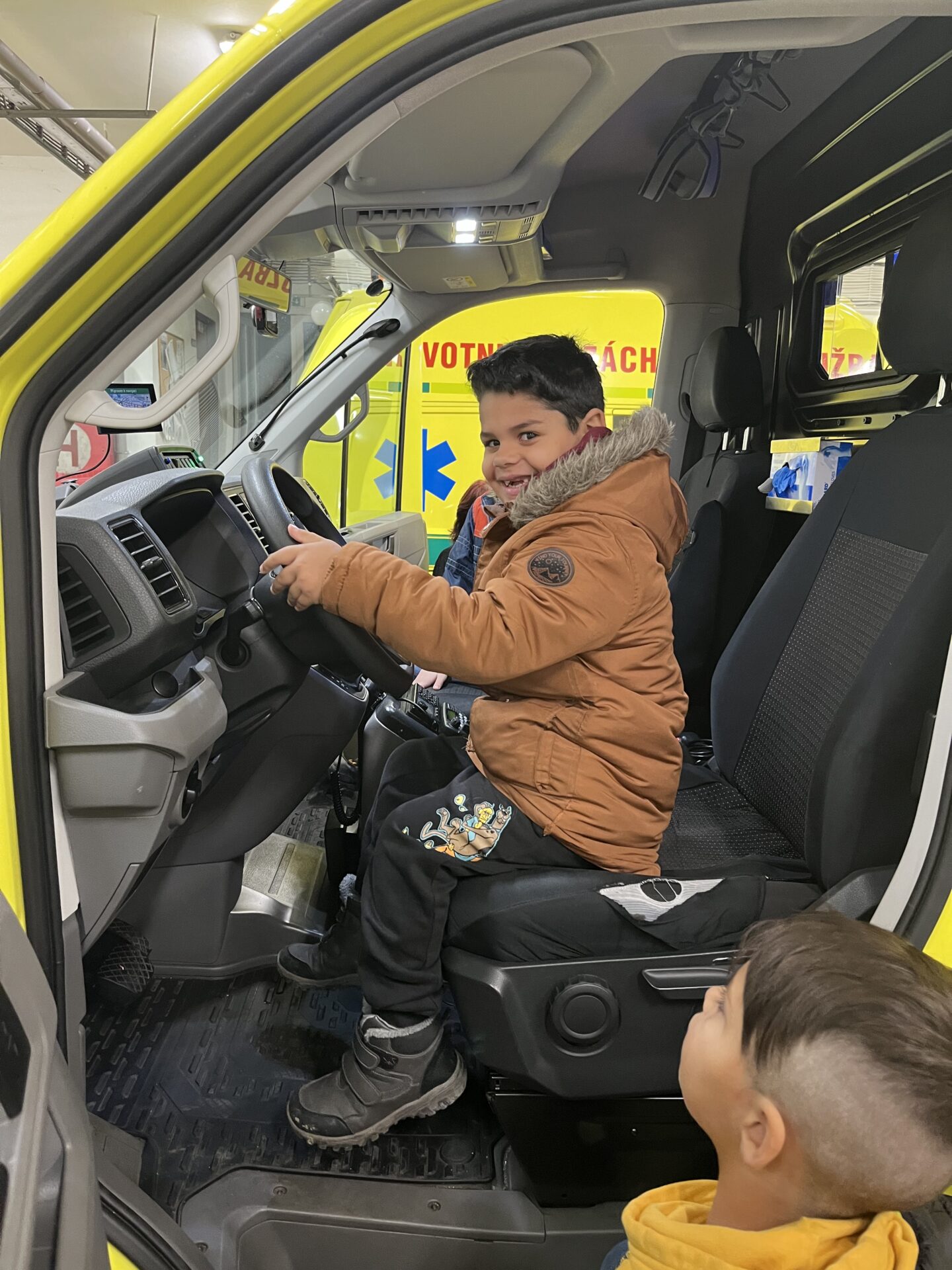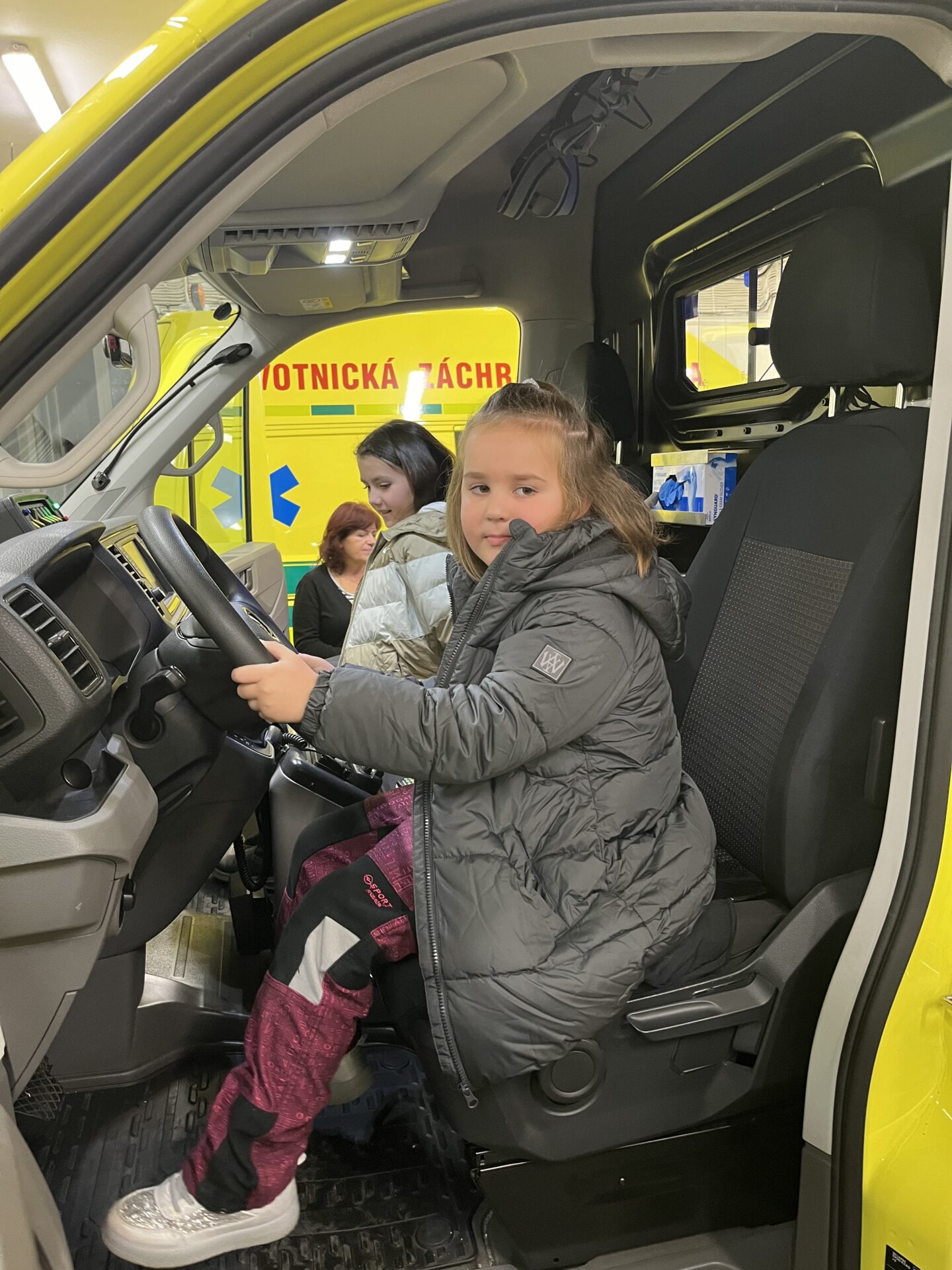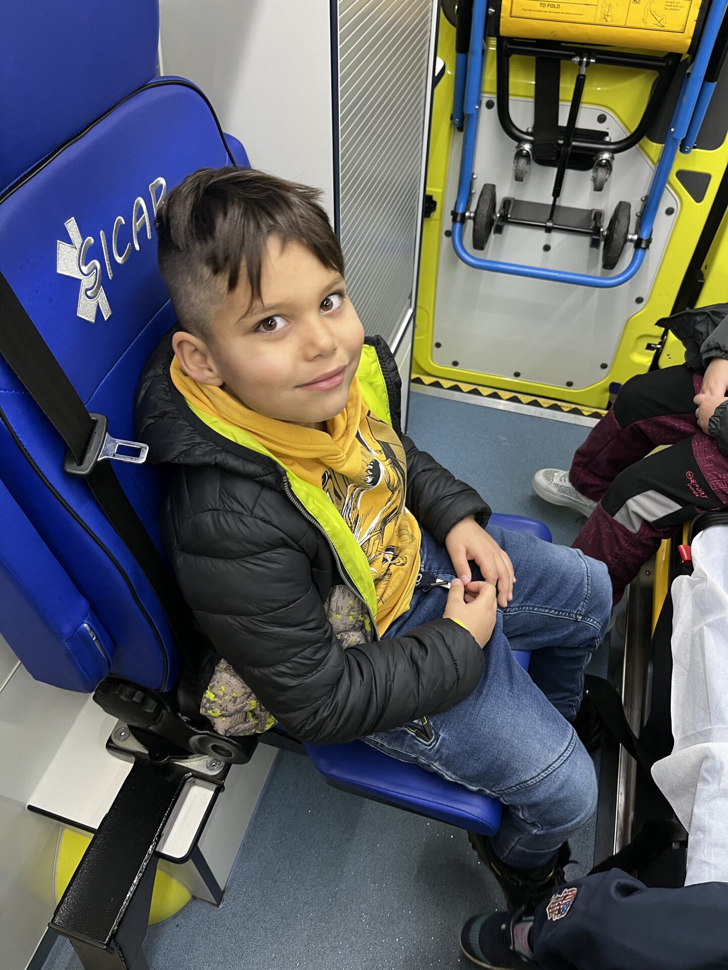 Druhý den jsme zavítali na stanici záchranné služby.🚑 Děti si prohlédly záchranářská auta, posadily se na místo řidiče a s nadšením se svezly na záchranářském vozíku. Nechybělo ani napínavé sledování skutečného výjezdu sanitky. Pan záchranář navíc dětem poutavě vyprávěl o své práci a odpovídal na jejich otázky.