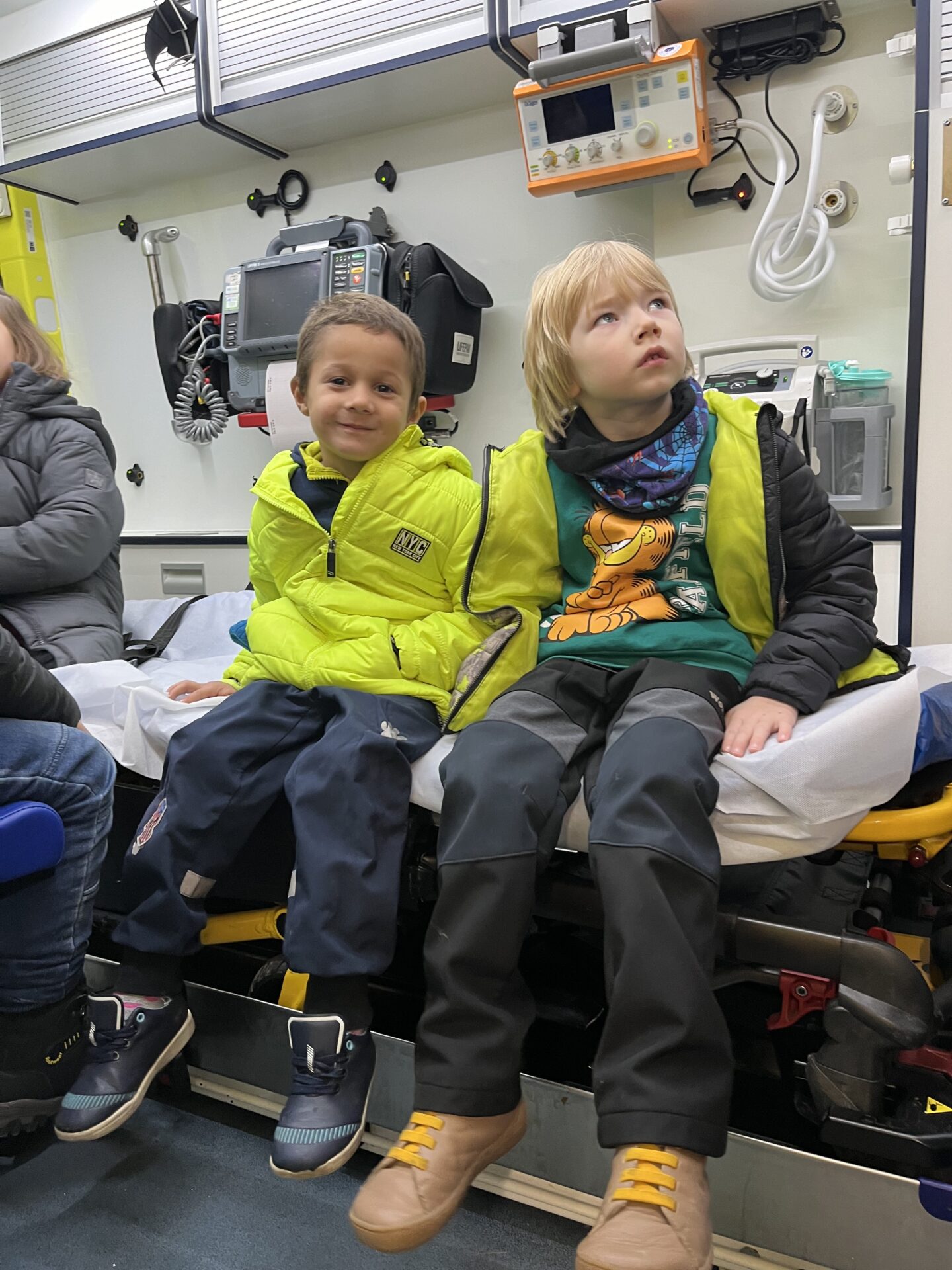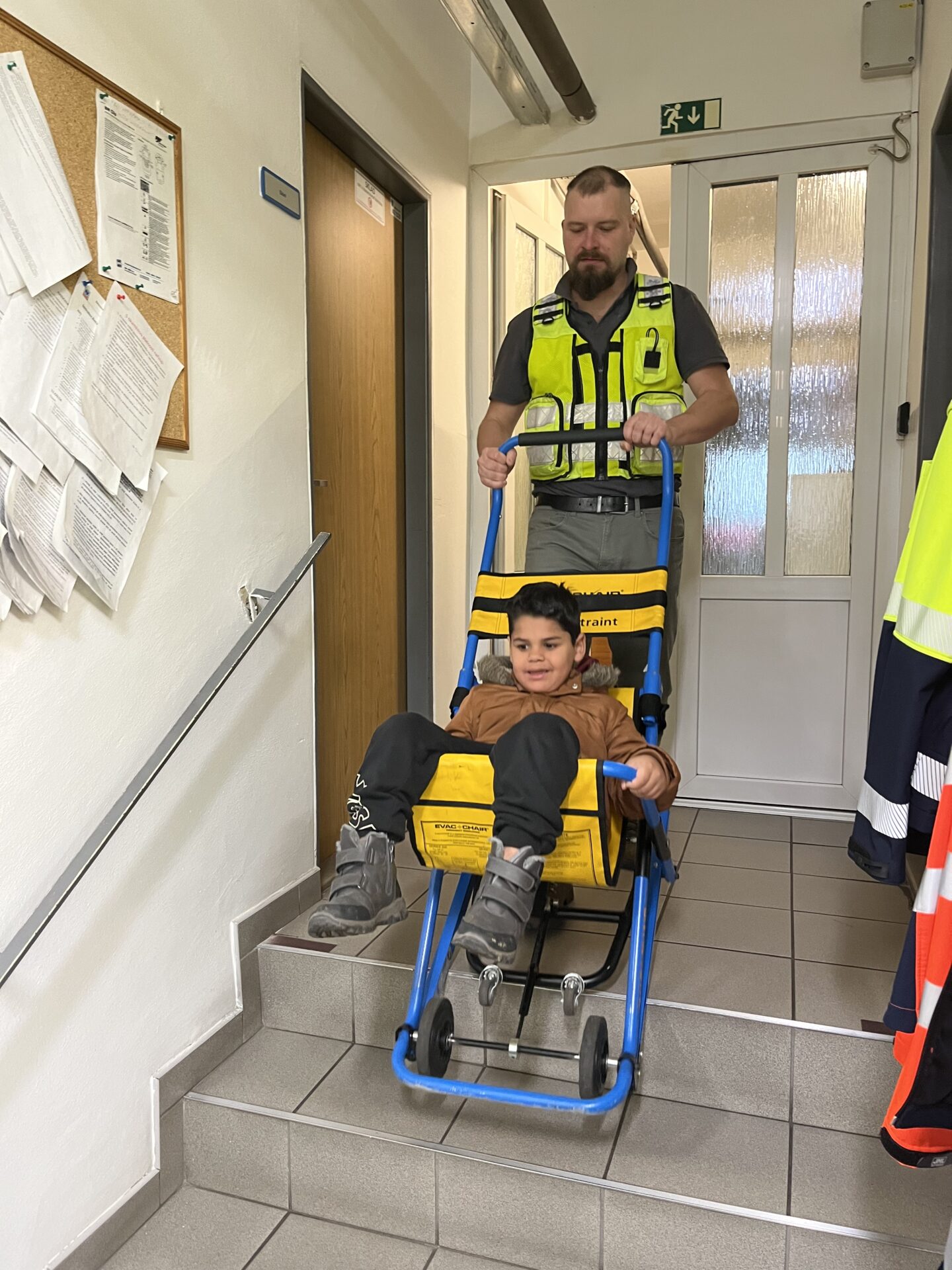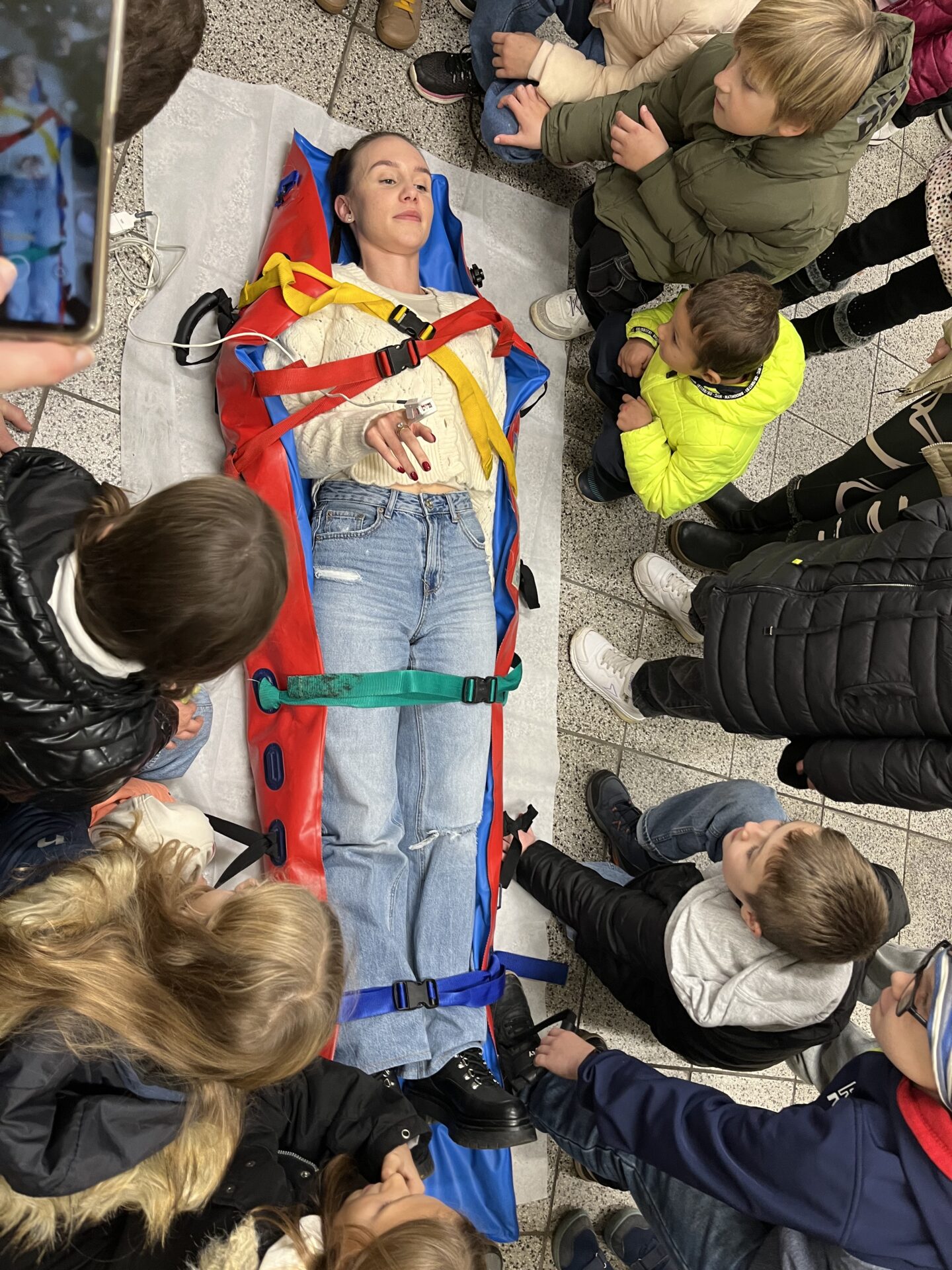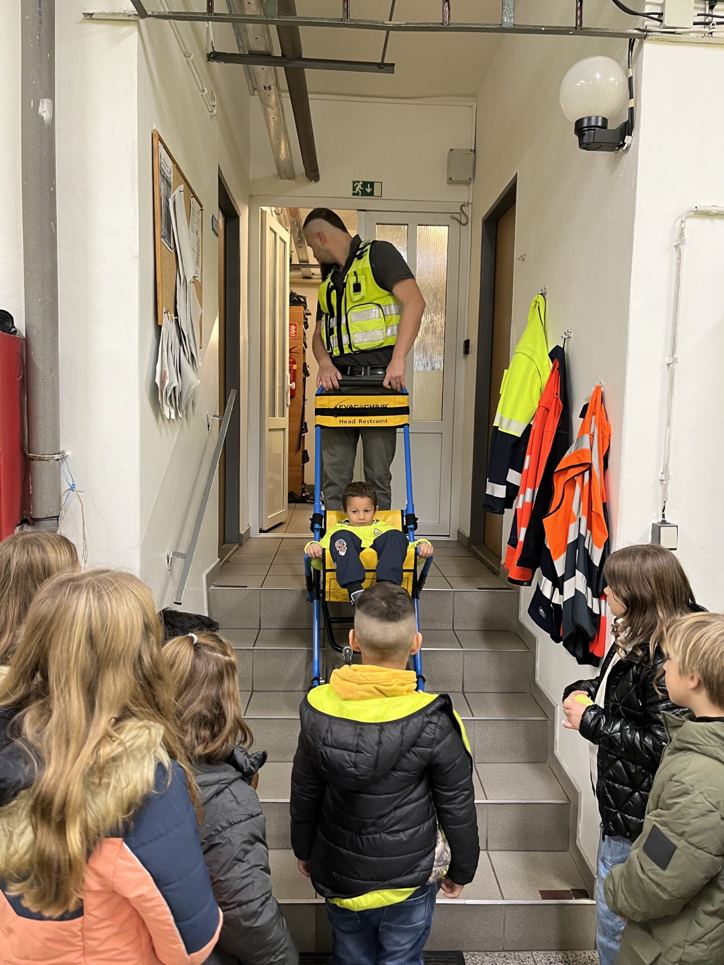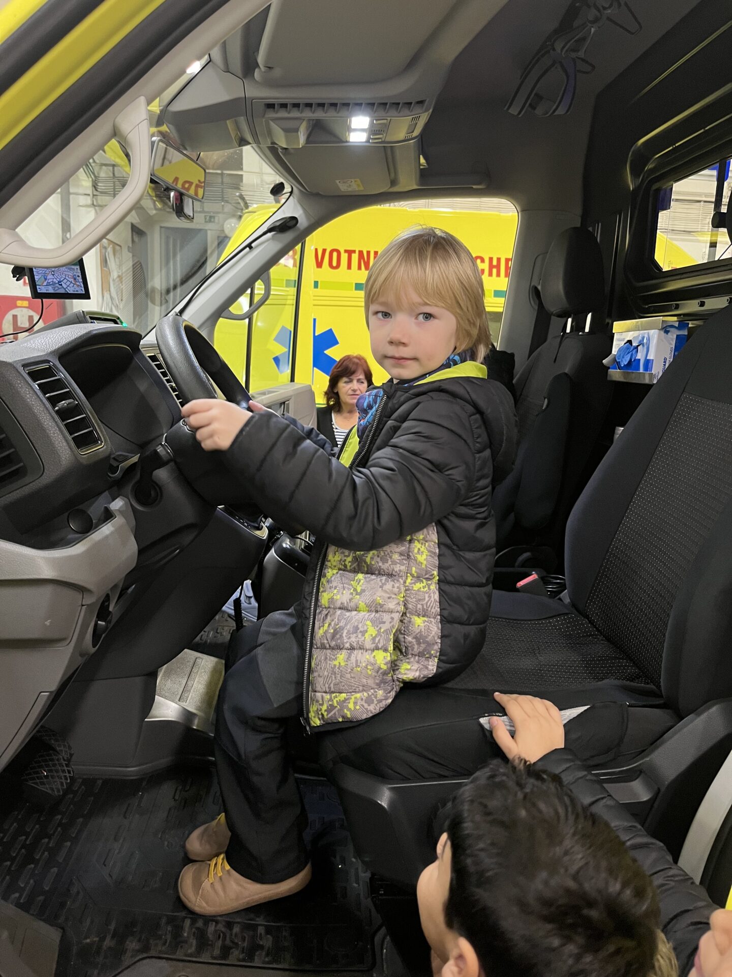 Druhý den jsme zavítali na stanici záchranné služby.🚑 Děti si prohlédly záchranářská auta, posadily se na místo řidiče a s nadšením se svezly na záchranářském vozíku. Nechybělo ani napínavé sledování skutečného výjezdu sanitky. Pan záchranář navíc dětem poutavě vyprávěl o své práci a odpovídal na jejich otázky.