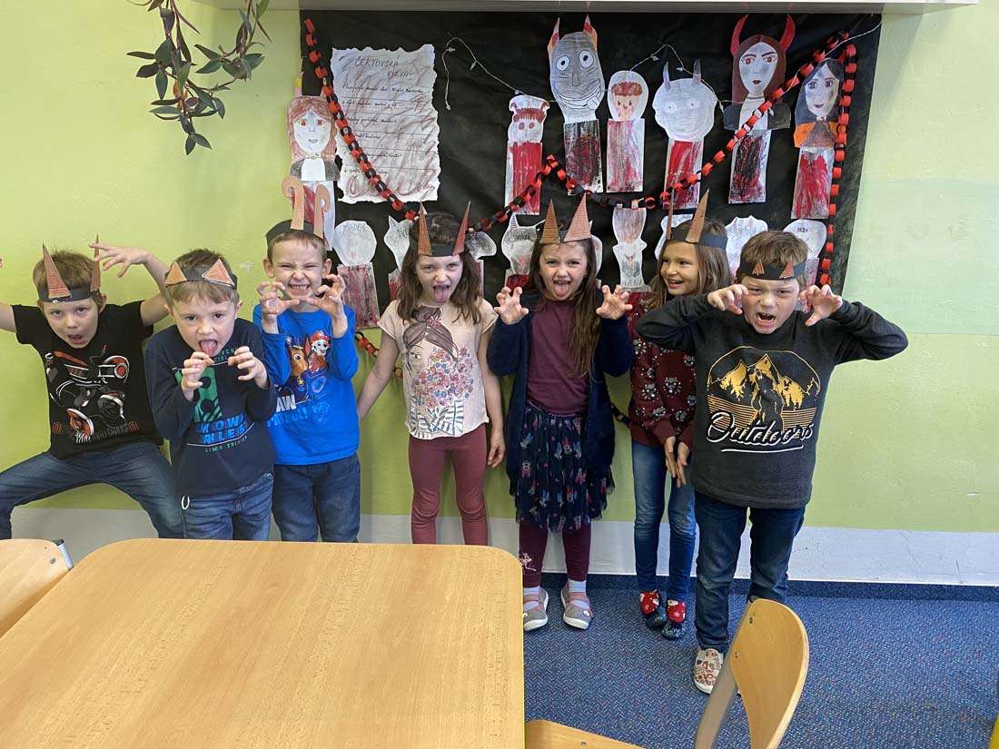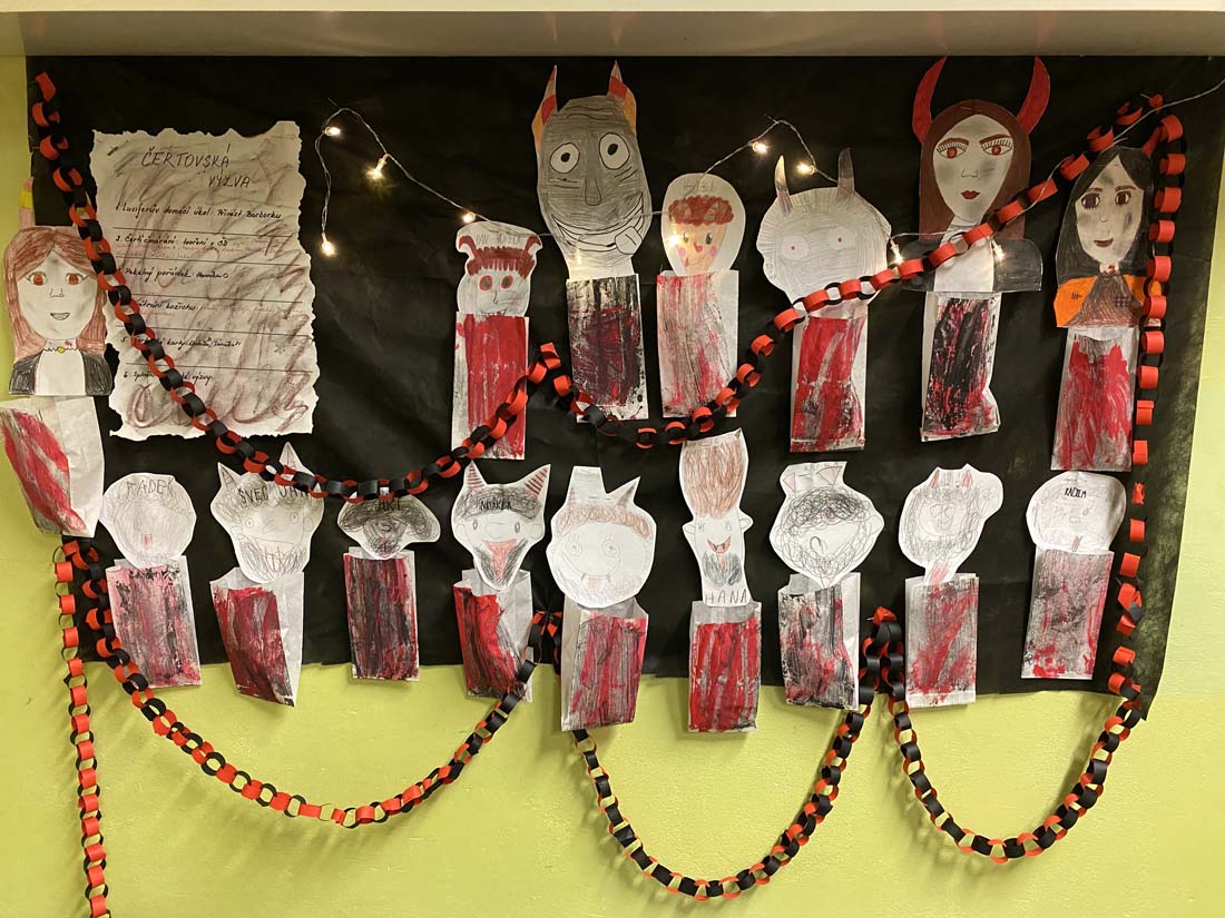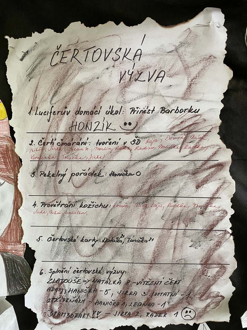Tento týden jsme měli pekelnou družinu a družinoví čertíci v týdenní výzvě plnili různé disciplíny: Luciferův domácí úkol, Čertovské čmárání, Provětrání kožichu, Pekelný pořádek, Čertovské karty. Každý čert byl po zásluze odměněn pekelnými penězi: „Zlatoušemi nebo bramboráky“.