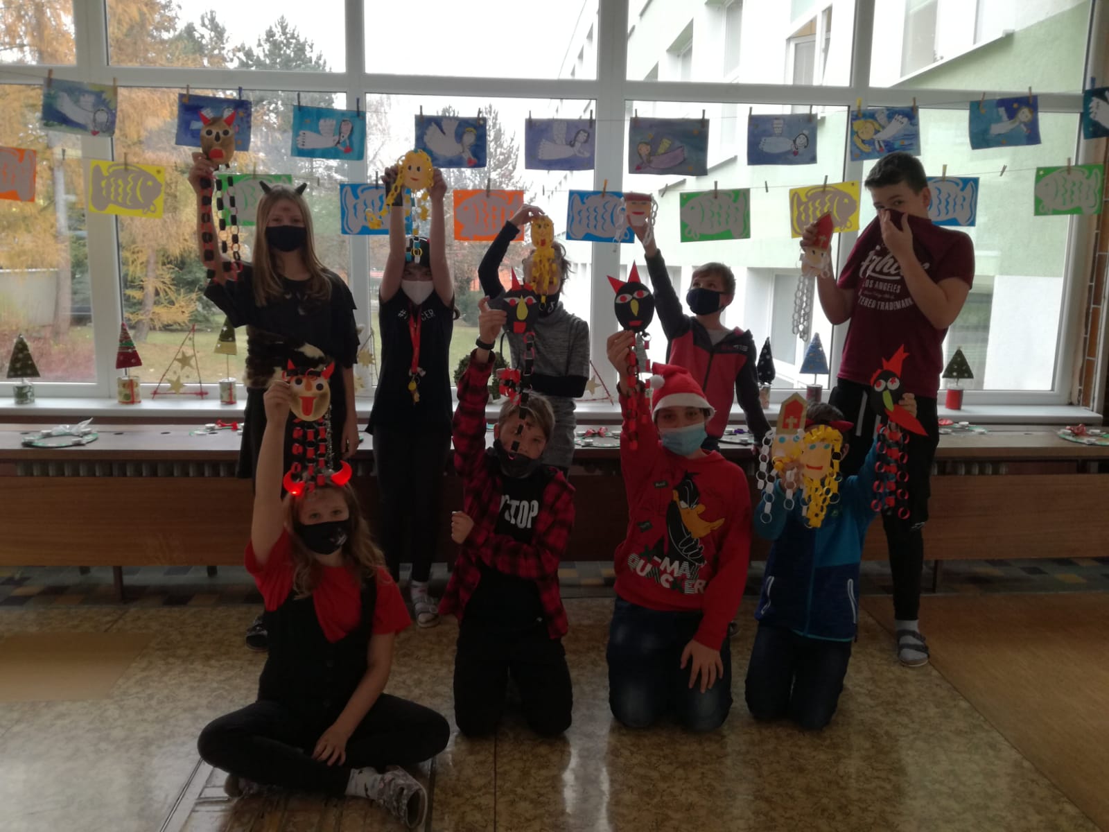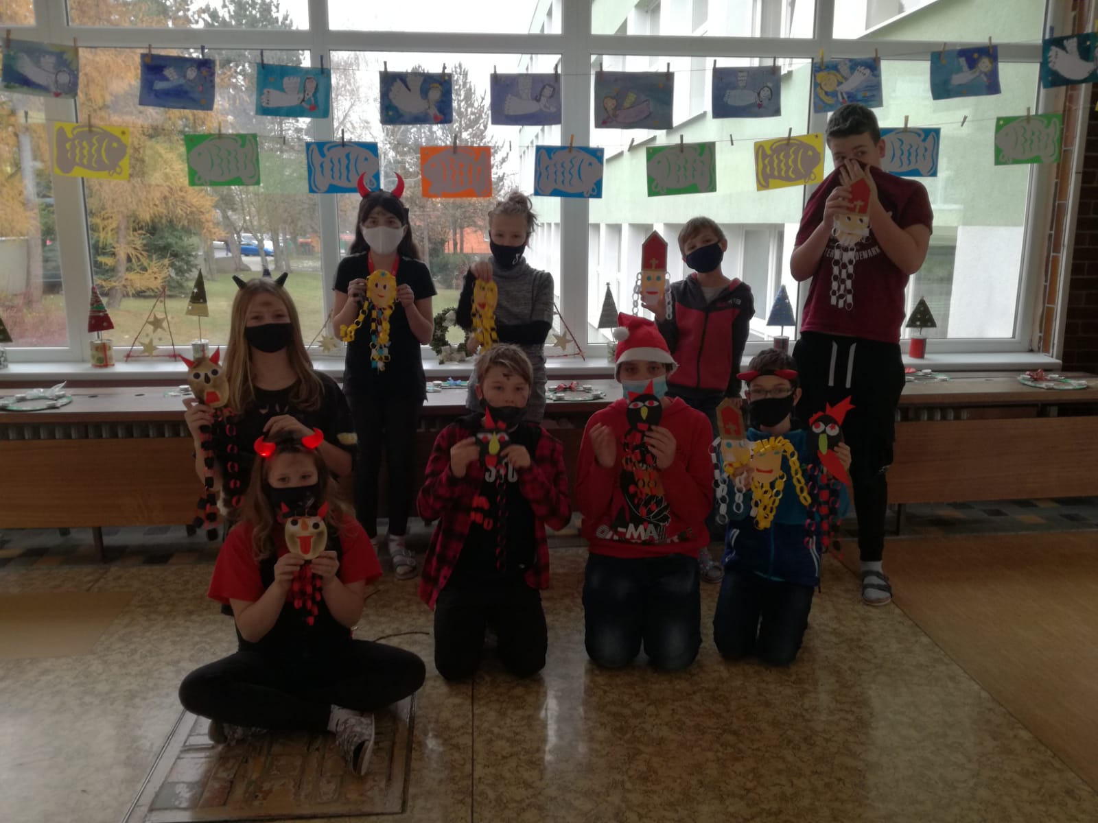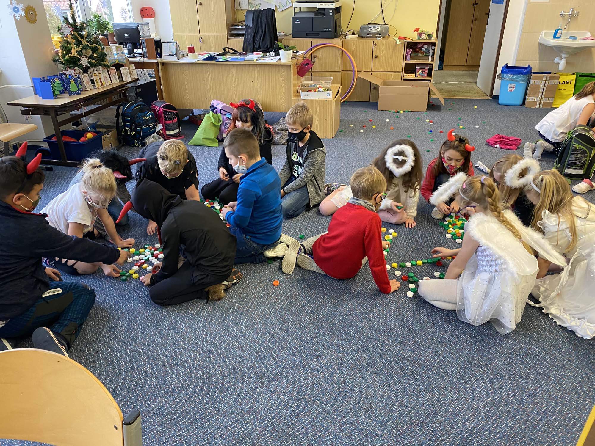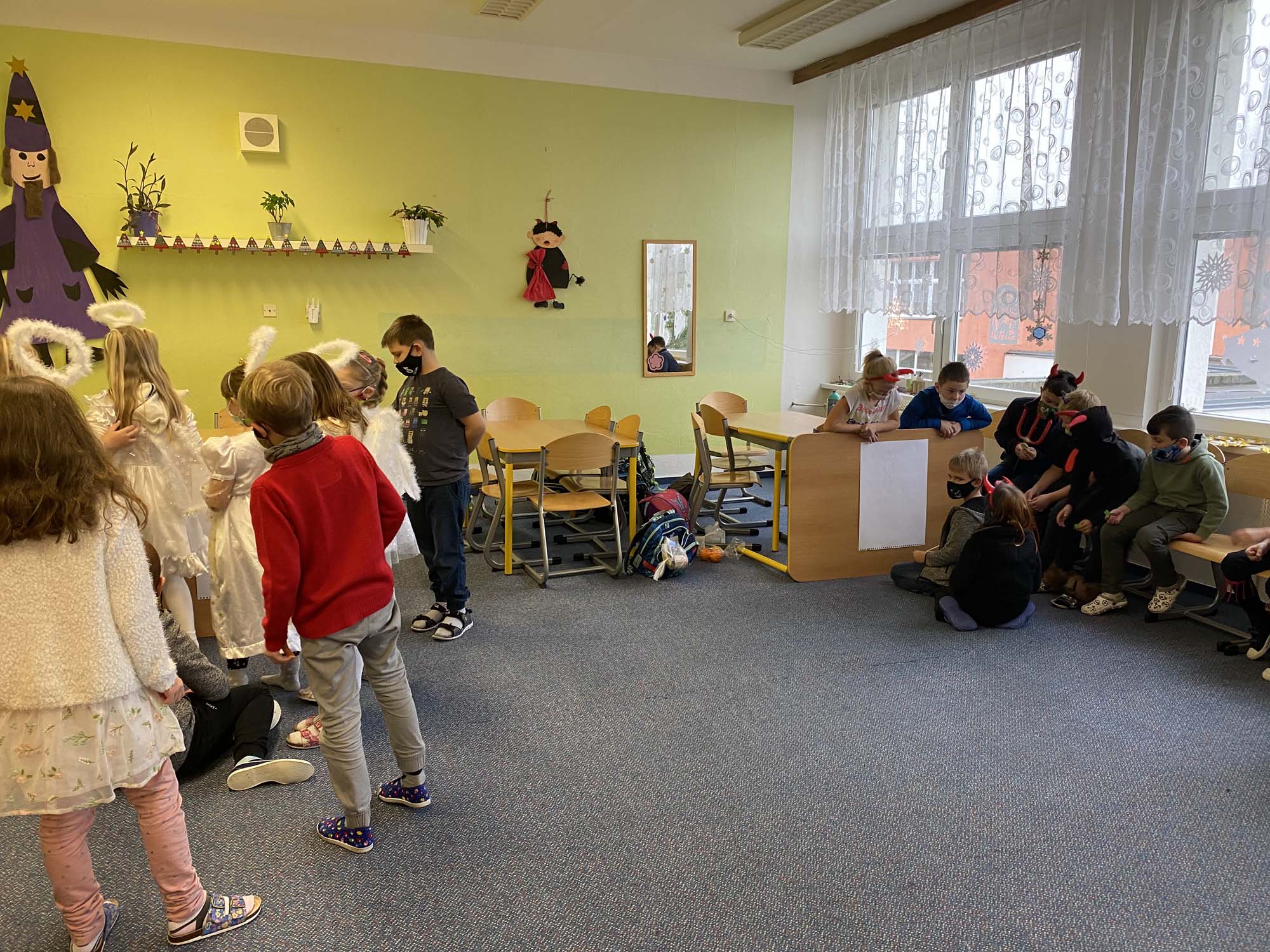 Na závěr týdne jsme přišli všichni v kostýmech čertů a andělů. To také rozhodlo o názvu našich družstev. Soutěžilo družstvo čertíků proti andělům. Naštěstí to byl rovný souboj až do samého konce. Úkoly to byly hlavně dovednostní. Malovali jsme čerty podle toho, jak je kreslil kamarád či kamarádka na záda. Z čertovského kotlíku jsme tahali slovíčka k Mikulášskému tématu. Skládali jsme nebeské vločky a nakonec jsme si zahráli židličkovanou.