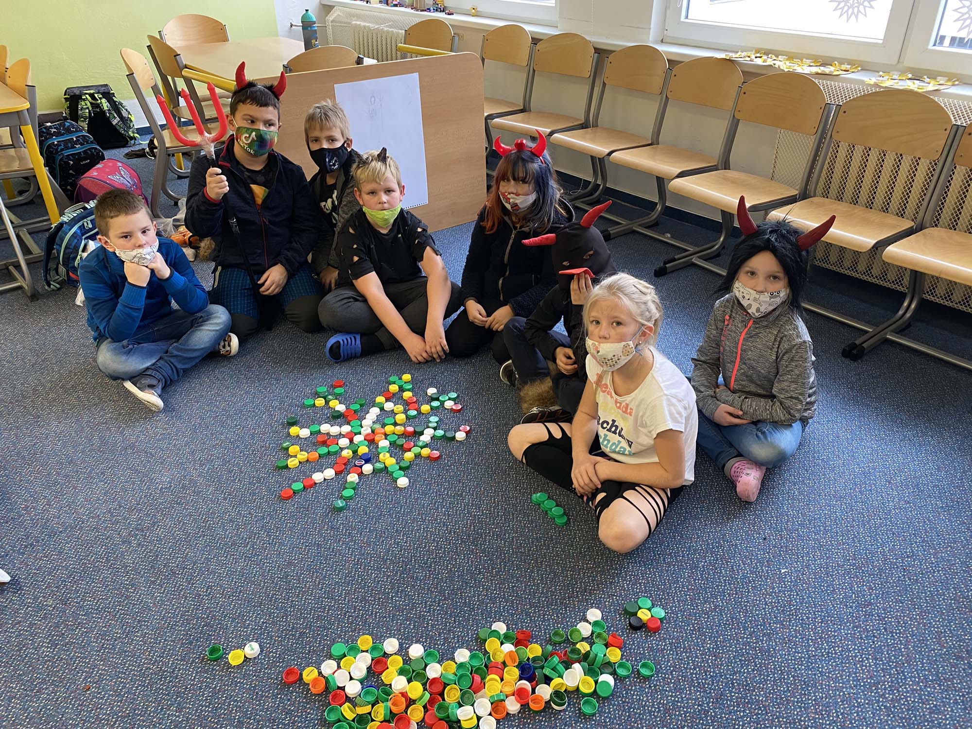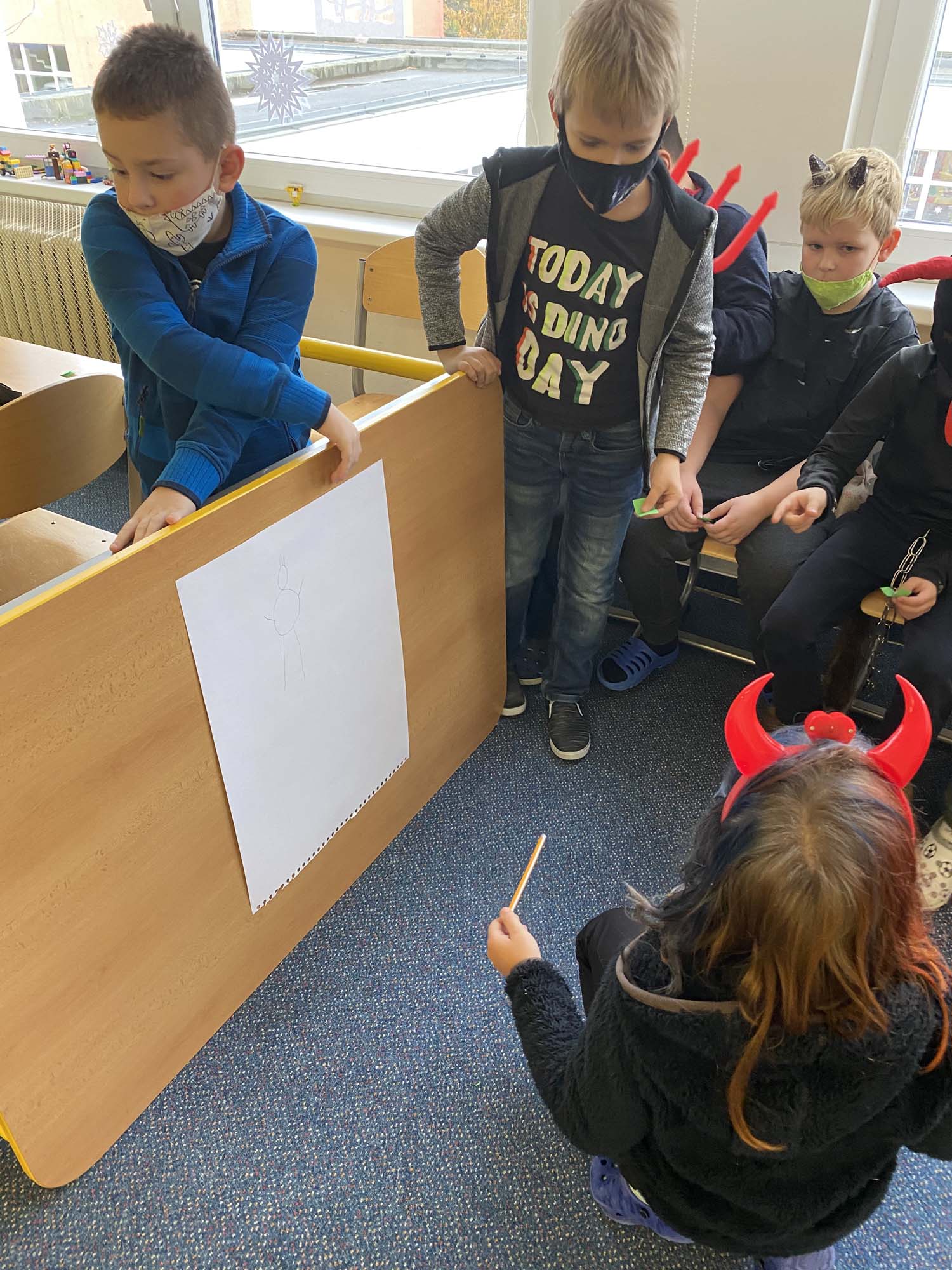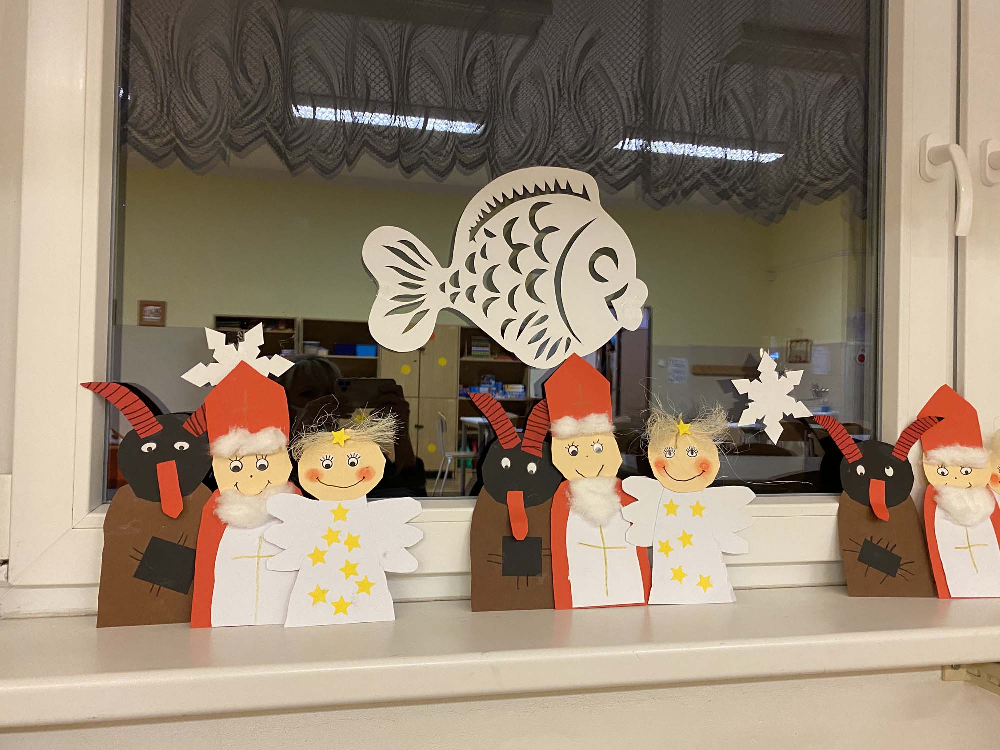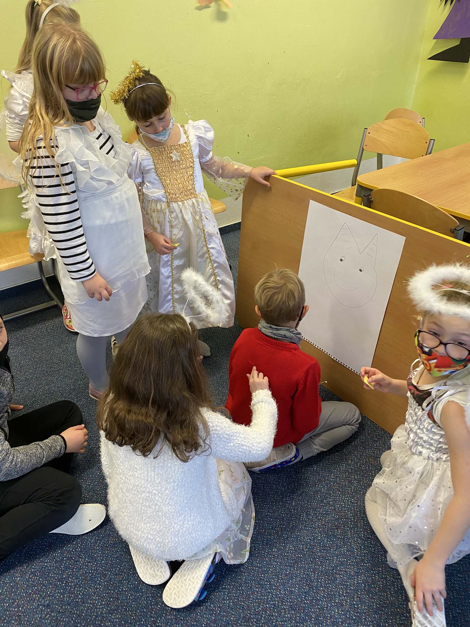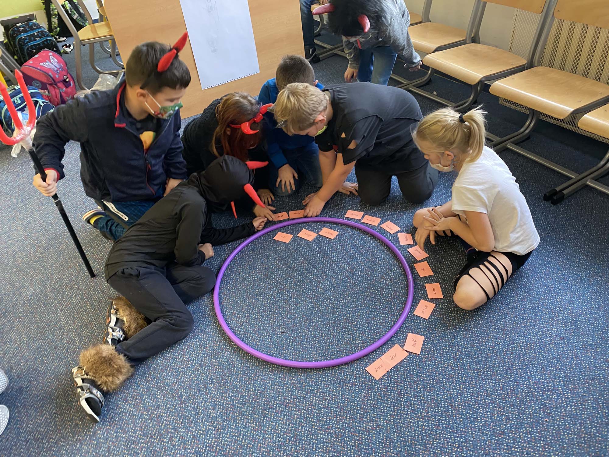 Na závěr týdne jsme přišli všichni v kostýmech čertů a andělů. To také rozhodlo o názvu našich družstev. Soutěžilo družstvo čertíků proti andělům. Naštěstí to byl rovný souboj až do samého konce. Úkoly to byly hlavně dovednostní. Malovali jsme čerty podle toho, jak je kreslil kamarád či kamarádka na záda. Z čertovského kotlíku jsme tahali slovíčka k Mikulášskému tématu. Skládali jsme nebeské vločky a nakonec jsme si zahráli židličkovanou.