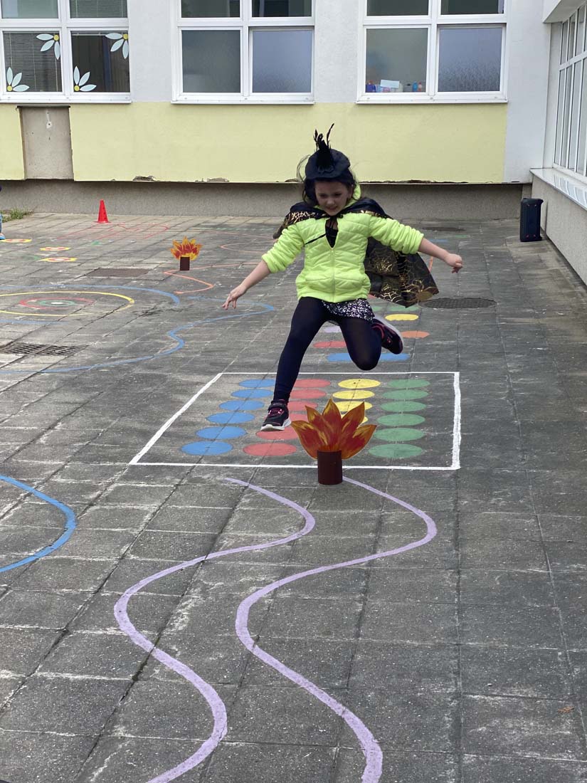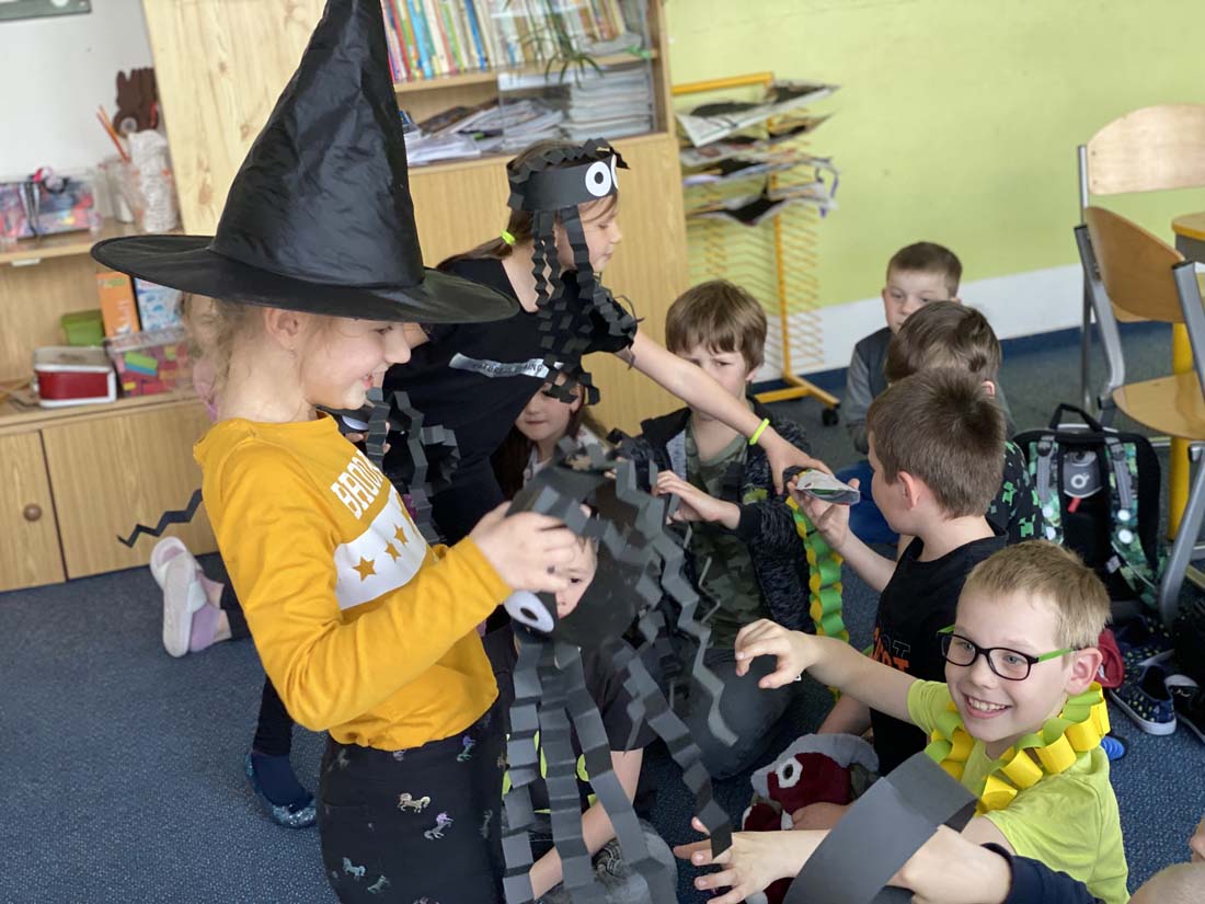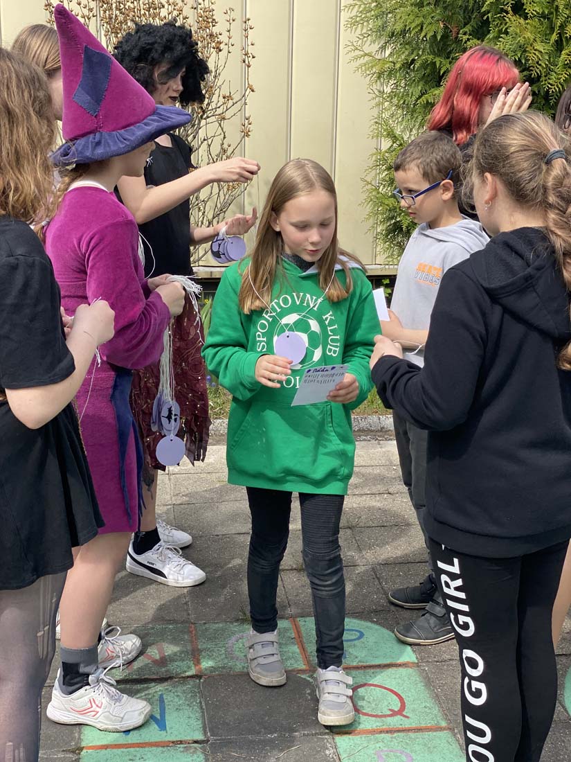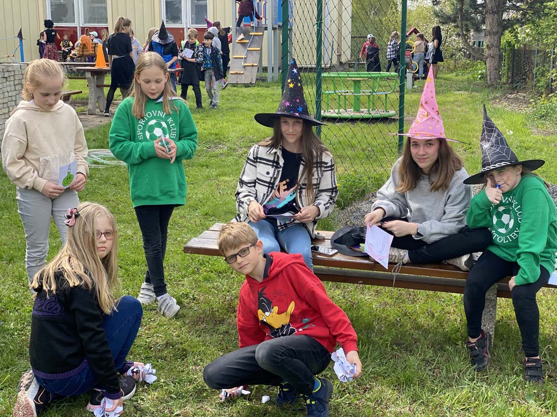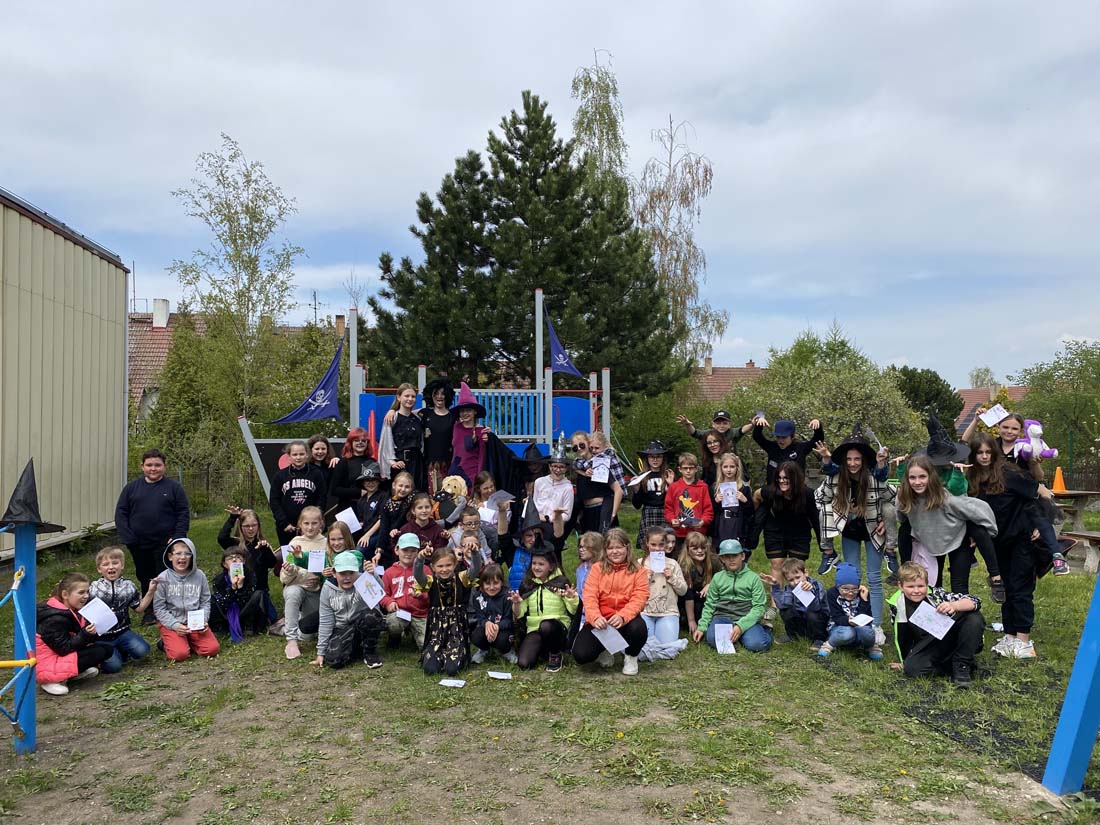 Páteční odpoledne bylo u nás v družině kouzelně veselé. Velké i malé čarodějnice a kouzelníci se slétli na svých košťatech na školní zahradě, abychom společně oslavili „slet čarodějnic“. K zábavnému odpoledni patřilo plnění čarodějnických disciplín: Lovení potvor ve slizu, skládání zaklínadel, let na koštěti, skok přes oheň, luštění v magickém oku, sběr kouzelných hub, hod ohnivou koulí, aj. Na závěr si každý vylovil odměnu v čarodějnickém kotlíku a dostal účastnickou medaili. Na soutěžích se podílela děvčata ze školního klubu, patří jim velký dík. Krásně se postarala o své mladší spolužáky. Jsme velice rádi, že po různých opatřeních minulých let, můžeme opět vidět děti společně a šťastné ?