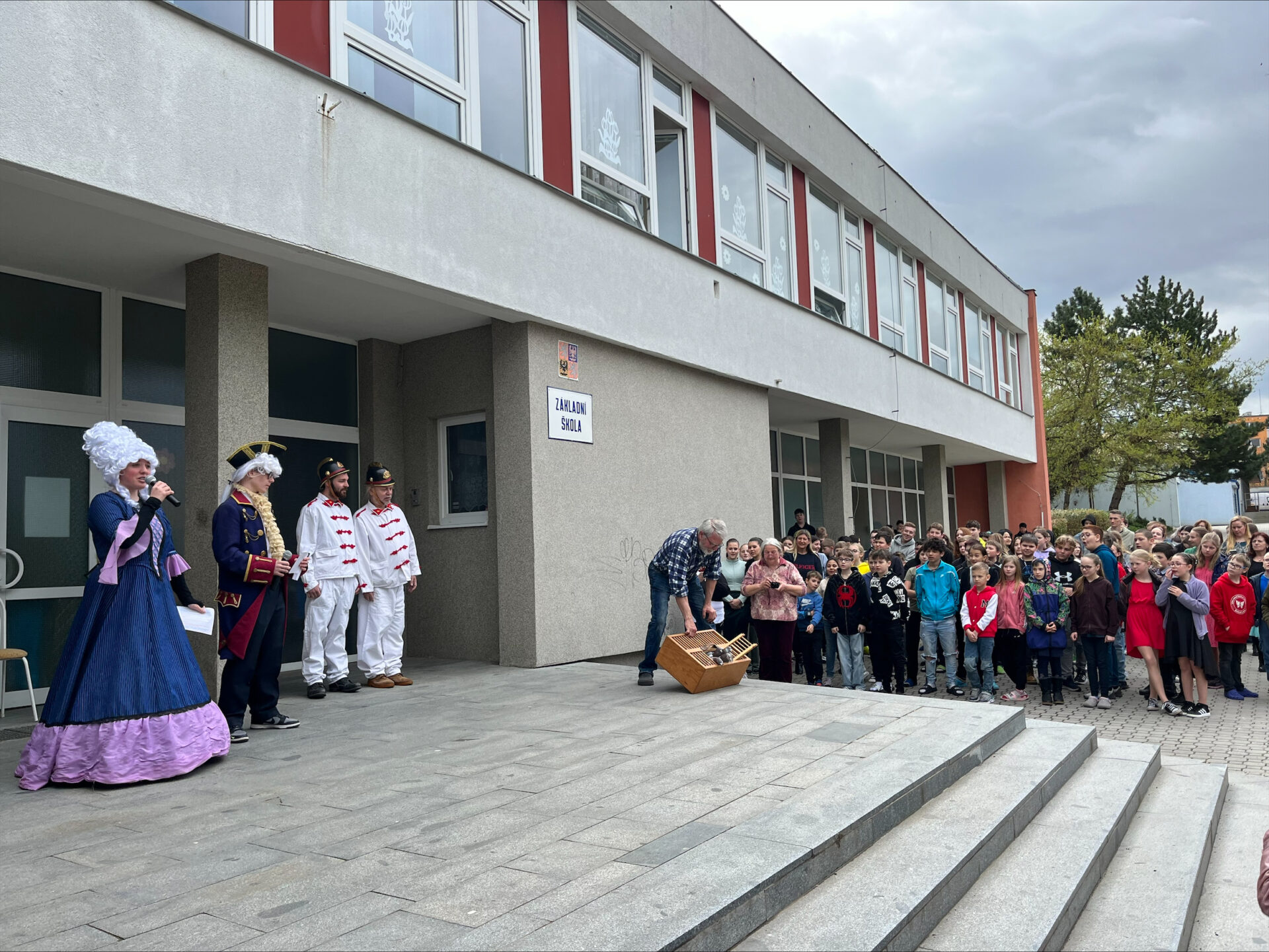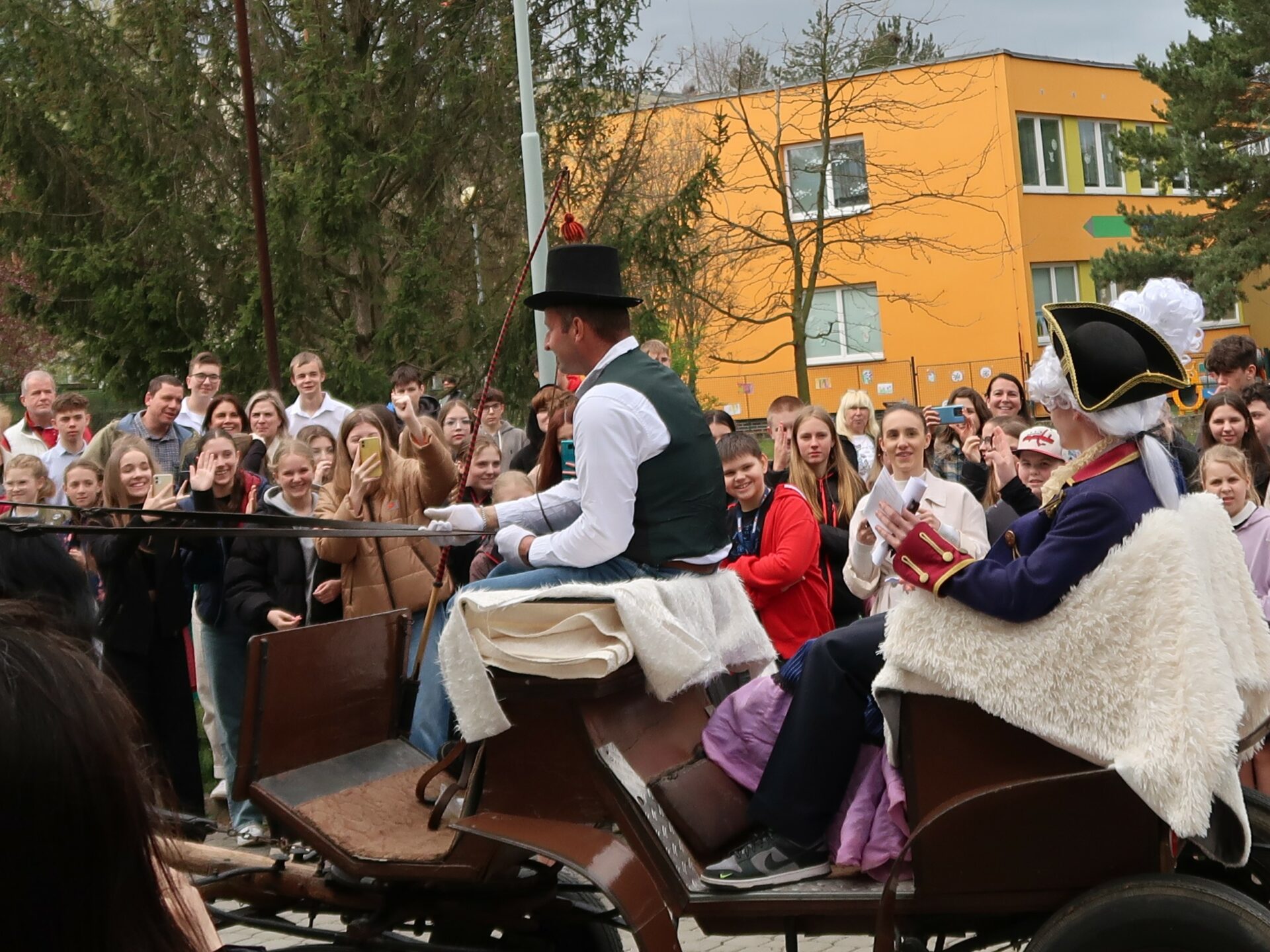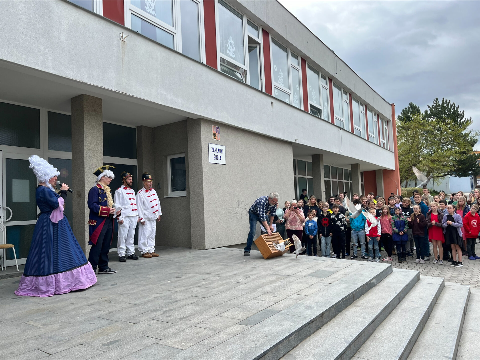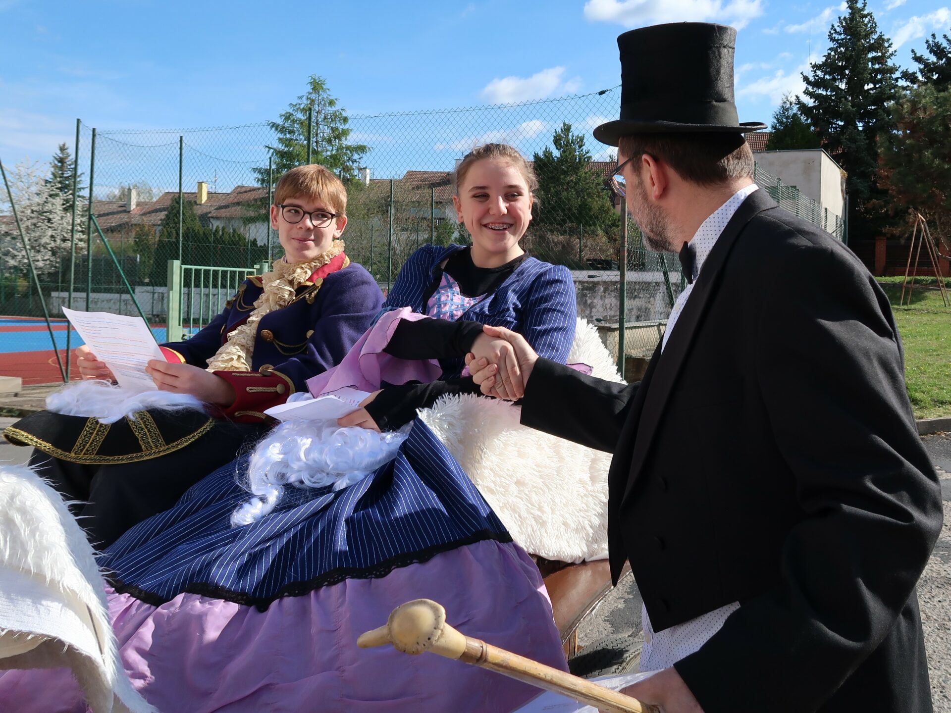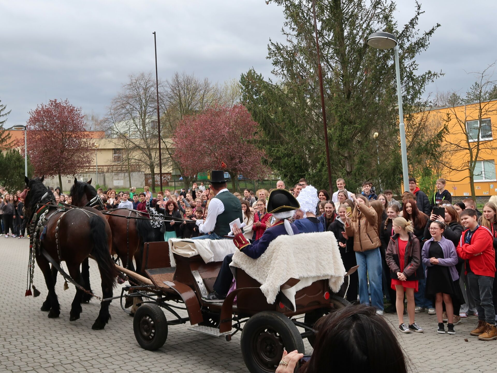 Nikdo z žáků do poslední chvíle netušil, že vzácná návštěva přijede tradičně v kočáru taženém koňmi. A když k nebi vyletělo hejno poštovních holubů se vzkazem do Vídně, bylo nadšení úplné. Nechyběla slavnostní fanfára, čestná stráž hasičů v dobových uniformách a přední velikáni českého národa: J. A. Komenský, Fr. Palacký a největší z Čechů – Jára Cimrman, kteří společně s císařovnou výstavu zahájili.