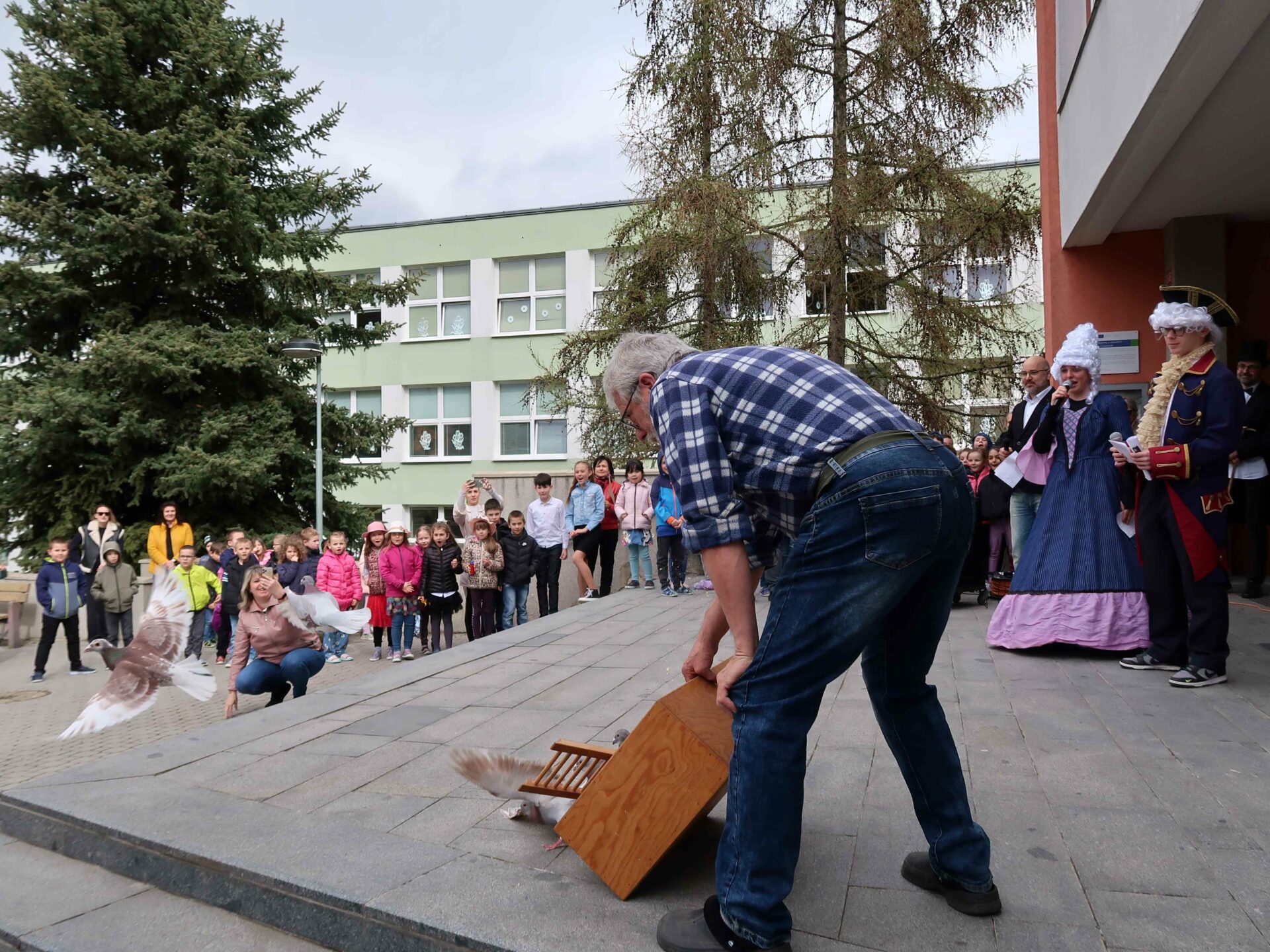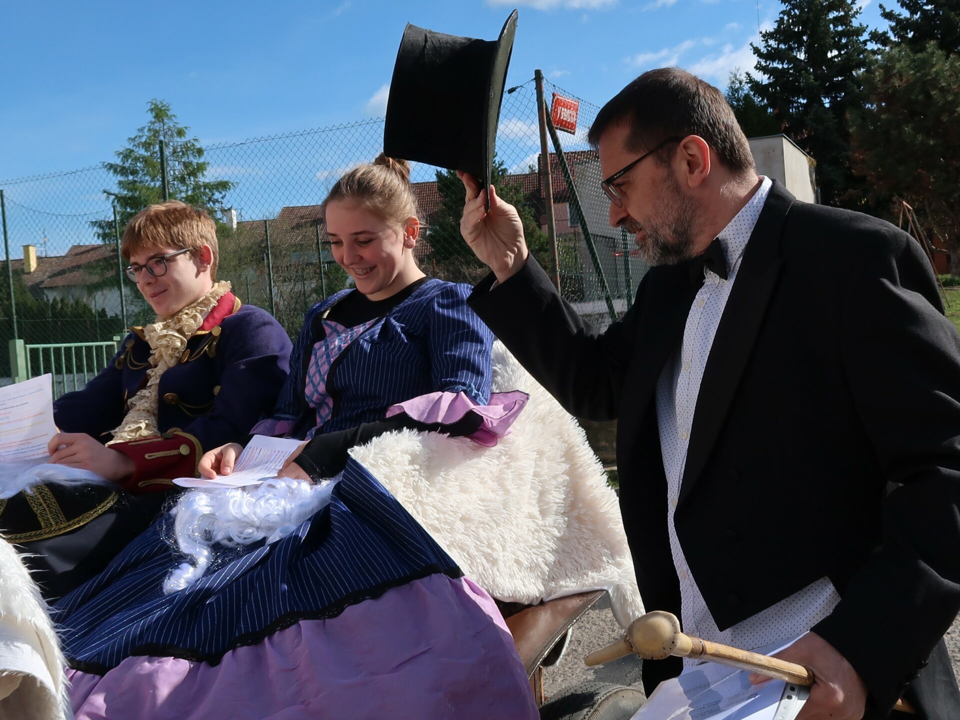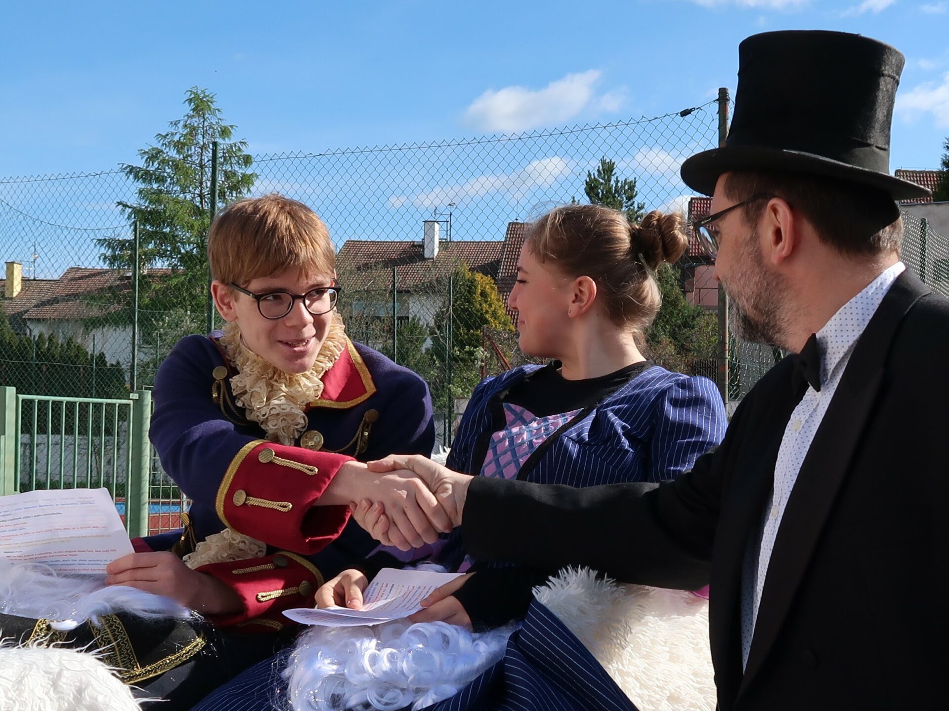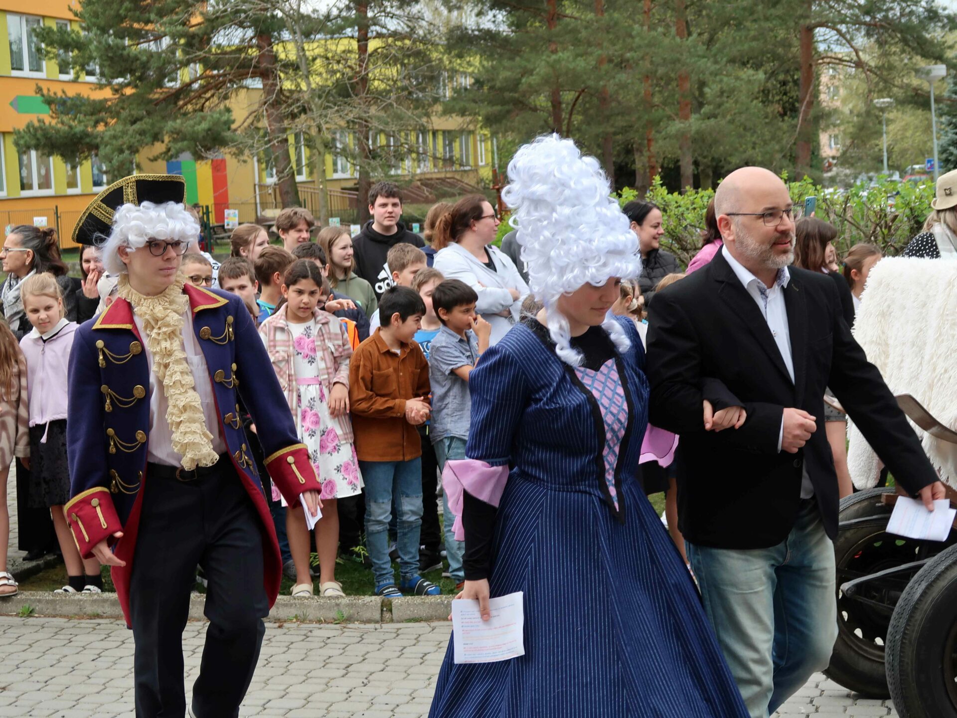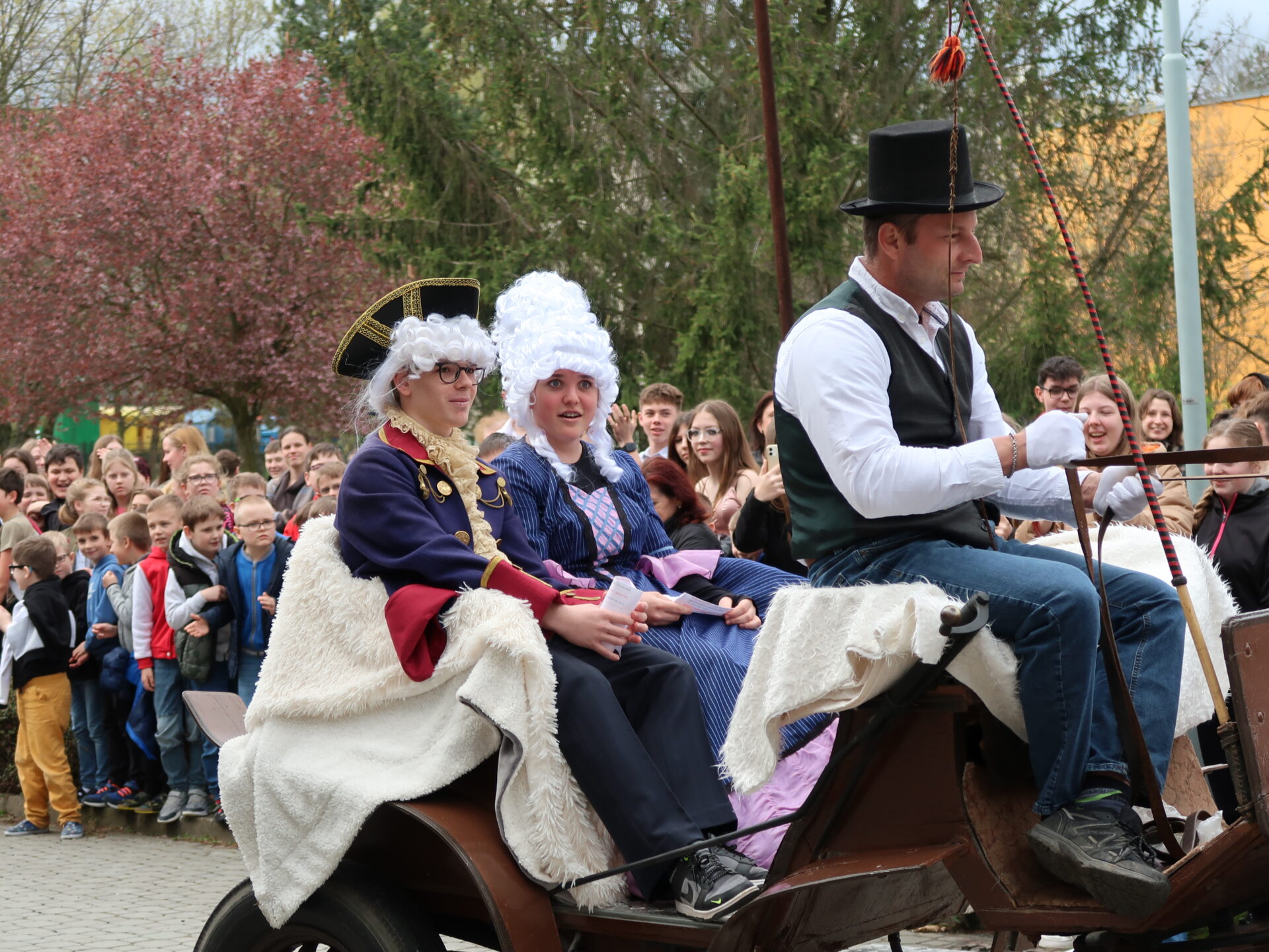 Nikdo z žáků do poslední chvíle netušil, že vzácná návštěva přijede tradičně v kočáru taženém koňmi. A když k nebi vyletělo hejno poštovních holubů se vzkazem do Vídně, bylo nadšení úplné. Nechyběla slavnostní fanfára, čestná stráž hasičů v dobových uniformách a přední velikáni českého národa: J. A. Komenský, Fr. Palacký a největší z Čechů – Jára Cimrman, kteří společně s císařovnou výstavu zahájili.