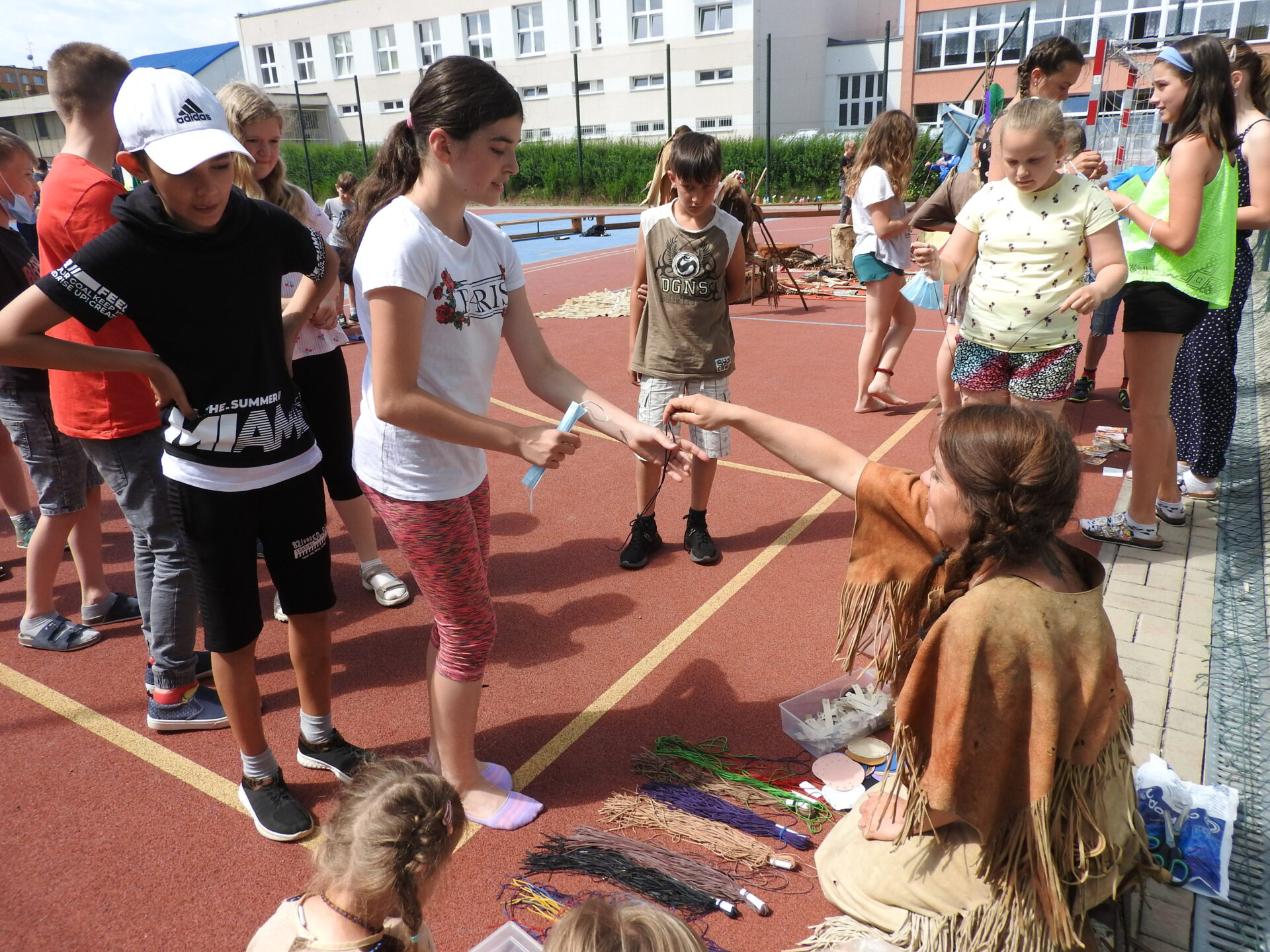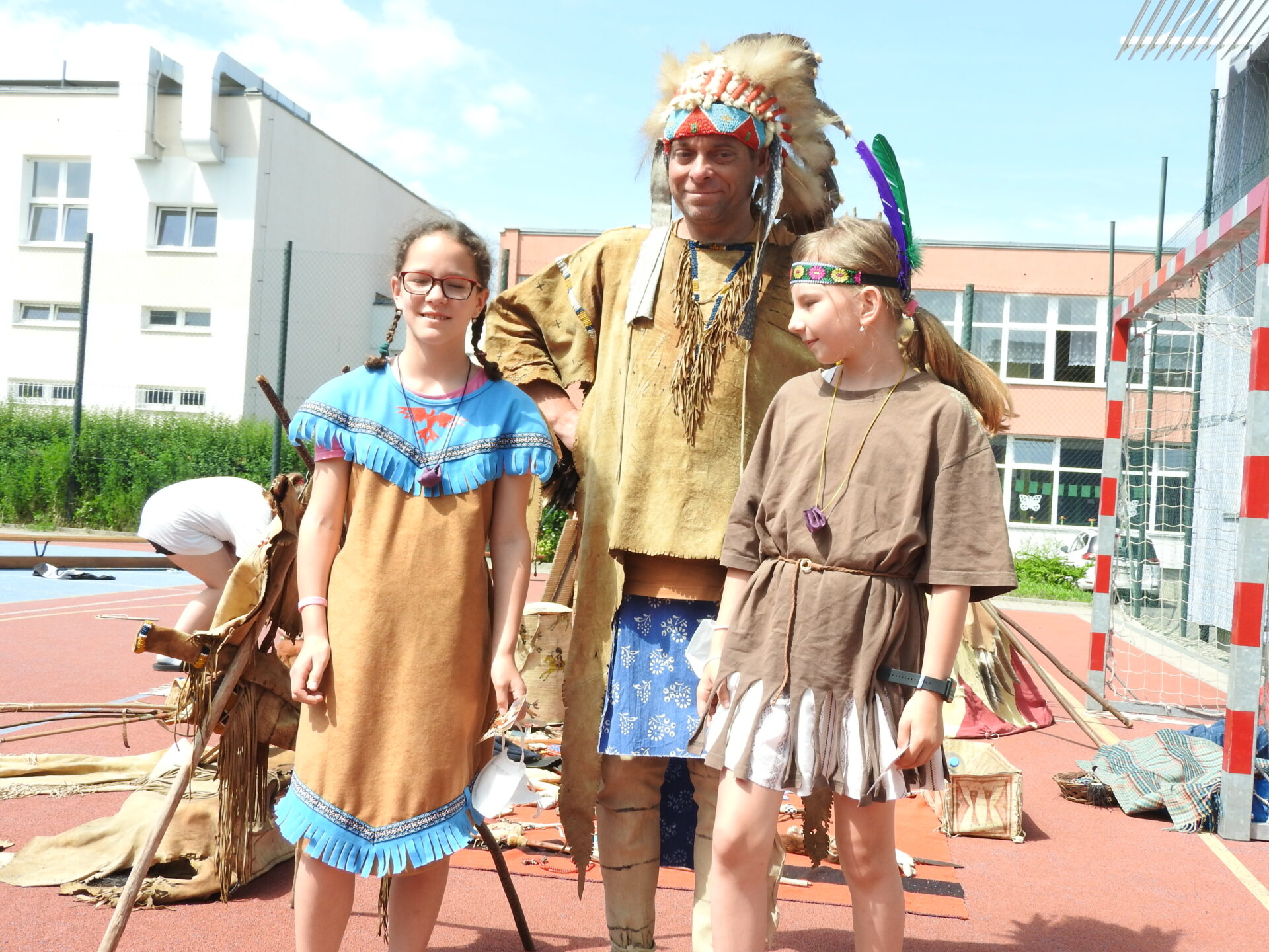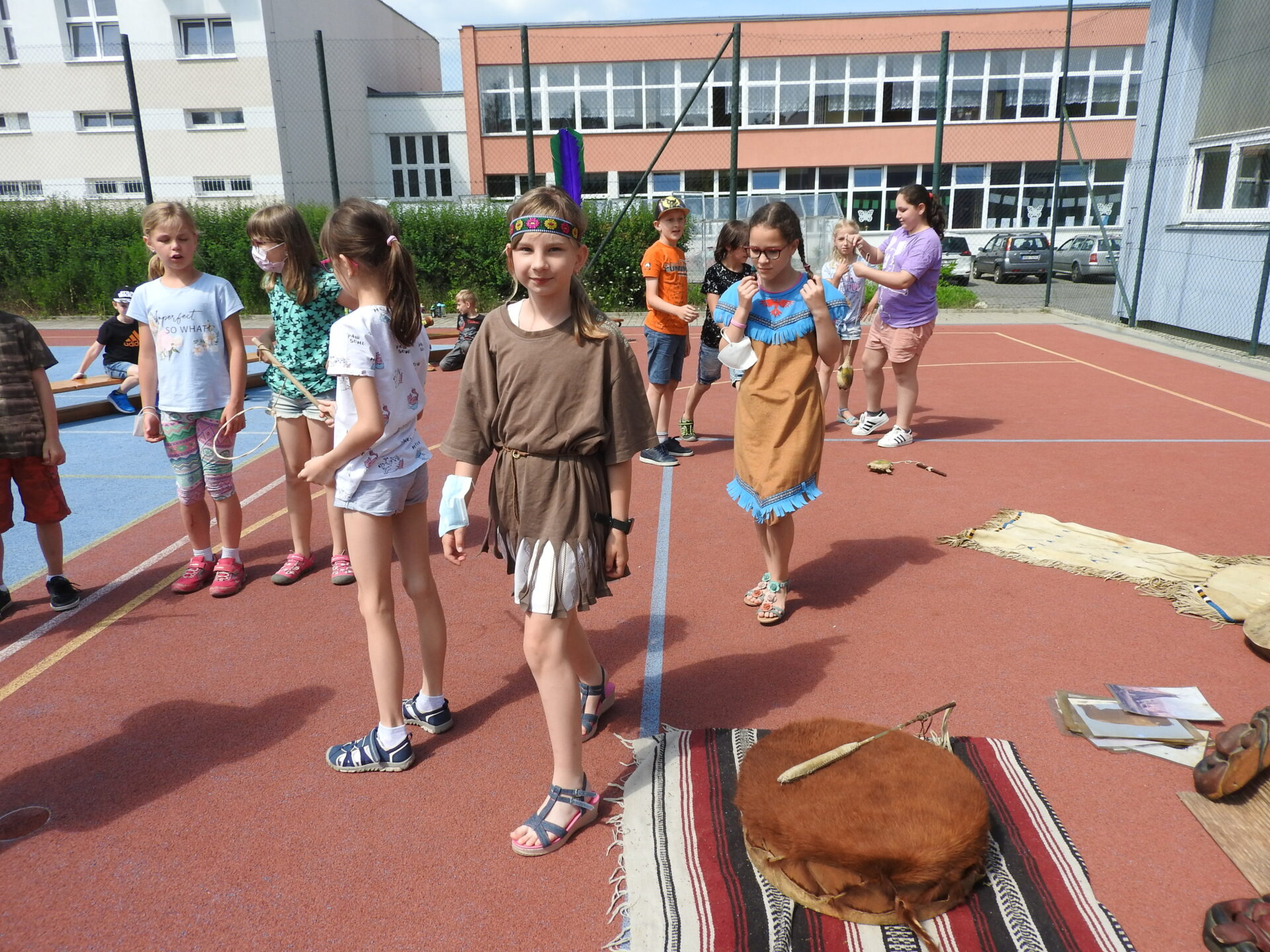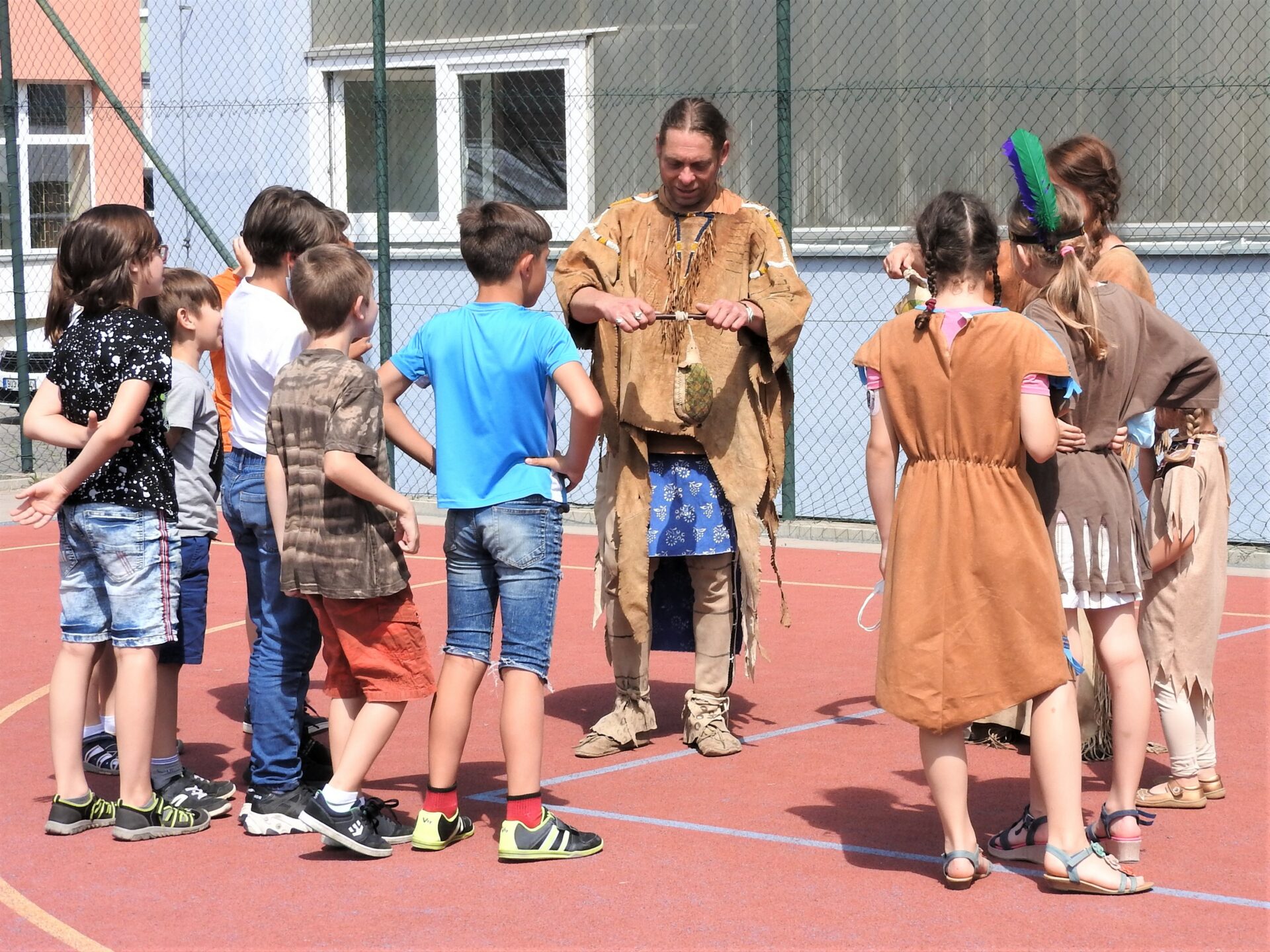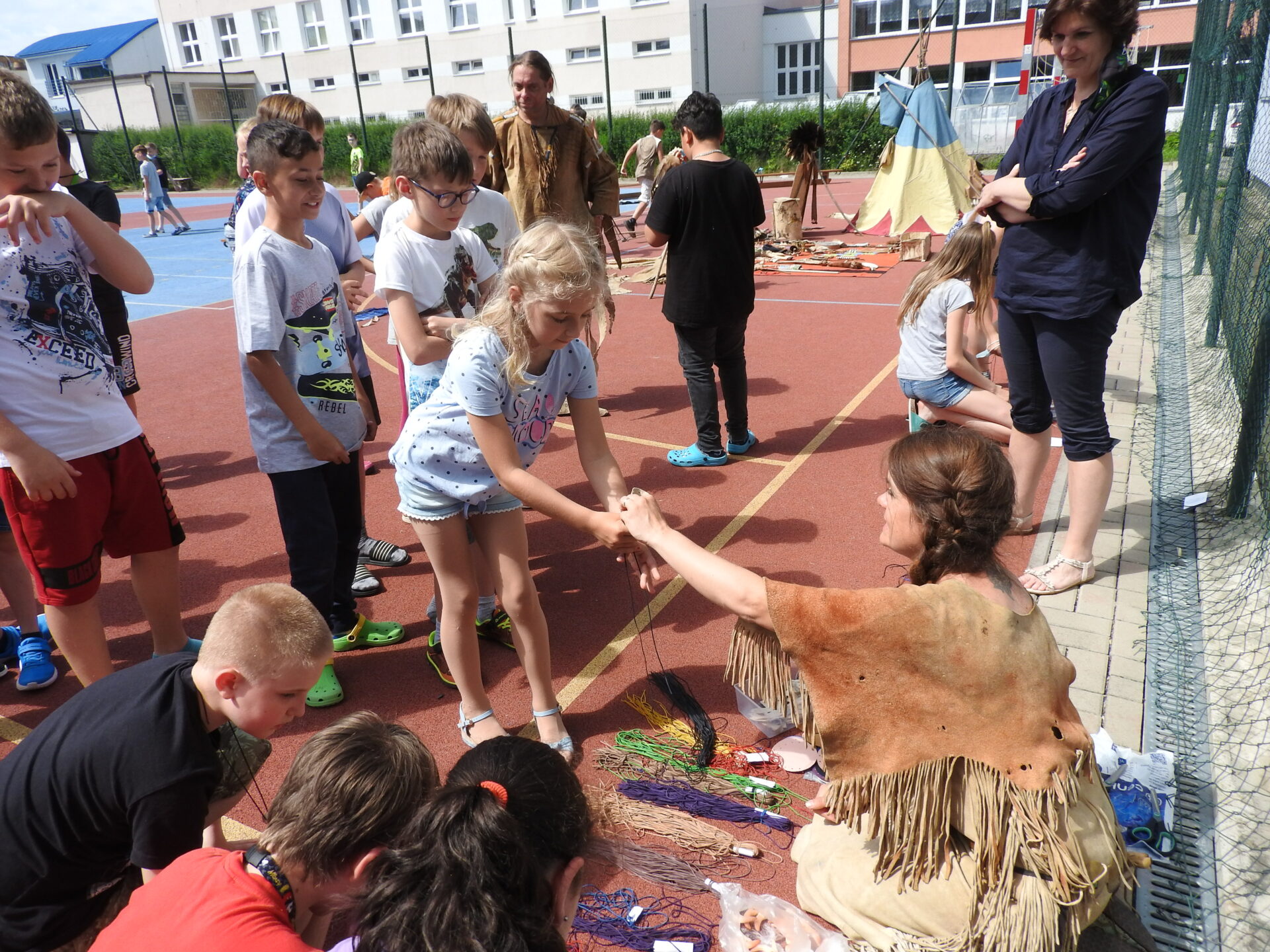 Dnešní den mezi nás zavítala indiánská rodinka až z daleké vesničky jménem Rosehill, ze světa prérijních indiánů. Její členové nás seznámili, jak žili původní obyvatelé Severní Ameriky, zejména prérijní idiáni z kmene Siouxů, Šajenů, Arapahů… Dozvěděli jsme se mnoho zajímavého z jejich života, mohli jsme si zastřílet z luku, poslechli si indiánskou hudbu, zahráli si různé hry a nakonec jsme si vyrobili náramek, náhrdelník nebo měšec z kůže na krk. Prožili jsme další prima den ve škole.